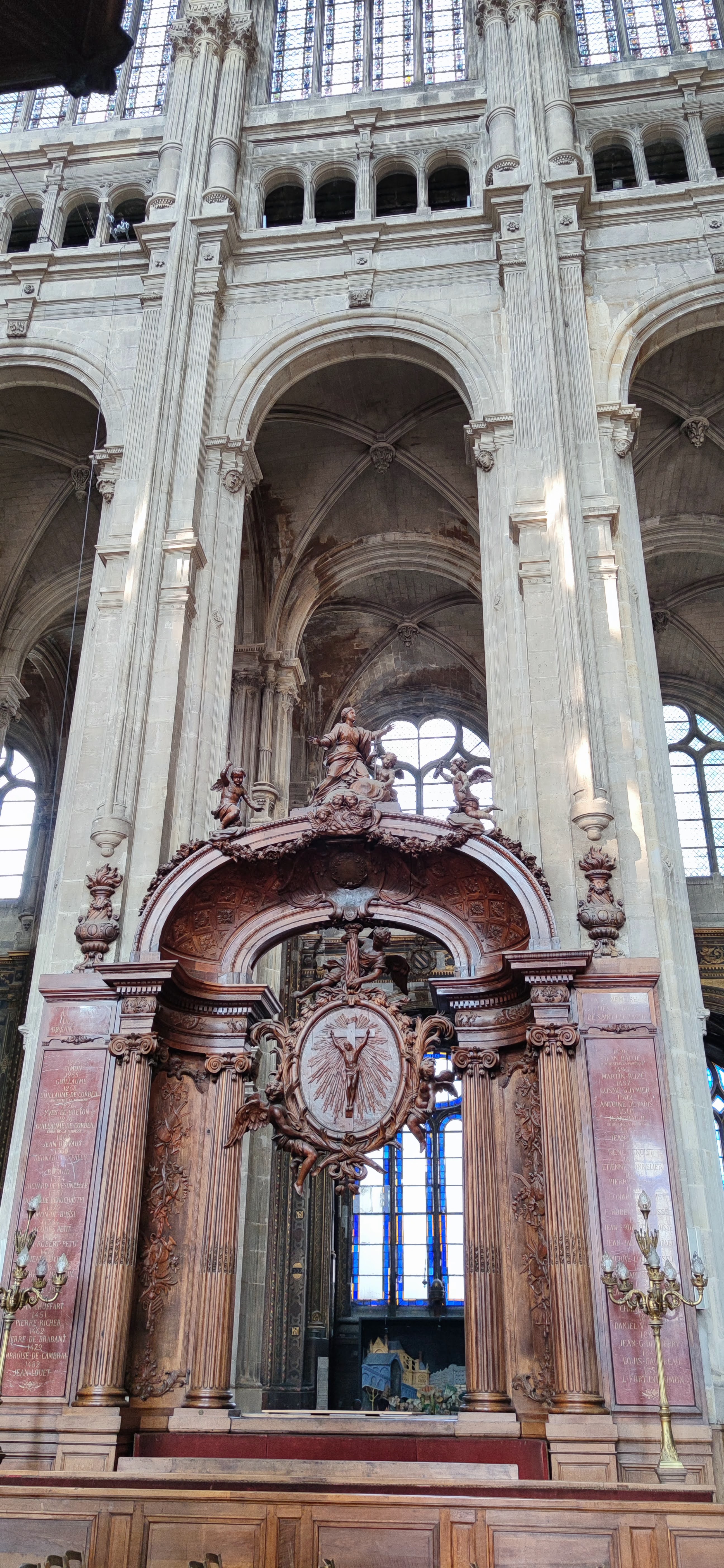 C'est avec une visite guidée, à l'occasion de la fête des 800 ans, en fait 801, que je suis allée revisiter cette église. Bâtie au cours des XVIè et XVIIè siècles, sur l'ancienne chapelle Sainte-Agnès de 1223, après moult transformations, elle est achevée au XVIIIè siècle. Très haute, très grande et très chargée, trop pour Viollet-le-Duc ! De nombreuses chapelles décorées bordent le déambulatoire. Quelques éléments : l'orgue, un des plus grands avec 8.000 tuyaux, comme celui de Notre-Dame ; le mausolée de Colbert une magnifique Vierge à l'enfant de Jean-Baptiste Pigalle ; le bénitier et le Pape Alexandre II, qui instaura le rite de l'eau bénite ; la chapelle de Sainte-Agnès ; puis, les vitraux, tableaux, sculptures, peintures, etc..... Classée Monument Historique en 1862. Cette église, lors de célébrations diverses a vu passer bien des personnalités historiques, compositeurs, etc : Louis XIV, Richelieu, Molière, Sully, Colbert, Jean de la Fontaine, et tant d'autres....... Plus récemment, l'acteur Gaspard Ulliel en Janvier 2022.