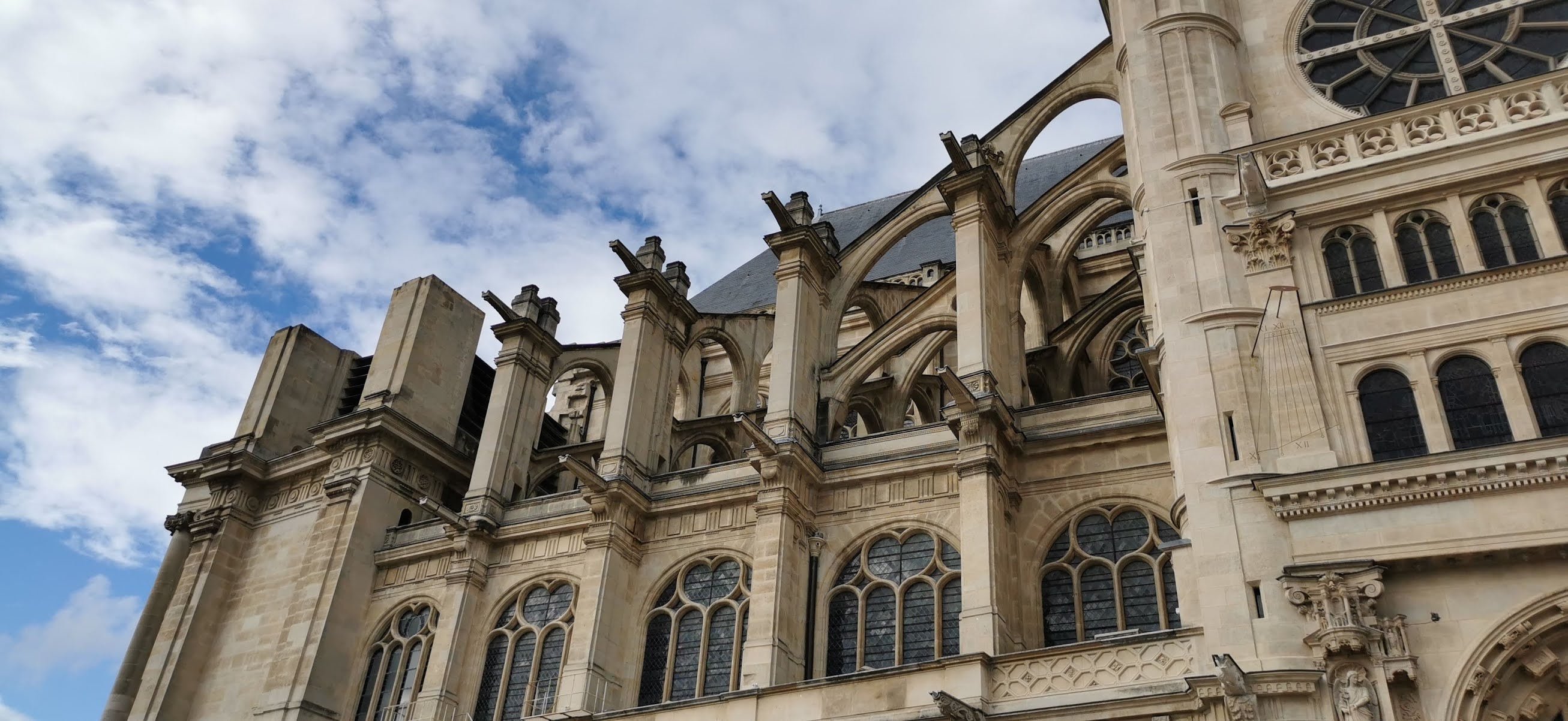 Est une sorte de navire, qui depuis le 26 avril 1637 navigue dans le cœur de l'histoire de Paris avec ses instruments de navigation, une méridienne et un cadran solaire, tous deux positionnés sur la façade sud de l'église. Au fil du temps et malgré les intempéries dans un quartier riche avec sa culture d'urbanisation, l'église Saint-Eustache invite les curieux dans l'aventure de la chrétienté.