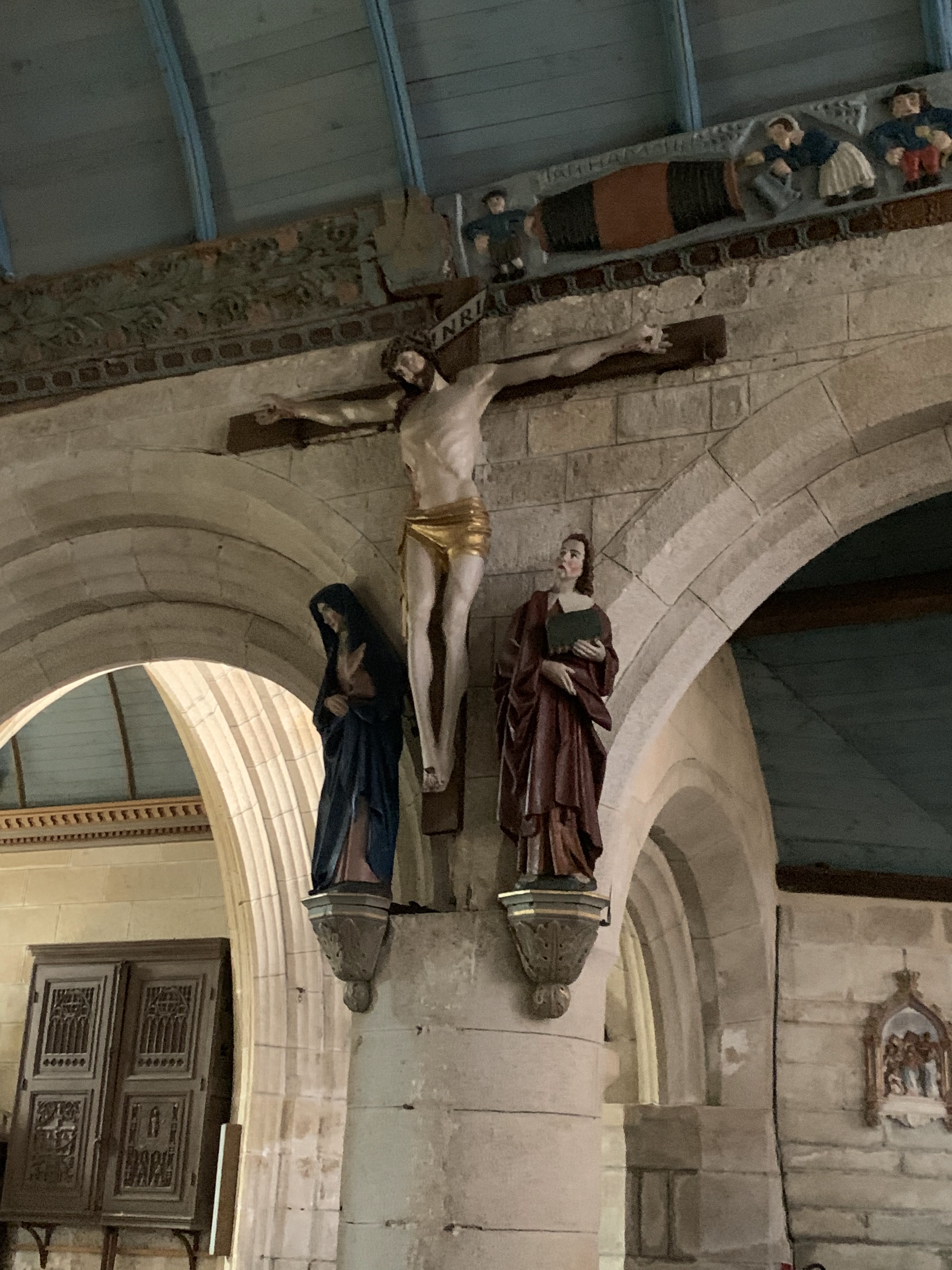 Superbe église paroissiale. Vitraux exceptionnels. Belles statues. Sur le placitre, beau calvaire.