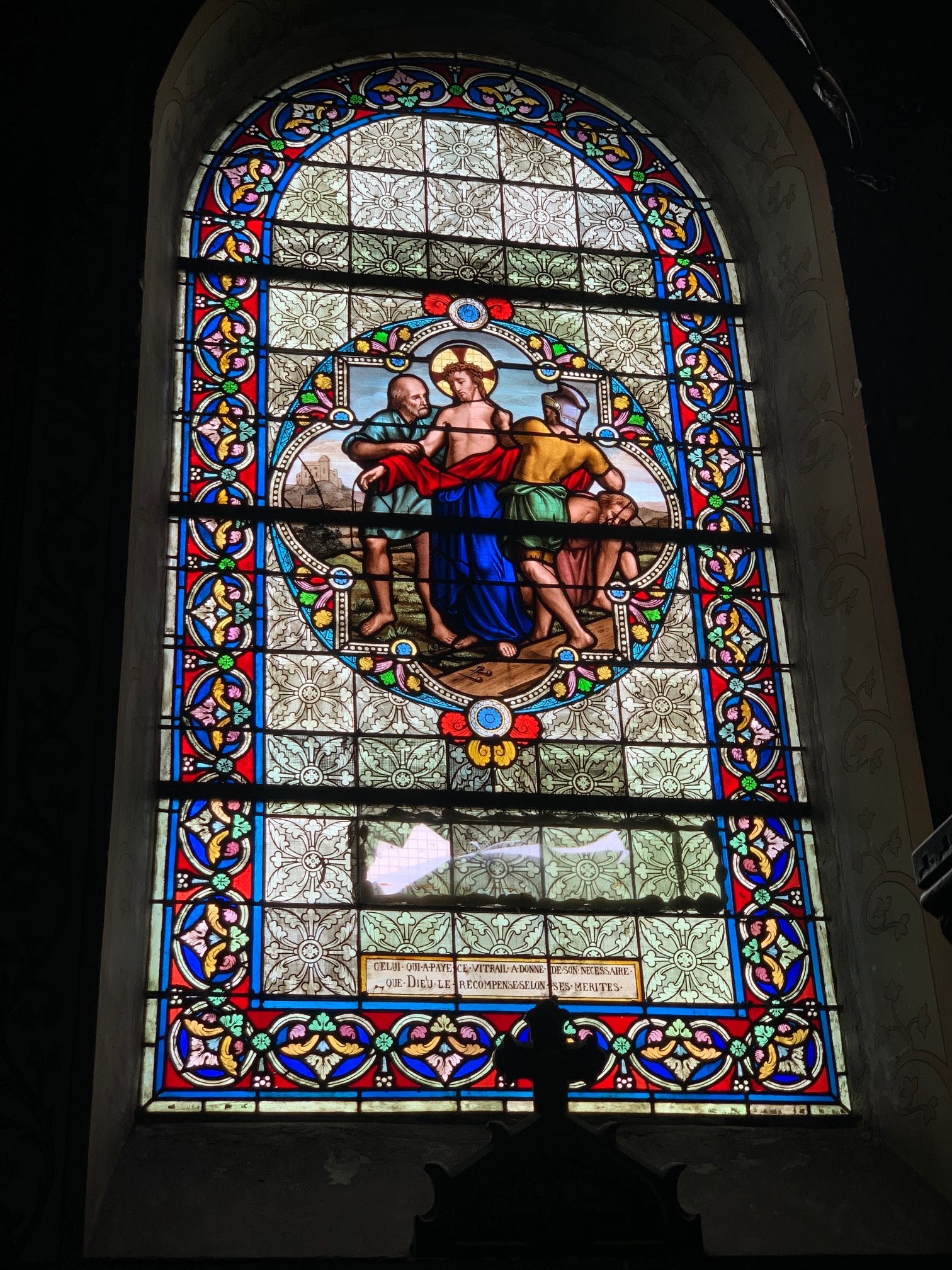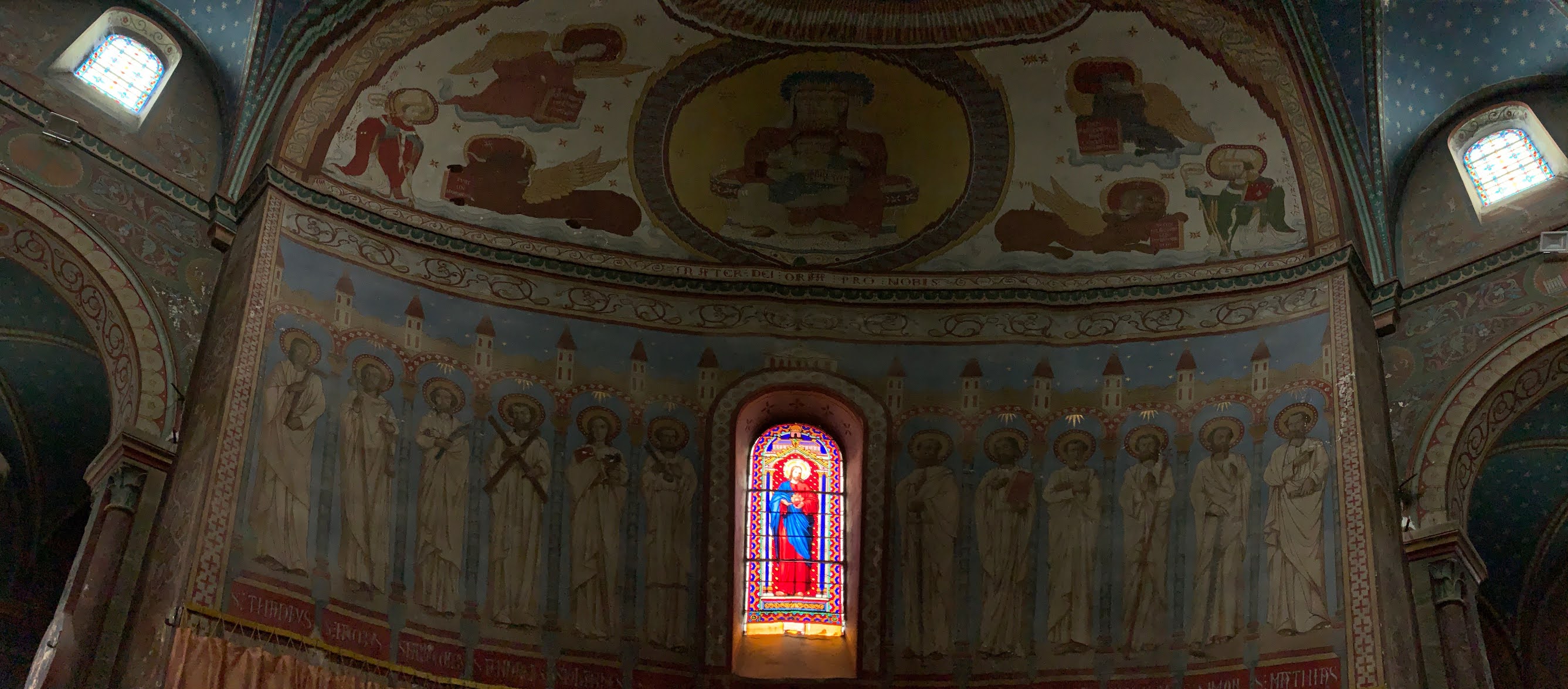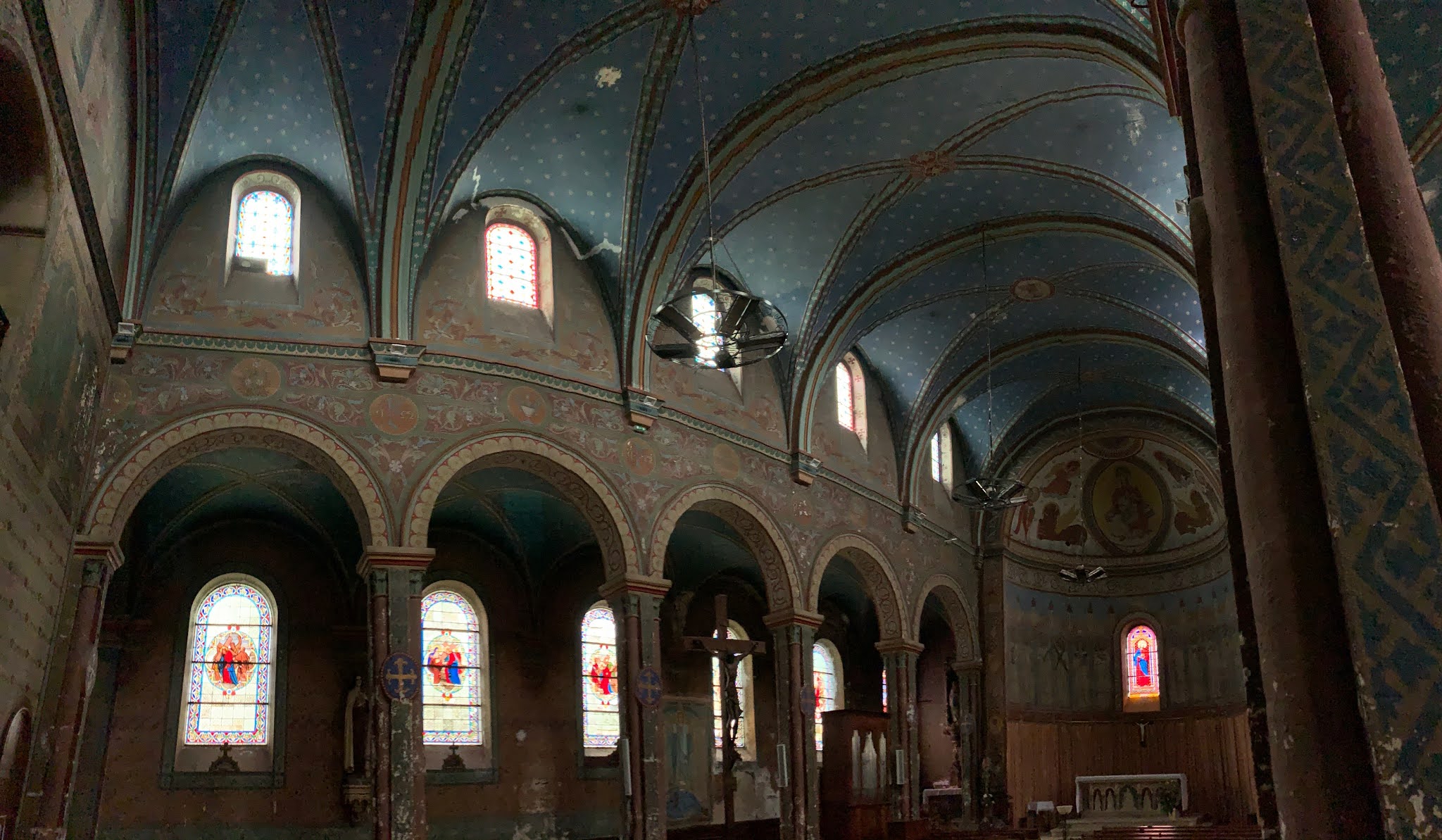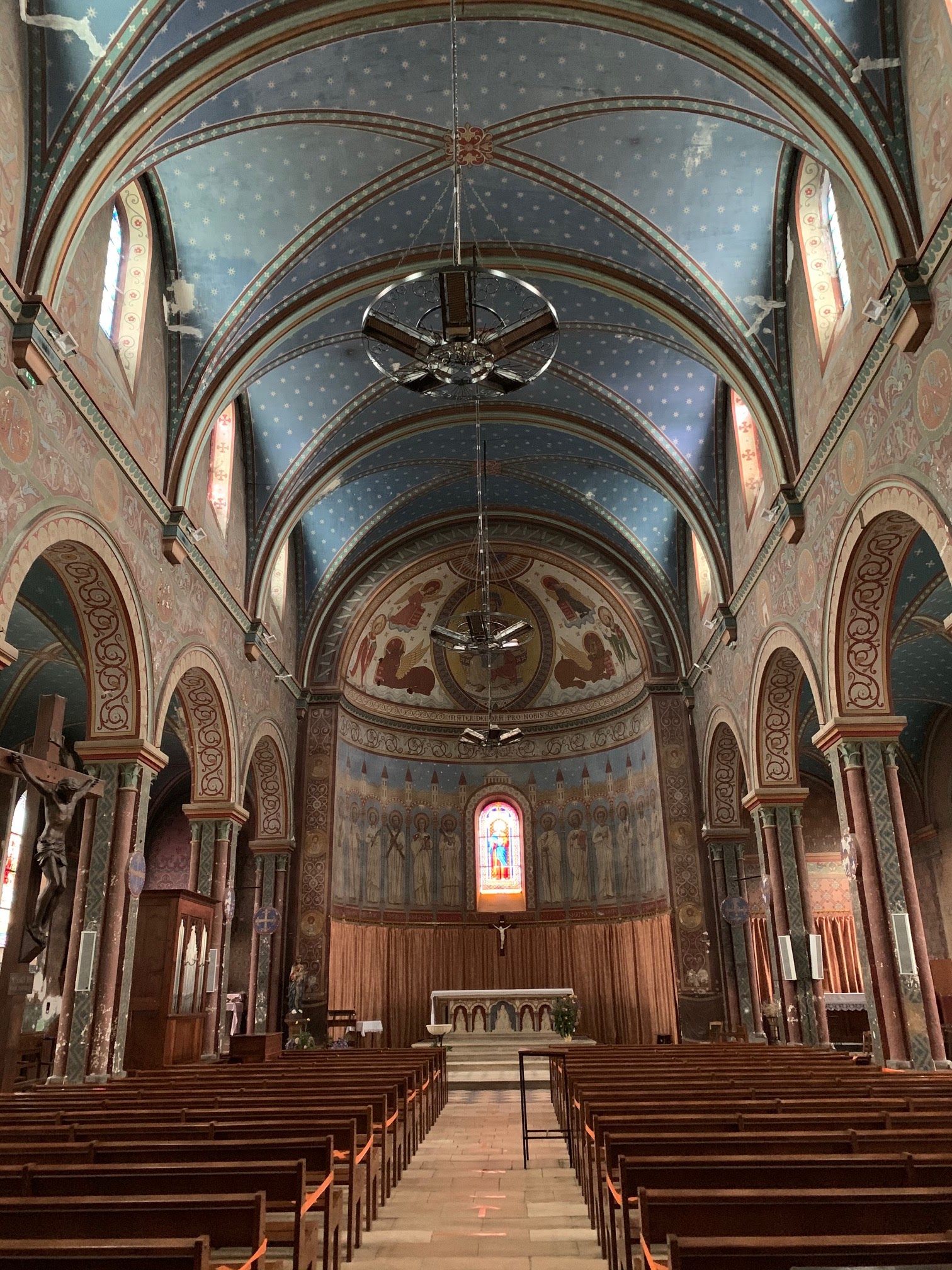 J'ai beaucoup aimé cette découverte, cette église du 19ème siècle m'a séduit. De nombreux décors peints, réalisés par l'artiste-peintre berruyer Dumoutet, et les 14 vitraux illustrant le chemin de la croix, lui procurent un intérêt particulier. L'existence d'une église primitive est attestée depuis le 11ème siècle. Cette église fut détruite au 19ème siècle pour réaliser un nouveau projet. A partir de 1943, un édifice fut construit selon les plans de deux architectes, Juillien et Bussière. La construction se termina en 1863. Cette construction emprunte au style roman des ouvertures et des arcatures en plain cintre, une abside voûtée en demi-coupole. Elle s'inspire du style gothique pour de fausses voûtes qui hésitent entre la croisée d'ogives et le croisement de deux berceaux.