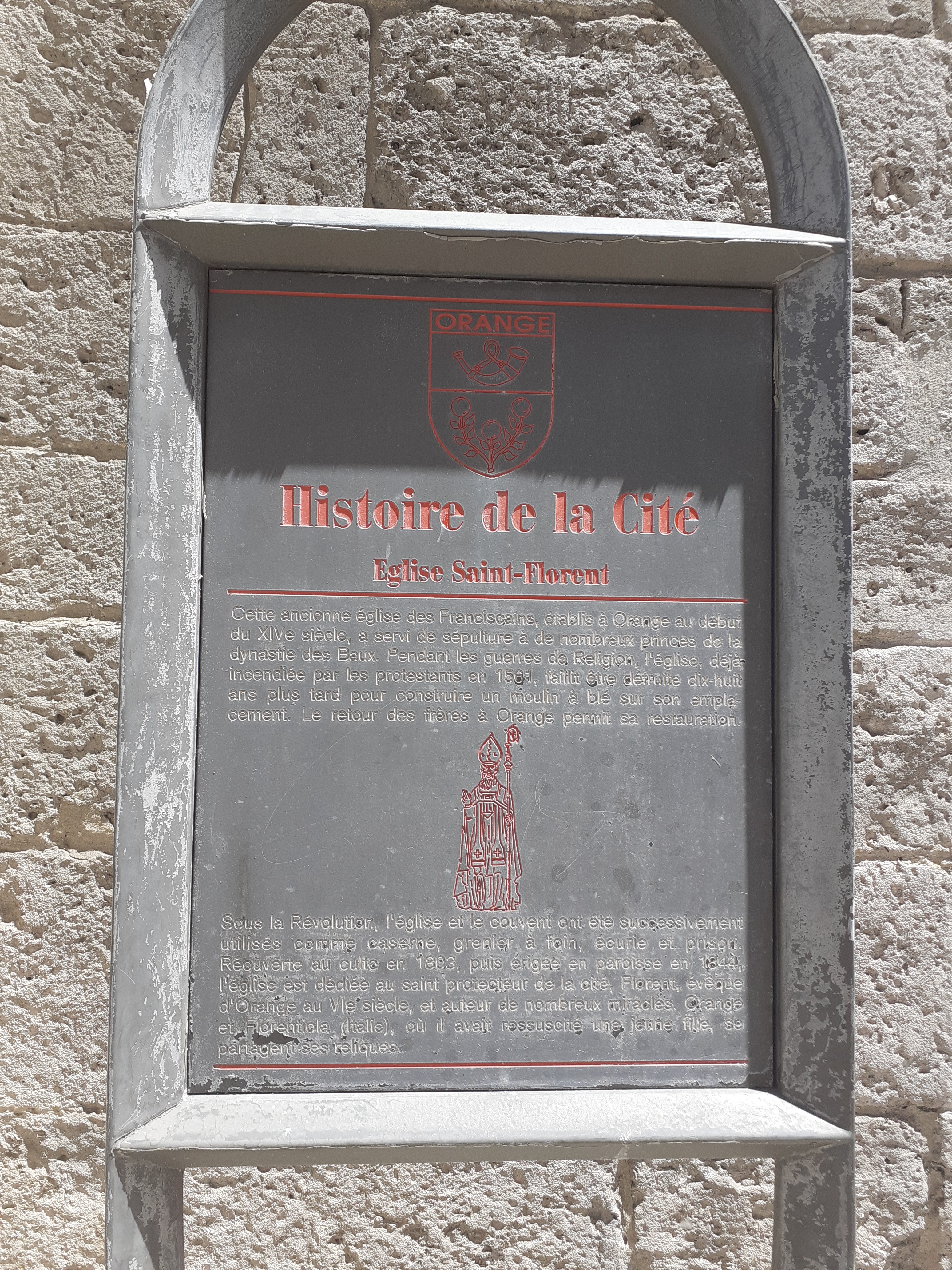 Bâtie au quatorzième siècle, l'église Saint-Florent d'Orange fut endommagée durant les guerres de religion au seizième église. Elle est en bon état actuellement. Pour ceux qui visitent le théâtre antique d'Orange juste en face, ne pas manquer de traverser la rue pour une courte visite.