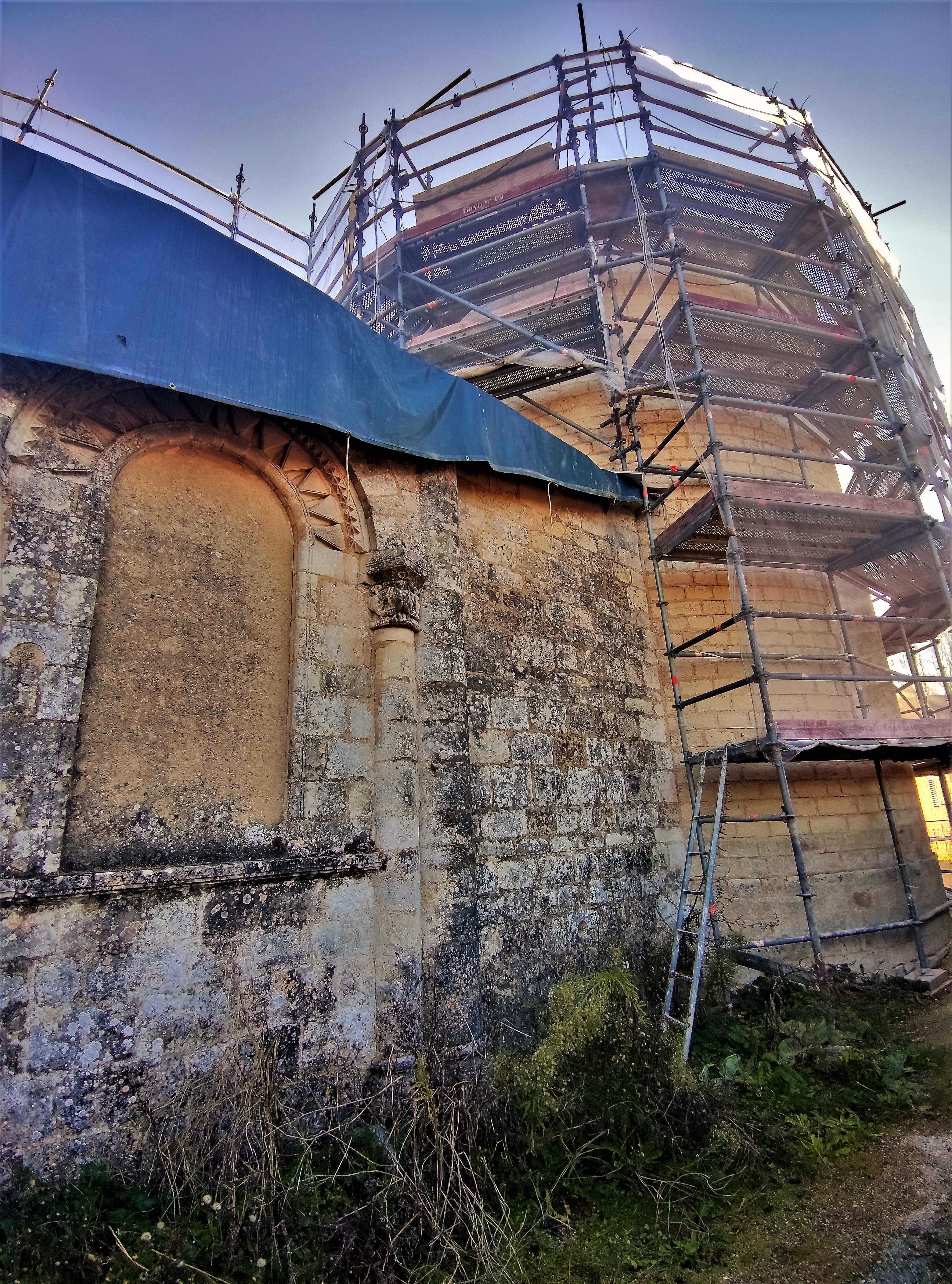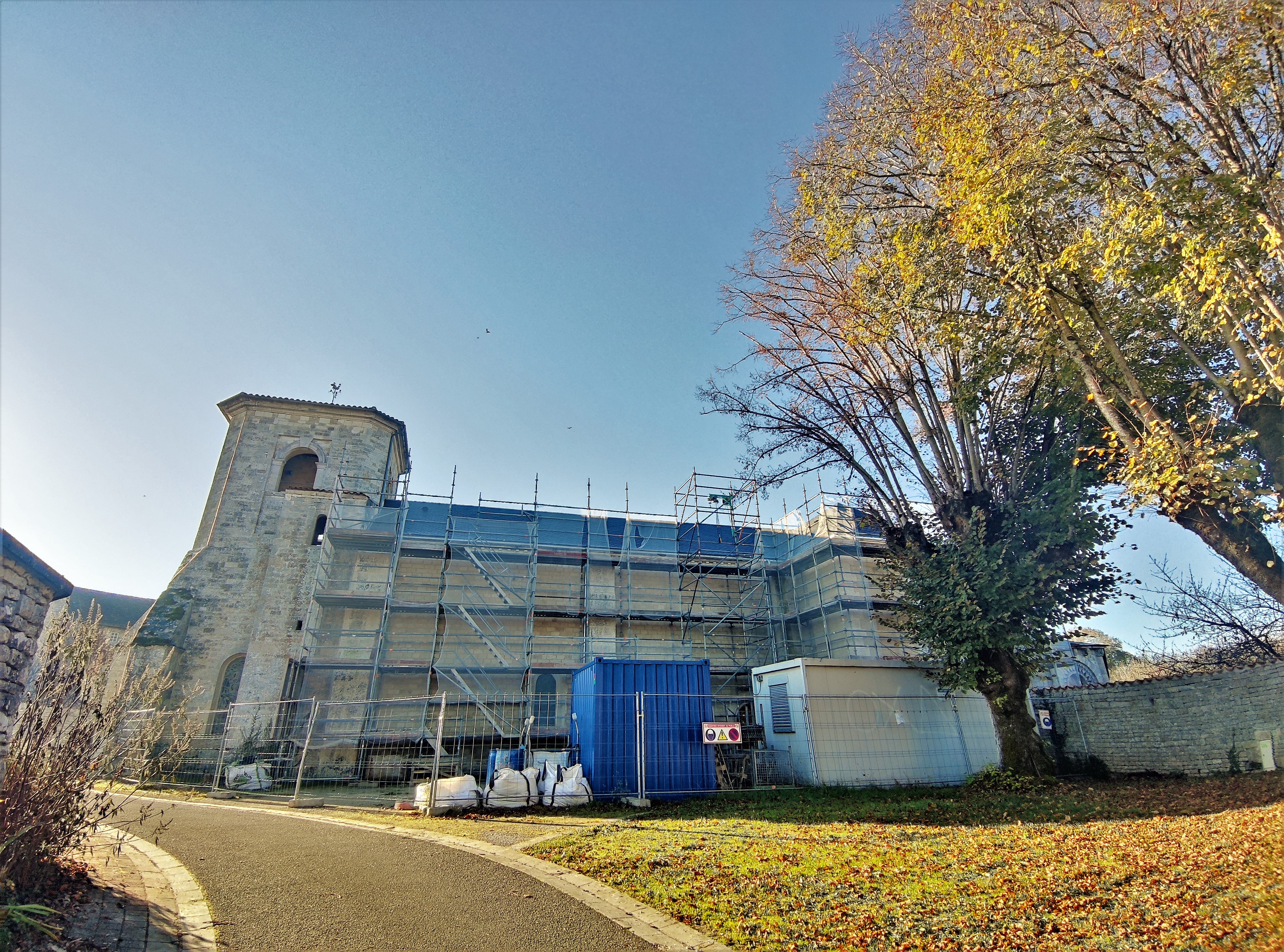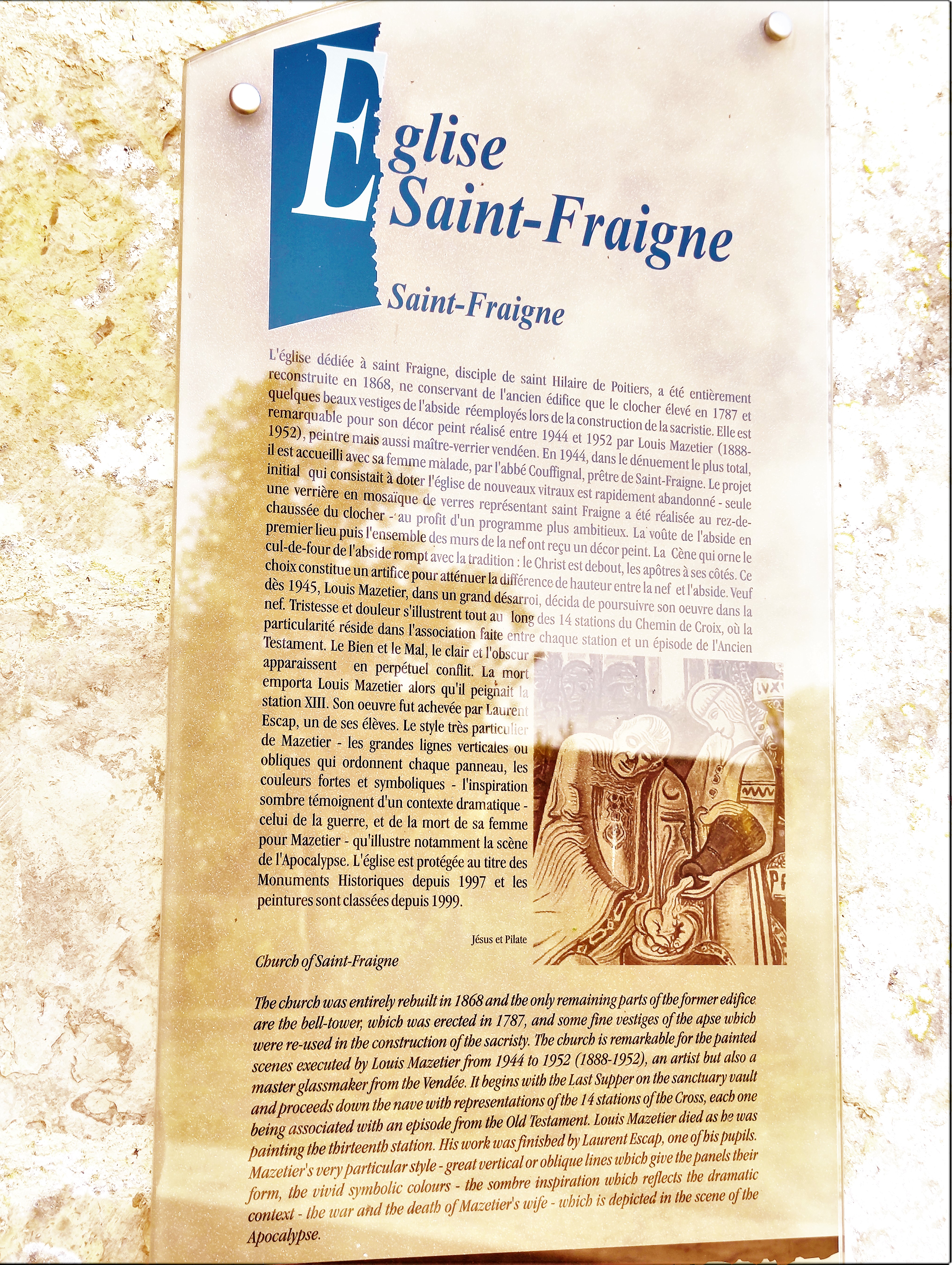 Fermée il y a 1 an pour restauration, l'église était accessible aujourd'hui. J'ai pu voir les peintures murales de Louis Mazetier, je les ai trouvées fascinantes. En plus de la signalétique, un guide imprimé ou/et une visite guidée sont une aide précieuse pour apprécier et comprendre, ils enrichissent l'intérêt de cette découverte. Pour info, Il faut s'adresser à la maison de l'eau ou à la mairie. Au 20ème, Louis Mazetier réalise en 8 années des décors peints : la voûte de l'abside et un chemin de croix. Les visages de divers personnages évoquent ceux de personnes que l'artiste avait rencontré et celui de sa femme décédée apparait plusieurs fois. Laurent Escap, son élève, terminera la 14è station, Louis Mazetier décéda durant sa réalisation. Deux hommes, deux artistes, deux vies ponctuées de drames qui influencèrent leurs créations ; deux existences solitaires ou/et isolées qui furent responsables de leurs oublis. Louis Mazetier réalisa le carton préparatoire au vitrail situé dans la partie basse du clocher, vitrail présent lors de ma venue. Les autres vitraux, créations de Laurent Escap, étaient absents, ils étaient en restauration. Rappel : une prieurale existait au 9è. Guerres et vicissitudes au cours des siècles seront responsables de nombreux changements et reconstructions ; La prieurale devenue église paroissiale fut reconstruite au 19è, on préserva le clocher-porche du 18è.