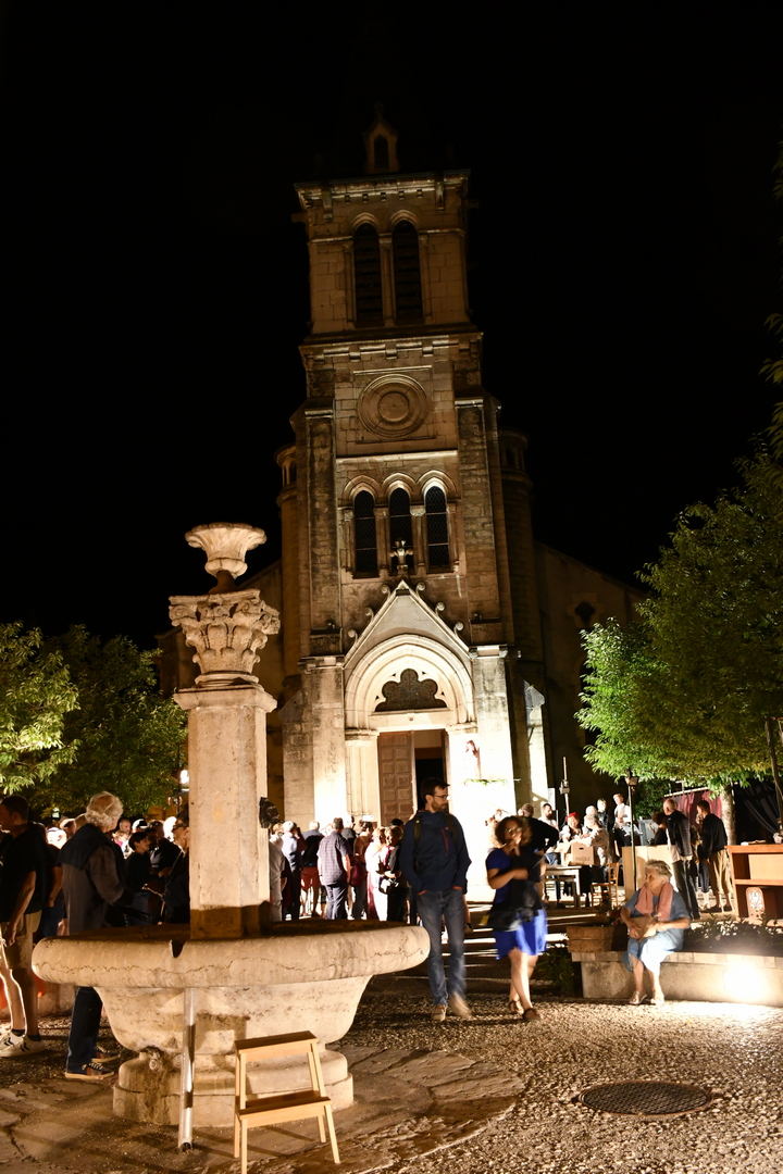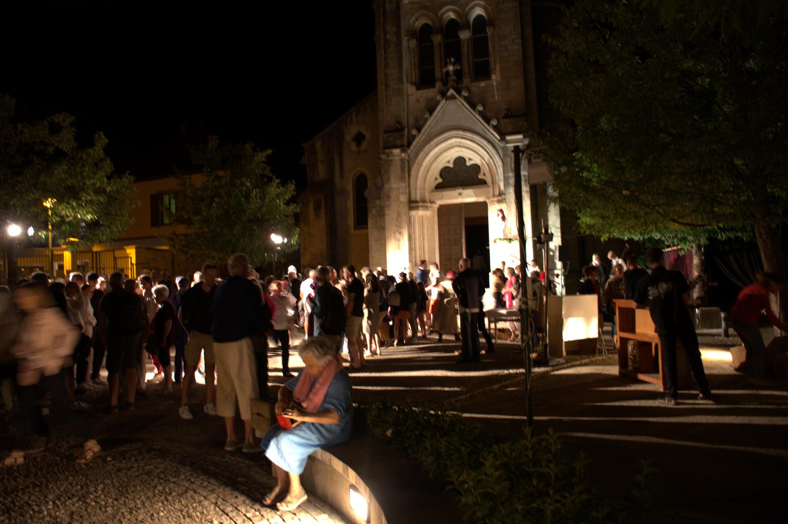 belle petite place au pied de l'église Saint-François, pour créer un événement festif. Spectacle vivant Son et Lumière LYdie 21/7/2023