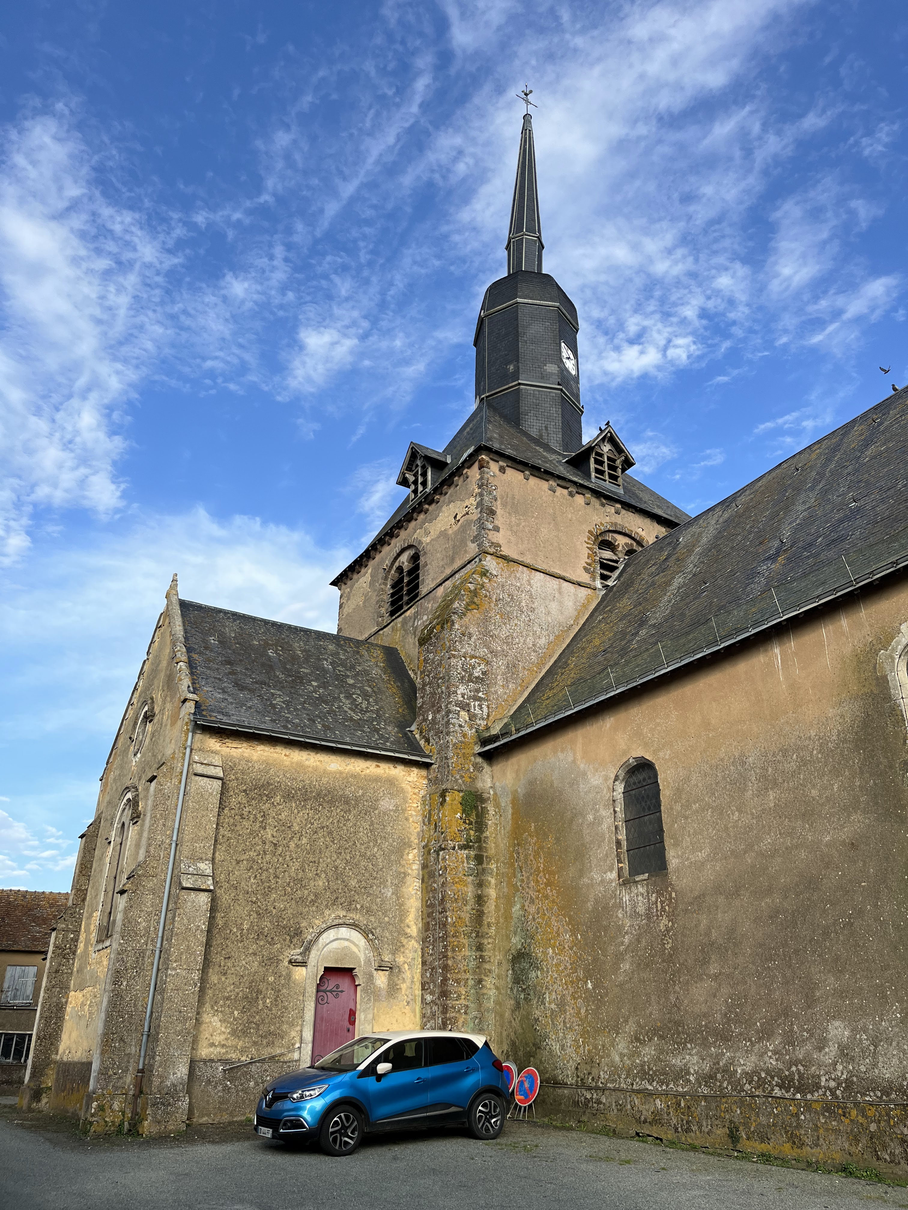 A besoin de beaucoup de restauration, du moins à l’extérieur (je n’ai pas pu entrer) C’est une église très différente de celles auxquelles je suis habitué et différente de celles du nord, le drôle de clocher est ce qui m’a fait m’arrêter en route vers Le Mans. Vous pouvez voir très clairement l'église au centre du village lorsque vous arrivez par la route nord.