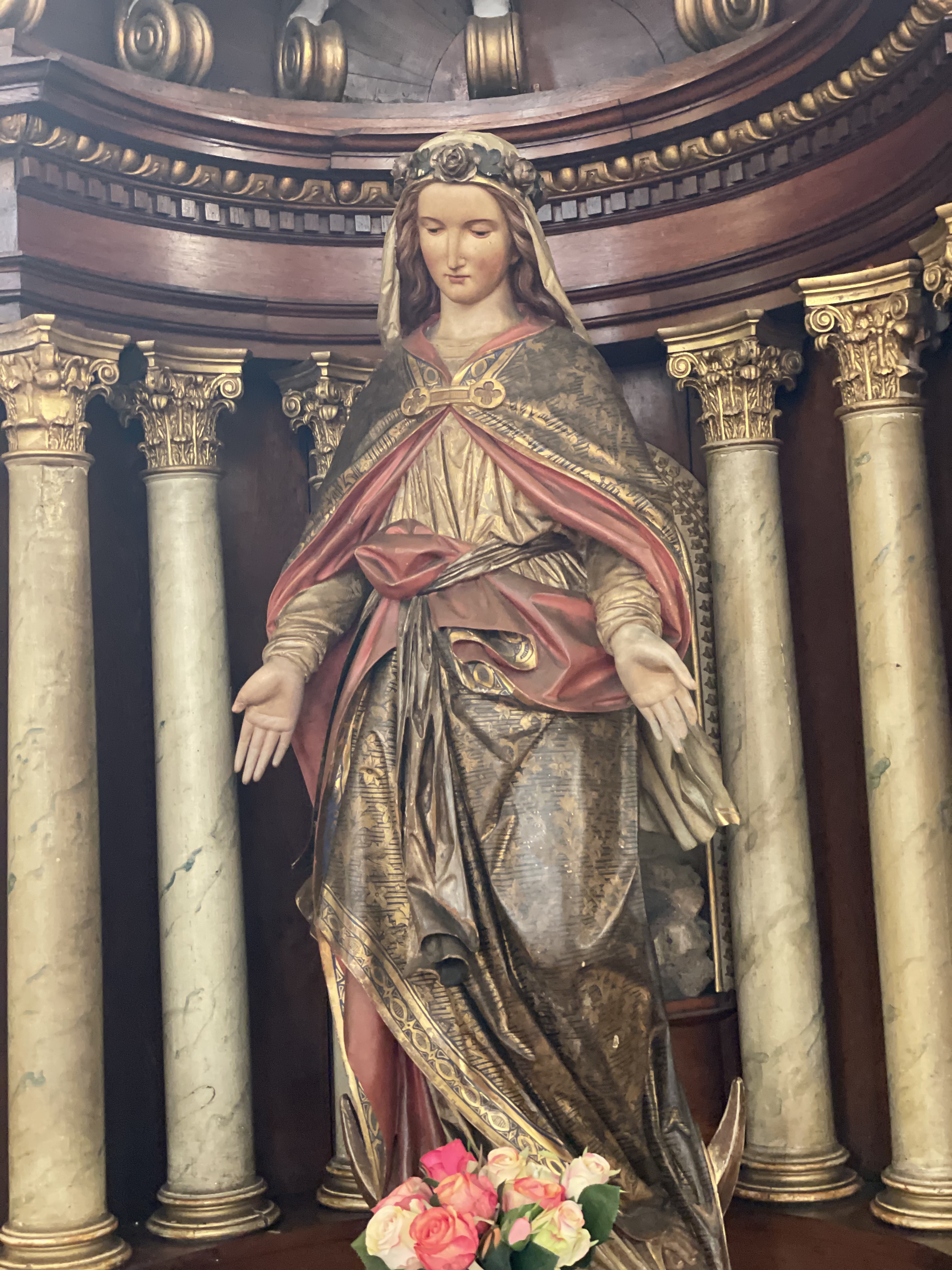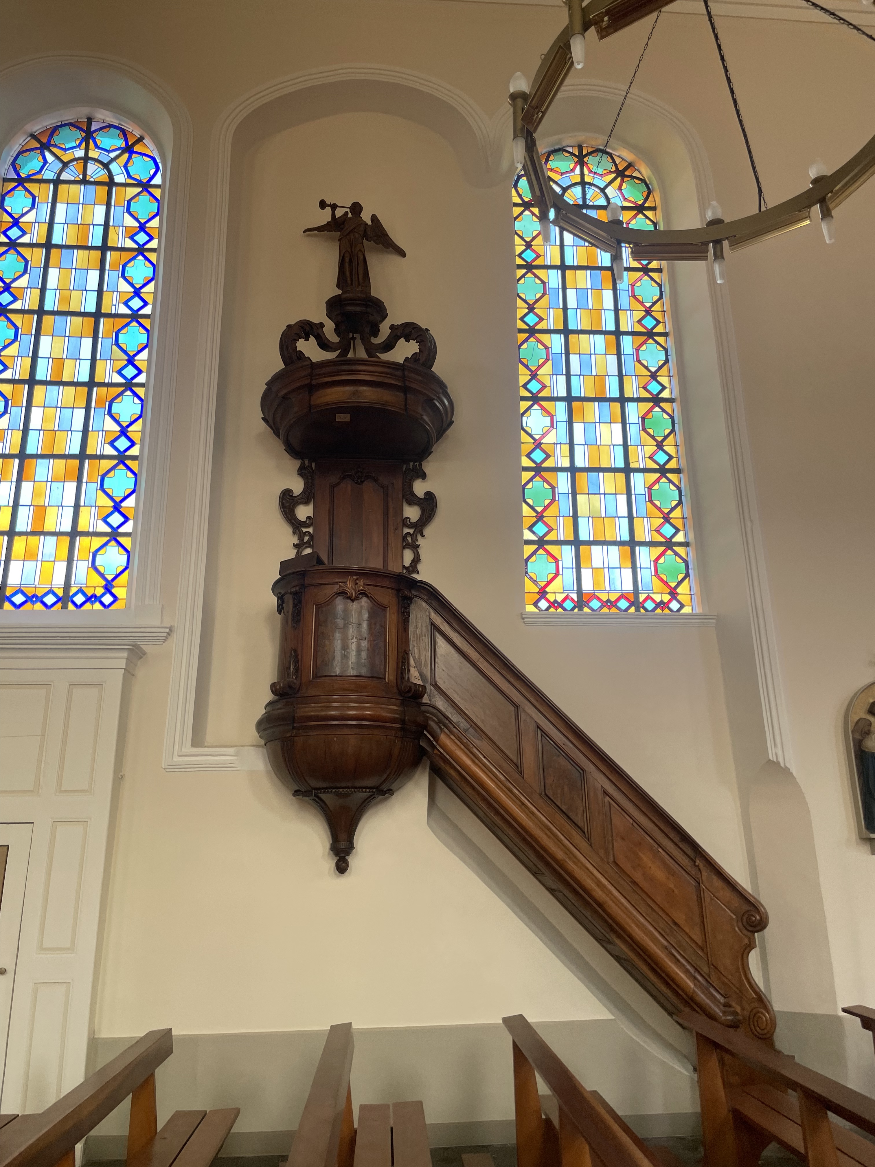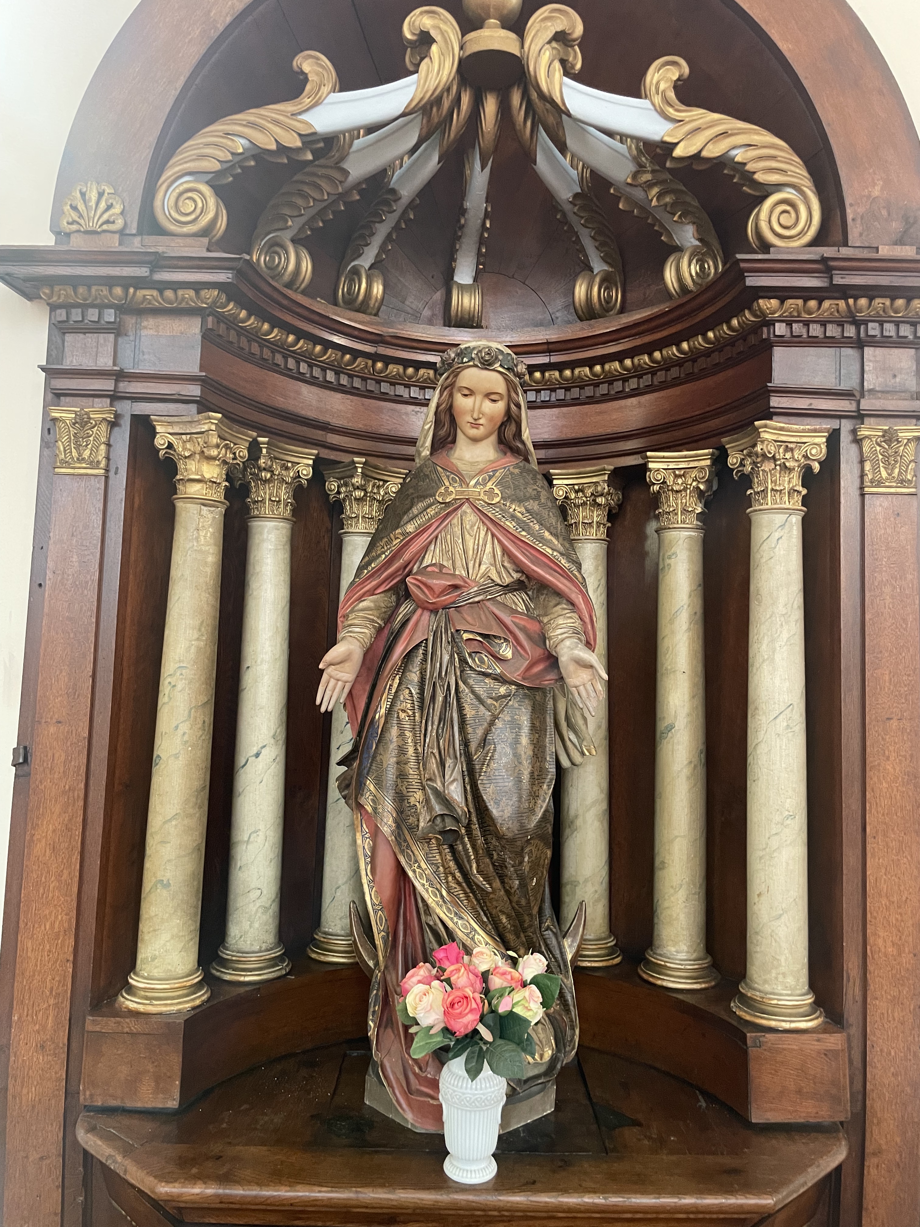 Très belle église, construite en 1805 à l'époque où le village comptait 1000 habitants. L'espace est très lumineux et propice au recueillement. Le clocher date du 12e siècle, mais la toiture a été reconstruite après les bombardements de la deuxième guerre. Merci au sacristain qui nous a donné ces explications, et merci aussi d'avoir ouvert ce lieu de cultes aux visiteurs.