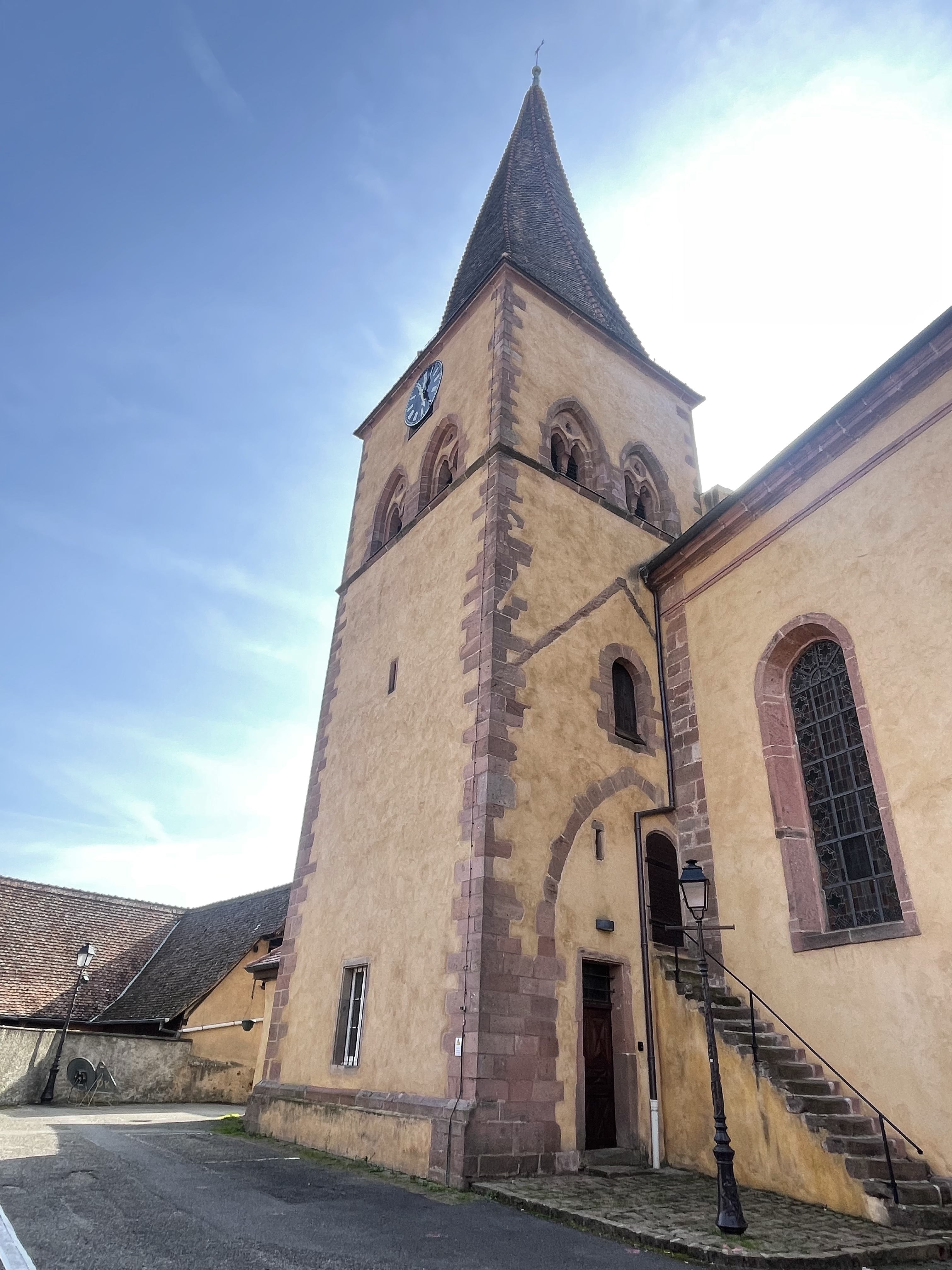 Joli village en hauteur, plusieurs points de vue sur la vallée d 'Alsace et son église avec son clocher vrillé