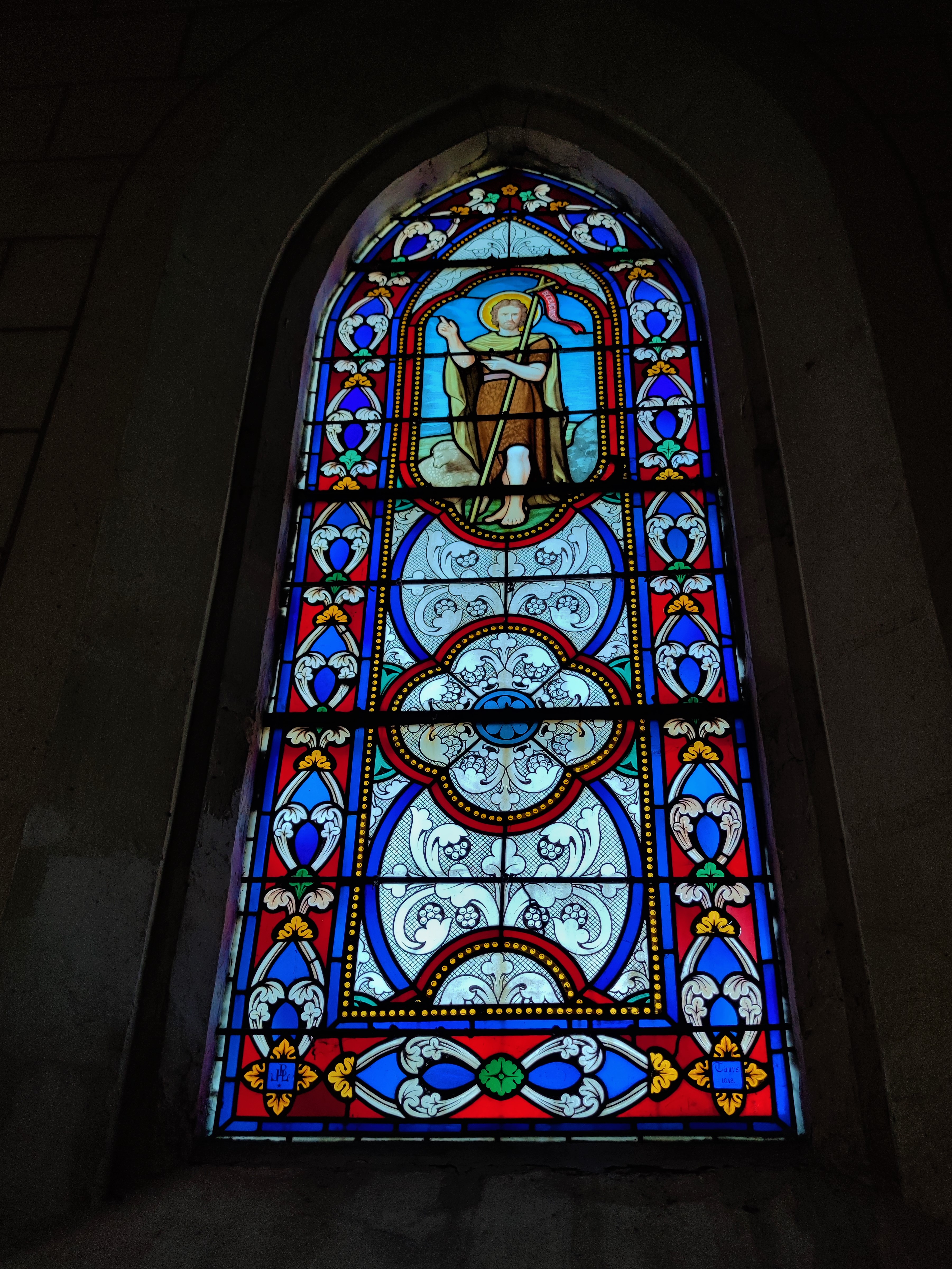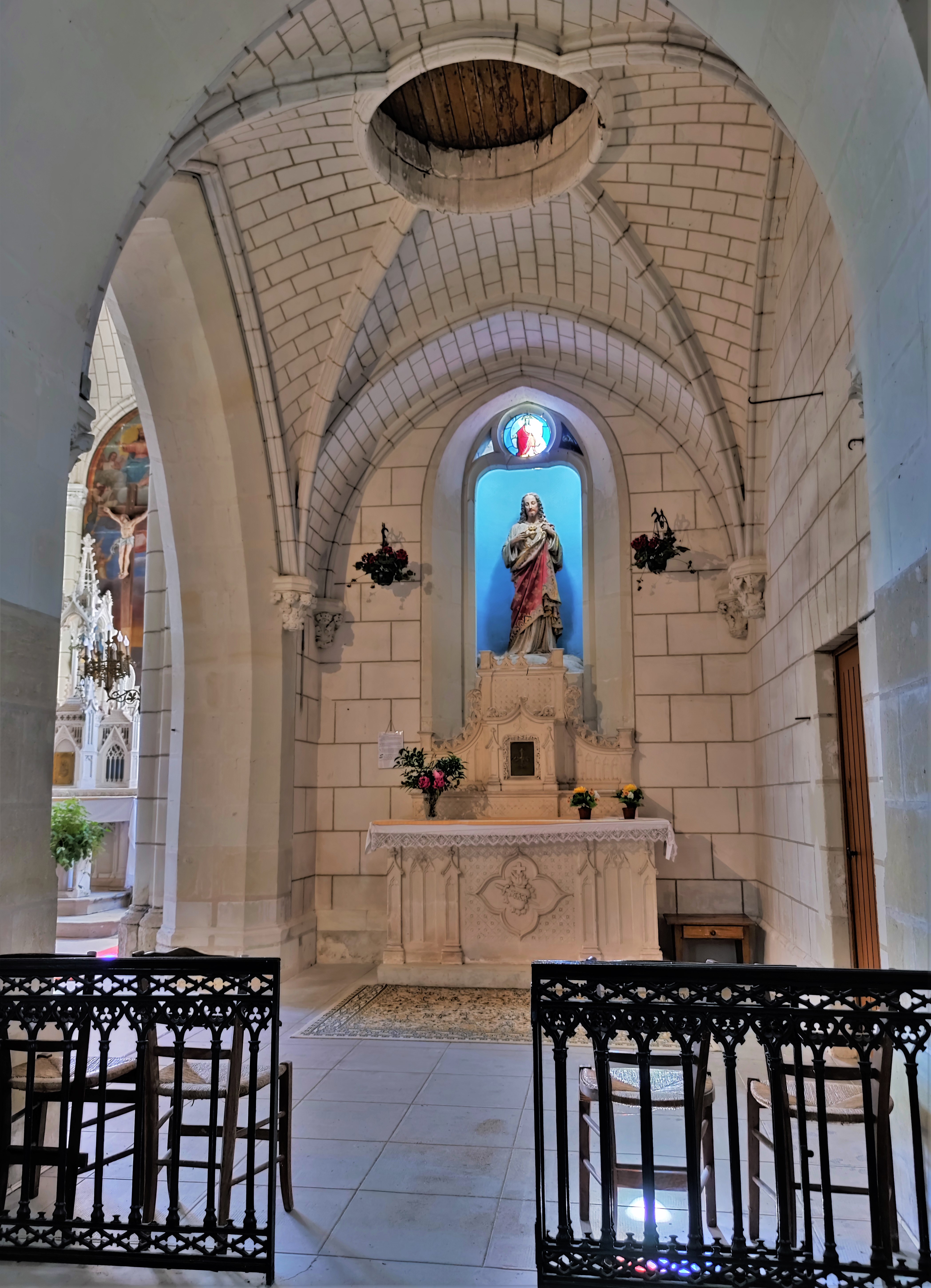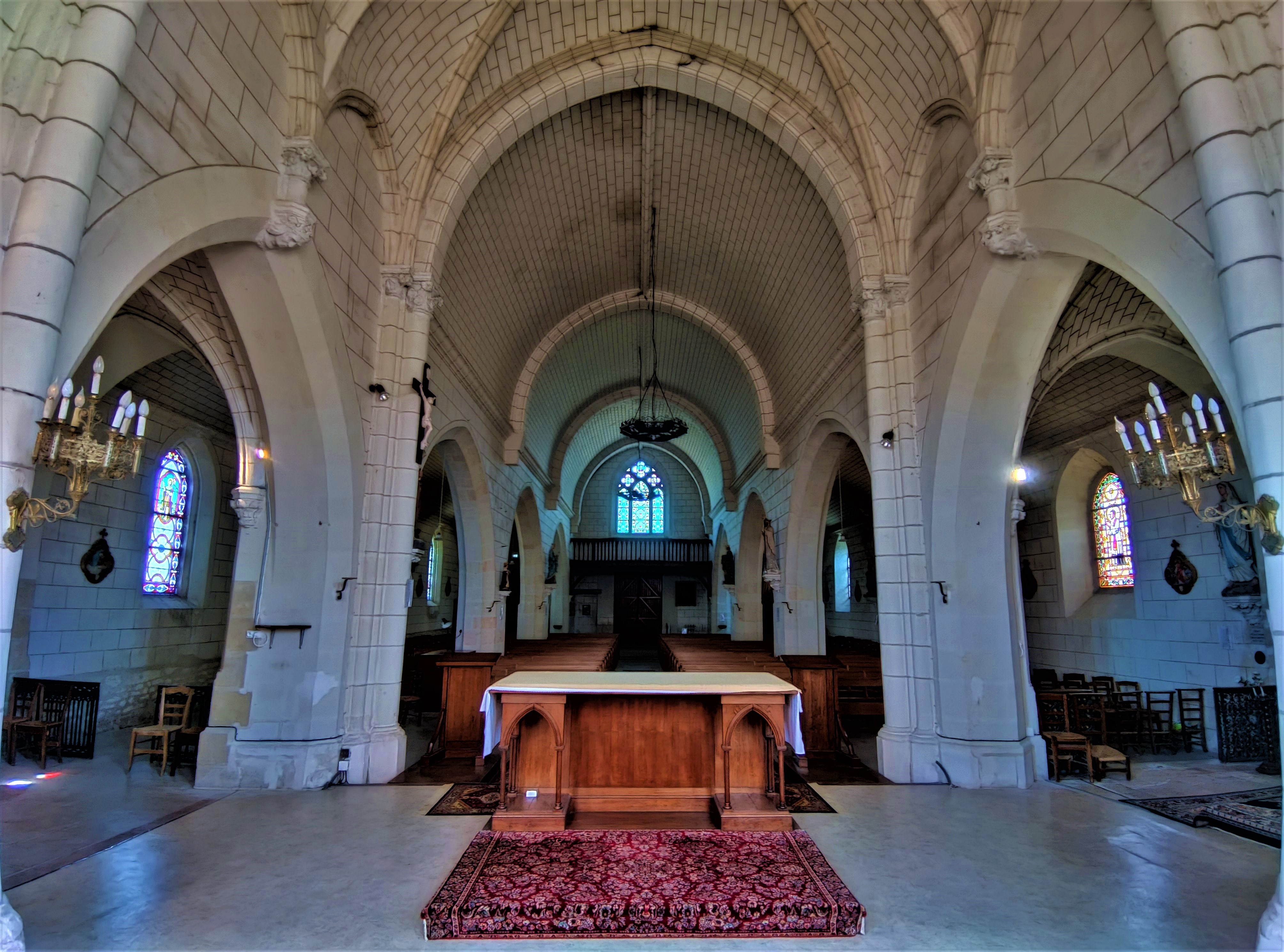 J'ai trouvé chaleureux cet édifice contemporain au style néogothique peu affirmé. Ouverte et accueillante, cette église construite au 20ème siècle (1909-1911) a été édifiée sur les décombres de l'église du 19ème siècle (1848). Cette dernière fut détruite par un incendie, quelques réemplois sont visibles. Le style architectural est donné comme néogothique. Mais les courbes en plein cintre des 3 vaisseaux de la nef apportent une certaine douceur. Le chœur est superbe avec ses 2 baies et son décor peint. Ces 3 vaisseaux sont assez bas, on ne se sent pas écrasé par des élévations démonstratrices de richesses et de pouvoirs. Les vitraux réalisés par des maîtres vitraillistes tourangeaux sont de belle facture.