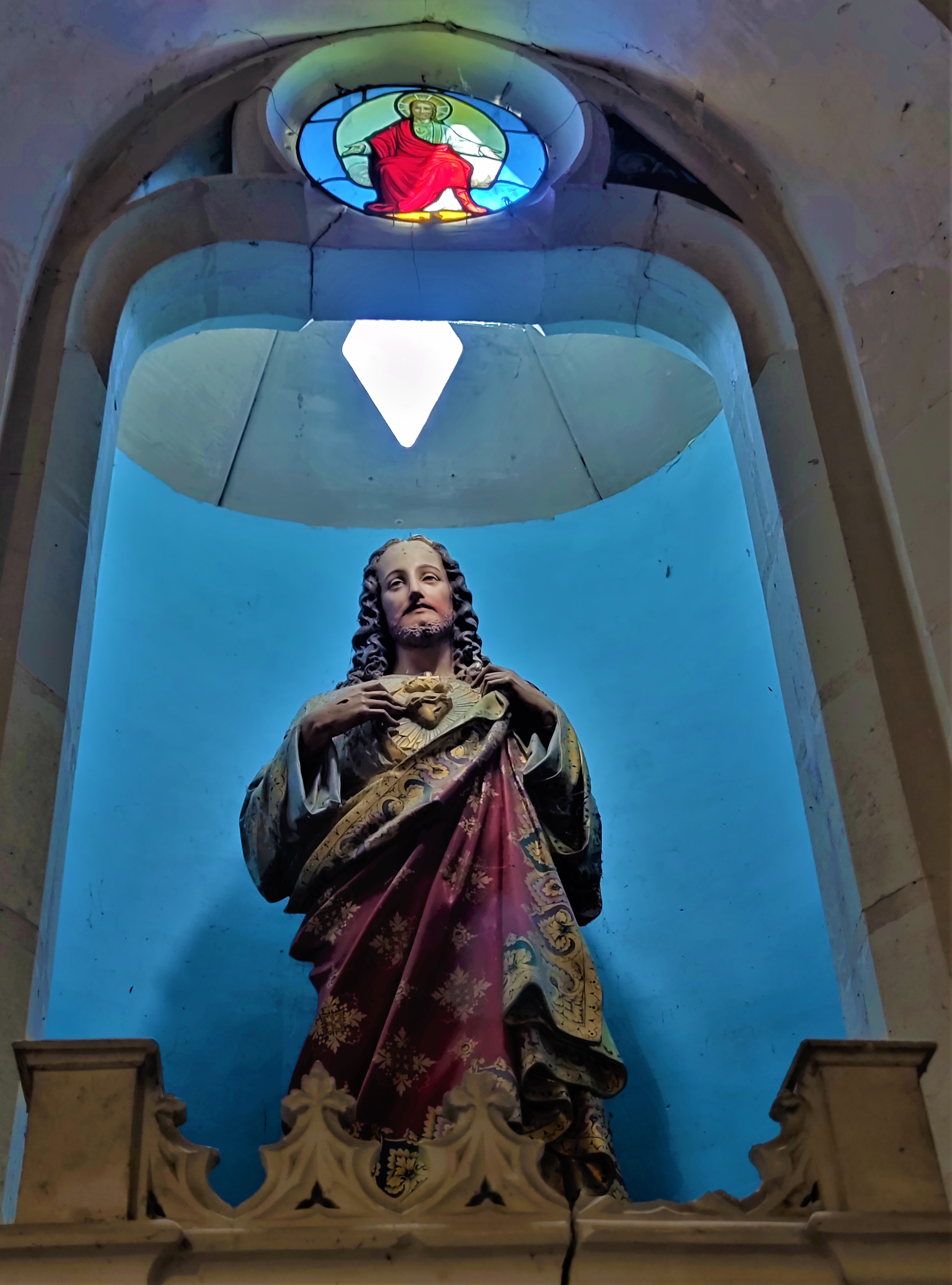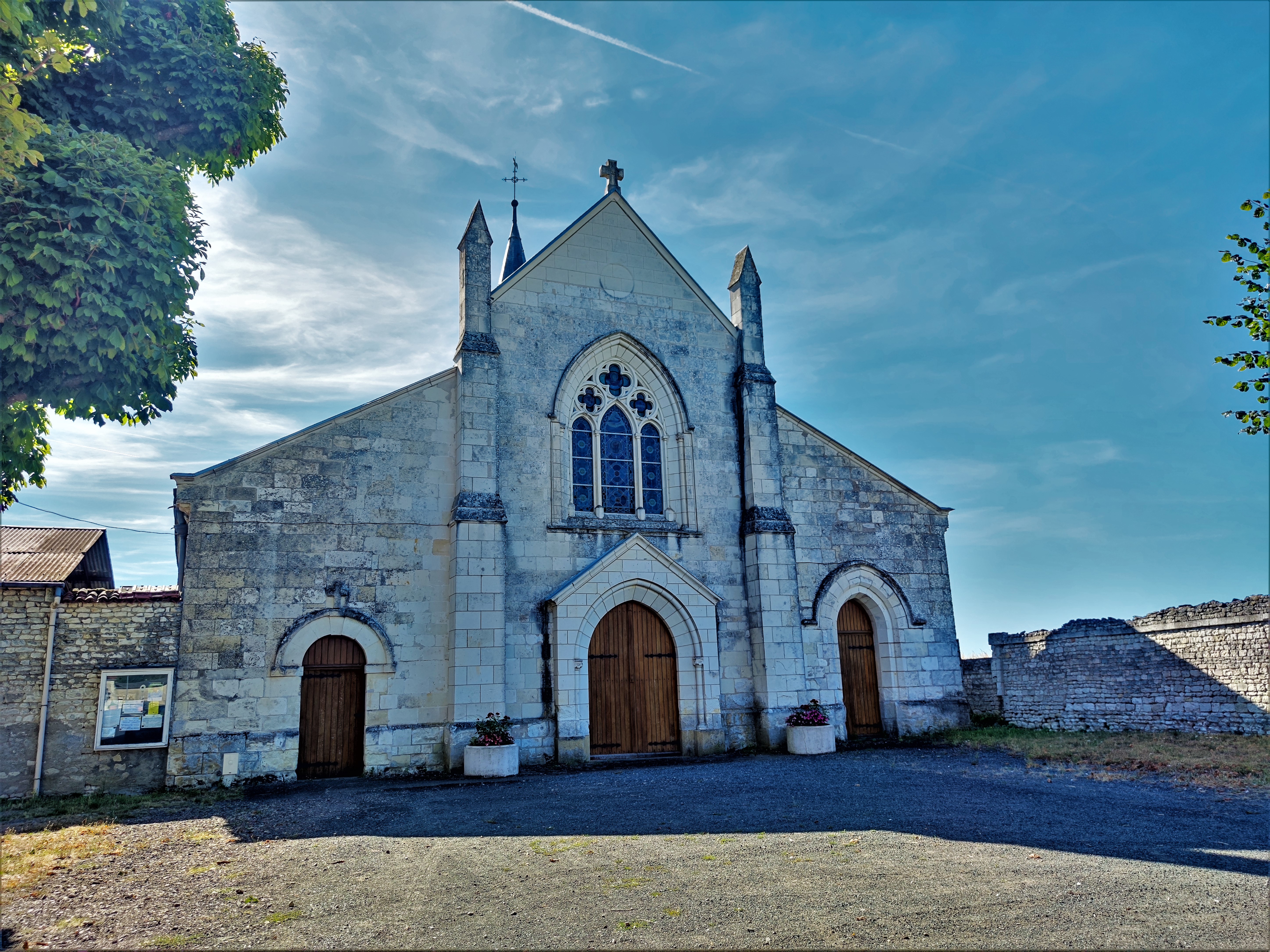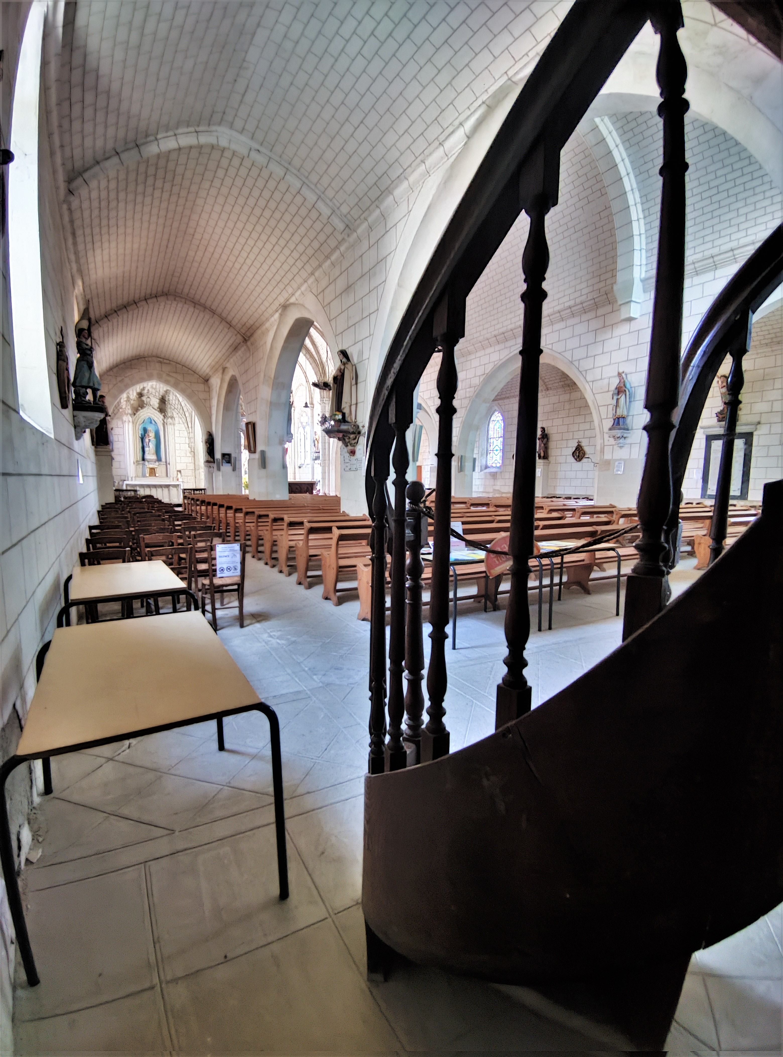 J'ai trouvé chaleureux cet édifice contemporain au style néogothique peu affirmé. Ouverte et accueillante, cette église construite au 20ème siècle (1909-1911) a été édifiée sur les décombres de l'église du 19ème siècle (1848). Cette dernière fut détruite par un incendie, quelques réemplois sont visibles. Le style architectural est donné comme néogothique. Mais les courbes en plein cintre des 3 vaisseaux de la nef apportent une certaine douceur. Le chœur est superbe avec ses 2 baies et son décor peint. Ces 3 vaisseaux sont assez bas, on ne se sent pas écrasé par des élévations démonstratrices de richesses et de pouvoirs. Les vitraux réalisés par des maîtres vitraillistes tourangeaux sont de belle facture.