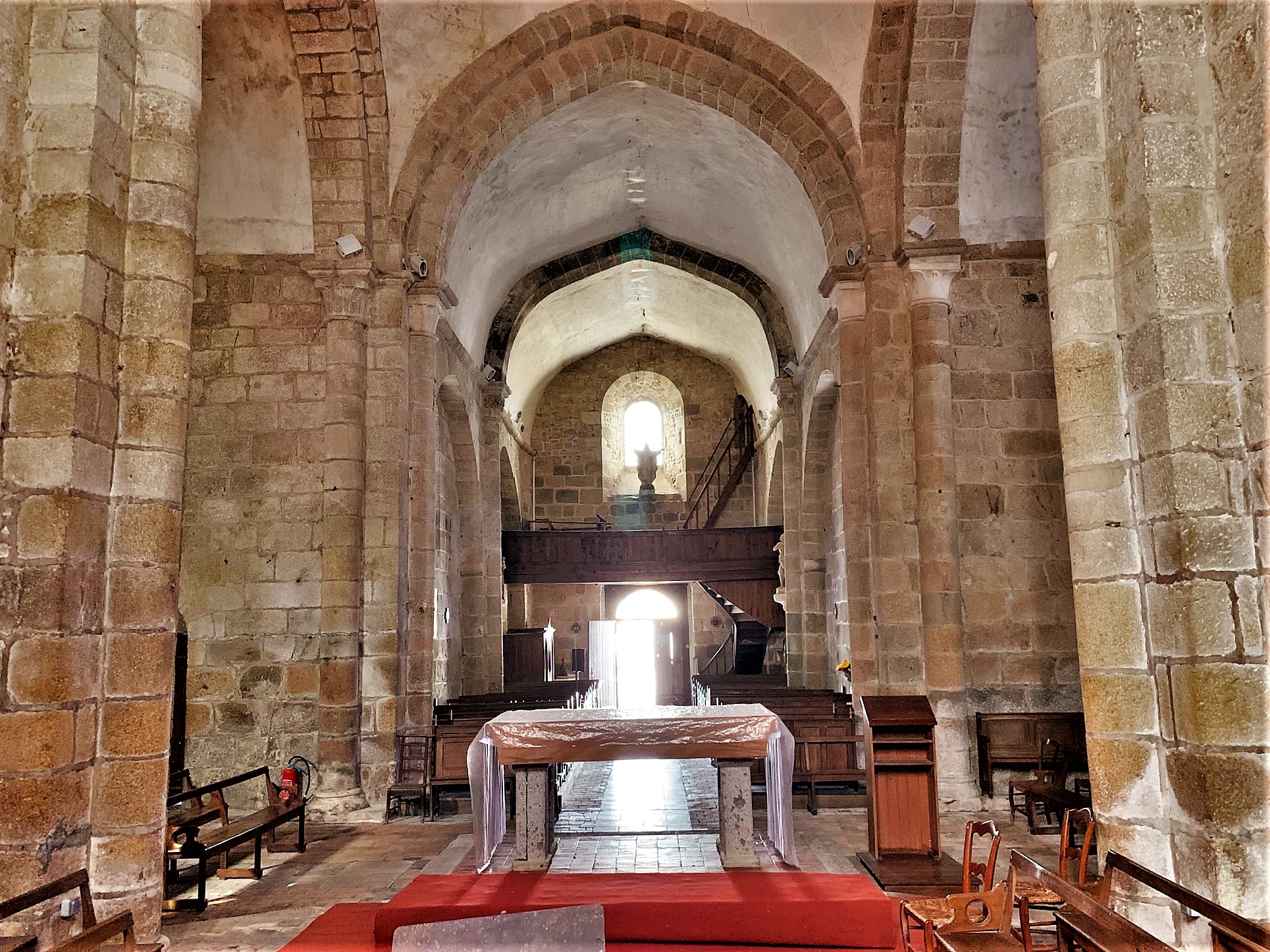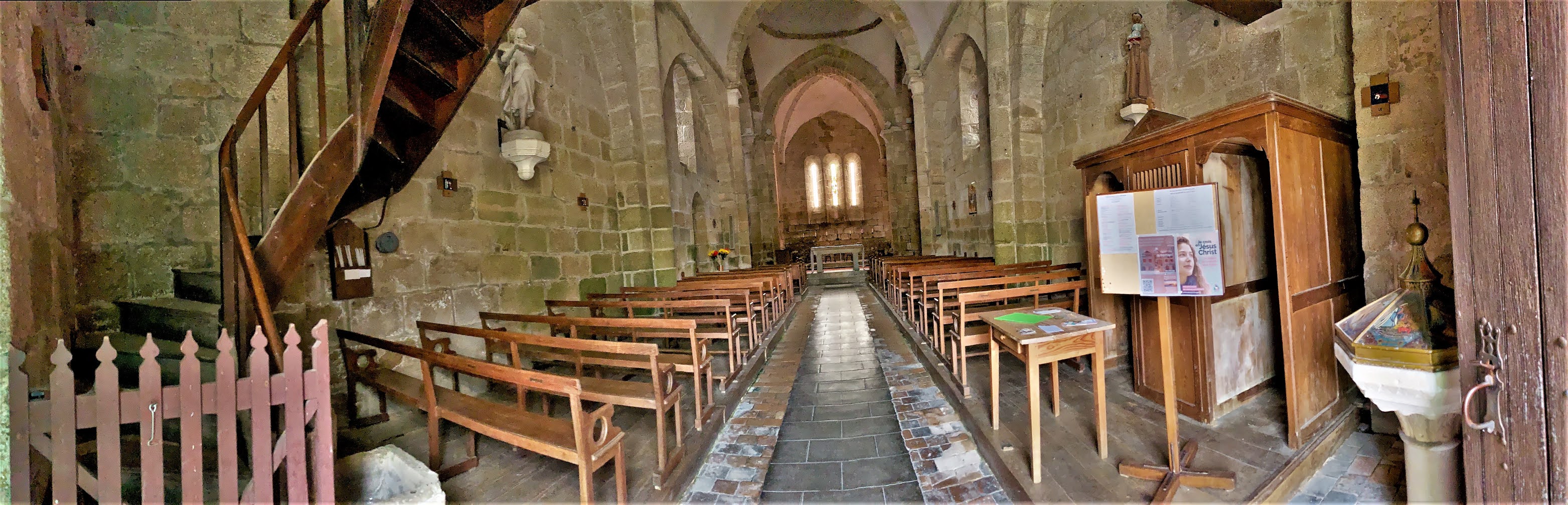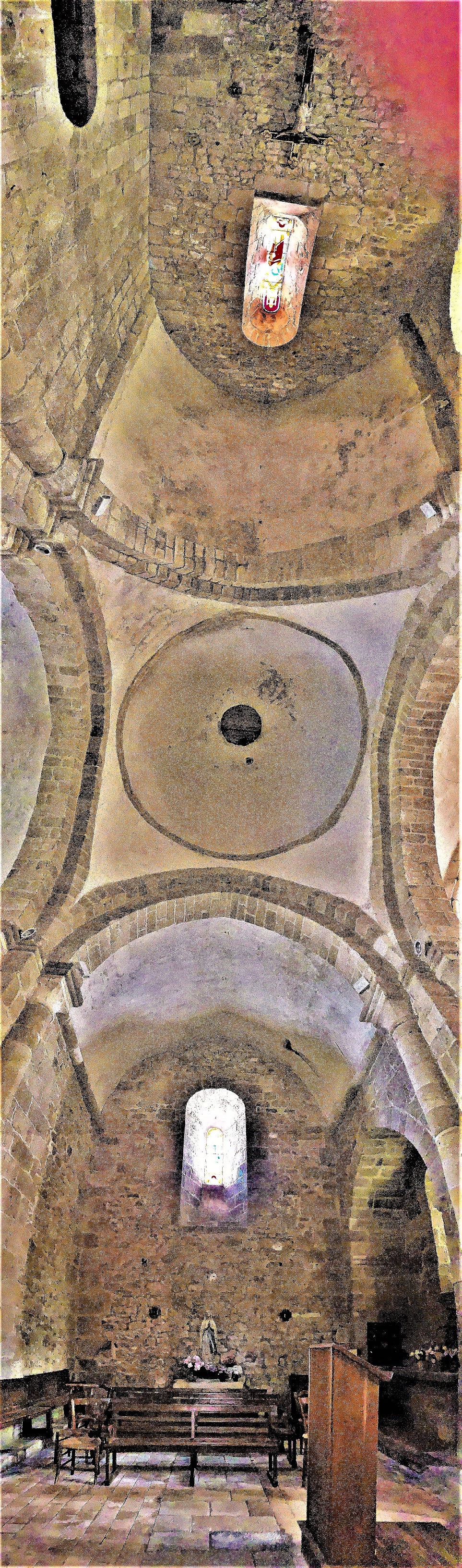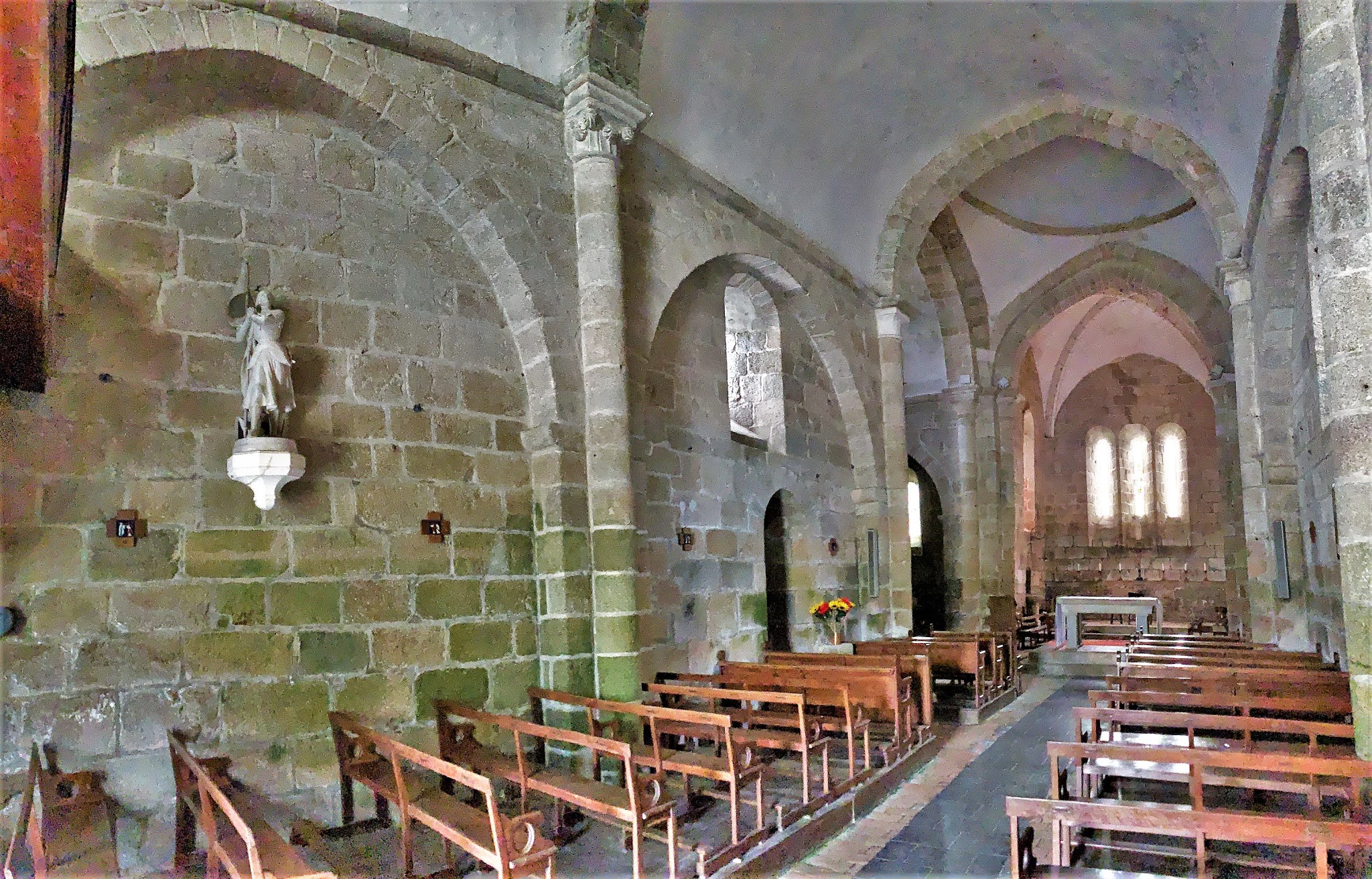 Une église fortifiée du 12ème siècle, authentique et caractéristique. Une église du 12ème siècle très authentique, et typique par ses ajouts défensifs, communs à d'autres églises fortifiées de la région. La nef, le chœur et le transept ont été rehaussés avec ouvertures de tirs, une échauguette bâtie au nord ouest de la façade, tout cela sans doute au moment des guerres de religions. La coupole de la croisée du transept est un modèle du genre, les voûtes en berceau des bras et en berceau brisé de la nef nous plongent en période romane. Le chevet plat est ouvert de 3 baies fort élégantes, le chœur est voûté en croisée d'ogive. Une remarquable statue de la vierge, du 15ème siècle, en pierre, est abritée dans l'église. Une remarquable statue de la vierge, du 15ème siècle, en pierre, est abritée dans l'église.