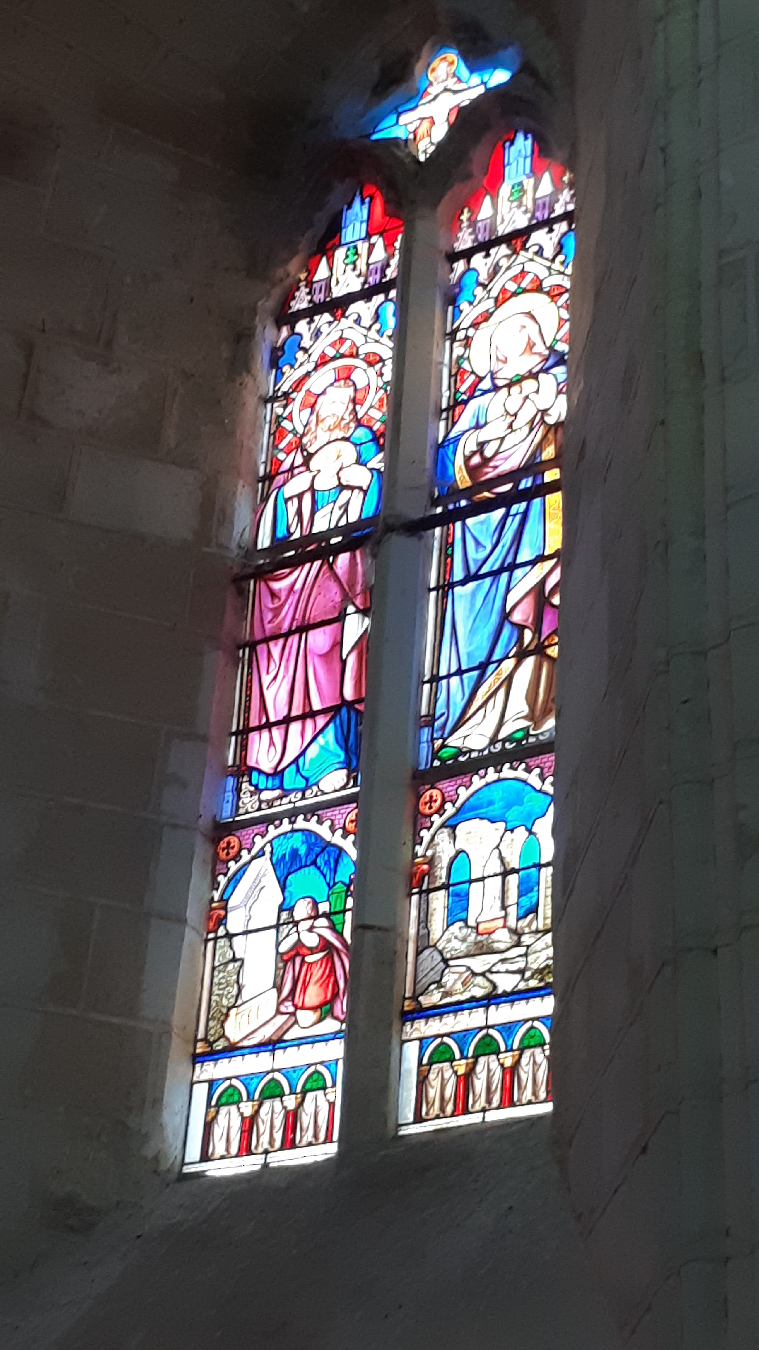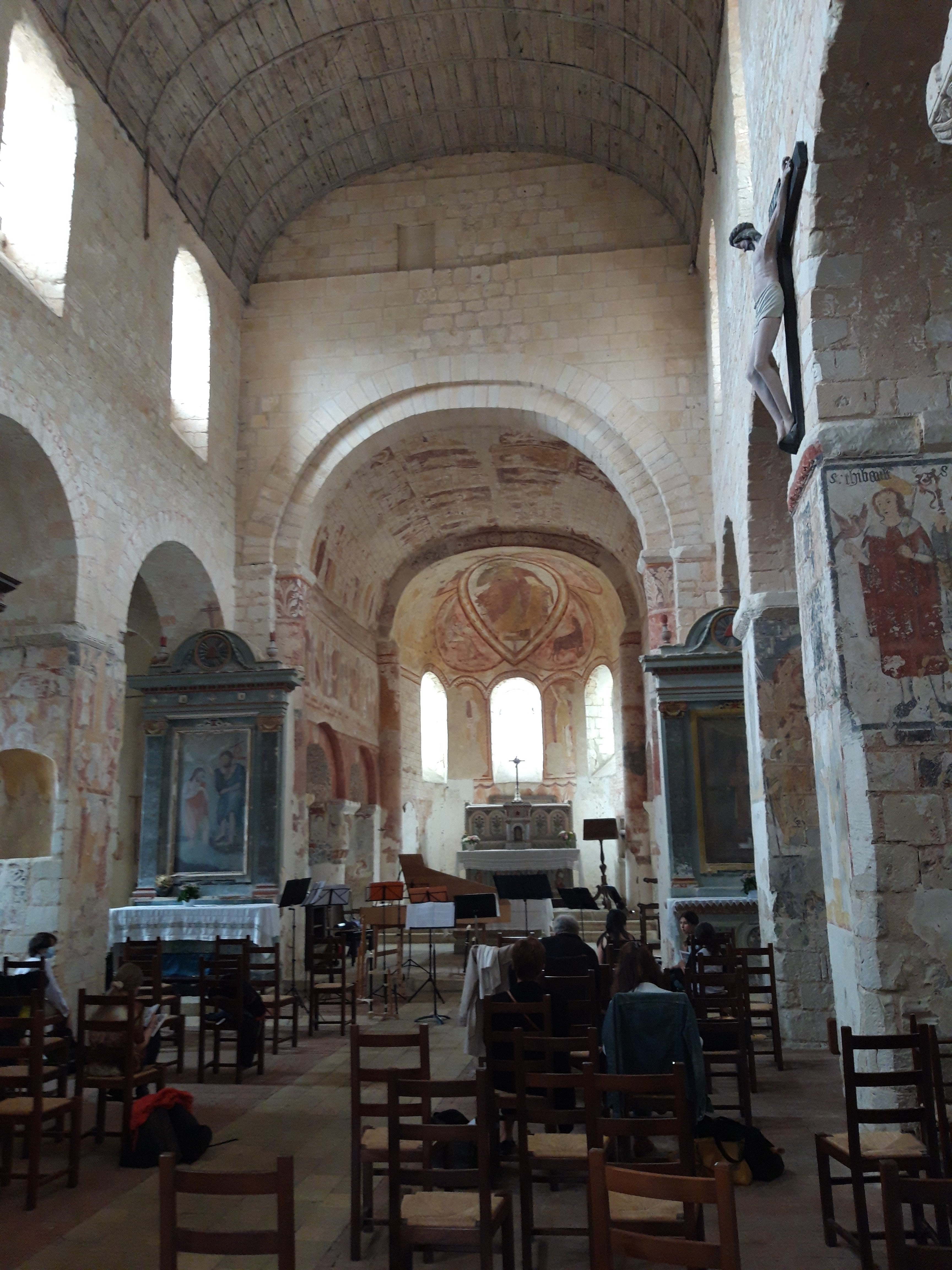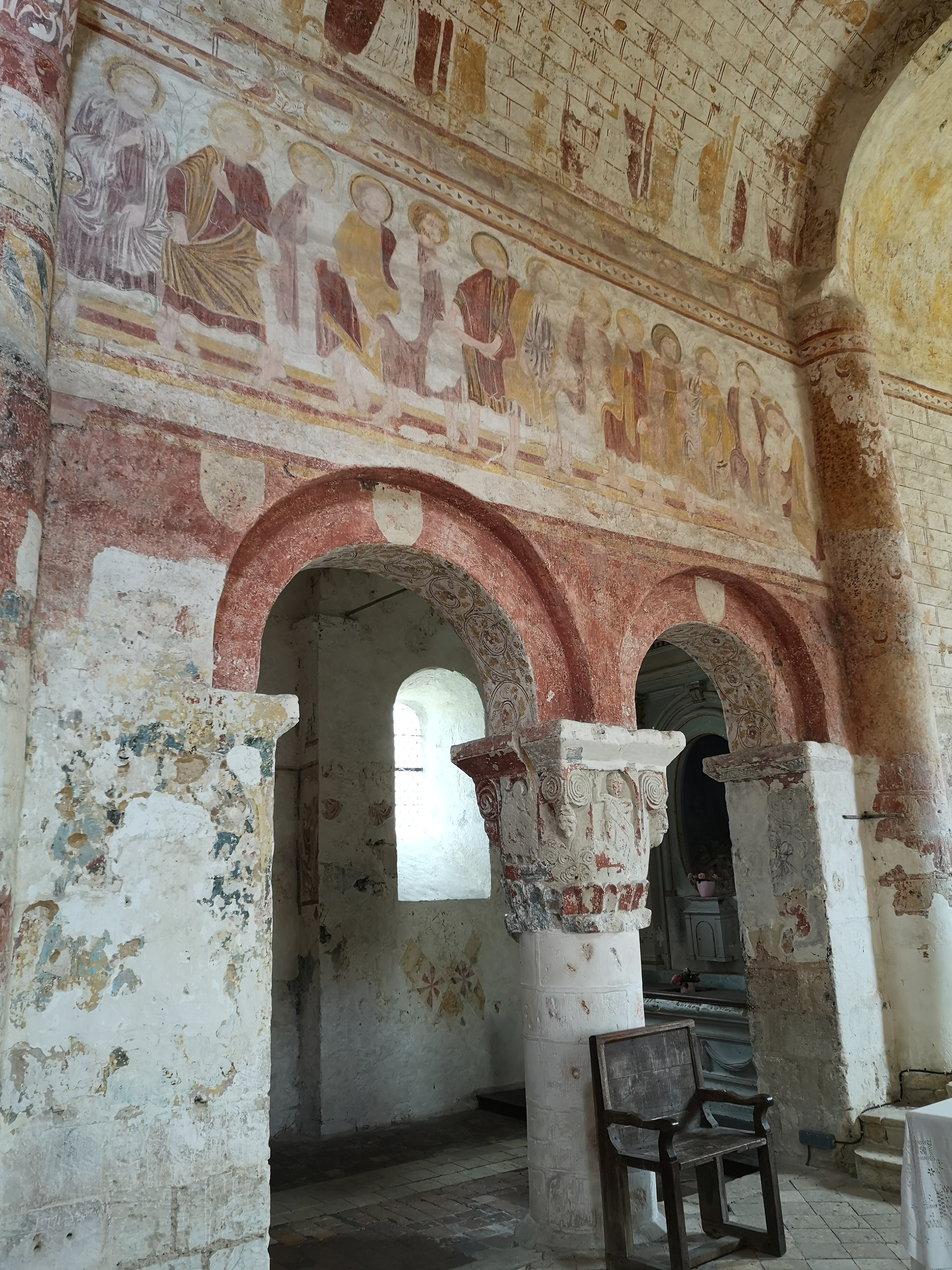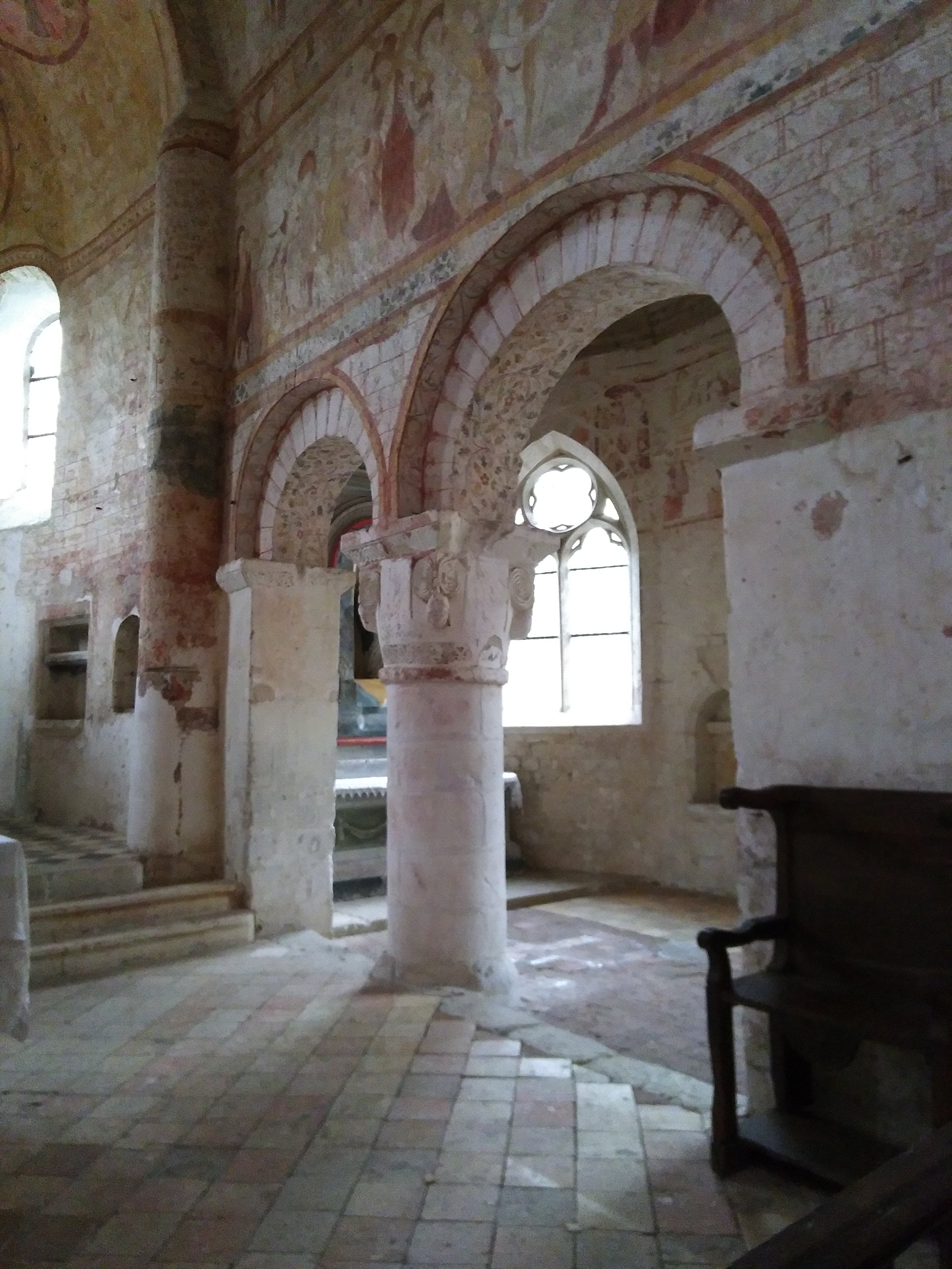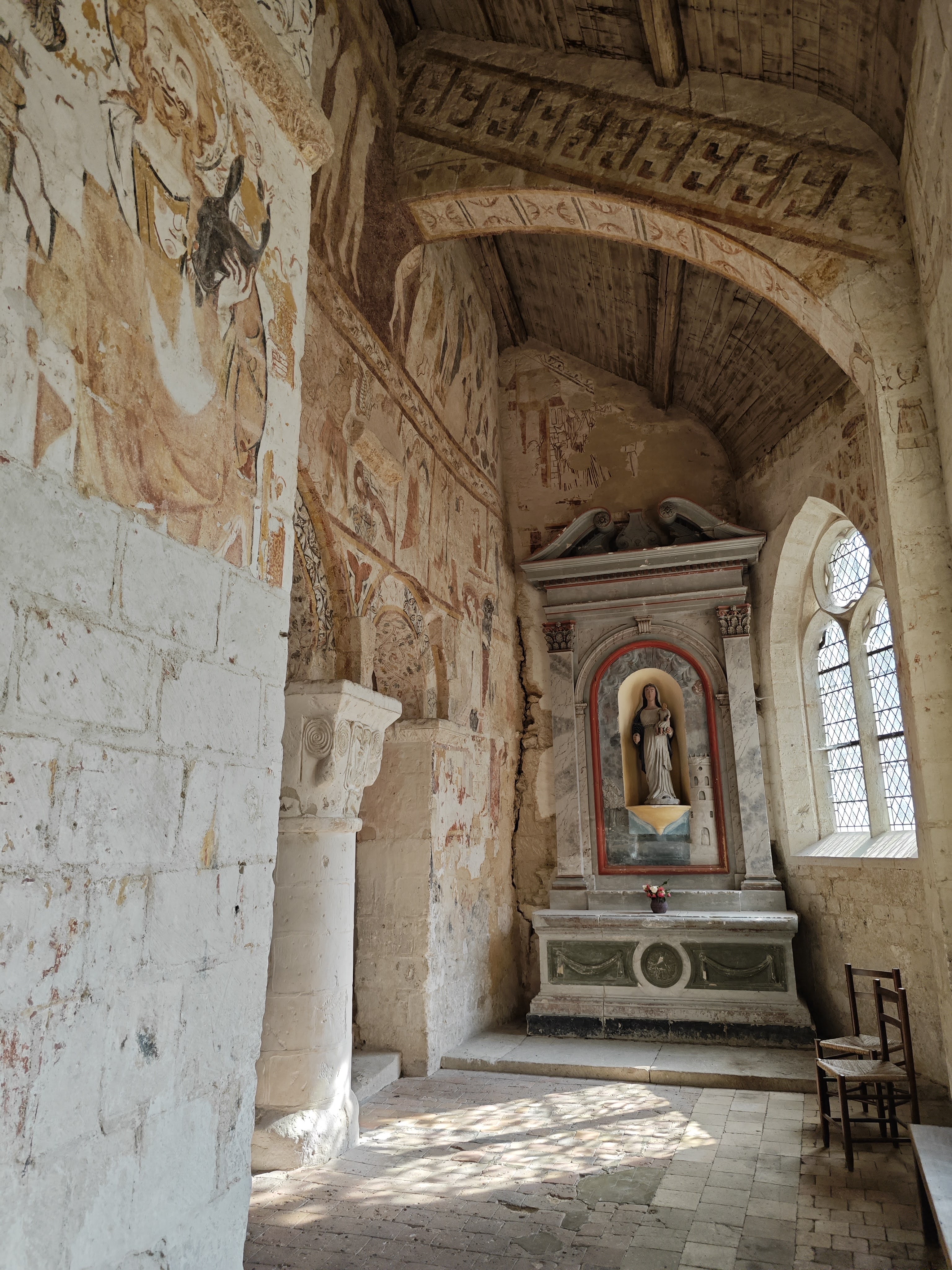 Une église extraordinaire, un beau village et son château. Une église extraordinaire, des peintures murales (fresque et détrempe) réalisées du 12ème au 16ème siècle ornent l'ensemble des murs et colonnes de l'édifice. Un baptême du Christ, représenté entièrement nu, et un arbre de Jessé, sont les fresques considérées comme les plus anciennes, datées du 12ème siècle. Des chapiteaux sculptés, en réemploi, issus probablement de monuments carolingiens, peints eux-aussi, sont à découvrir près du chœur. J'ai bien aimé cette découverte, agrémentée d'une visite guidée par un monsieur érudit, en train de former une personne chargée des visites guidées du Week-end suivant ; ce fut ma chance.