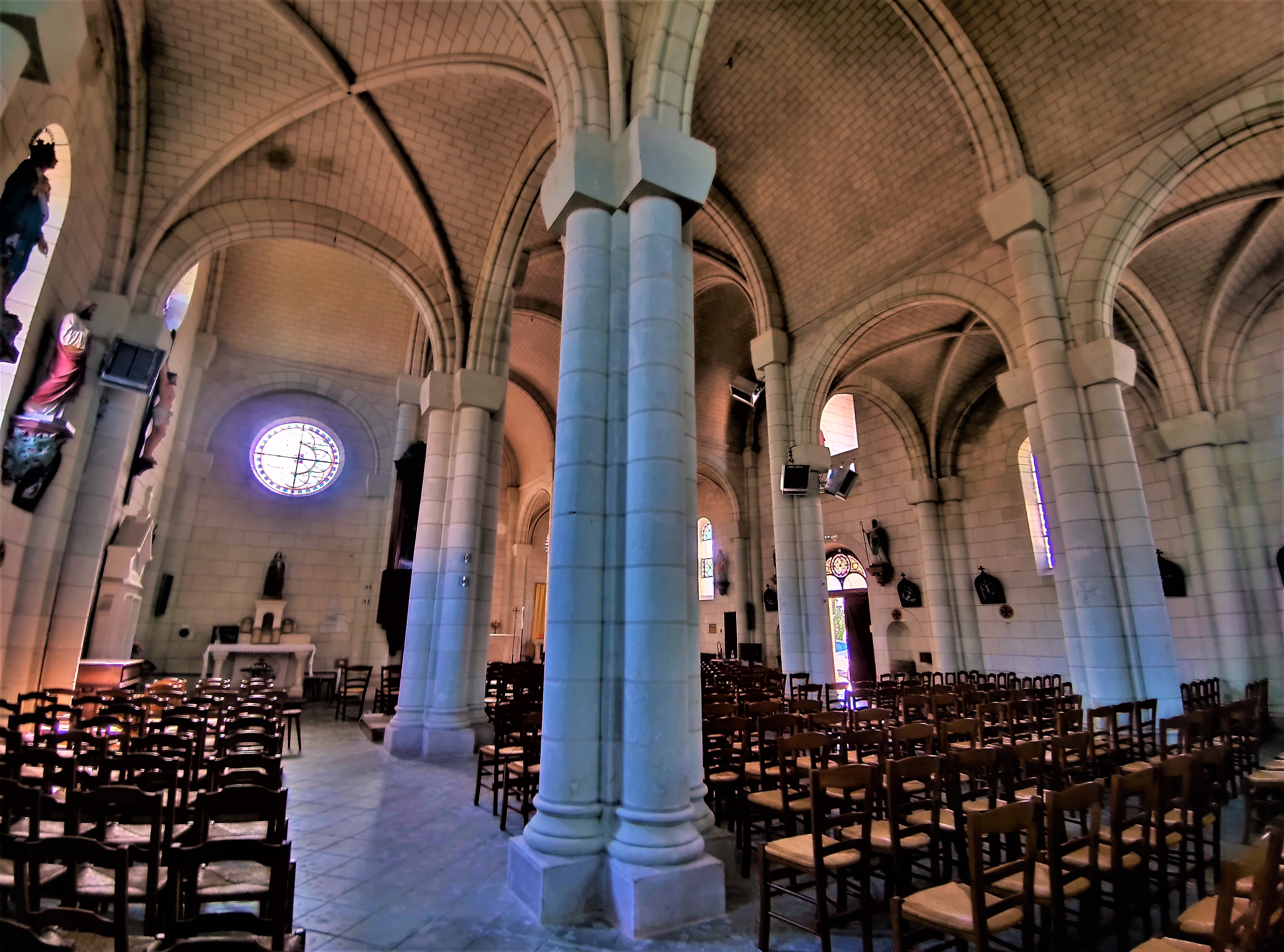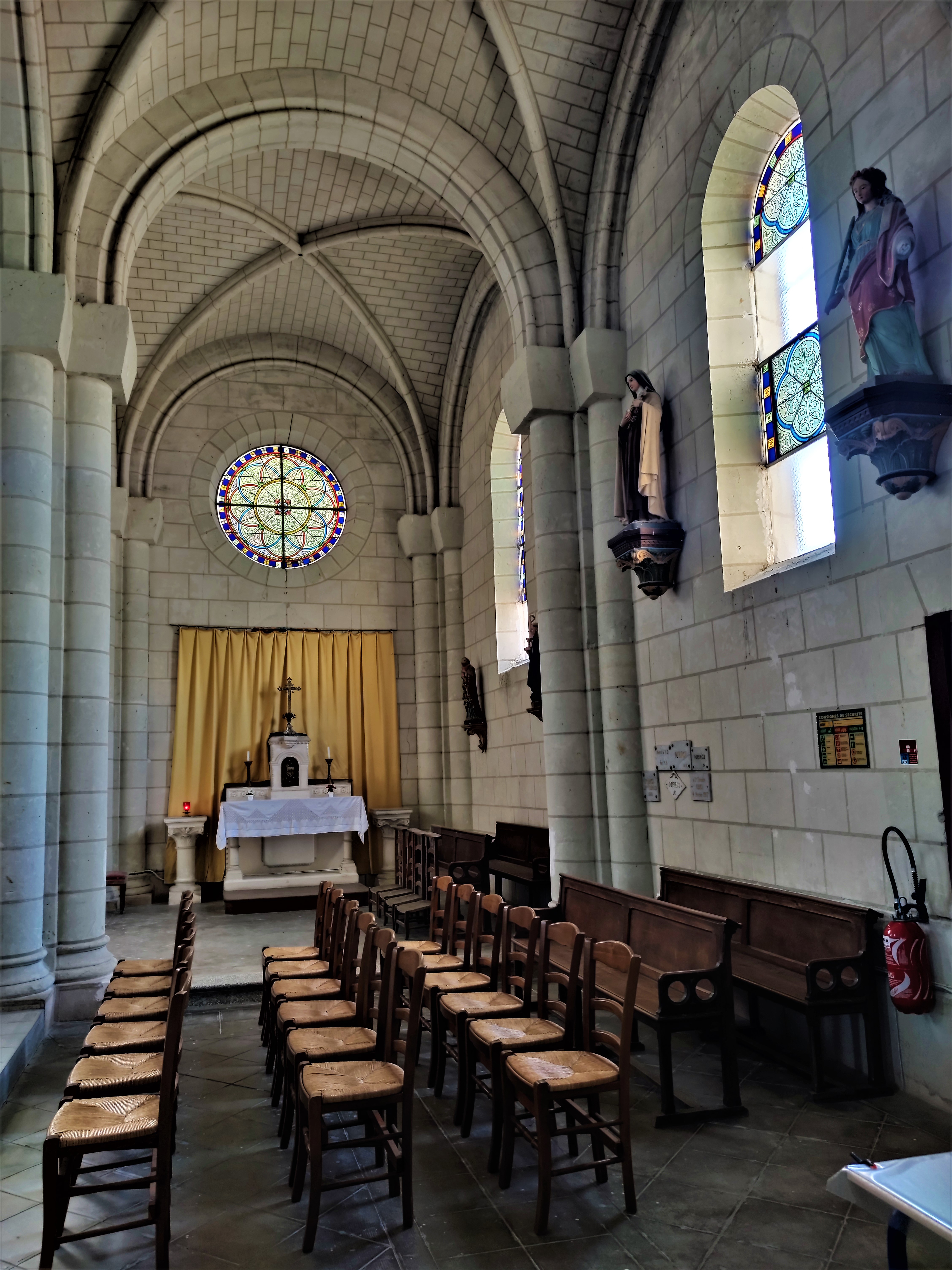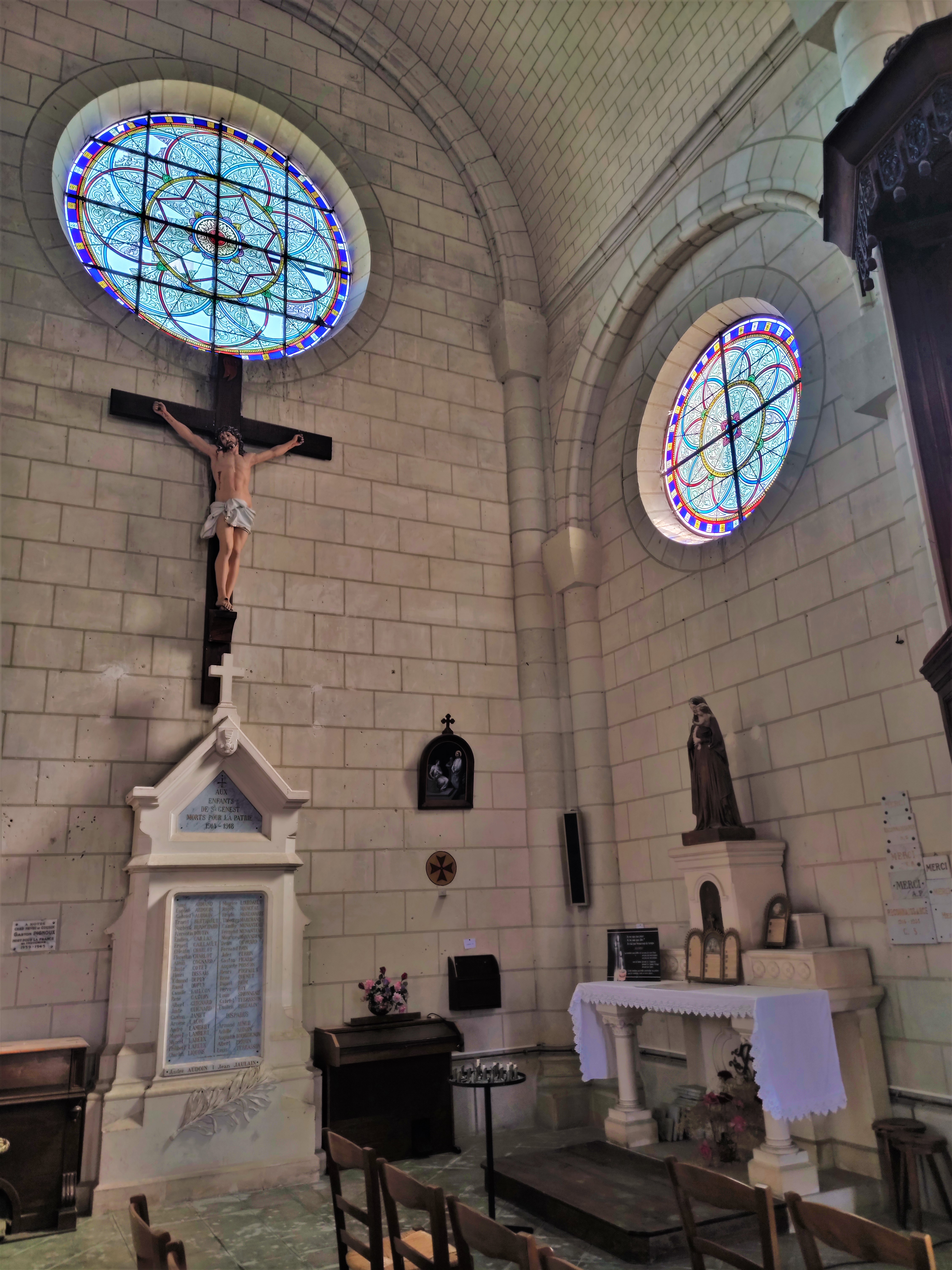 La mairie m'a redirigé vers un paroissien qui est venu m'ouvrir, je le remercie. La première église fut construite au 12ème siècle, on la reconstruisit au 14ème siècle. Ce dernier édifice semblait ne plus convenir au 19ème siècle, de part son état général et son allure archaïque. Les premières années du 20ème virent la naissance et la réalisation d'un projet de reconstruction. Les trois vaisseaux de la nef sont voûtés selon les travées, en successions de croisées d'ogives et de berceaux. Si quelques éléments anciens ont été réutilisés, ce n'est pas très visible. Les baies en plein cintre et les oculus sont dotés de vitraux non historiés, seul le chœur possède une ouverture ogivale avec vitraux historiés. Une église qui ne m'a pas séduit, elle reste accueillante.