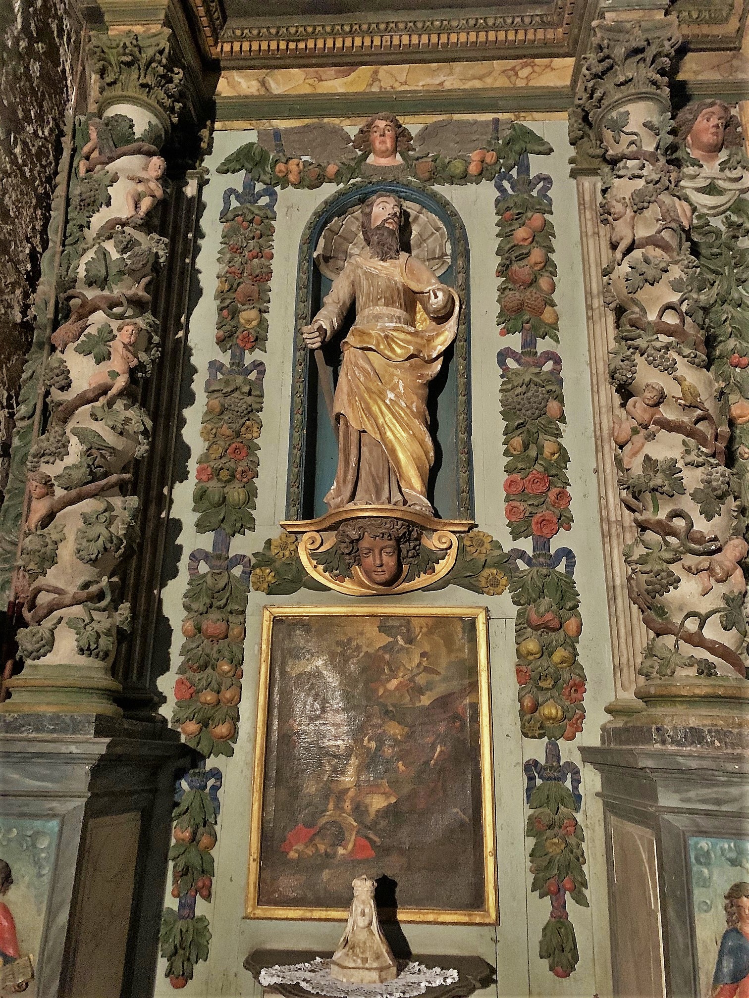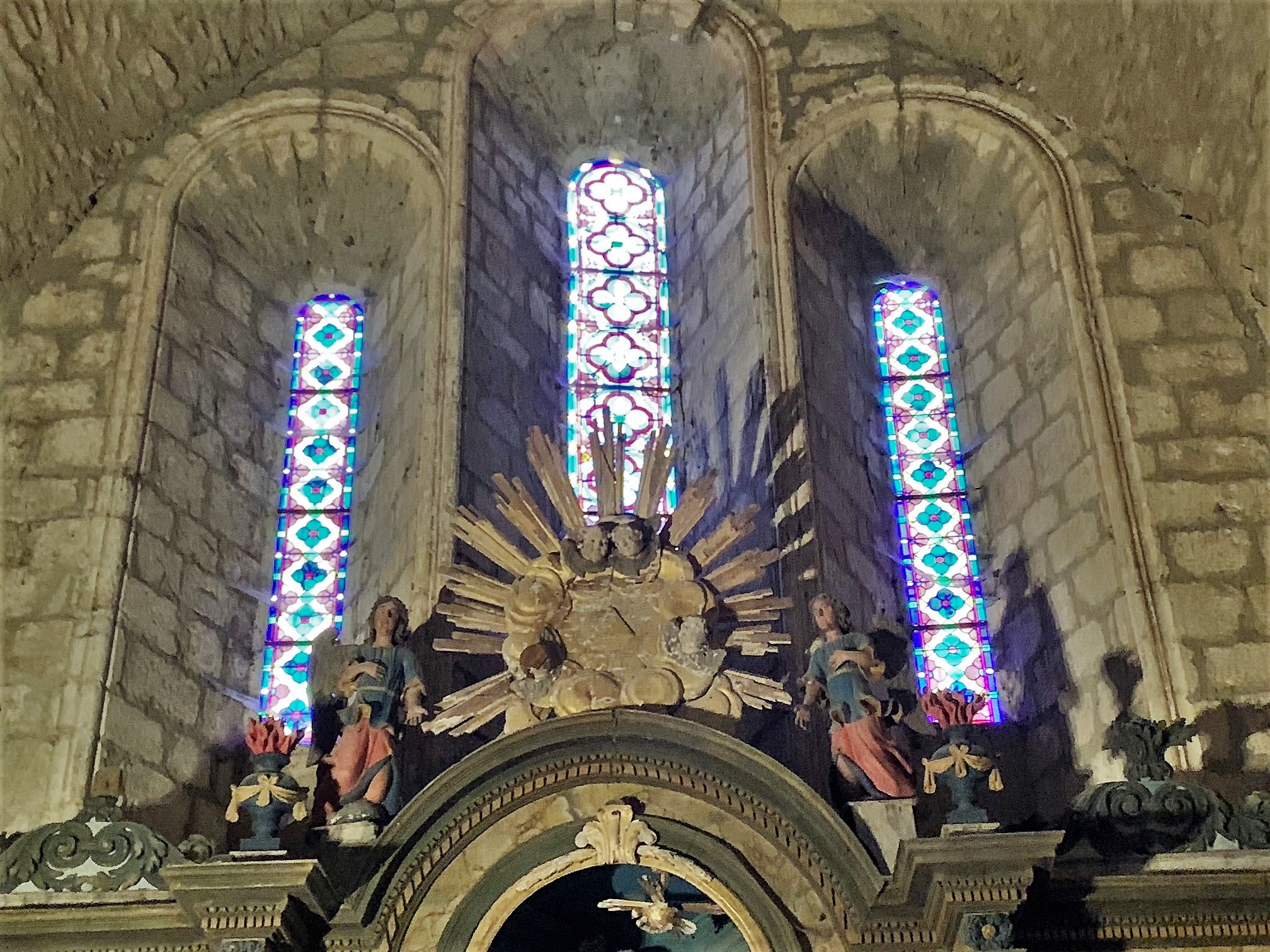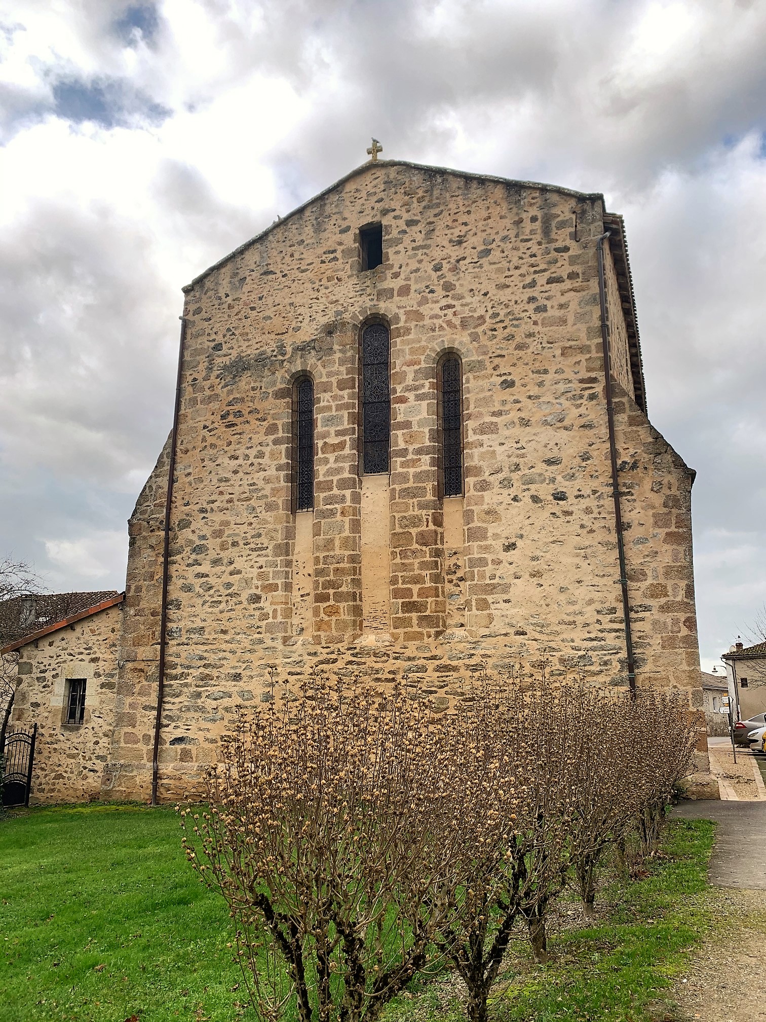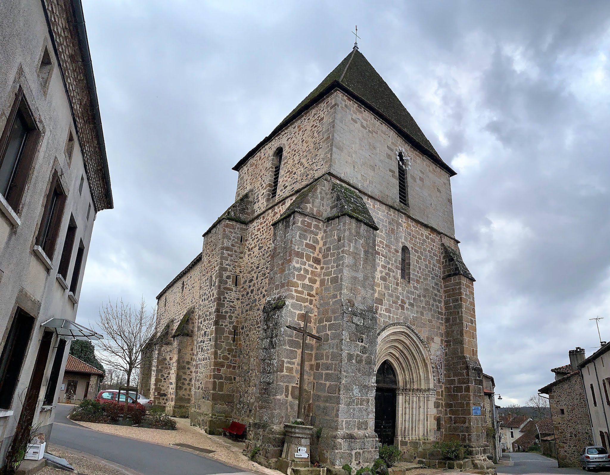 Une église massive, témoin de la survivance des églises romanes en Charente-Limousine. Fortifiée et particulièrement sombre, le mur nord est aveugle, deux ouvertures au sud et un triplet à moitié muré sur le chevet plat laissent passer la lumière (Les églises romanes n'étaient pas toutes sombres, certains architectes du 11ème et 12ème siècles ont planifié des édifices fort bien éclairés.) Les puissants contreforts, la forme carrée du clocher de la même largeur que l'édifice, les surélévations du 14ème ou 15ème pour fortifications de la nef au dessus de la voûte, tout cela amplifie l'impression de puissance de cette église. Un retable monumental qui occupe le mur oriental et quelques statues classées, méritent aussi d'être découverts. Une voûte clavée en berceau et la mise à nue des pierres renforcent l'impression d'austérité de cet édifice classé en 1997. Le clocher fut touché par la foudre en 1999, la tempête qui suivie obligea à une profonde restauration de cet élément. Ces travaux furent effectués par les Compagnons, qui déposèrent le clocher sur la place attenante, ouvrant un chantier spectaculaire. Pour la visiter, il faut prendre contact avec la mairie pour emprunter les clefs. L'accueil fut pour moi chaleureux et les personnes présentes, une dame et monsieur le Maire ont tout fait pour satisfaire ma demande.