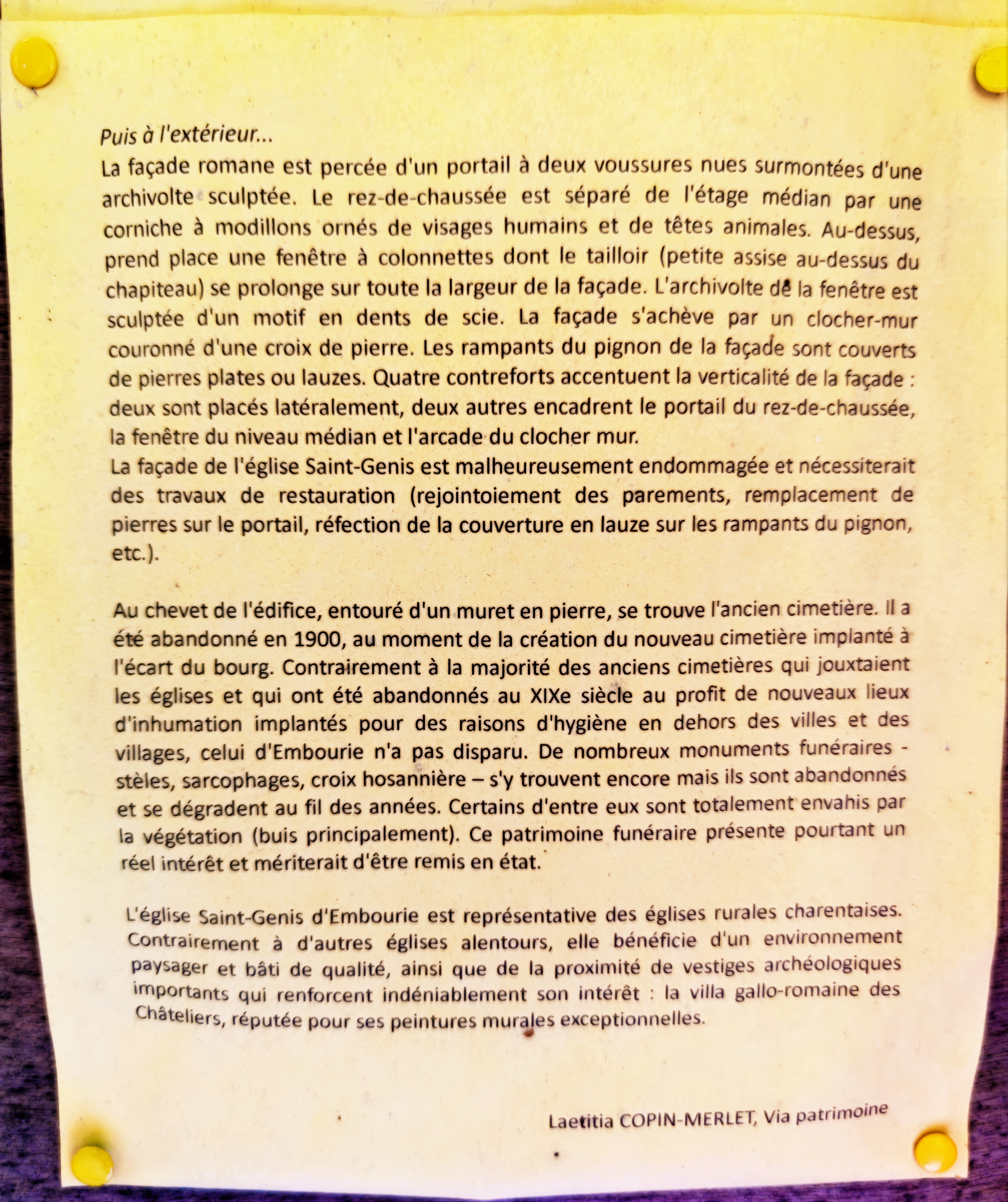 L’église Saint-Génis d'Embourie est située dans une région charmante riche d'un patrimoine bâti et archéologique. Dans les environs, les restes de villas gallo-romaines indiquent une activité humaine importante dès le début du 1er millénaire. La découvertes de sarcophages datés du 5ème ou 6ème siècles laisse penser que l'emplacement de cette église était déjà un lieu de culte à l'époque mérovingienne. L'église actuelle fut construite au 11ème et 12ème, modifiée et agrandie au 16ème, restaurée au 18ème, 19ème, 20ème et 21ème siècles, la façade est protégé par les M.H. depuis 1987. Les arcatures du mur Sud sont les vestiges du collatéral ajouté à l'époque gothique et disparu depuis. Dans le chœur, au sommet du mur Nord, la base courbée de la voûte en pierres de l'église primitive est visible. La signalétique nous indique la construction d'une voûte en briques au 19ème, elle a disparu. C'est aujourd'hui une charpente apparente qui recouvre tout l'espace intérieur. Des vitraux originaux sont à découvrir ainsi que l'ancien cimetière.