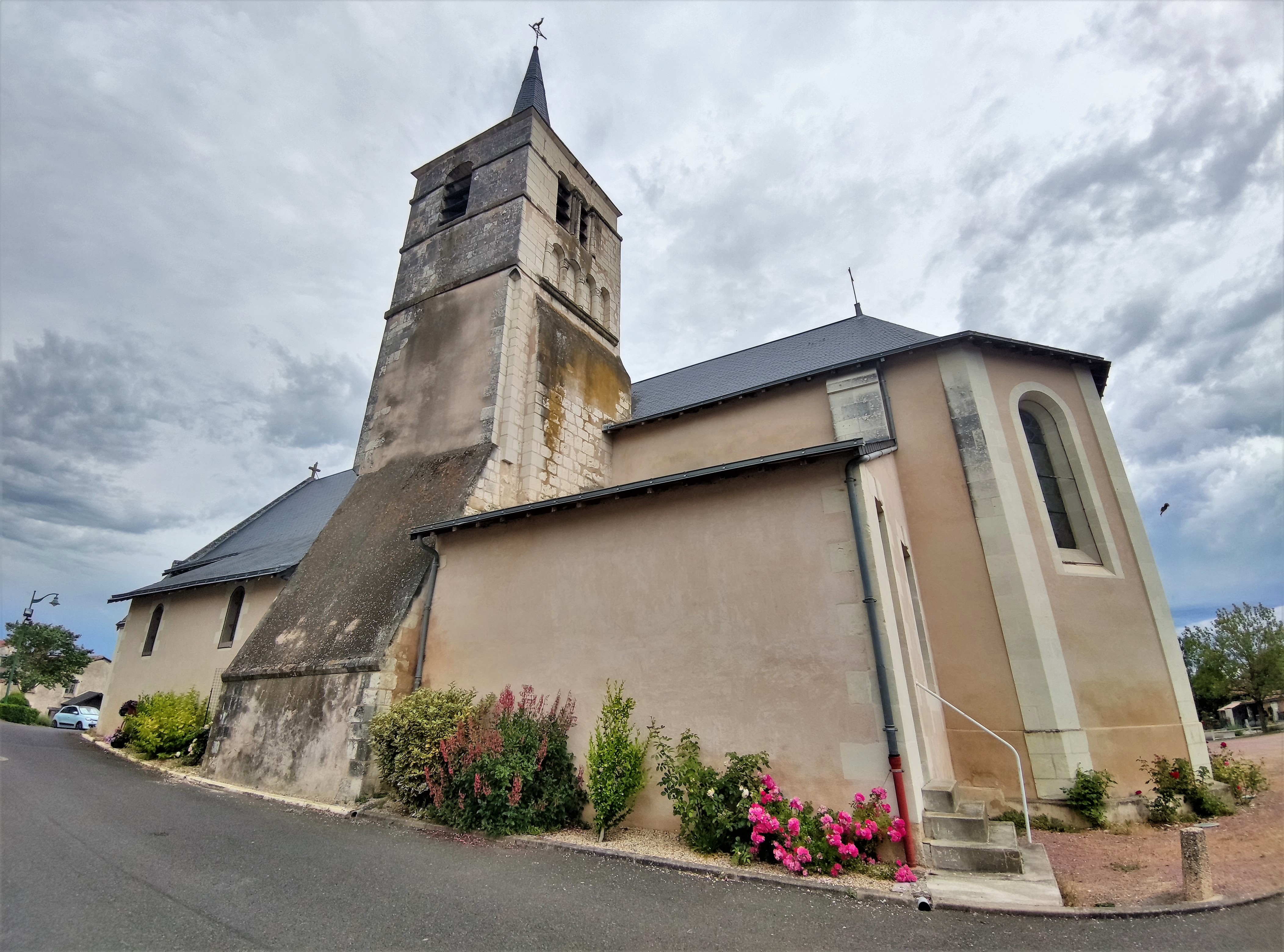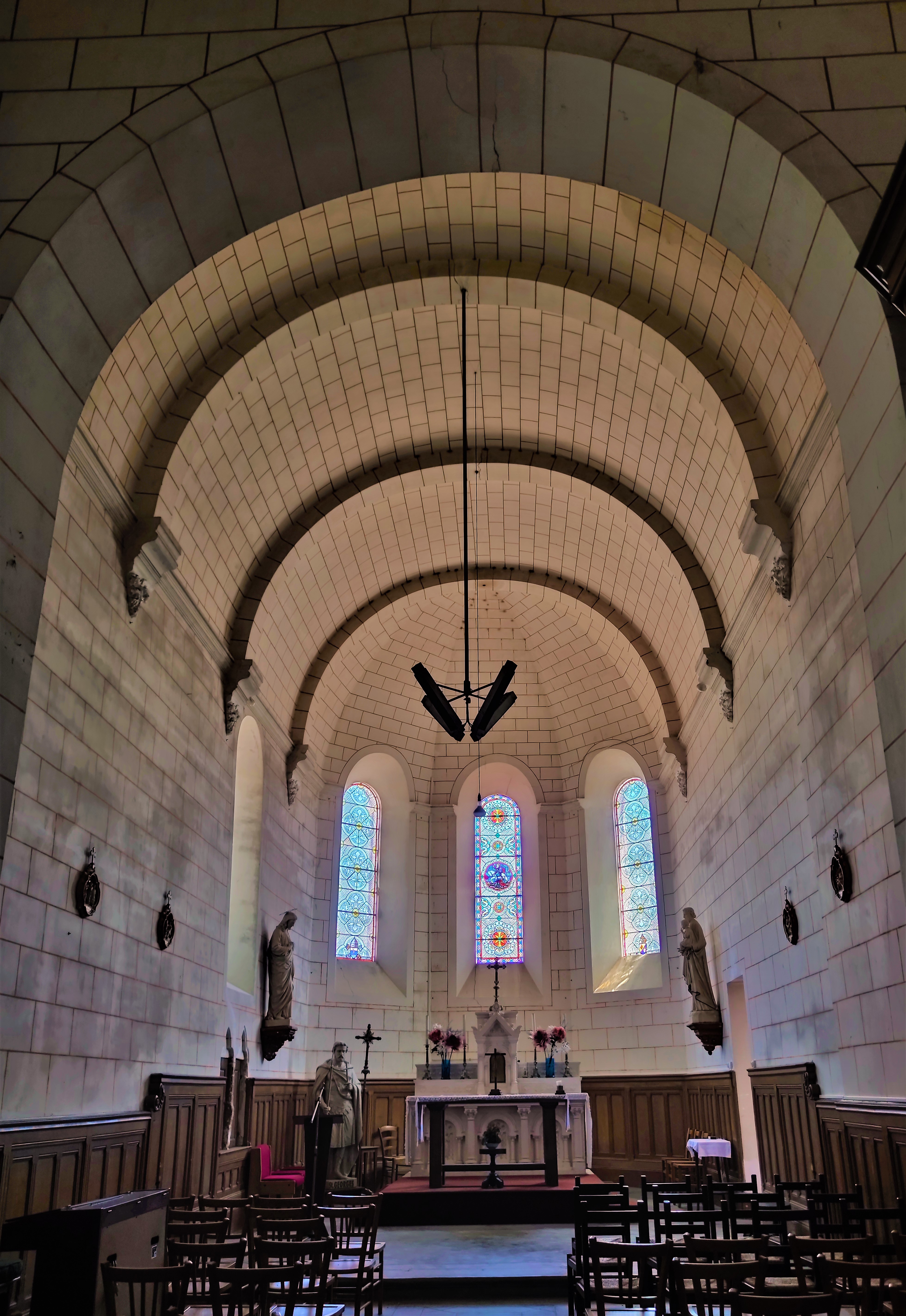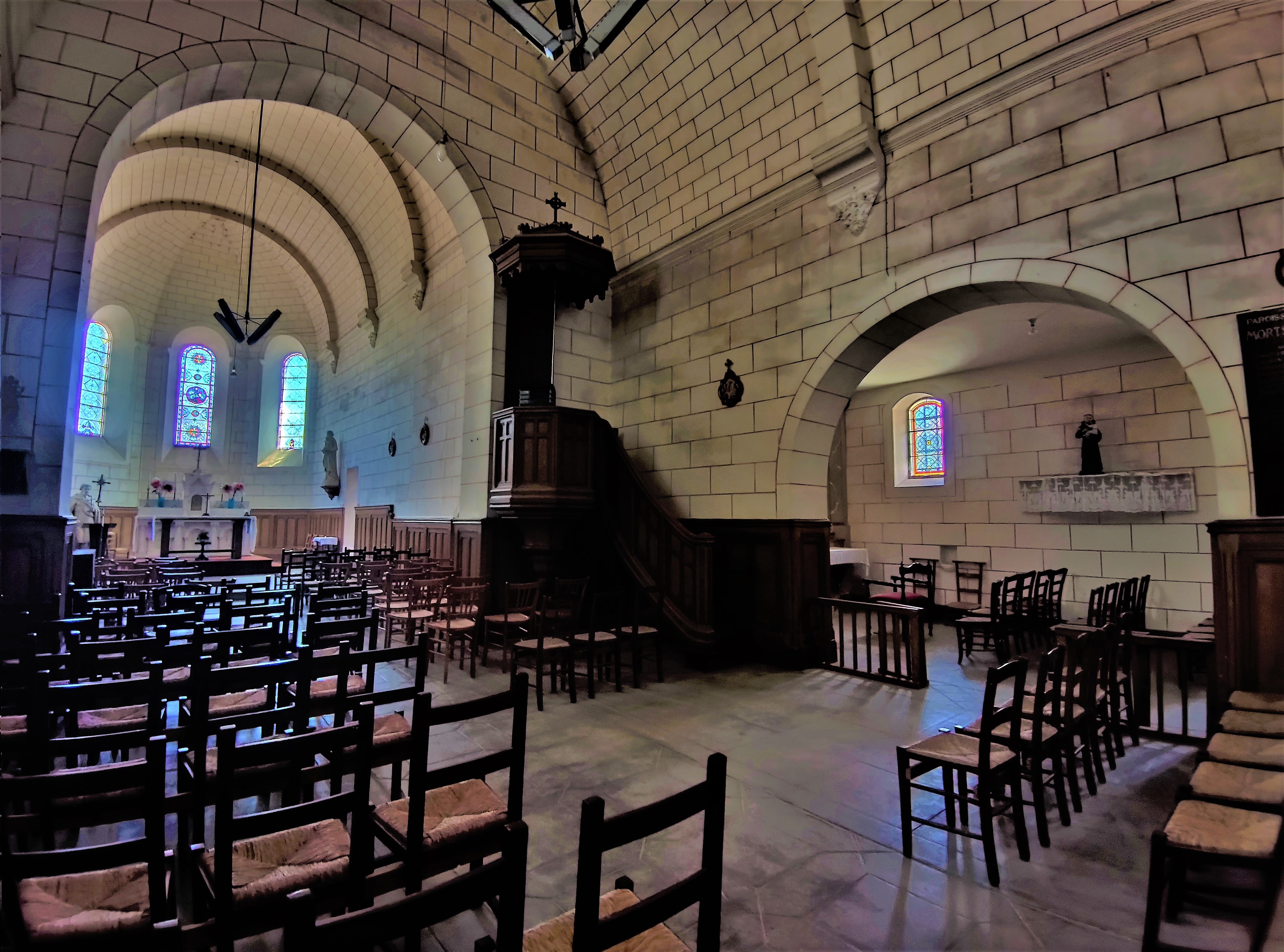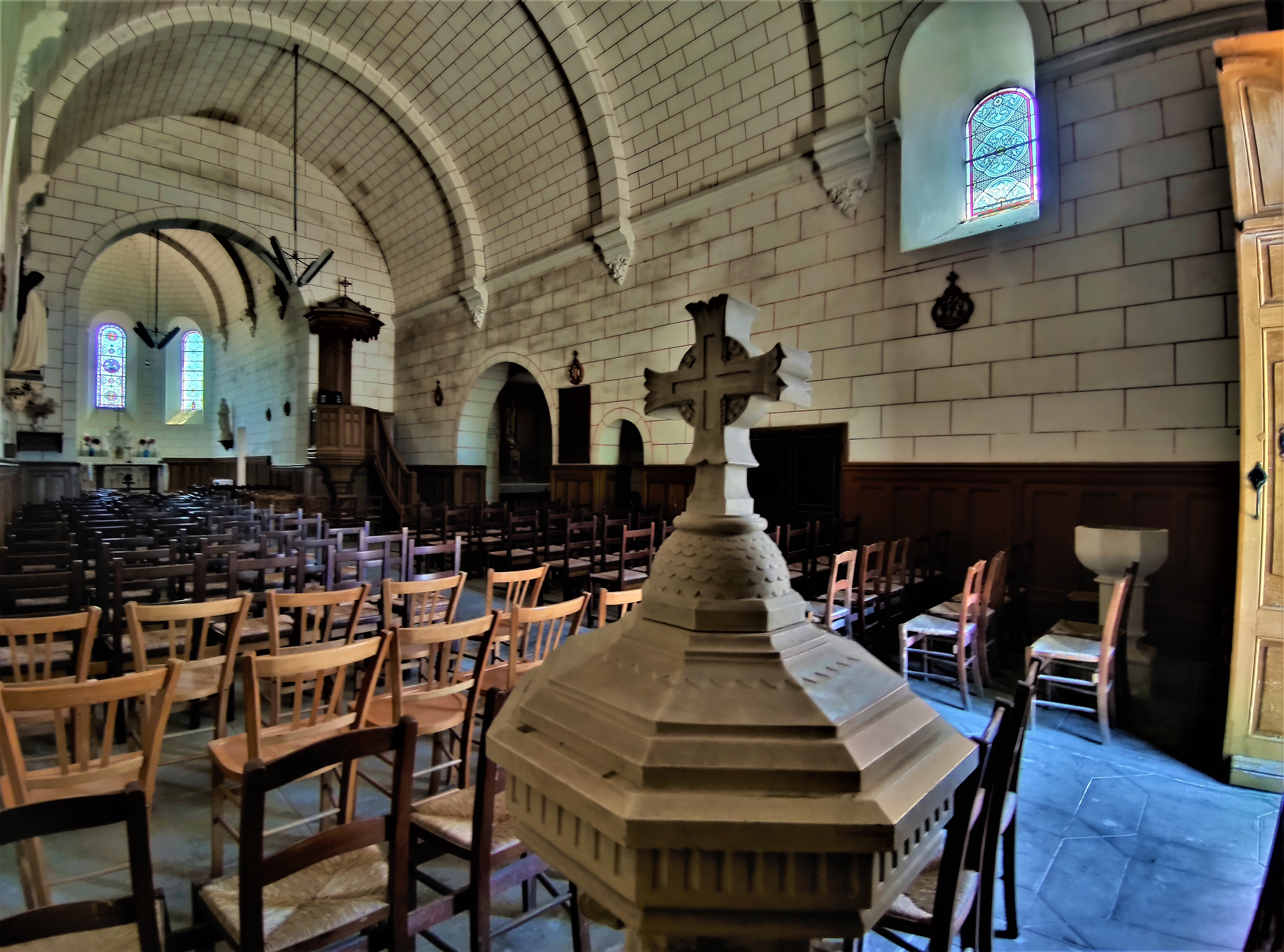 C'est une église accueillante, je remercie la paroissienne disponible qui est venue m'ouvrir. Il existait une église romane très simple, sans voûte, nef unique, clocher excentré et chevet plat. Deux contreforts romans au Nord et au Sud abritent les accès aux combles (Nord) et au clocher (Sud). Au 19ème, on a ouvert une chapelle au Sud à l'Ouest du clocher. L'église en voie de dégradation a bénéficié, dès 1886, d'un projet de restauration ou reconstruction, financé par des legs. Mais diverses difficultés liées aux rapports compliqués avec la municipalité l'empêchaient de se concrétiser. Au début du 20ème, Célestin Pineau, fut nommé curé de la paroisse. Il porta avec beaucoup d'énergie et de conviction un projet de restauration qui recouvre l'adhésion des paroissiens. Quant à la collectivité, la loi de 1905 n'était plus un obstacle. En 1909, l'église restaurée fut consacrée, c'est un bel édifice voûté et remeublé, des vitraux équipent les baies. Quelques réemplois, la préservation du clocher et des murs de la nef, les voûtes en plein cintre, lui donnent quelque allure romane. C'est une église accueillante, je remercie la paroissienne disponible qui est venue m'ouvrir. Les dimensions et l'allure générale en font une église qui rassemble et qui se prête à toute démarche d'intériorité.