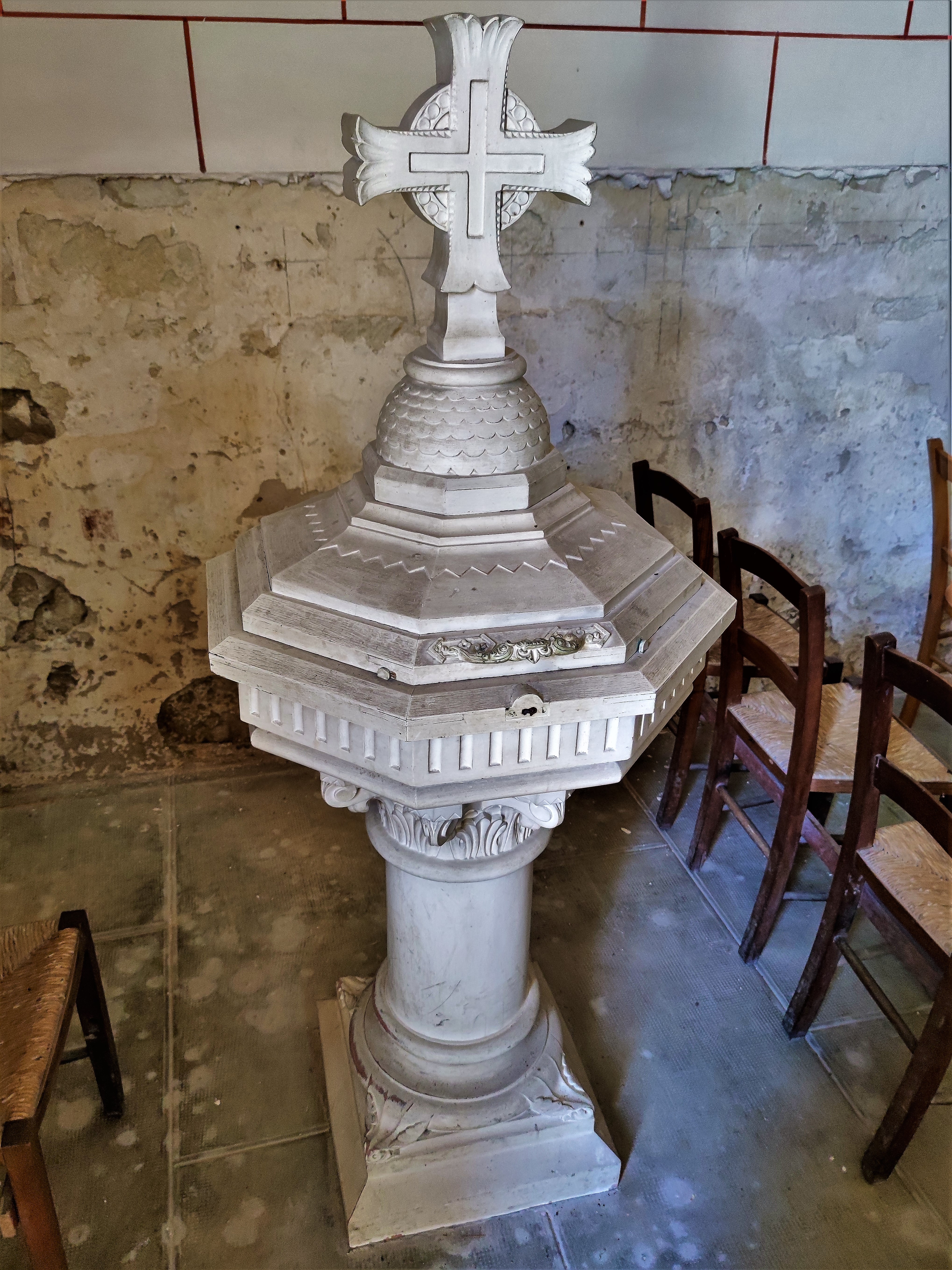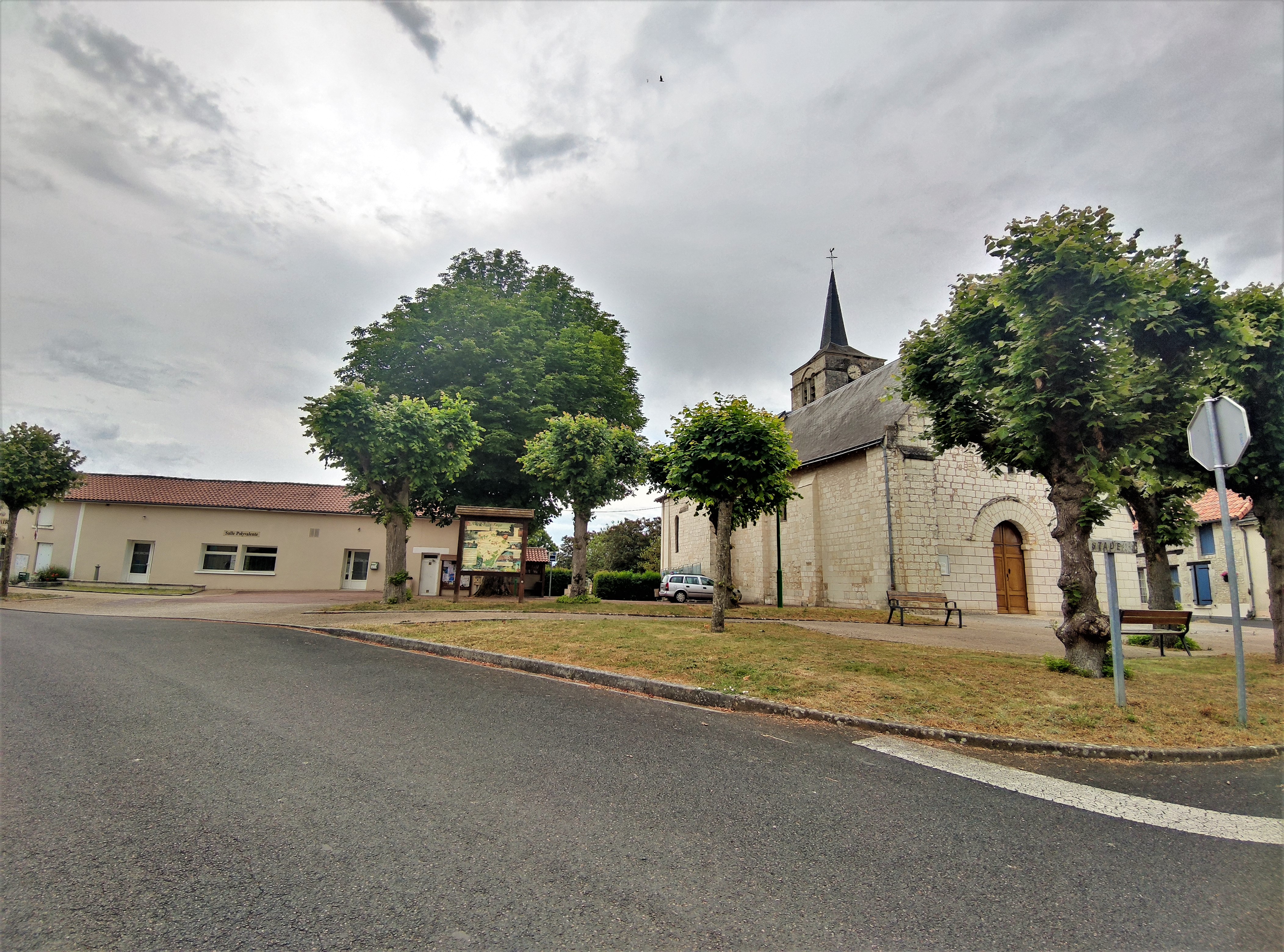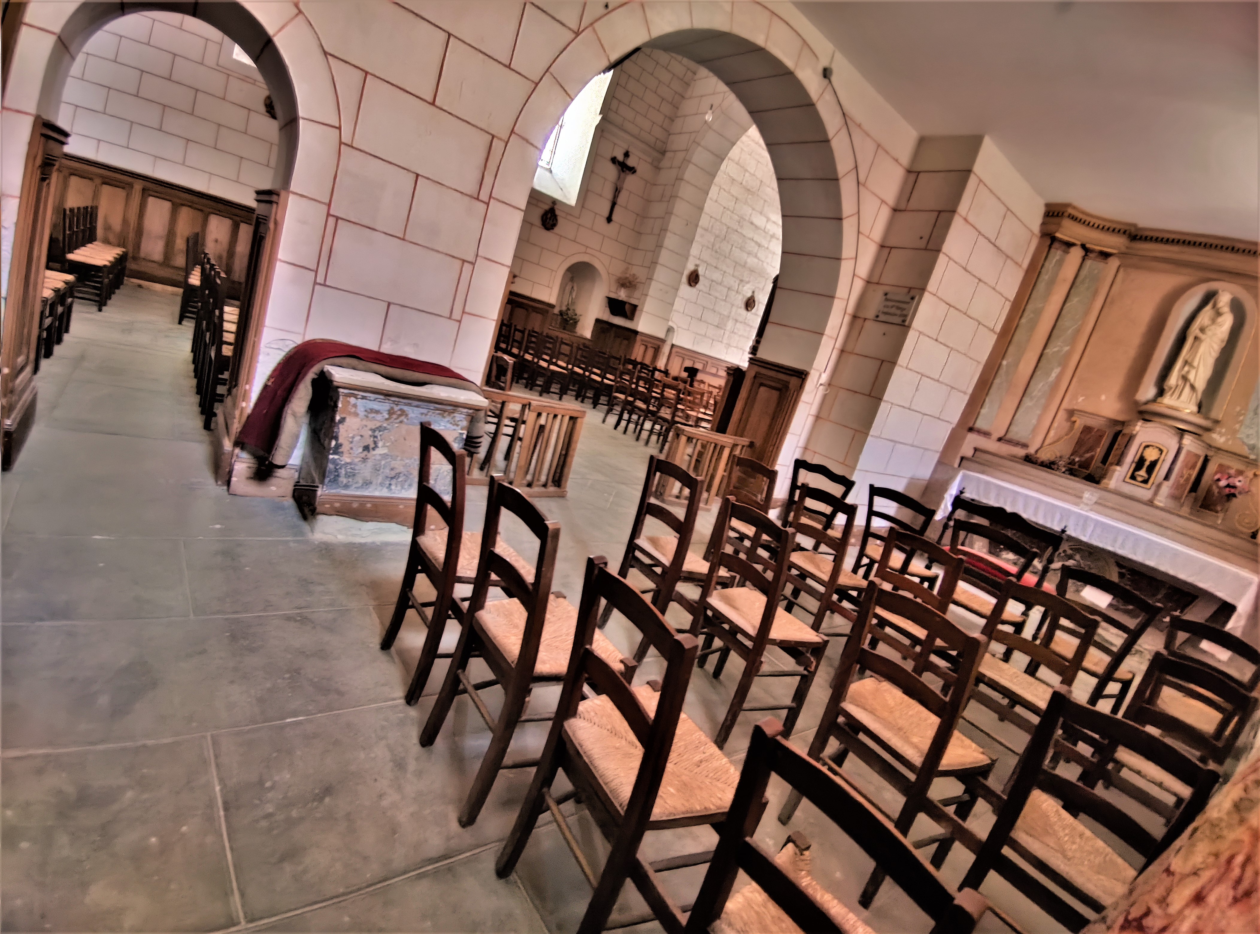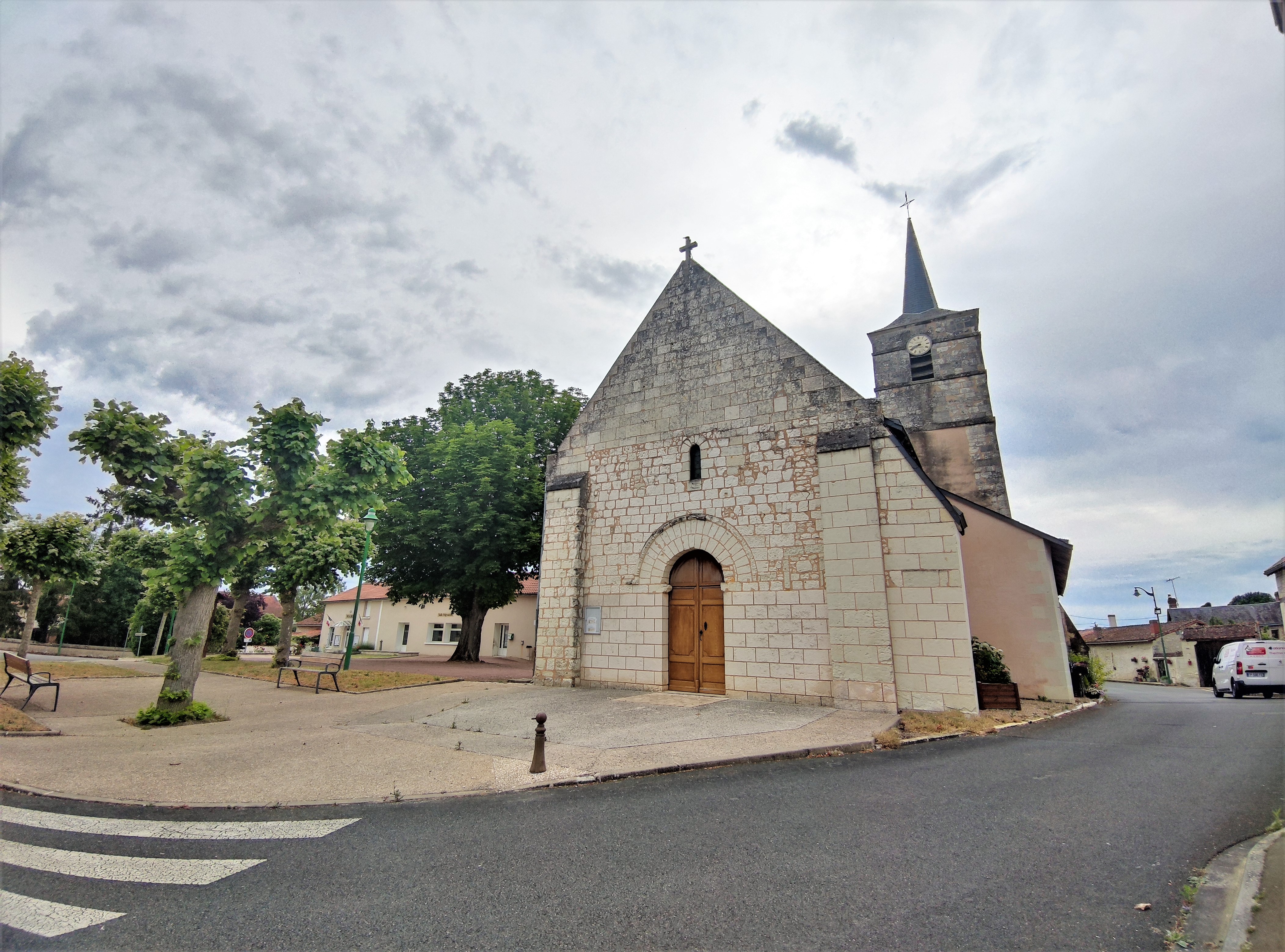 C'est une église accueillante, je remercie la paroissienne disponible qui est venue m'ouvrir. Il existait une église romane très simple, sans voûte, nef unique, clocher excentré et chevet plat. Deux contreforts romans au Nord et au Sud abritent les accès aux combles (Nord) et au clocher (Sud). Au 19ème, on a ouvert une chapelle au Sud à l'Ouest du clocher. L'église en voie de dégradation a bénéficié, dès 1886, d'un projet de restauration ou reconstruction, financé par des legs. Mais diverses difficultés liées aux rapports compliqués avec la municipalité l'empêchaient de se concrétiser. Au début du 20ème, Célestin Pineau, fut nommé curé de la paroisse. Il porta avec beaucoup d'énergie et de conviction un projet de restauration qui recouvre l'adhésion des paroissiens. Quant à la collectivité, la loi de 1905 n'était plus un obstacle. En 1909, l'église restaurée fut consacrée, c'est un bel édifice voûté et remeublé, des vitraux équipent les baies. Quelques réemplois, la préservation du clocher et des murs de la nef, les voûtes en plein cintre, lui donnent quelque allure romane. C'est une église accueillante, je remercie la paroissienne disponible qui est venue m'ouvrir. Les dimensions et l'allure générale en font une église qui rassemble et qui se prête à toute démarche d'intériorité.
