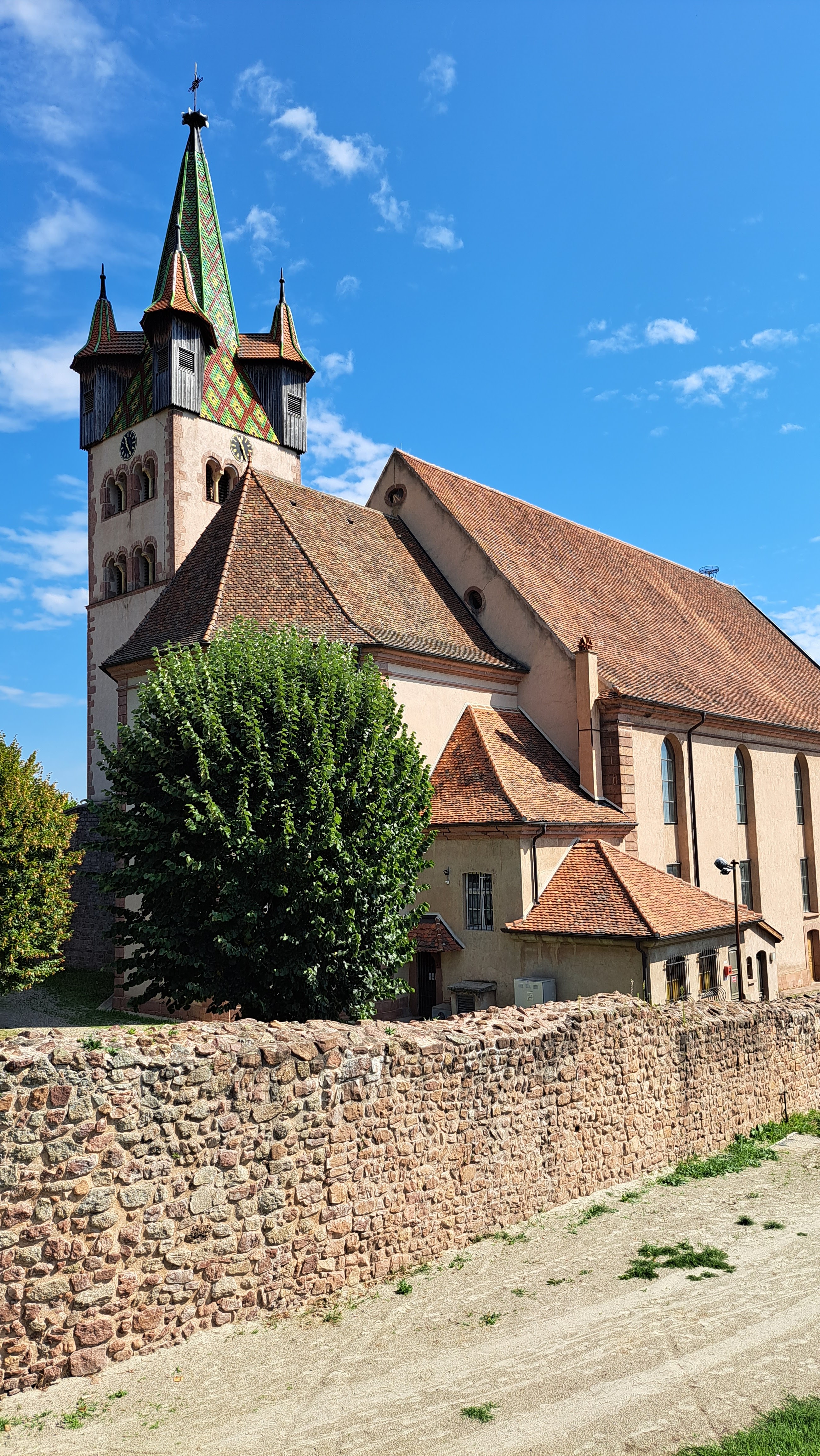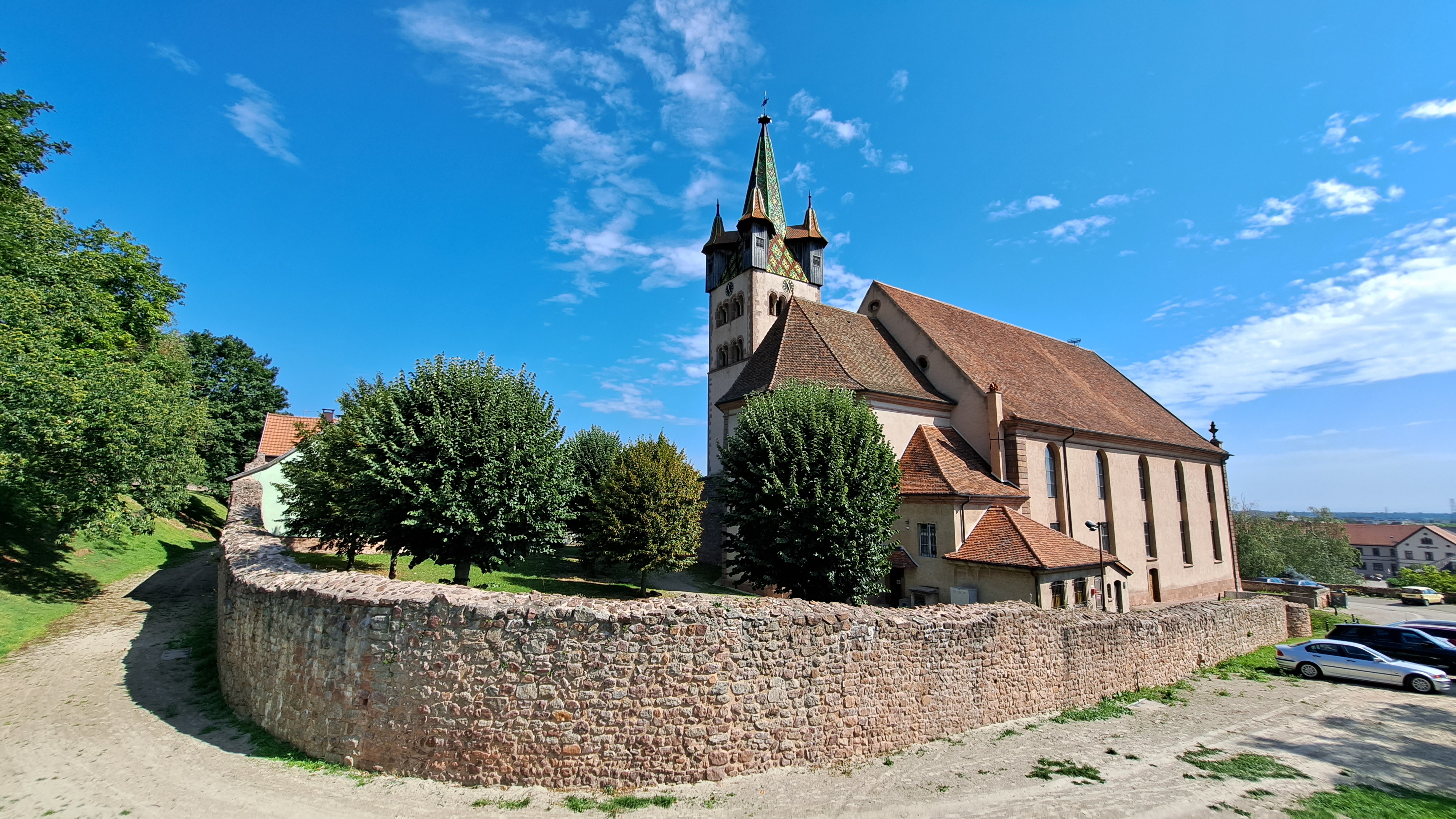 Situé sur la route des vins d'Alsace, ancienne église avec son clocher particulier et tour des sorcières à Chatenois, le tout dans des fortifications