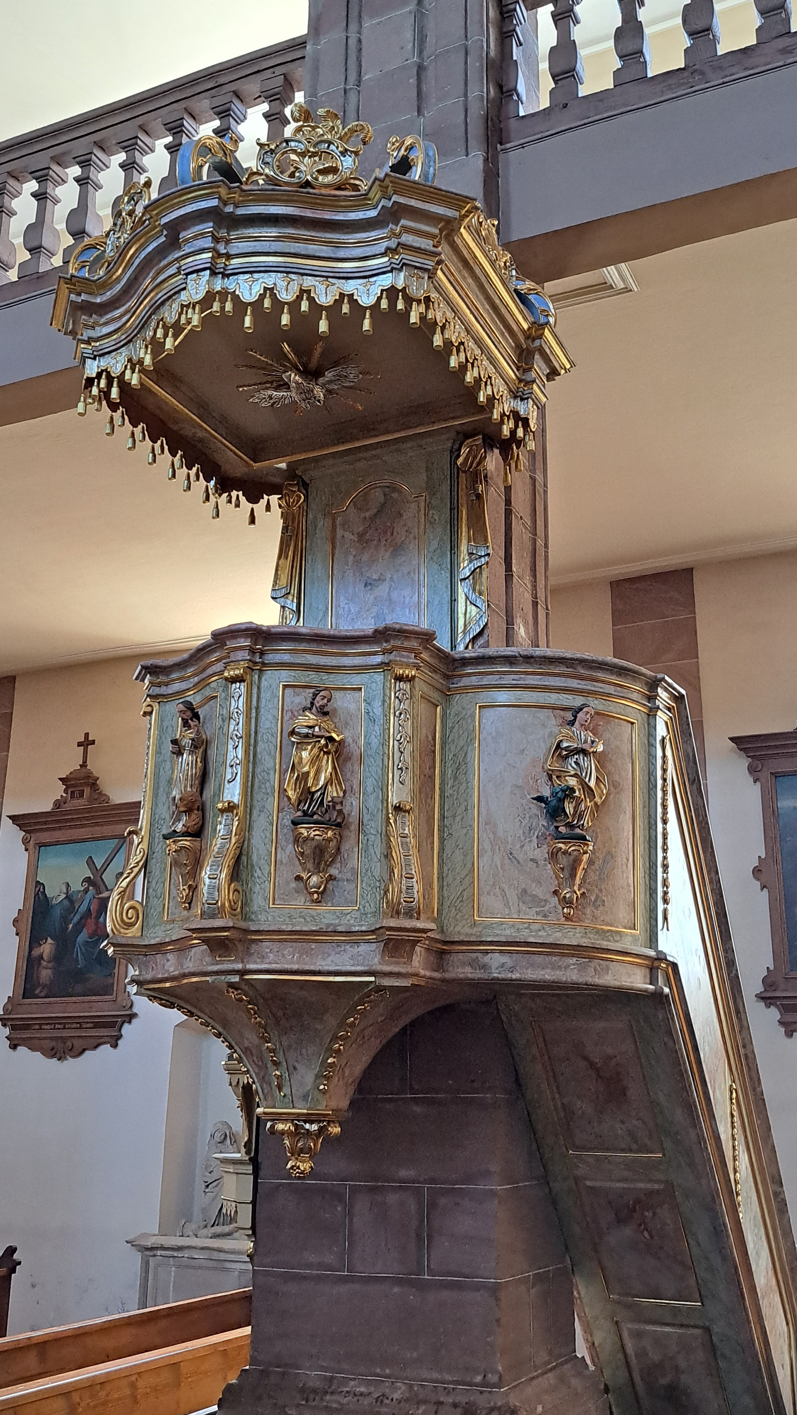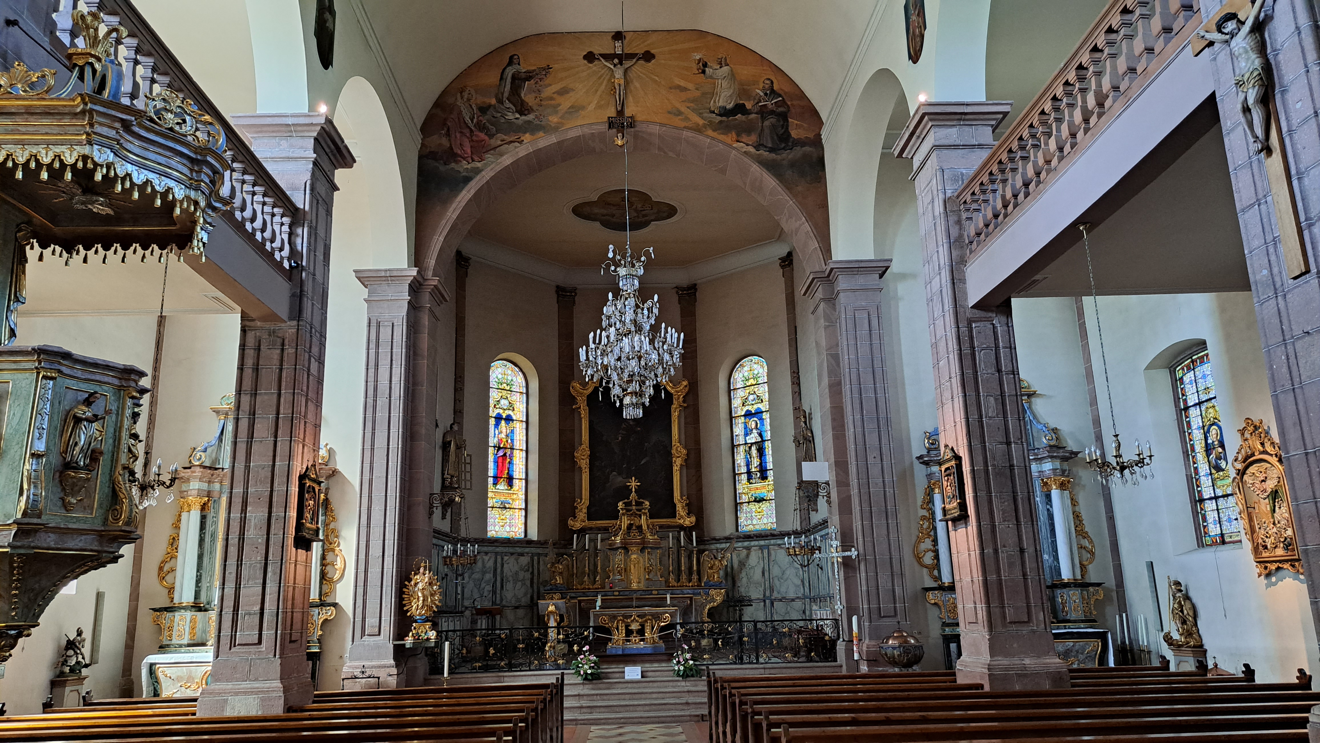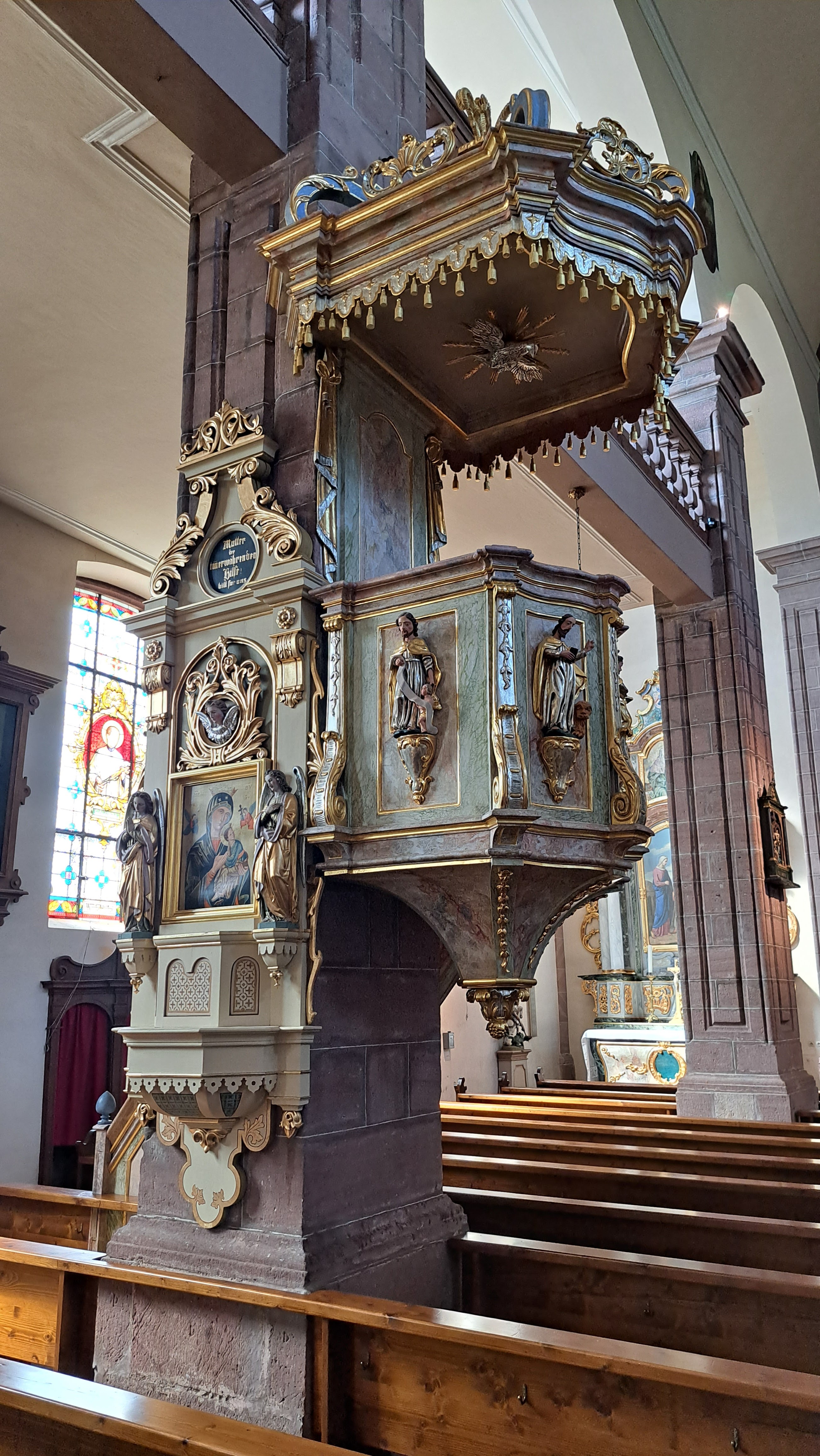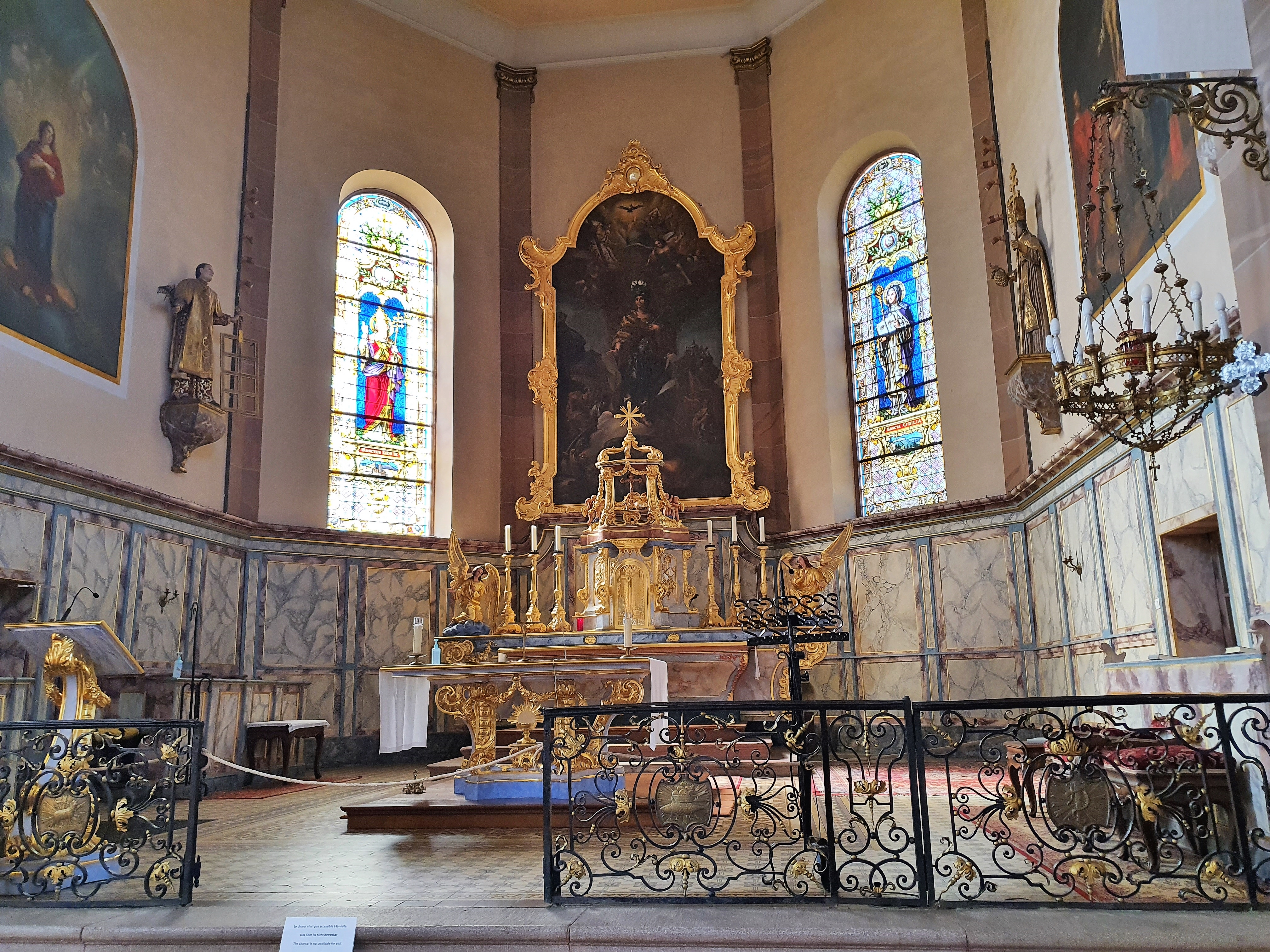 Très belle église du style baroque. Cuve baptismale (1762) richement décorée de feuilles d'acanthe en grès doré. Sur le socle, un châtaigner, blason de la localité. Orgues (1765) de Jean - André Silbermann. Grand lustre de style Pompadour. Nativité et Adoration des Mages (XVI) Chaire baroque avec les quatre évangélistes et leur symbole. A visiter, a découvrir