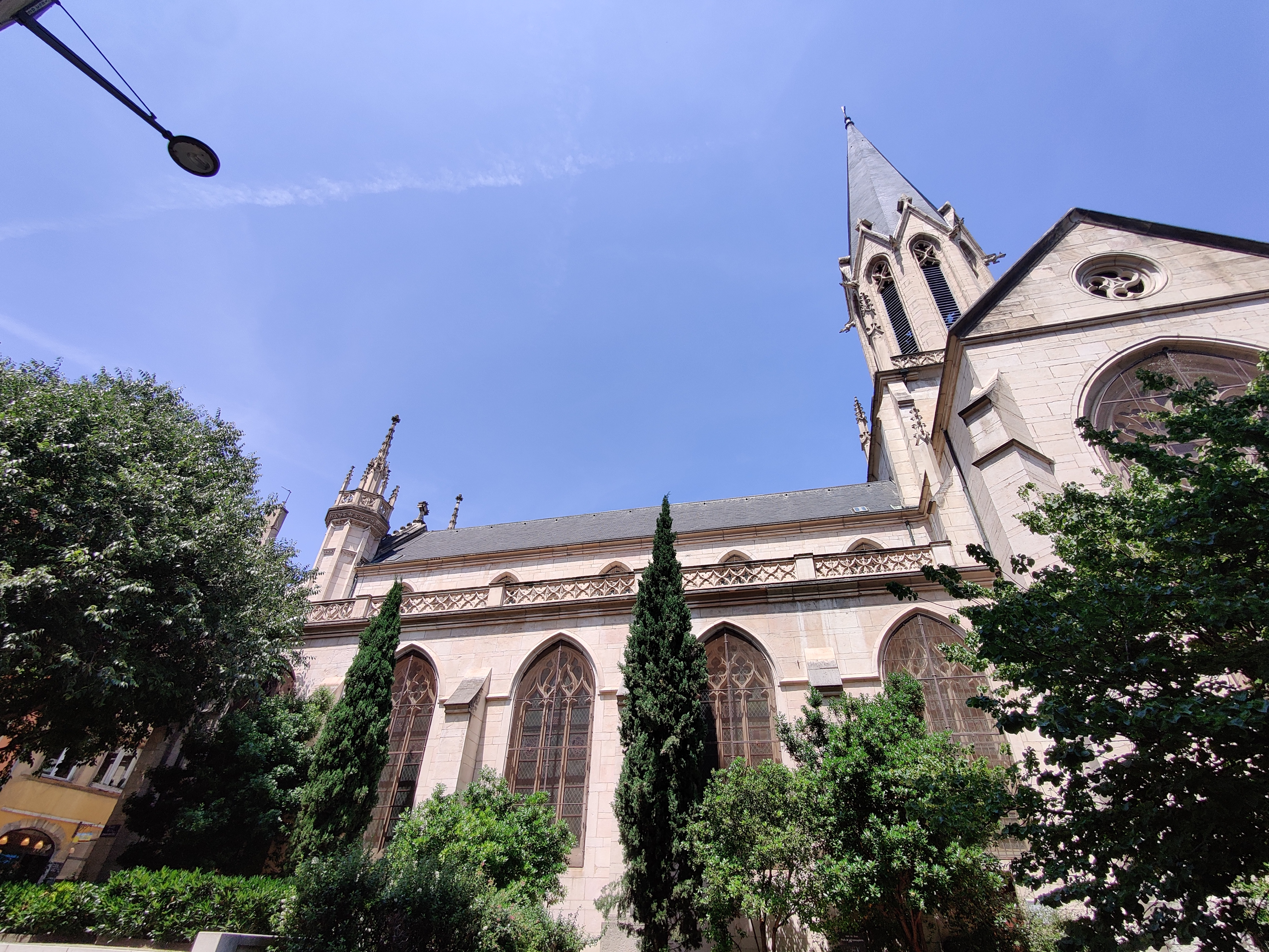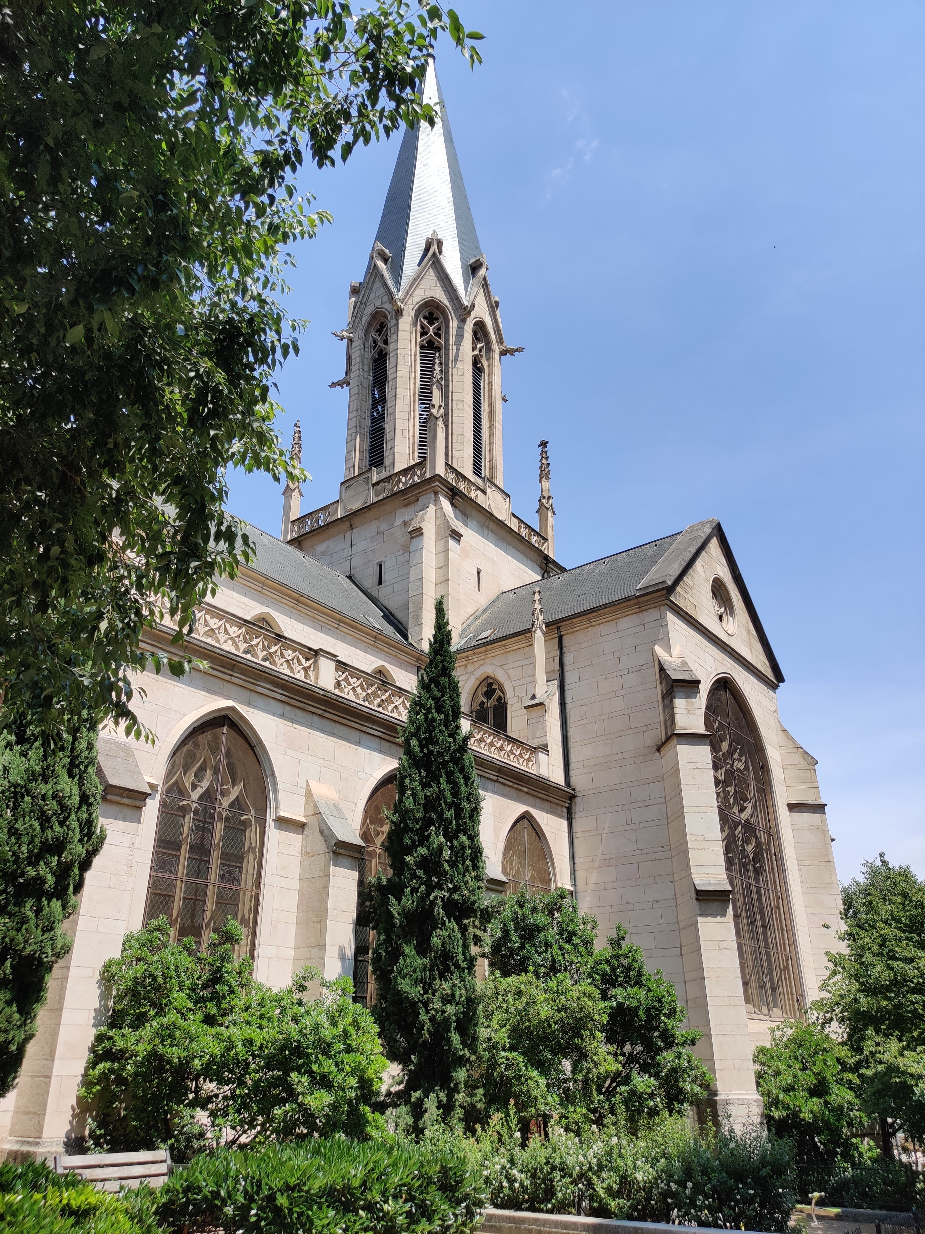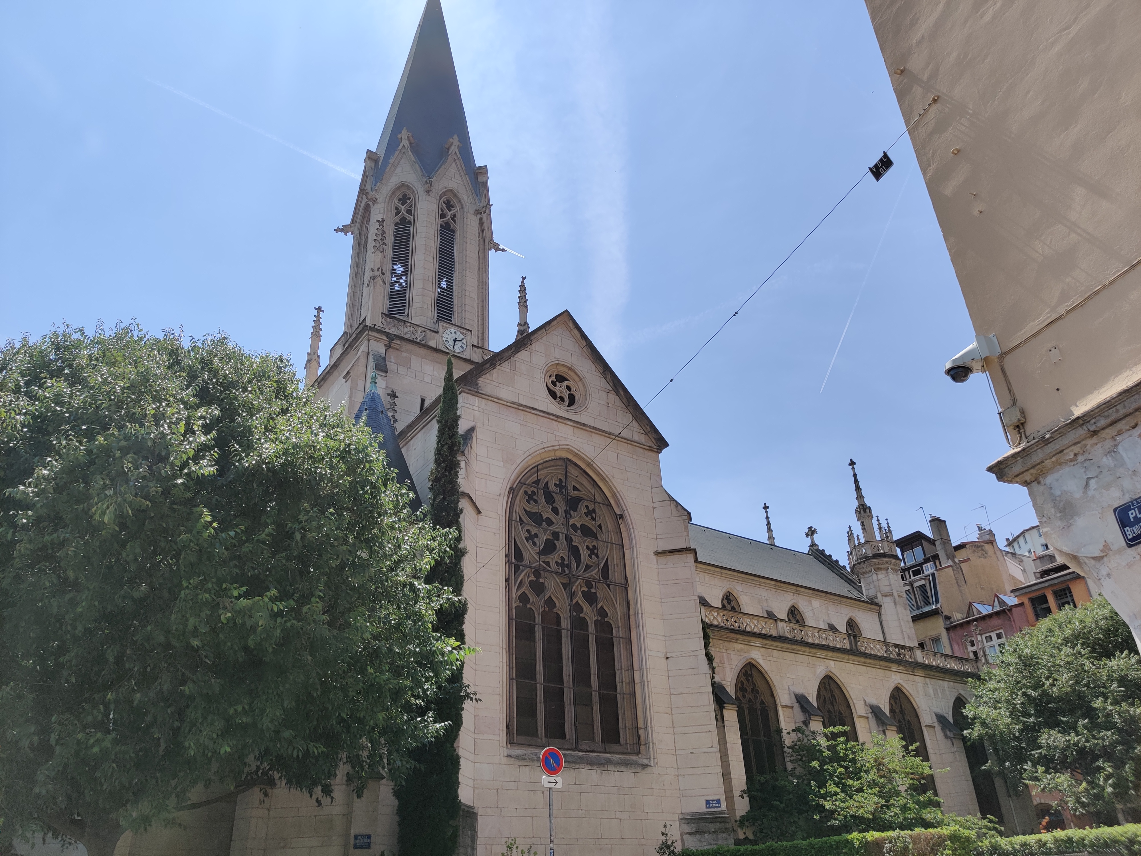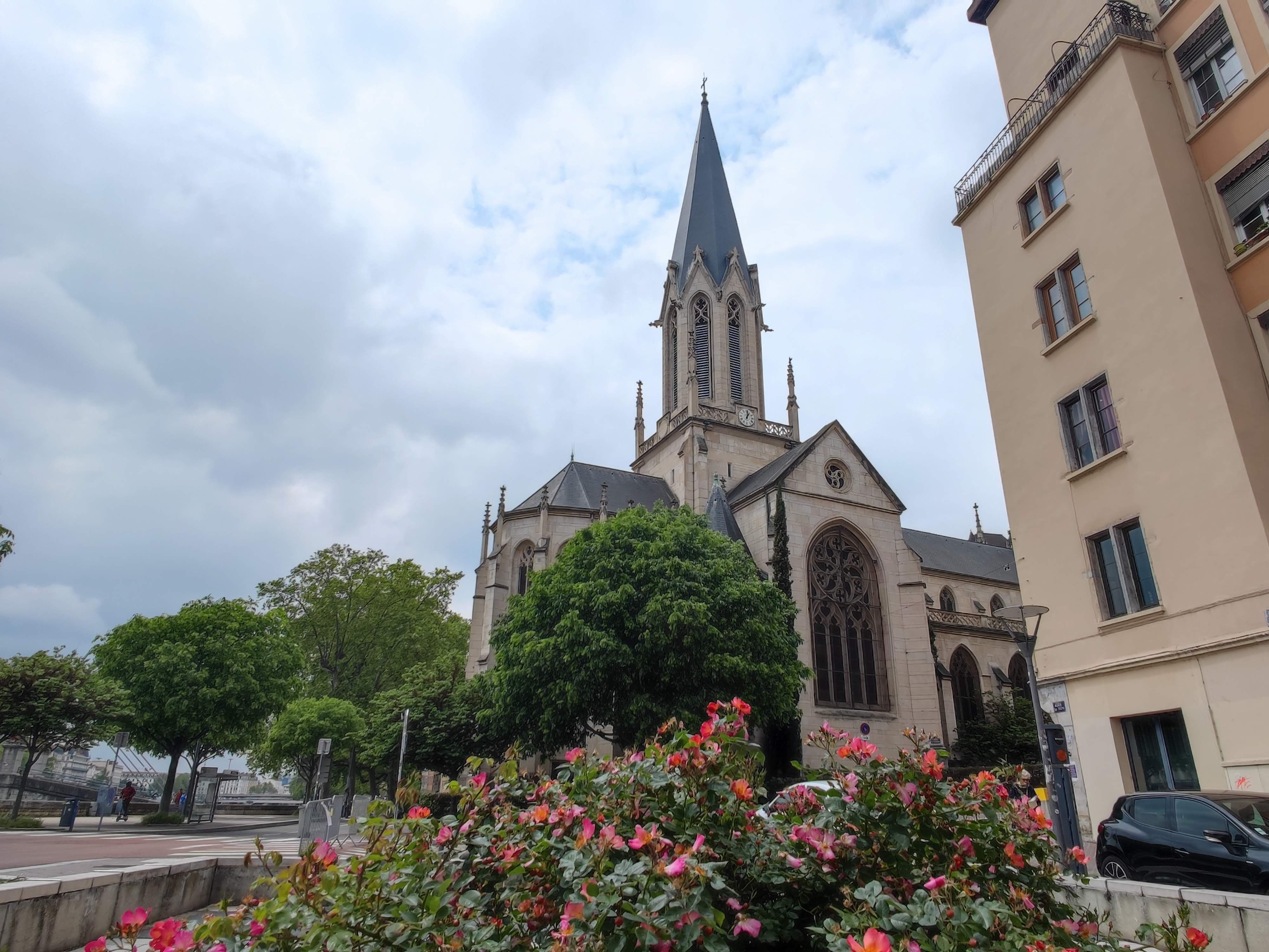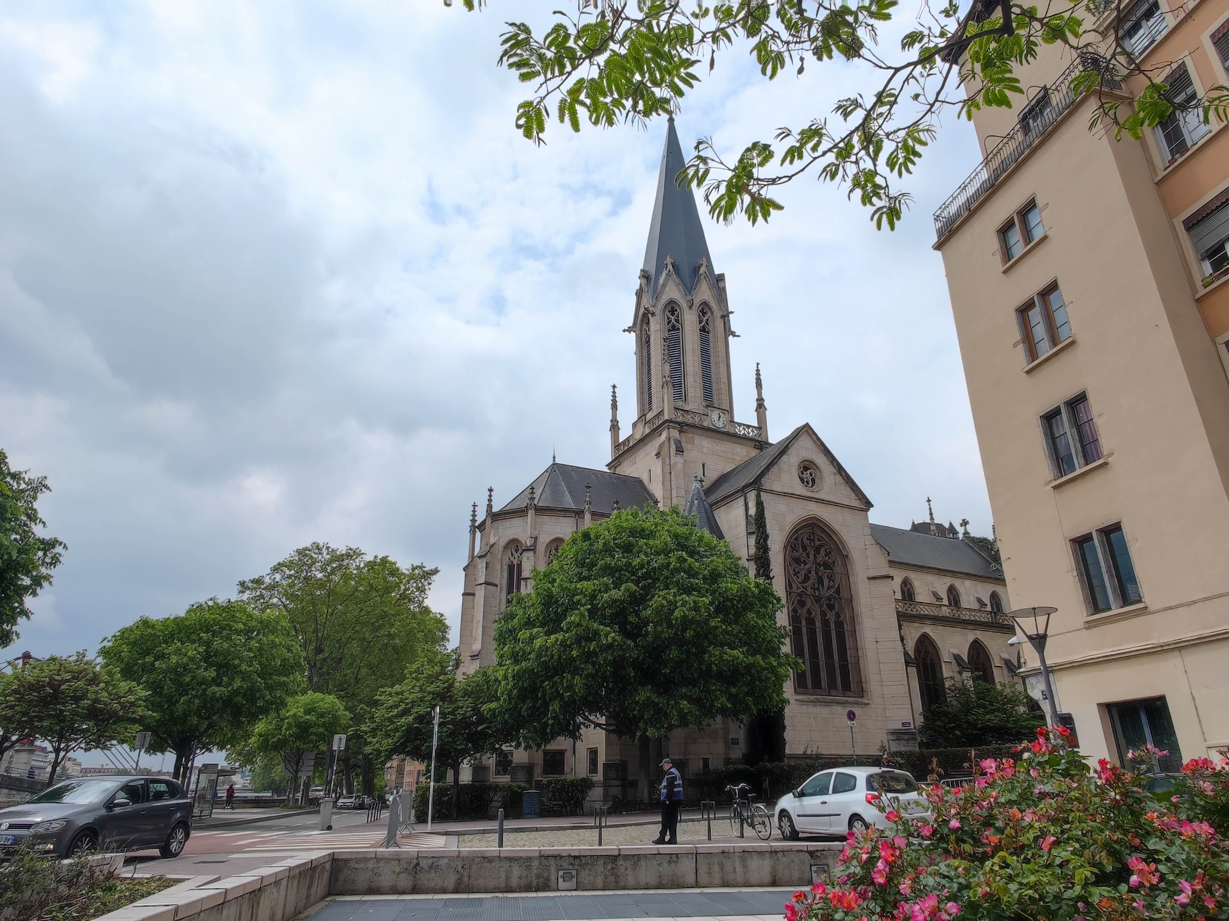 Une belle église entourée d'un petit écrin de verdure sur les quais de Saône. Messe traditionaliste. Luminons à partir de 1,5€.