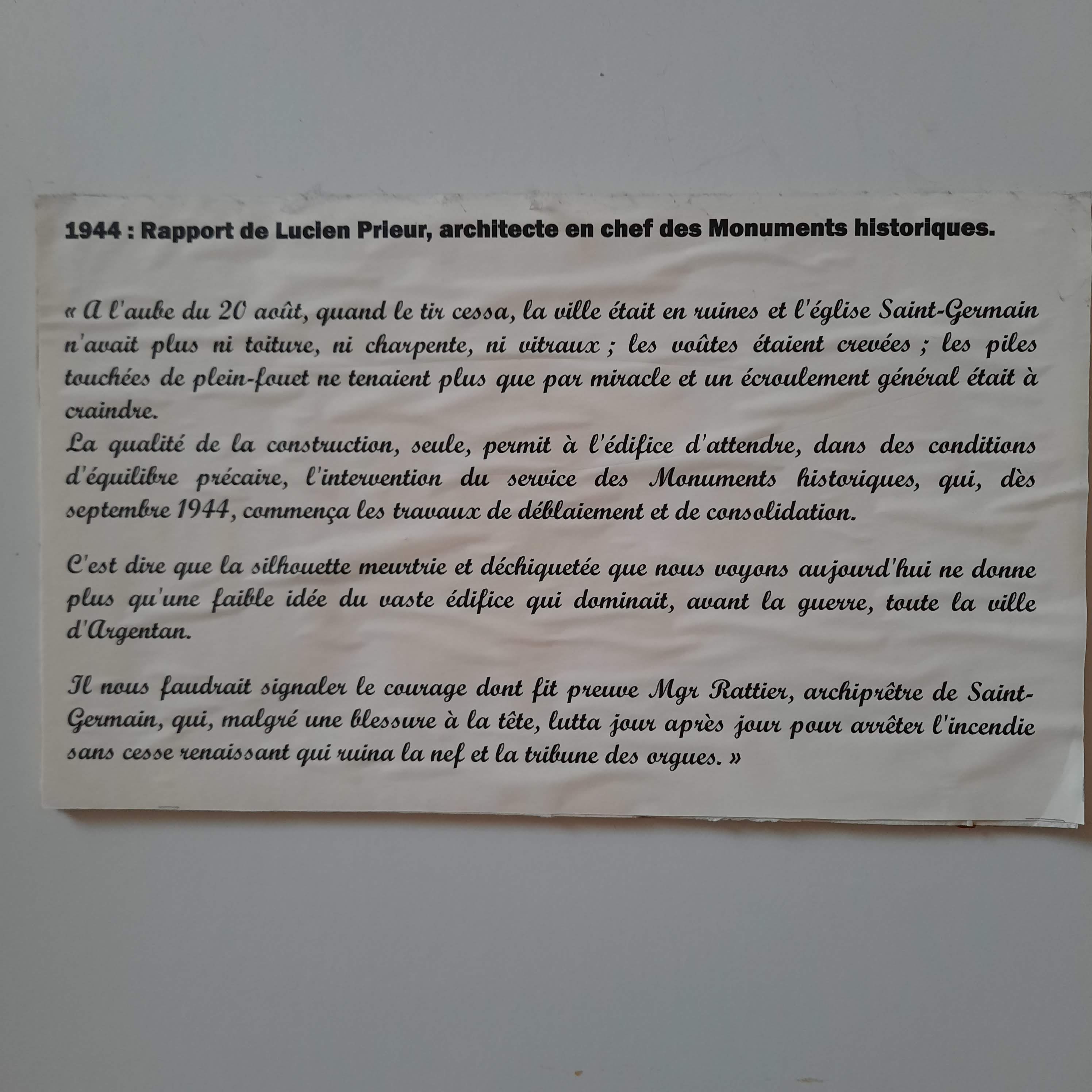 Magnifique monument ayant été bien endommagé pendant le Seconde Guerre Mondiale. De magnifiques (de par leur rareté) photos d’Argentan après les bombardements Alliés sur la ville sont visibles dans la Cathédrale. Il y aussi une belle histoire d’un soldat allemand que les visiteurs peuvent lire (au même endroit que les photos).