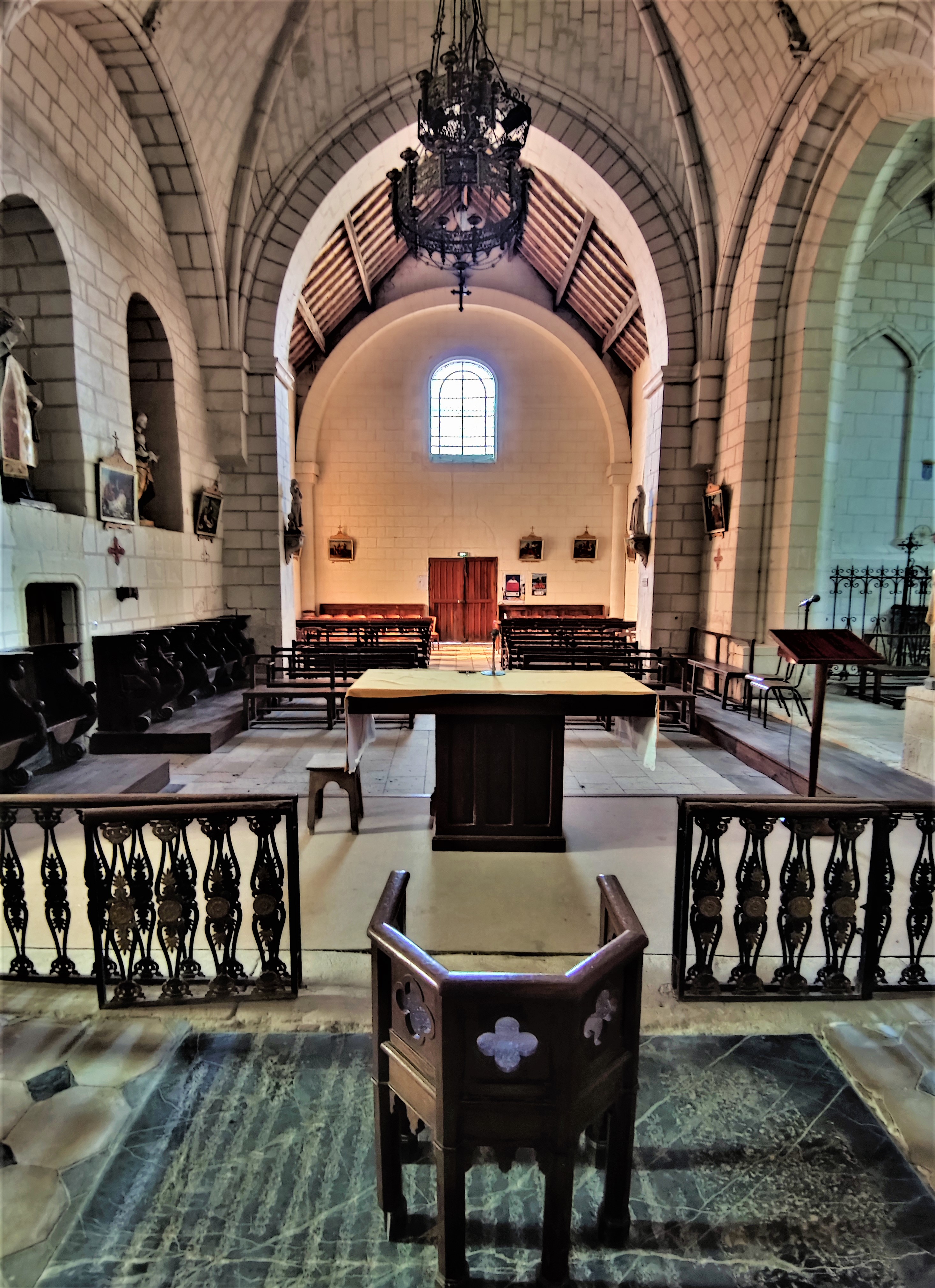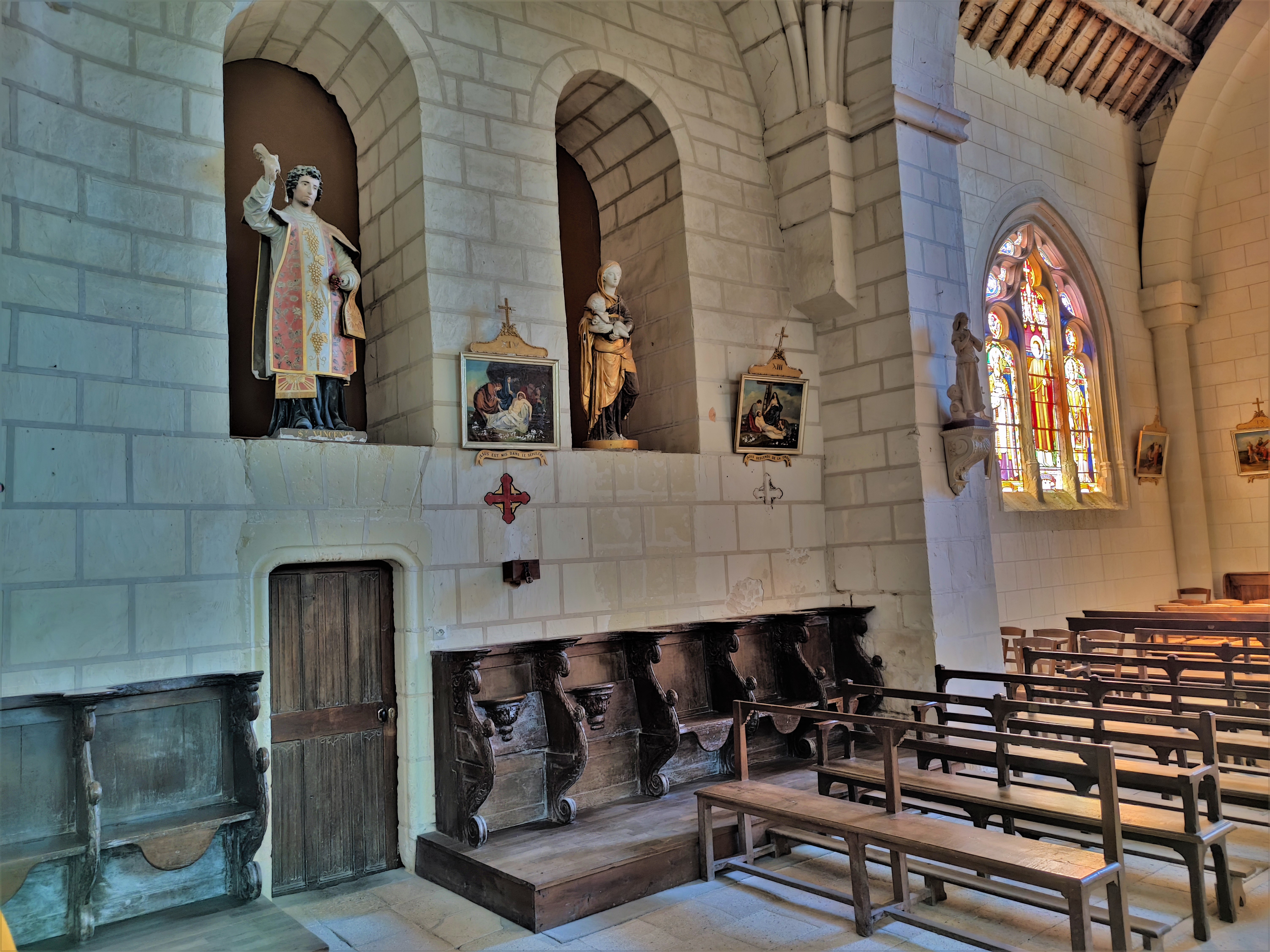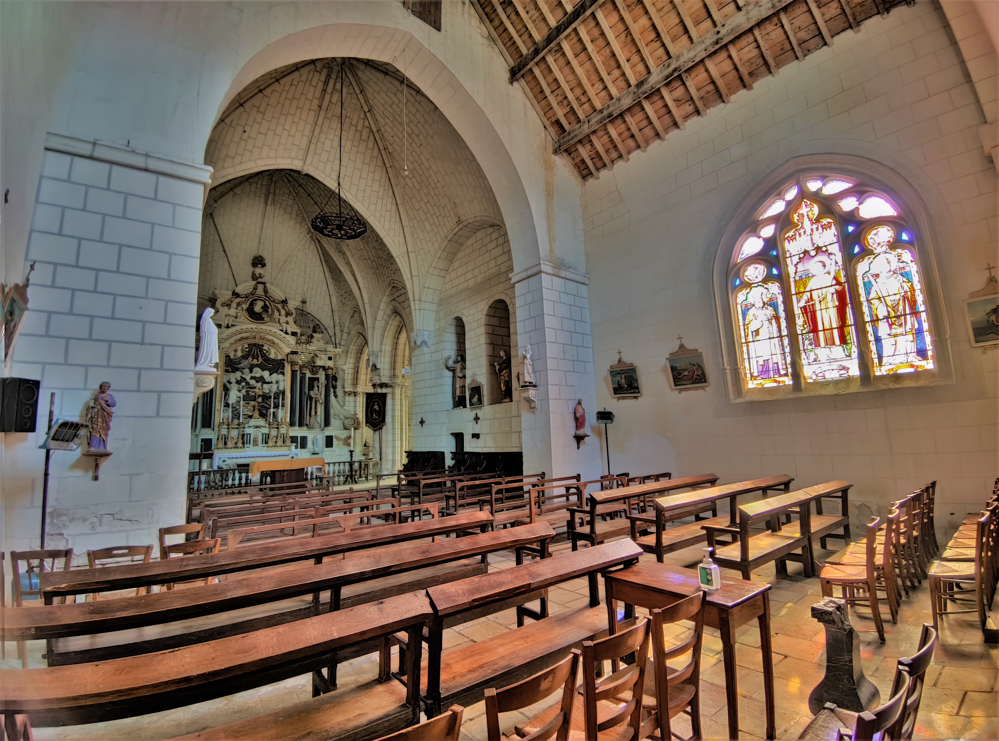 Pour visiter cette église paroissiale, il faut emprunter les clés à la mairie située en face de l'église. La nef actuelle est du 20ème siècle, construite après l'effondrement de la nef primitive. Cette dernière était beaucoup plus grande, ce qui explique les dimensions du chœur, de son retable en pierre et des chapelles latérales. De plus, des stalles rappellent la présence d'un prieuré au 14ème, cette église eu la fonction de prieurale. La partie Est, (chœur à chevet plat, sanctuaire et chapelles, la travée orientale de la nef qui y est accolée, le clocher), date du 12ème, 14ème et 15ème siècles. Cette partie primitive est classée depuis 1991 par les Monuments Historique, le retable en tuffeau, une rareté dans la région, justifie à lui seul une visite.