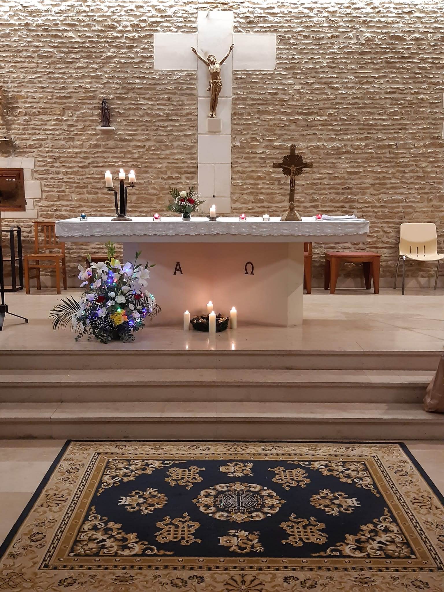 Eglise standard, simple. Photos intérieures lors de la messe de veille de Noël. Composition florales réalisées par ma femme. Crèche à l'extérieure à côté de l'église.