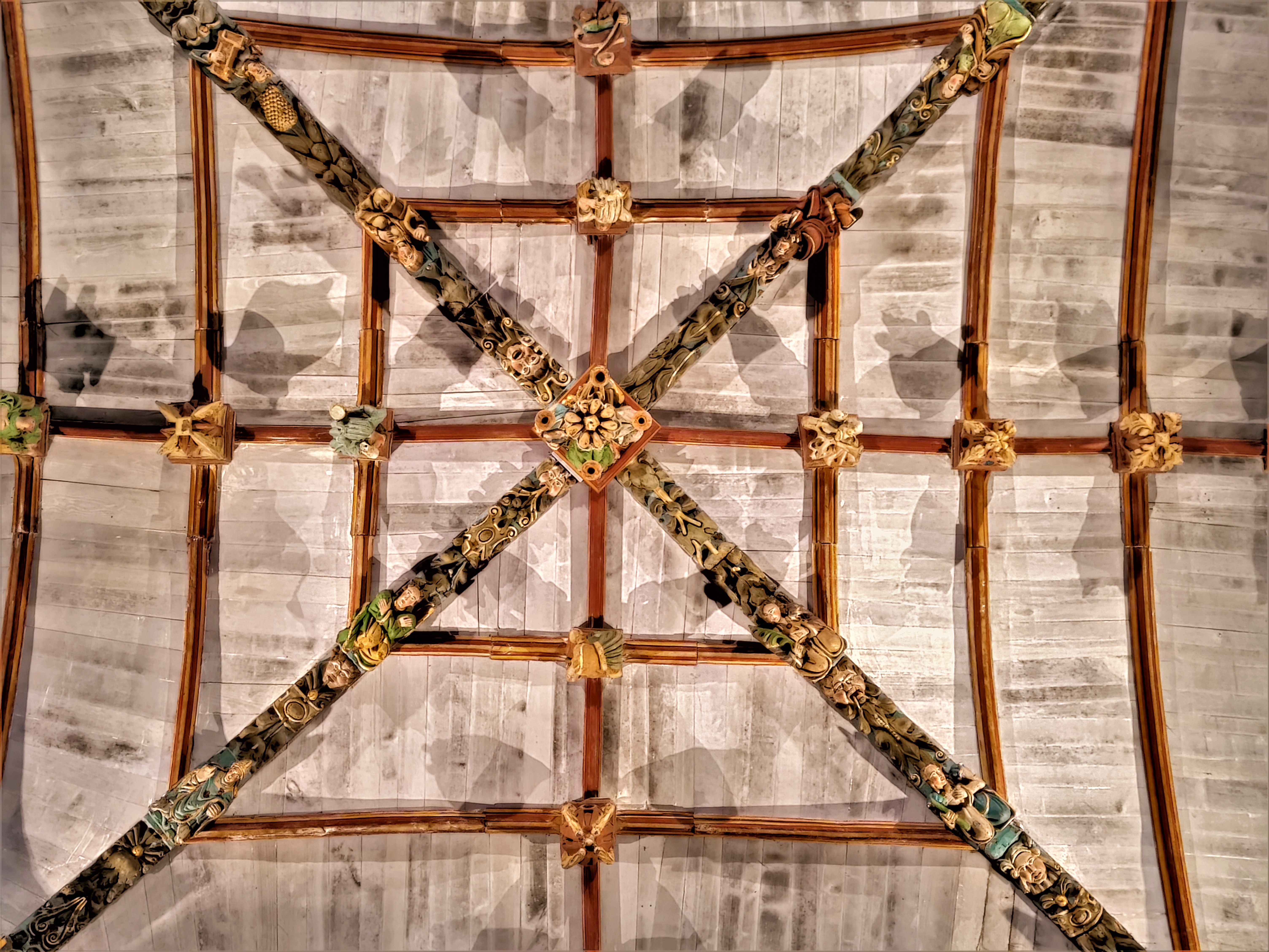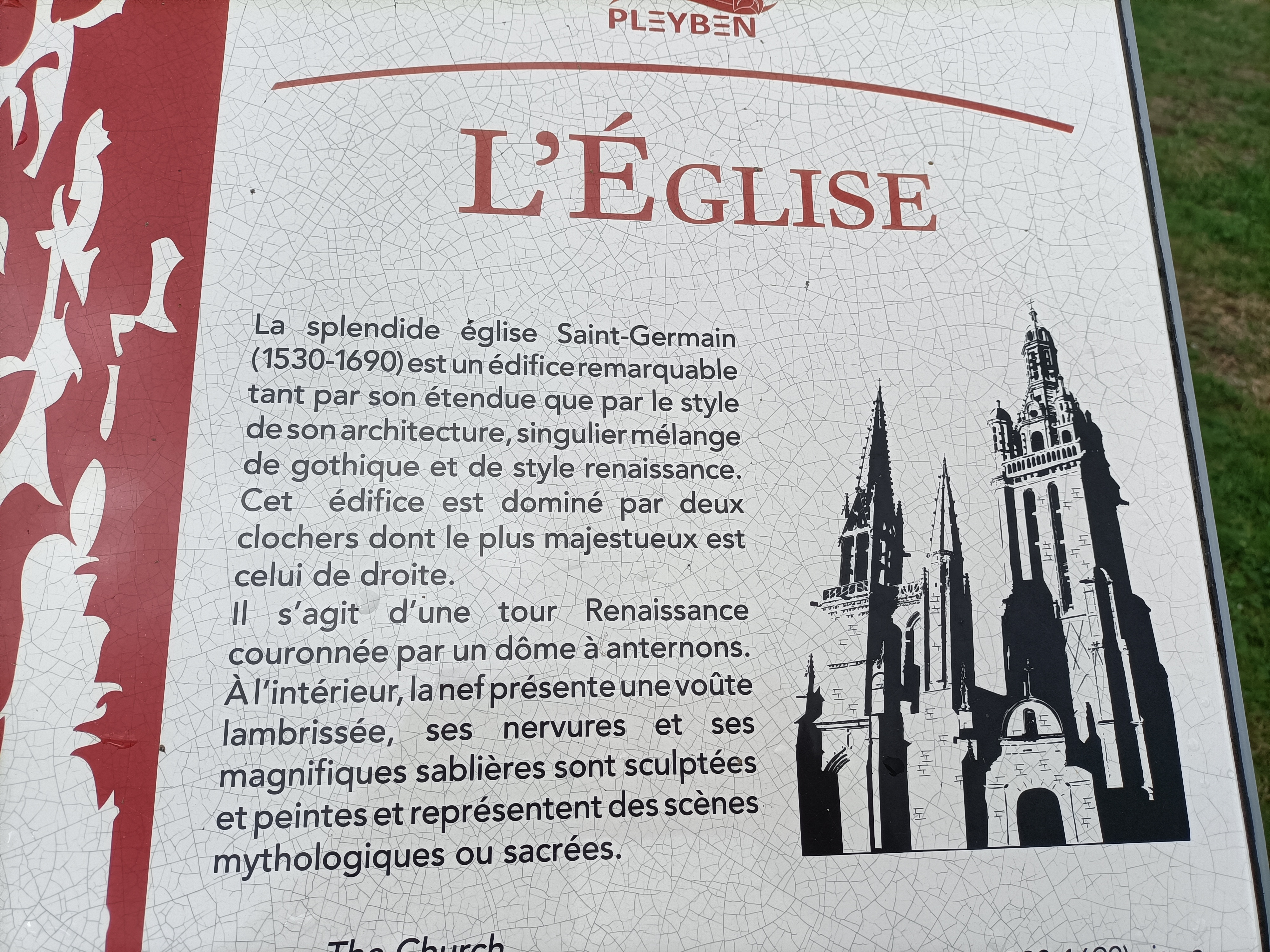 La construction de l'extraordinaire église Saint-Germain de Pleyben, Finistère, Bretagne commença en 1530. D'après l'inscription, elle fut consacrée 3 ans plus tard « en l'honneur de Dieu, de Notre-Dame, de Saint Germain et de Sainte Catherine ». Les transepts datent de 1564. Fenêtre et porte au sud de 1583. La construction de la tour commença en 1588, mais fut interrompue pendant les guerres de la Ligue, les travaux ne purent donc reprendre qu'en 1633 et s'achever dix ans plus tard. Au cours des 3 derniers siècles, l'église a été restaurée et reconstruite à plusieurs reprises. Le bras sud et la sacristie ont été ajoutés au XVIIIe siècle et le bas-côté nord a été rénové en 1811. La tour ouest a été restaurée au milieu du XIXe siècle et l'ensemble de l'ensemble a ensuite été rénové. La tour principale n'a été échafaudée et sablée qu'en 2020. L'église est l'une des plus grandes et des plus détaillées de la région et doit absolument être visitée si vous êtes dans la région. Les poutres et les entretoises en bois richement décorées du plafond voûté sont remarquables.