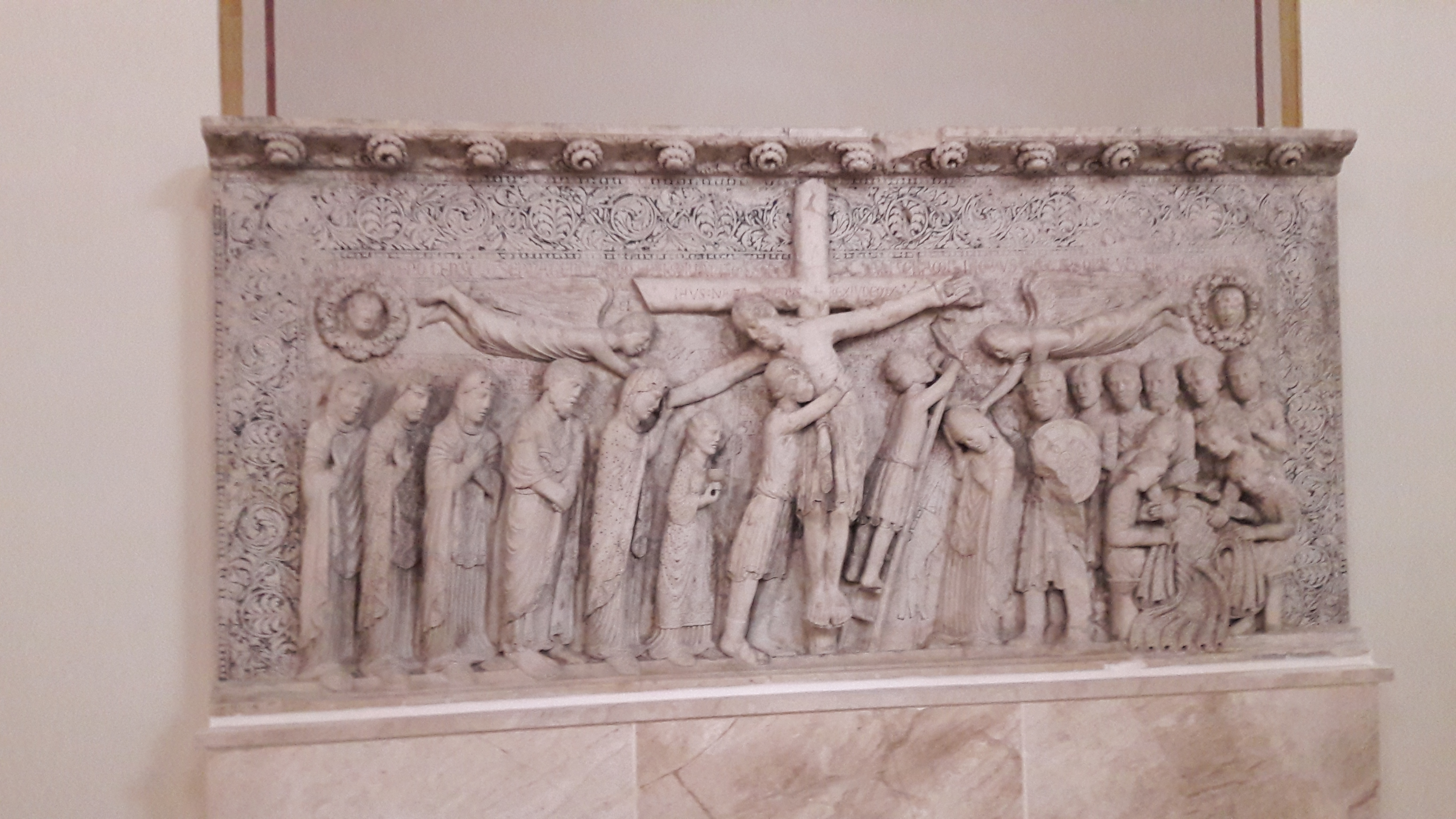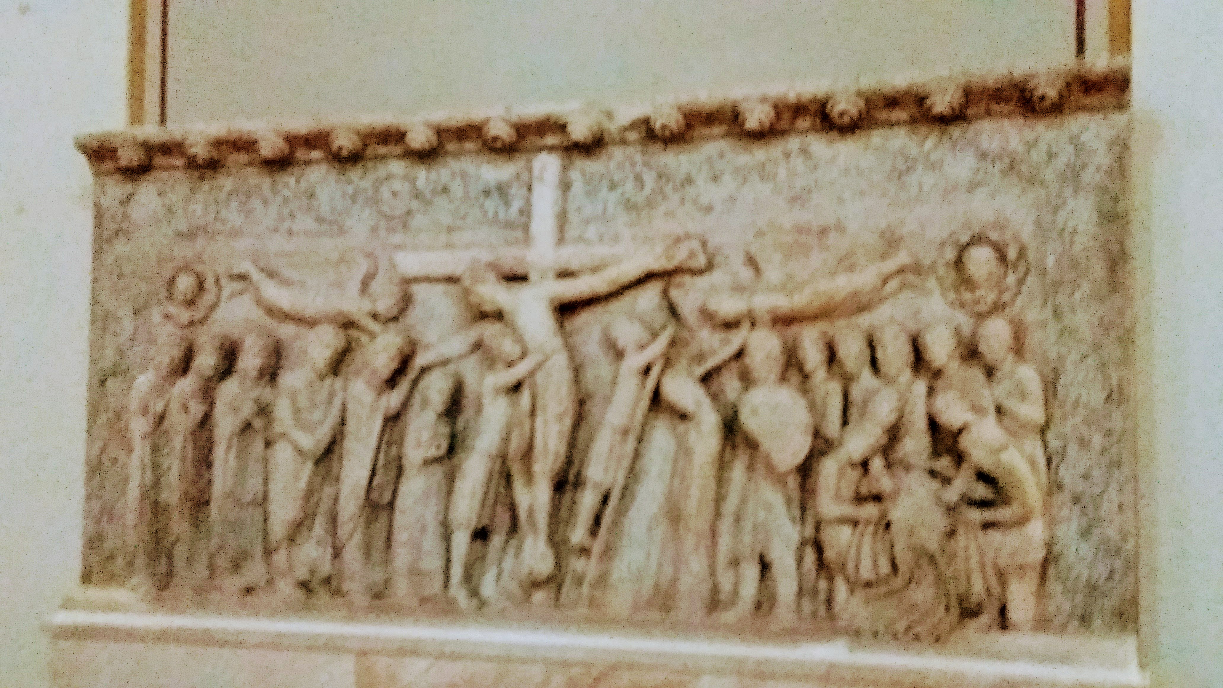 Voir surtout dans la nef de gauche ce bas relief du XIV° SIÈCLE, à portée de main, à hauteur des yeux, émouvant parce que déchiffrable facilement. Je ne vous en dirai pas plus mais ce témoignage de la foi des anciens, à ce point à portée de main, est émouvant je le répète,.surtout si vous lui rendez visite plusieurs fois, même très brièvement