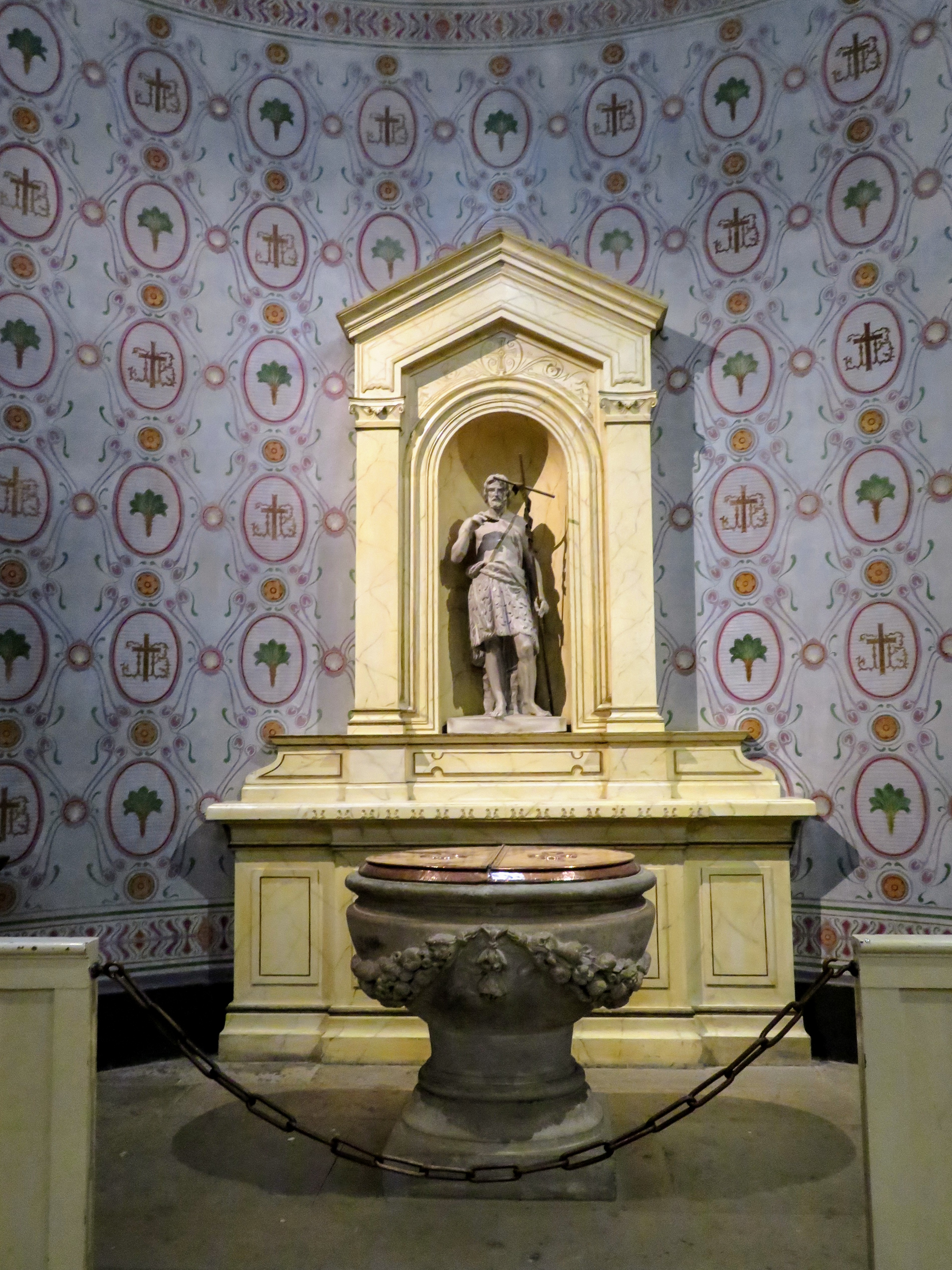Tem o Tetragrama no cimo de um quadro do lado esquerdo nas alçadas quase por trás do Púlpito da Esquerda.