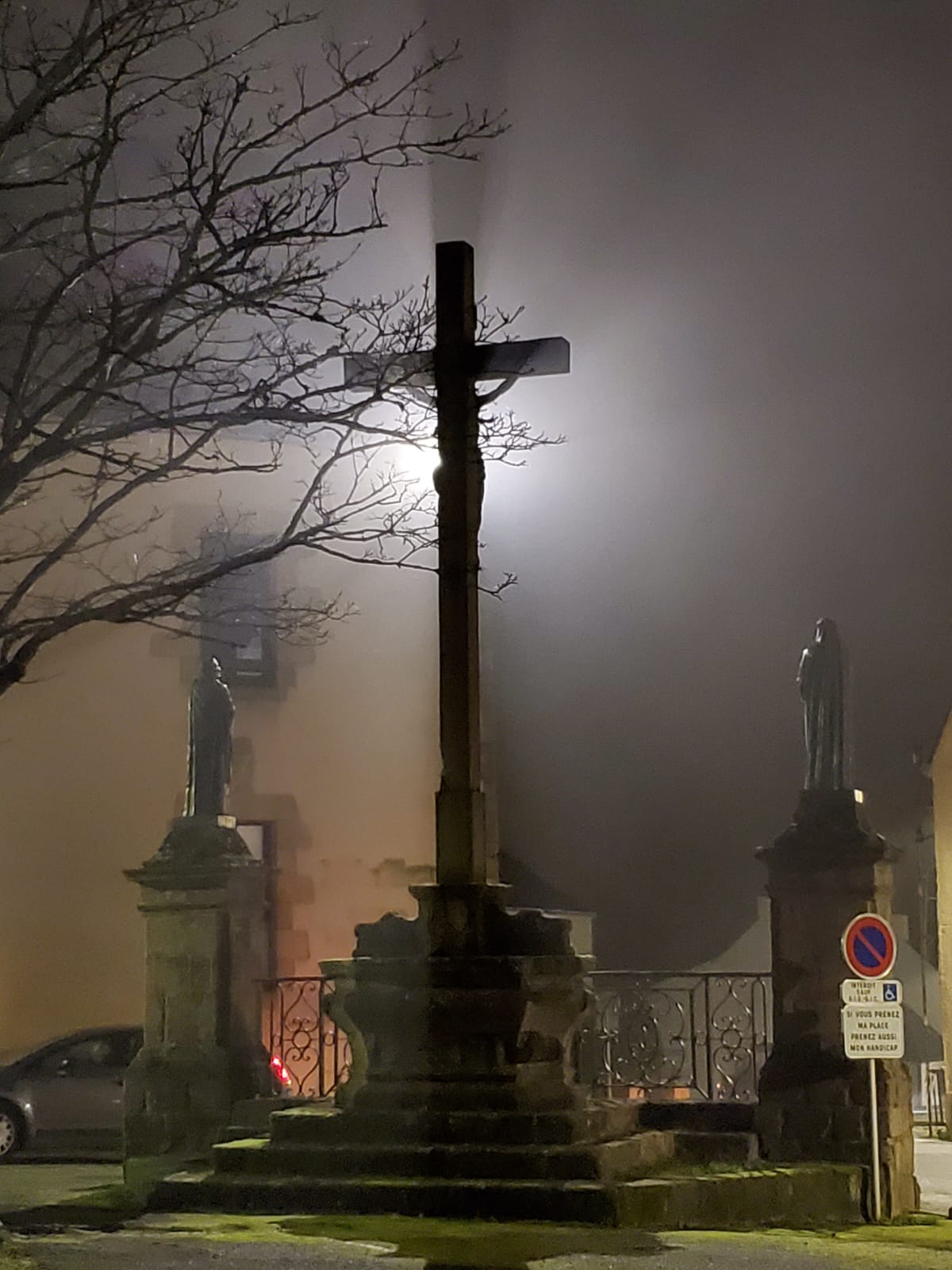 Situé entre l’église paroissiale Saint-Guigner et les vestiges de la chapelle Notre Dame des Orties, ce calvaire massif comporte un socle à plusieurs degrés. Sa longue colonne se termine par un panneau sculpté à deux faces.