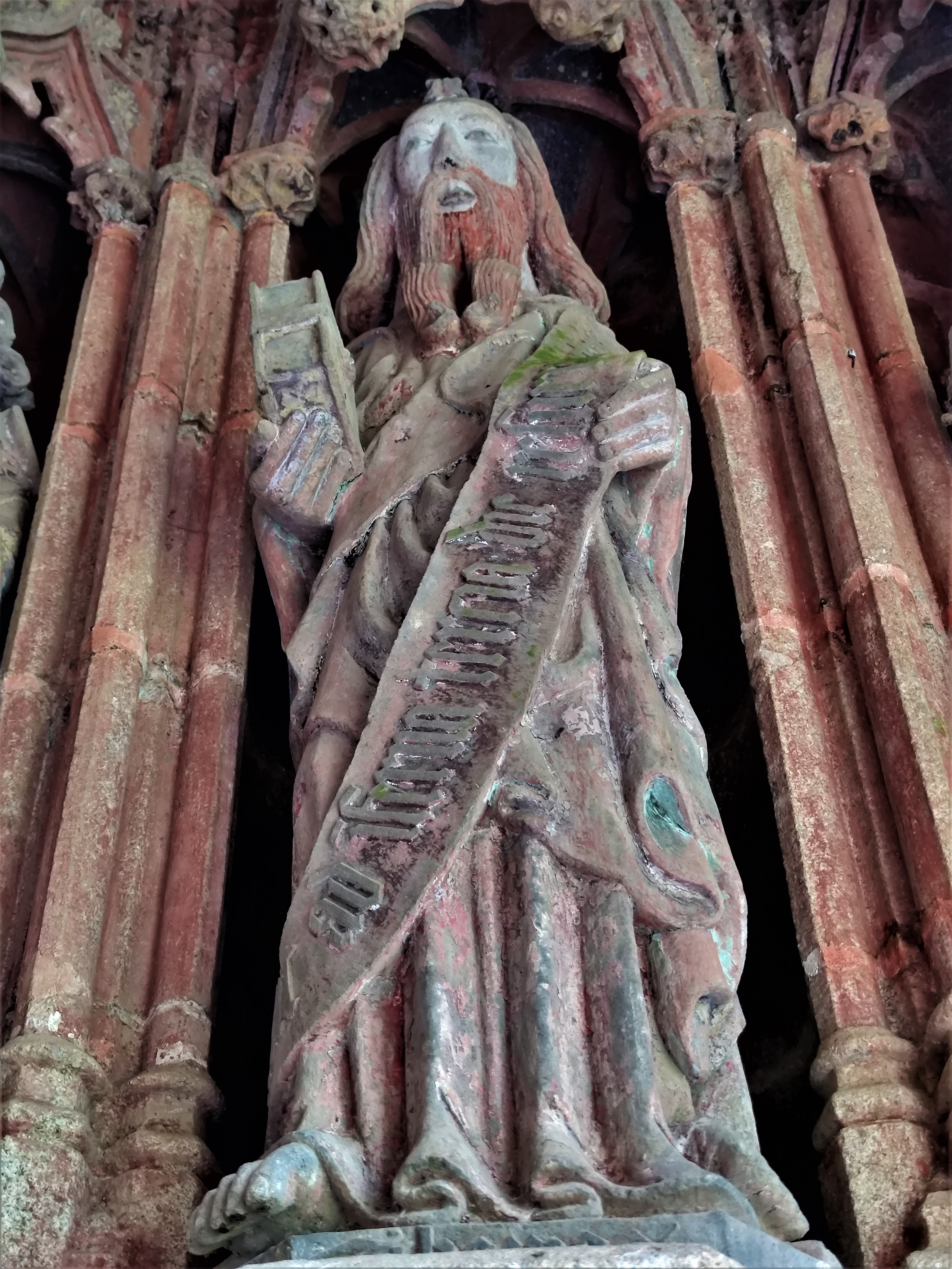 Plutôt spécial... le saint patron des créatures à cornes, en particulier les vaches et les bœufs ! Le vitrail date du milieu du 19ème siècle. Décevant Cependant, bonnes sculptures dans la porte ouest et remarquables du XVe siècle. Pietà