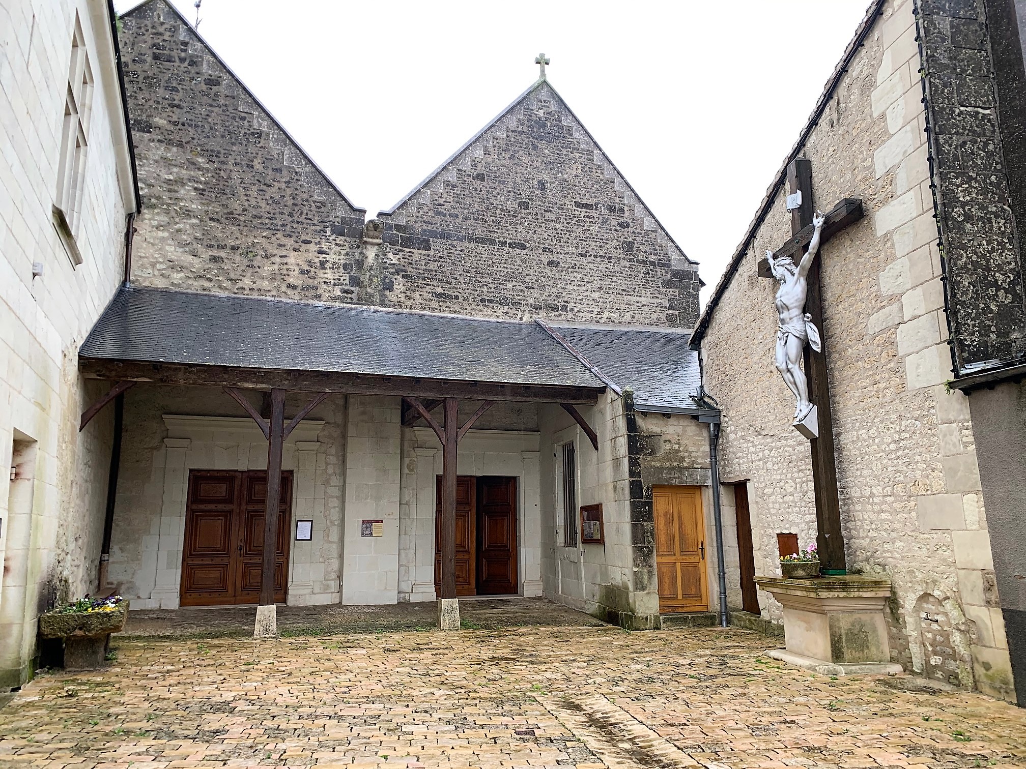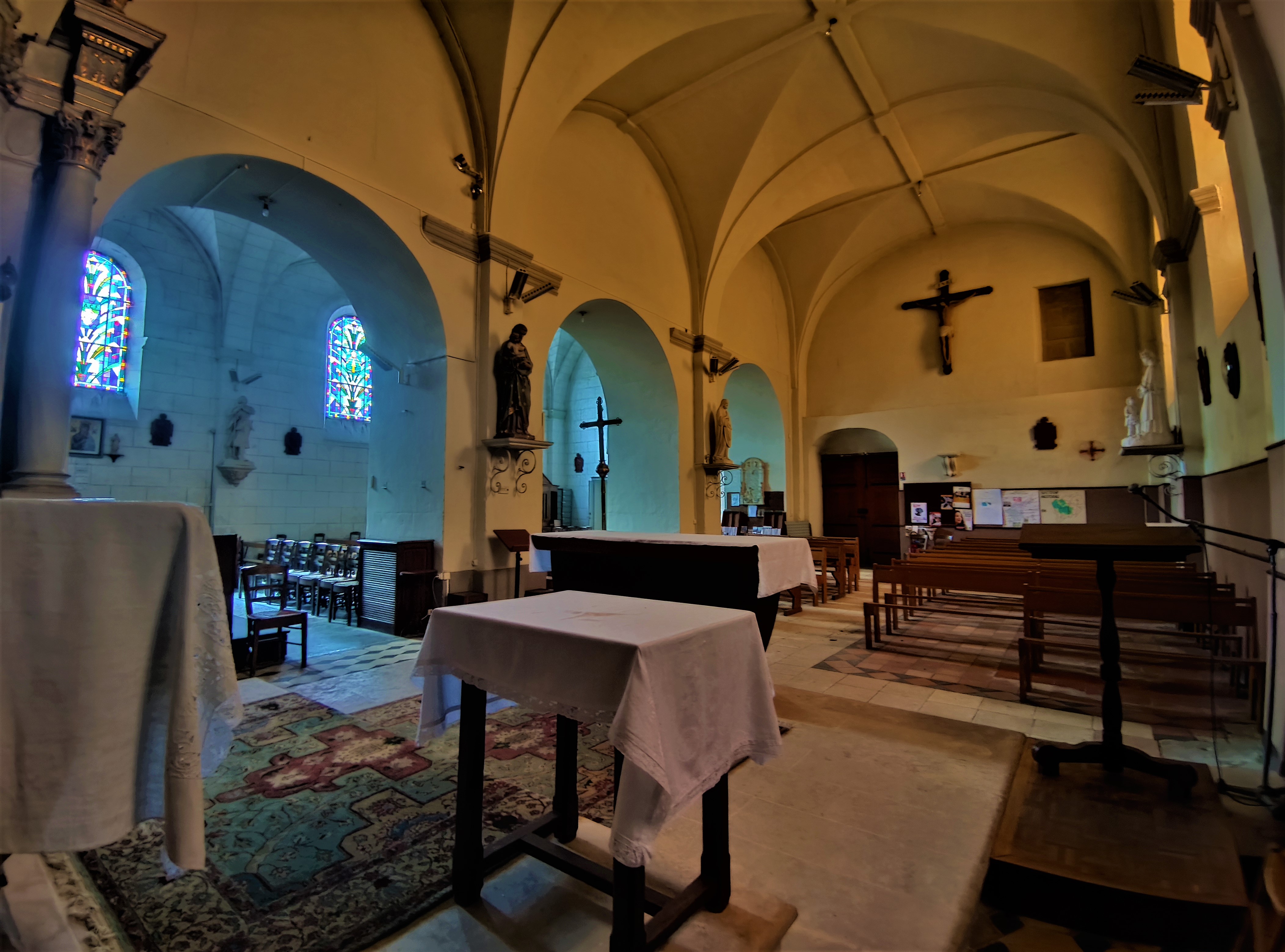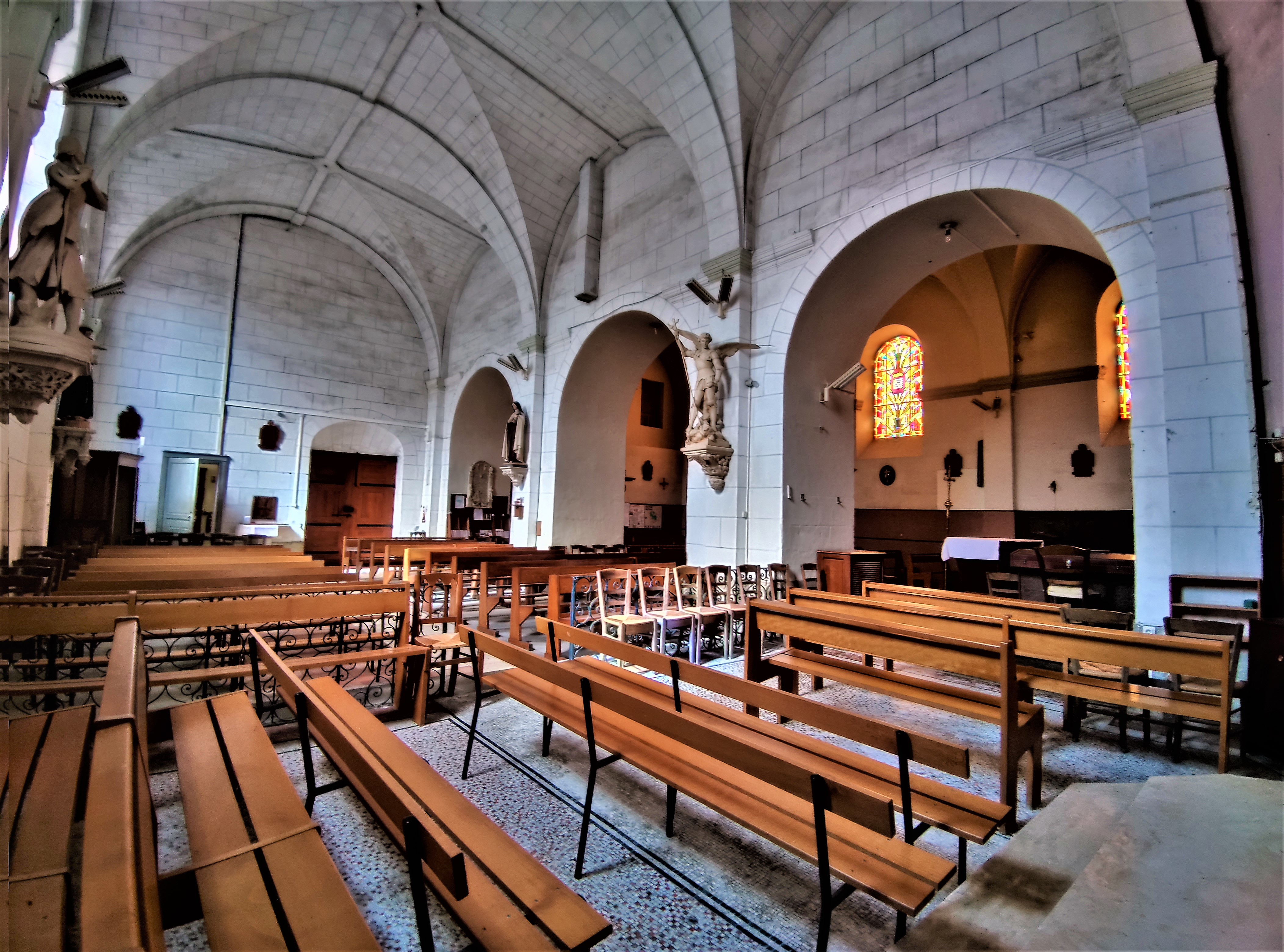 Visite idéale en complément de celle du château, aujourd'hui Historial du Poitou. Son histoire est liée à celle du château auquel elle est accolée. Orientée sud-ouest nord-est, elle est composée de deux parties édifiées à des époques différentes. La moitié la plus ancienne était la chapelle du château, construite au 17ème siècle. Devenue église paroissiale, trop petite, on lui adjoint au sud-est une seconde chapelle (de la Vierge) au 19ème. Construite à partir d'une grange, c'est seulement au 20ème siècle que cette seconde partie sera voûtée en brique, dans le style de la chapelle seigneuriale. Aujourd'hui l'ensemble est cohérent et harmonieux, c'est une église dont la nef possède deux vaisseaux séparés par des arcades en plein cintre.