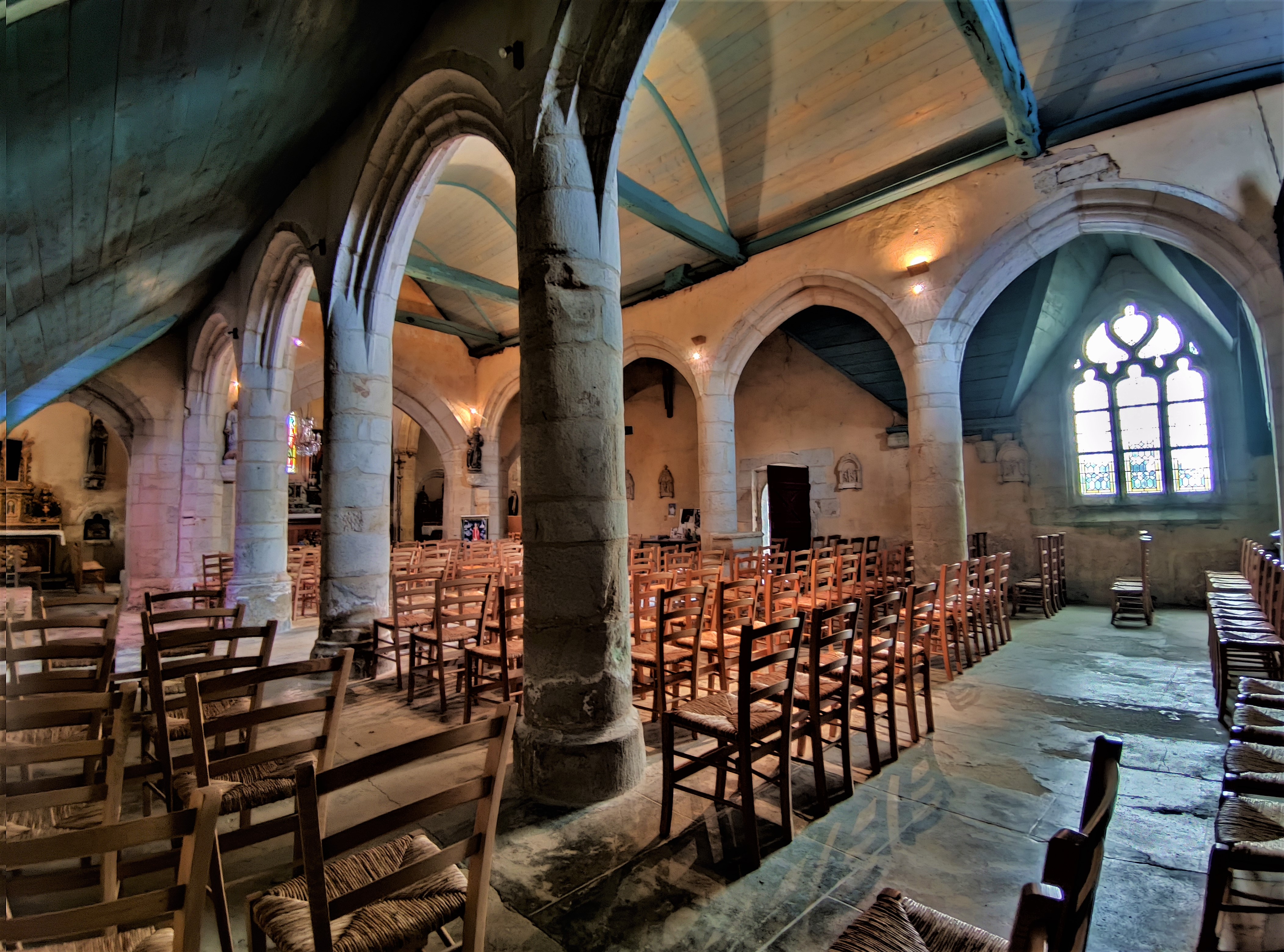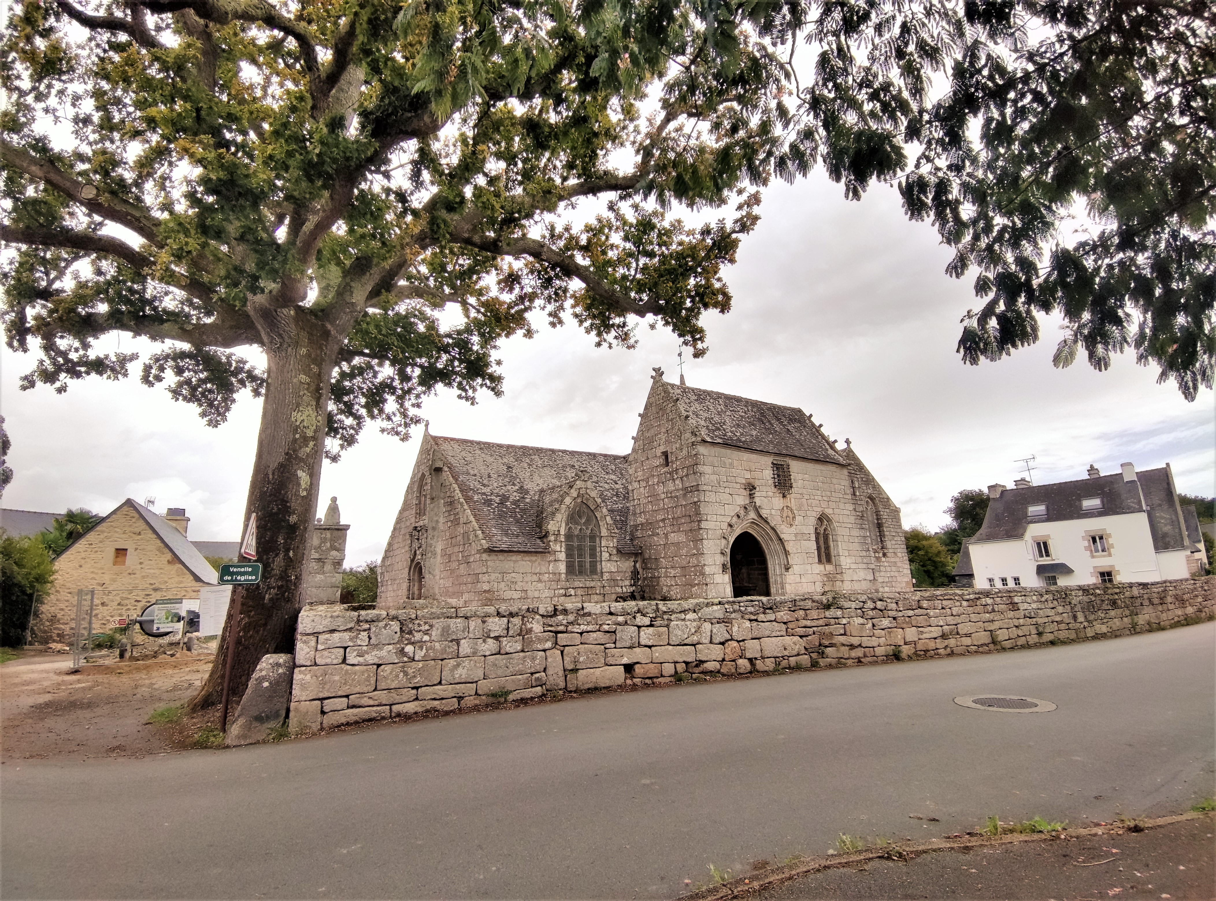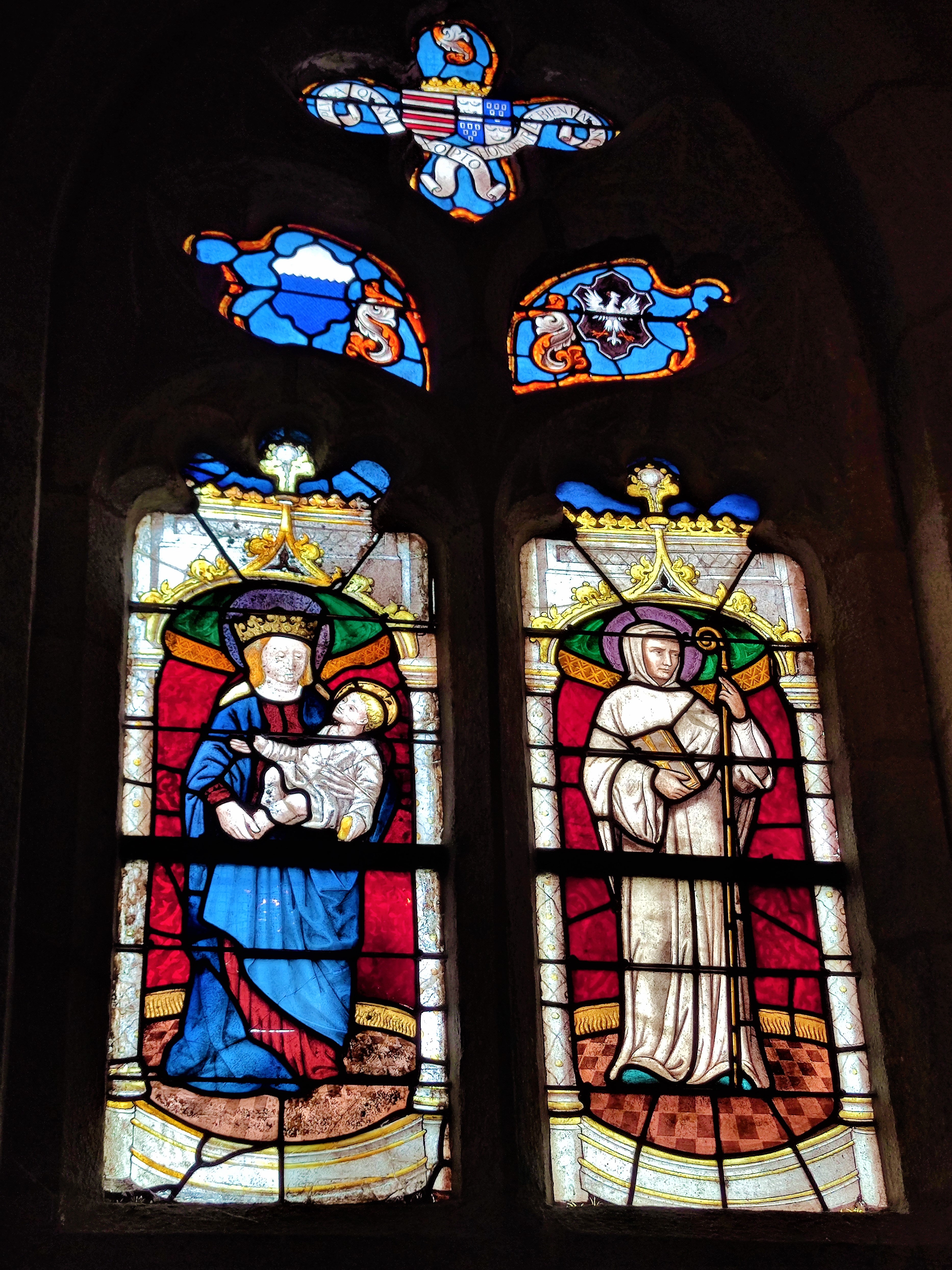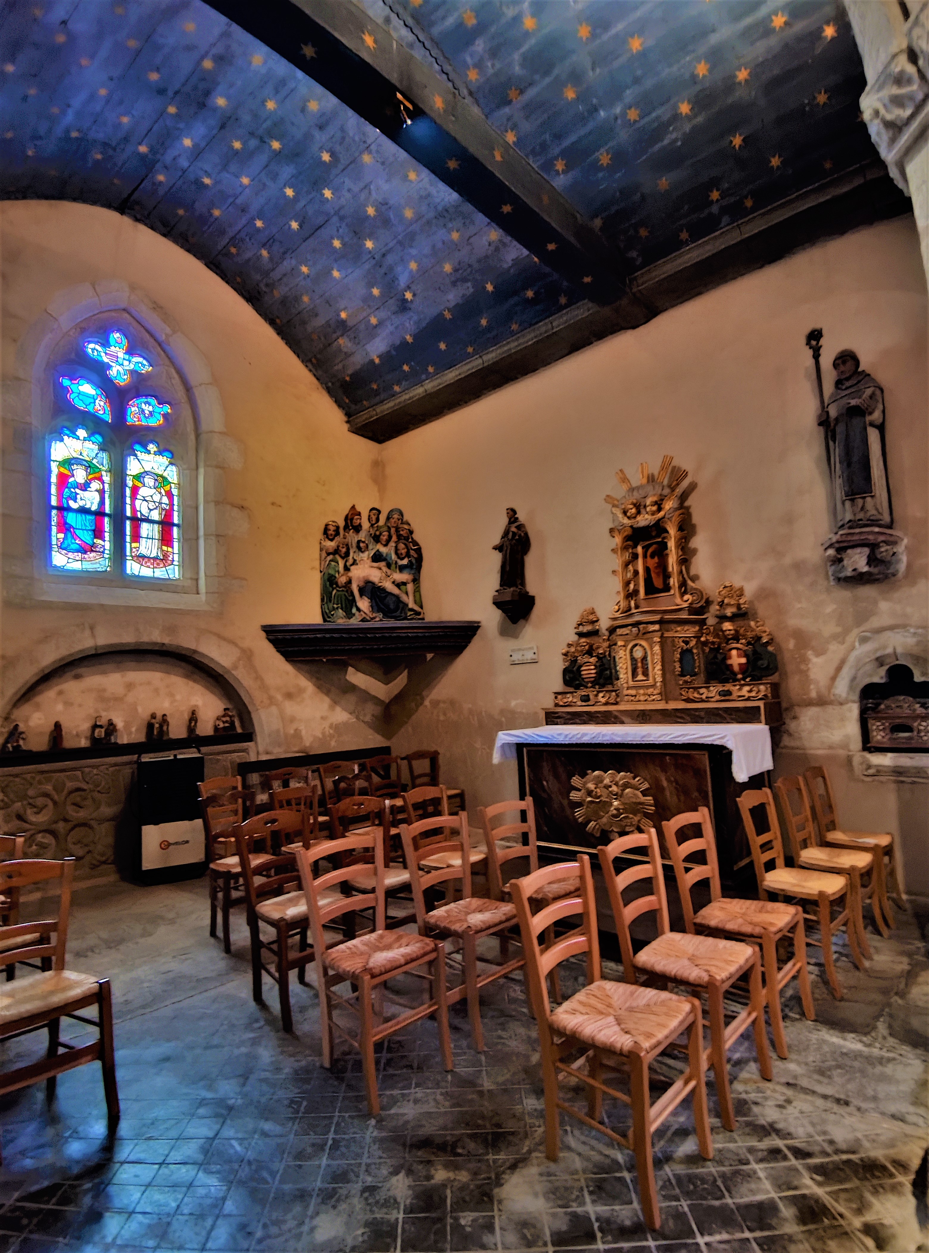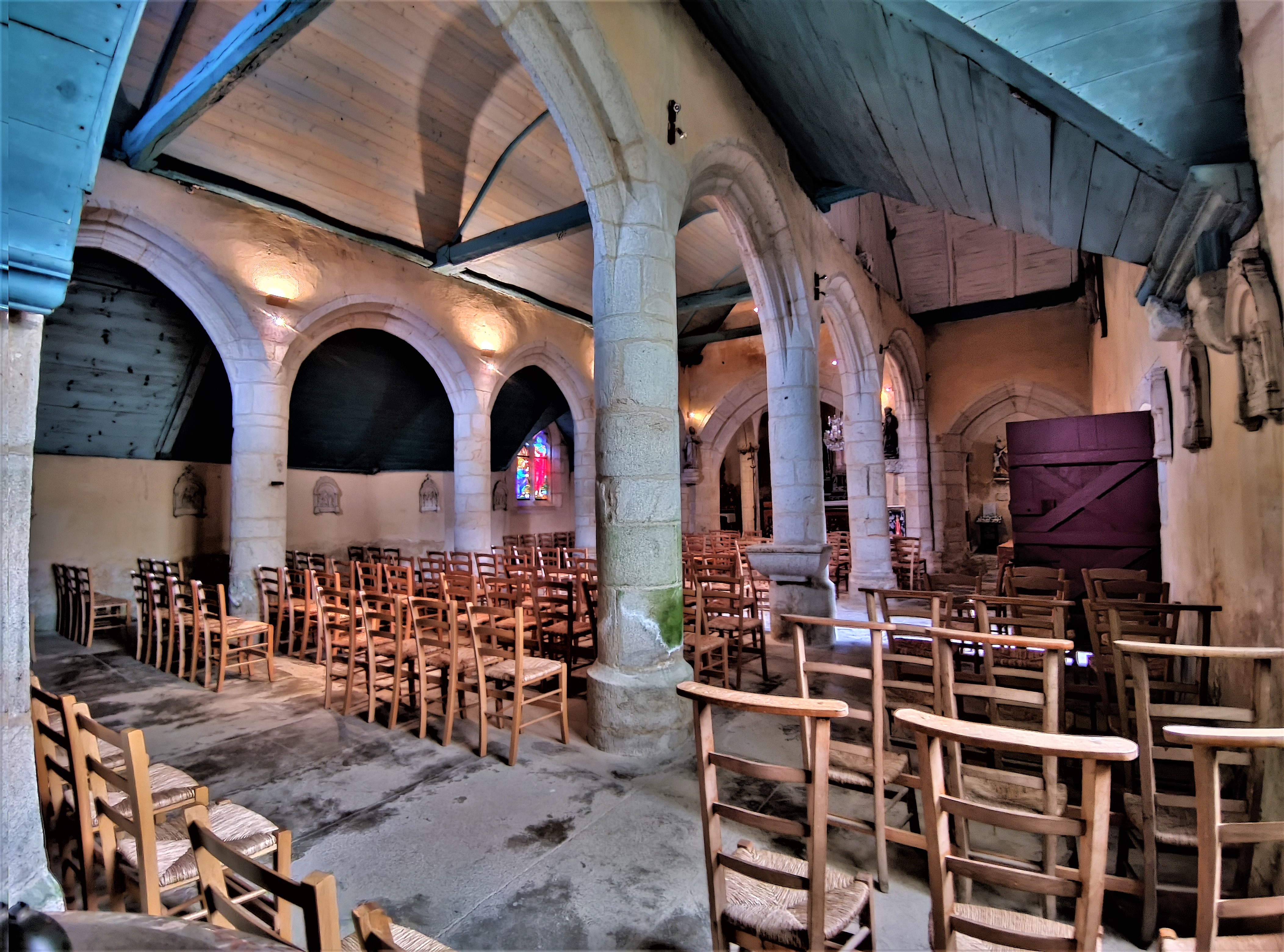 Classée depuis 1938, cette église du 15ème m'a séduit par son charme et son originalité. Les bâtisseurs bretons du 15ème construisirent des édifices gothiques dont les proportions, dimensions et élévations donnèrent des églises qui rassemblent, accueillantes et chaleureuses. À l'intérieur, les décors peints, le mobilier et la statuaire accentuent ces impressions. Une originalité, la salle du trésor construite au-dessus du porche abritait les archives ; dans les châteaux, cette salle était souvent enterrée pour protéger les précieux documents des incendies. Le porche voûté d'ogives précède l'entrée dans une nef à 3 vaisseaux plafonnées en bois. En parcourant Wikipédia, j'ai découvert que l'église reconnaît deux titulaires, Saint-Hilaire de Poitiers (4ème) mais aussi Saint-Maurice de Carnoët (Maurice Duault, 12ème, canonisé au 13ème). Il est évoqué dans un vitrail aux côtés de la Vierge et par une statue.