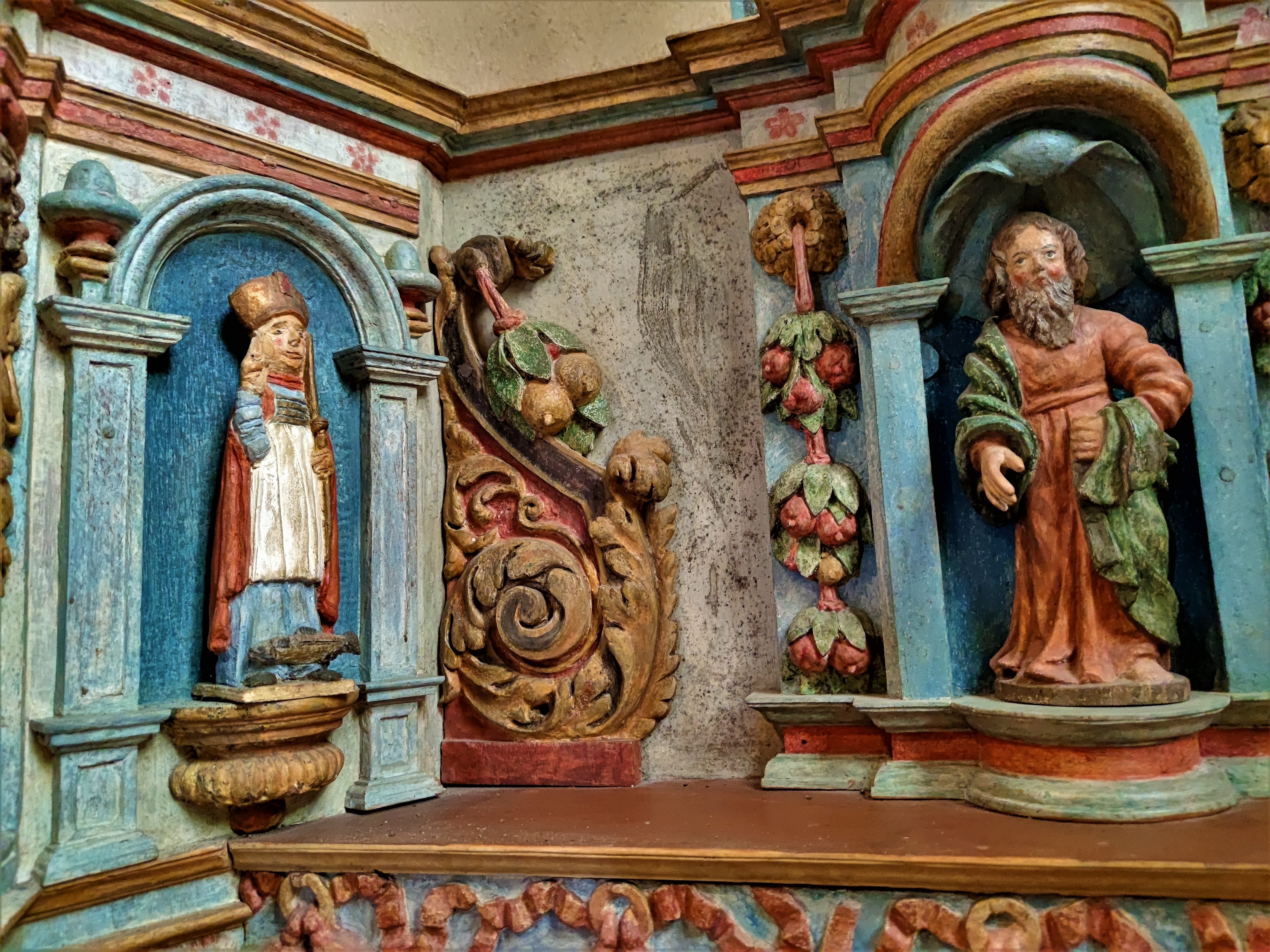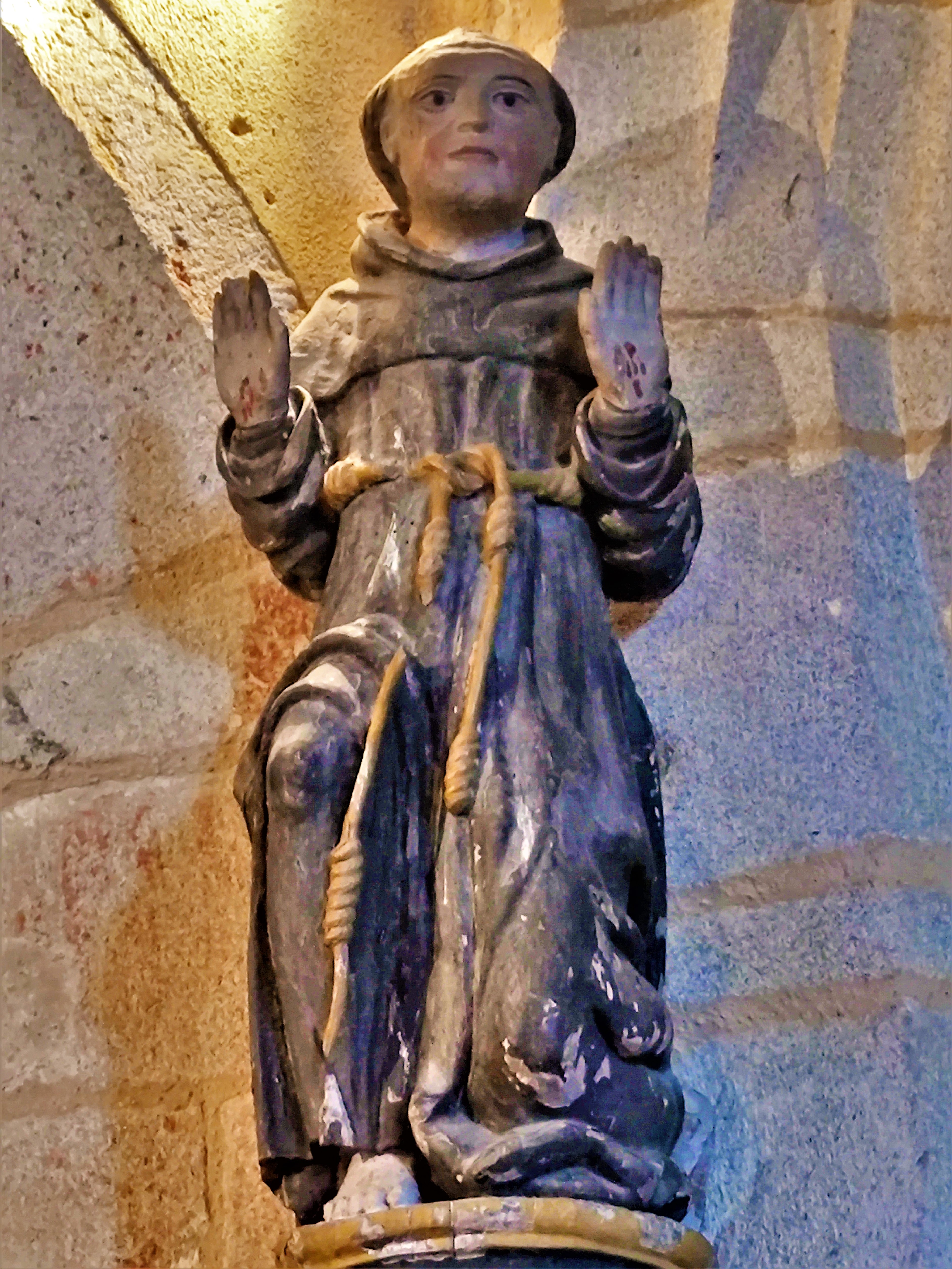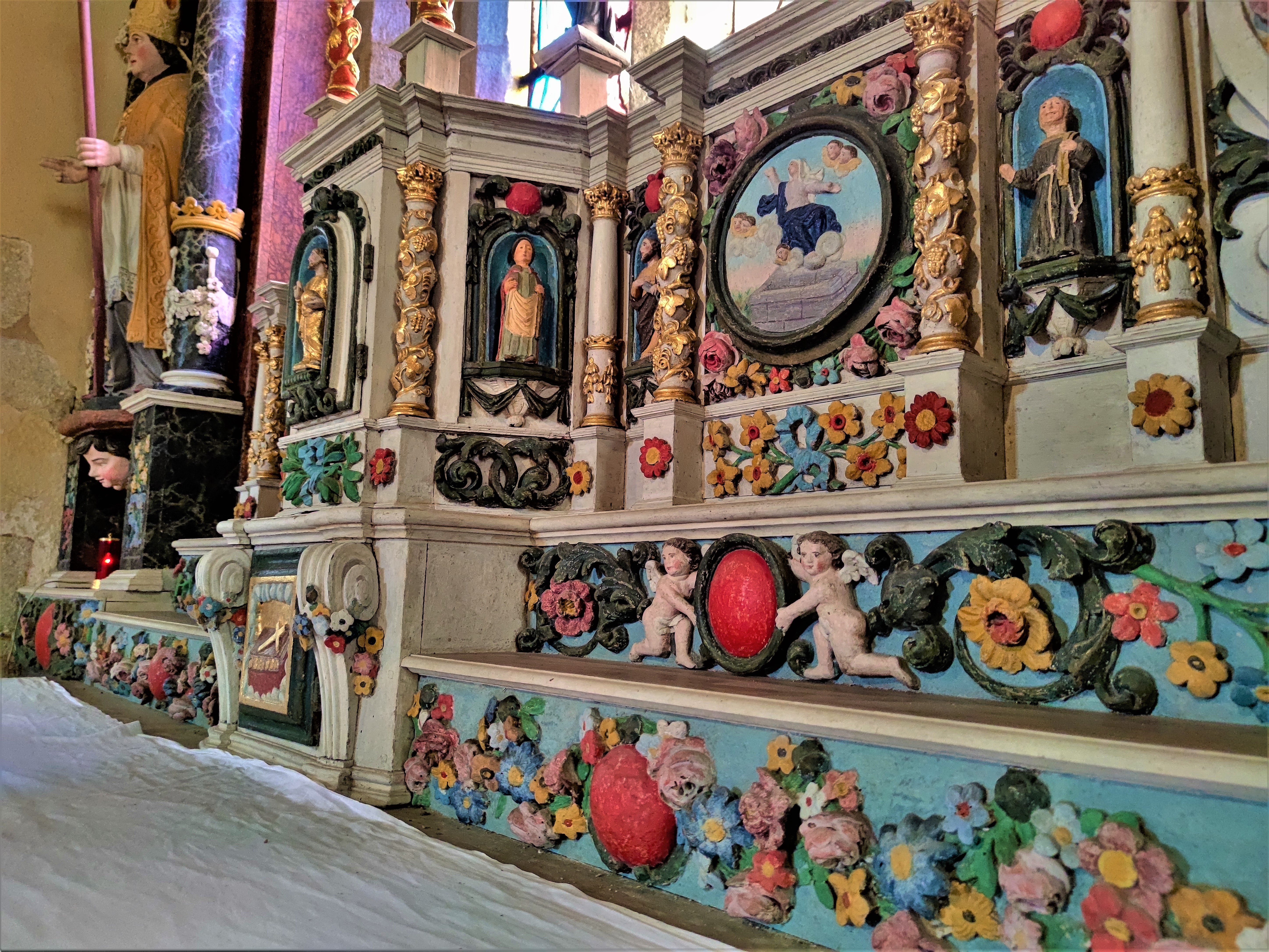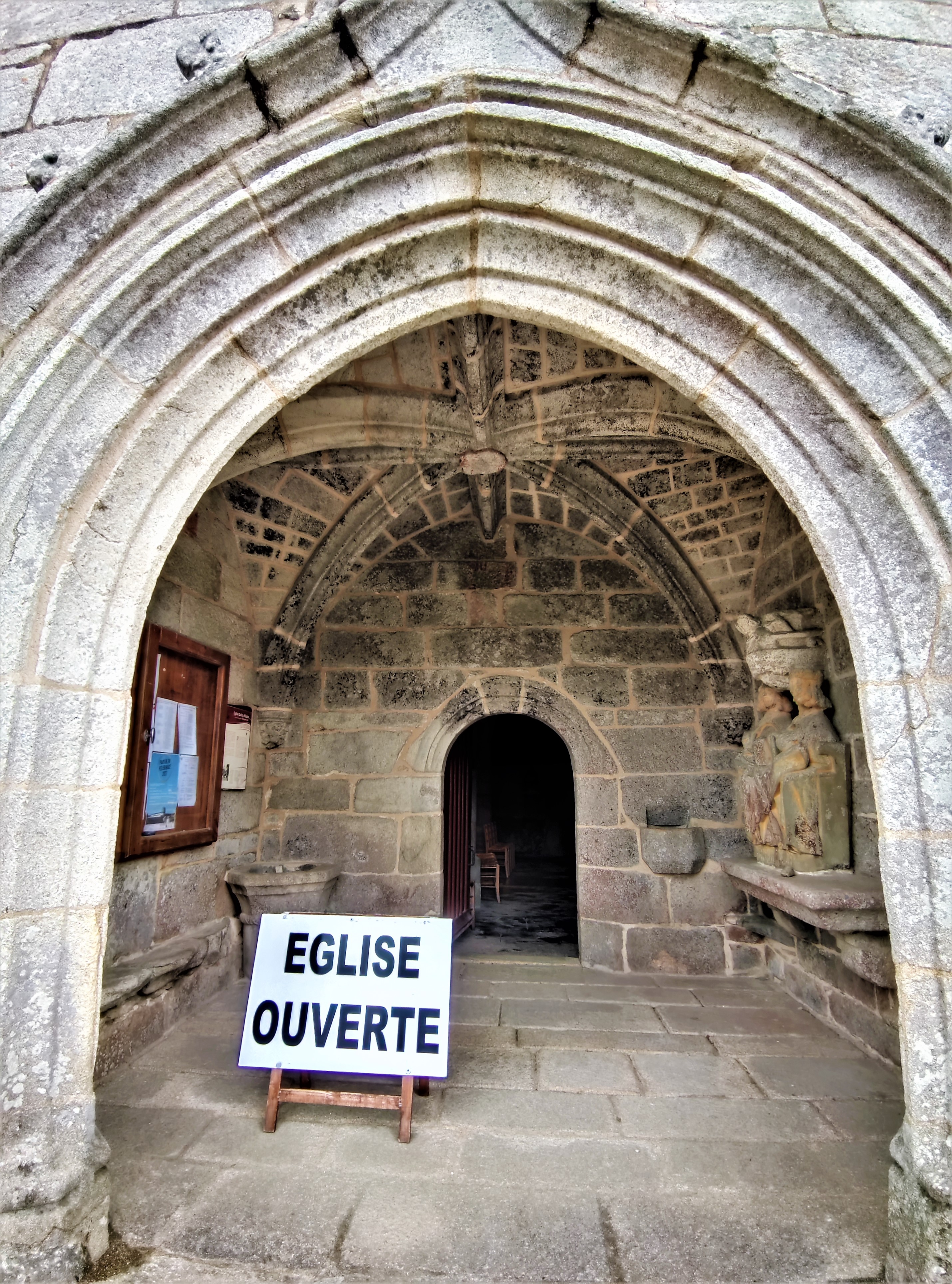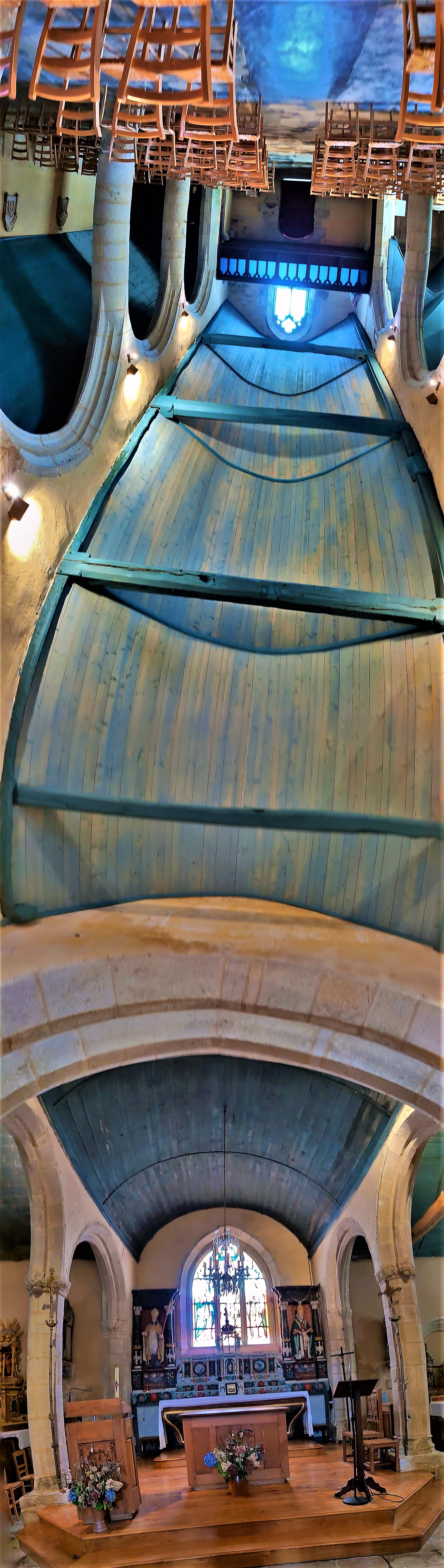 Classée depuis 1938, cette église du 15ème m'a séduit par son charme et son originalité. Les bâtisseurs bretons du 15ème construisirent des édifices gothiques dont les proportions, dimensions et élévations donnèrent des églises qui rassemblent, accueillantes et chaleureuses. À l'intérieur, les décors peints, le mobilier et la statuaire accentuent ces impressions. Une originalité, la salle du trésor construite au-dessus du porche abritait les archives ; dans les châteaux, cette salle était souvent enterrée pour protéger les précieux documents des incendies. Le porche voûté d'ogives précède l'entrée dans une nef à 3 vaisseaux plafonnées en bois. En parcourant Wikipédia, j'ai découvert que l'église reconnaît deux titulaires, Saint-Hilaire de Poitiers (4ème) mais aussi Saint-Maurice de Carnoët (Maurice Duault, 12ème, canonisé au 13ème). Il est évoqué dans un vitrail aux côtés de la Vierge et par une statue.