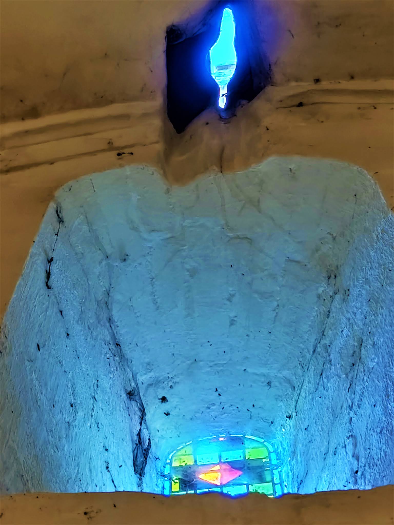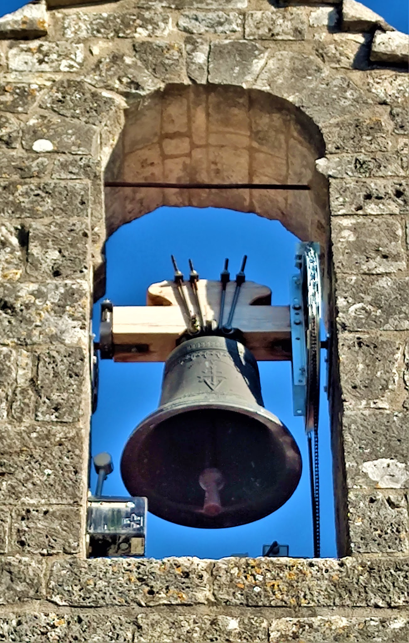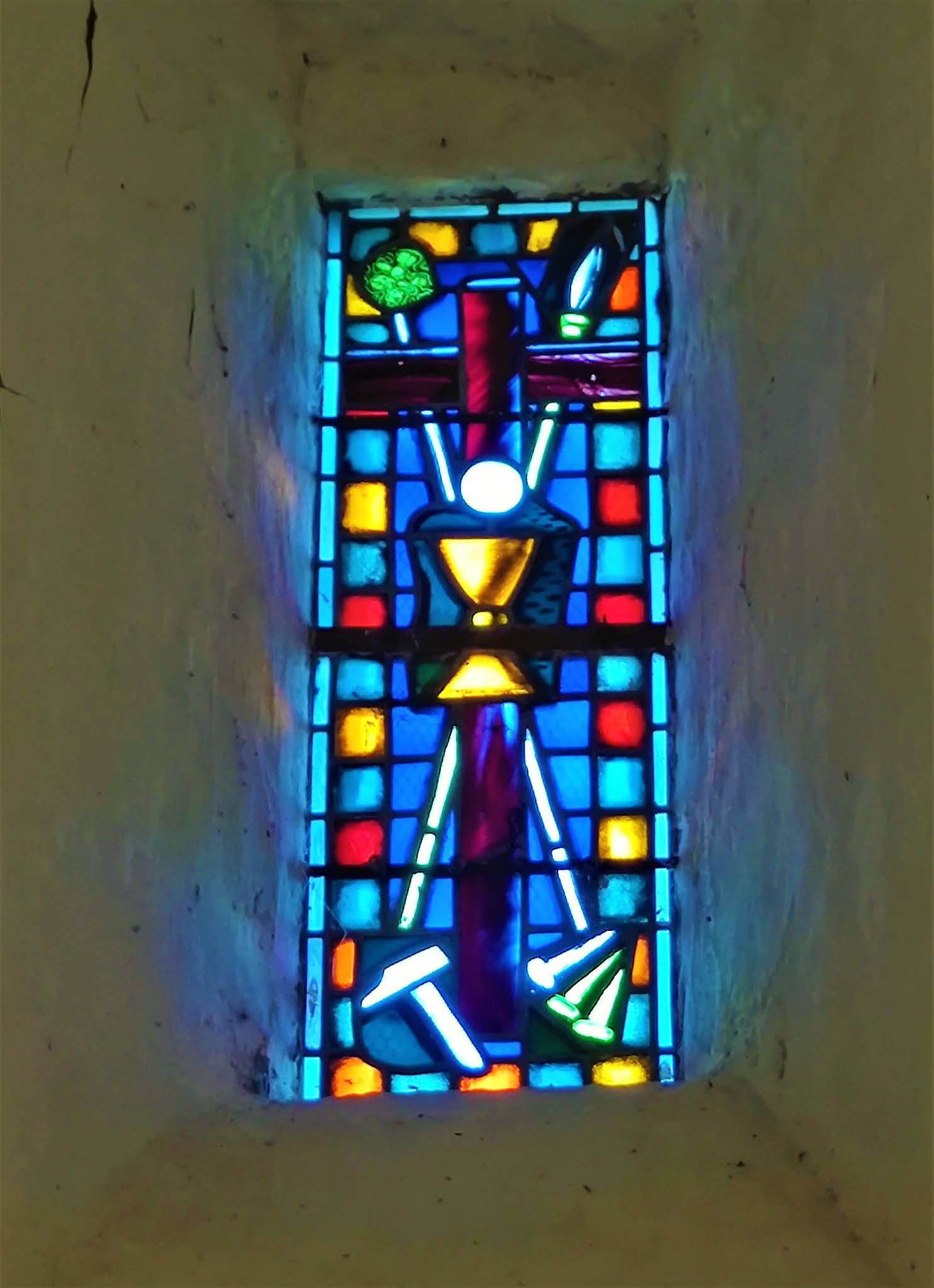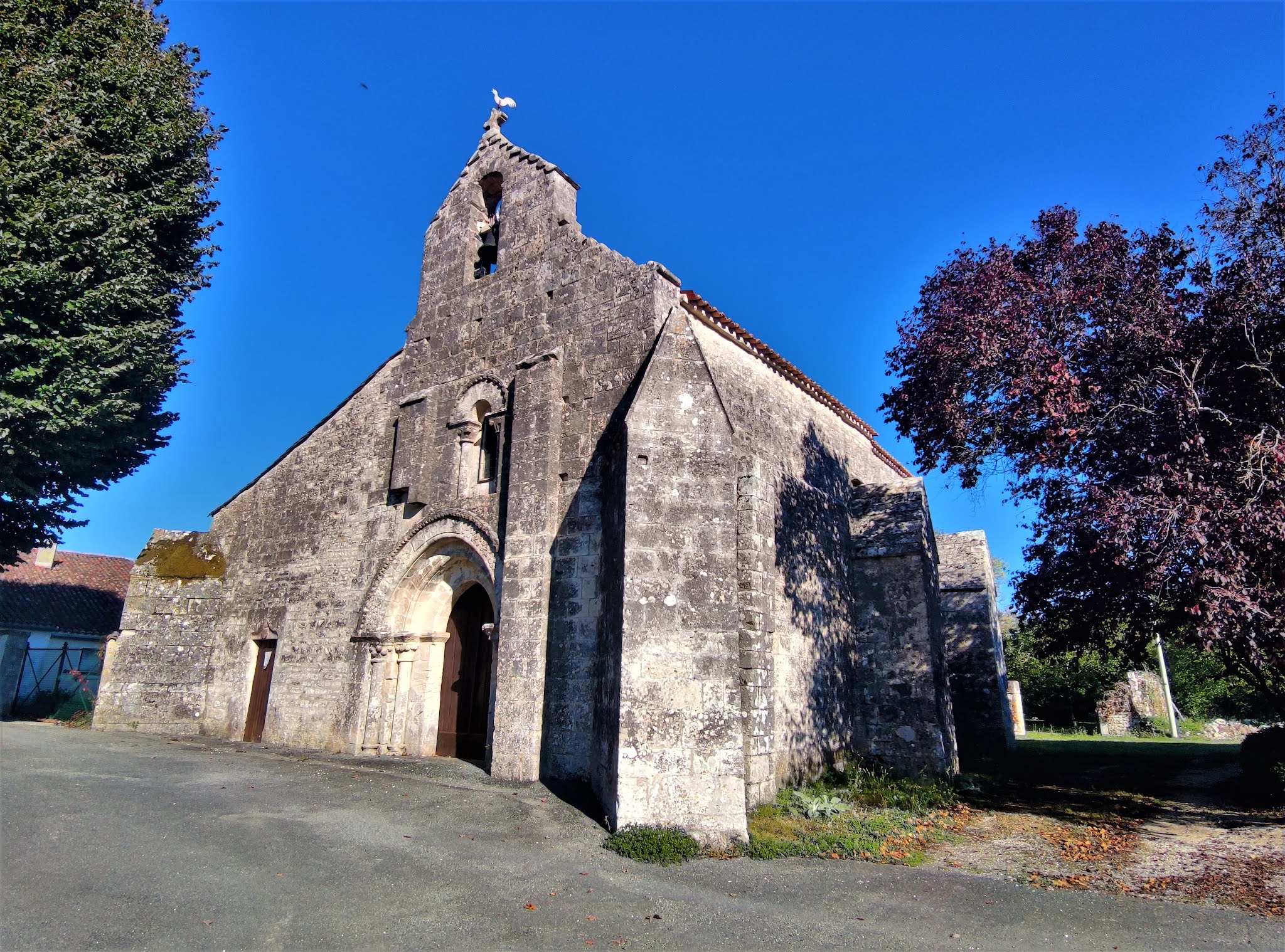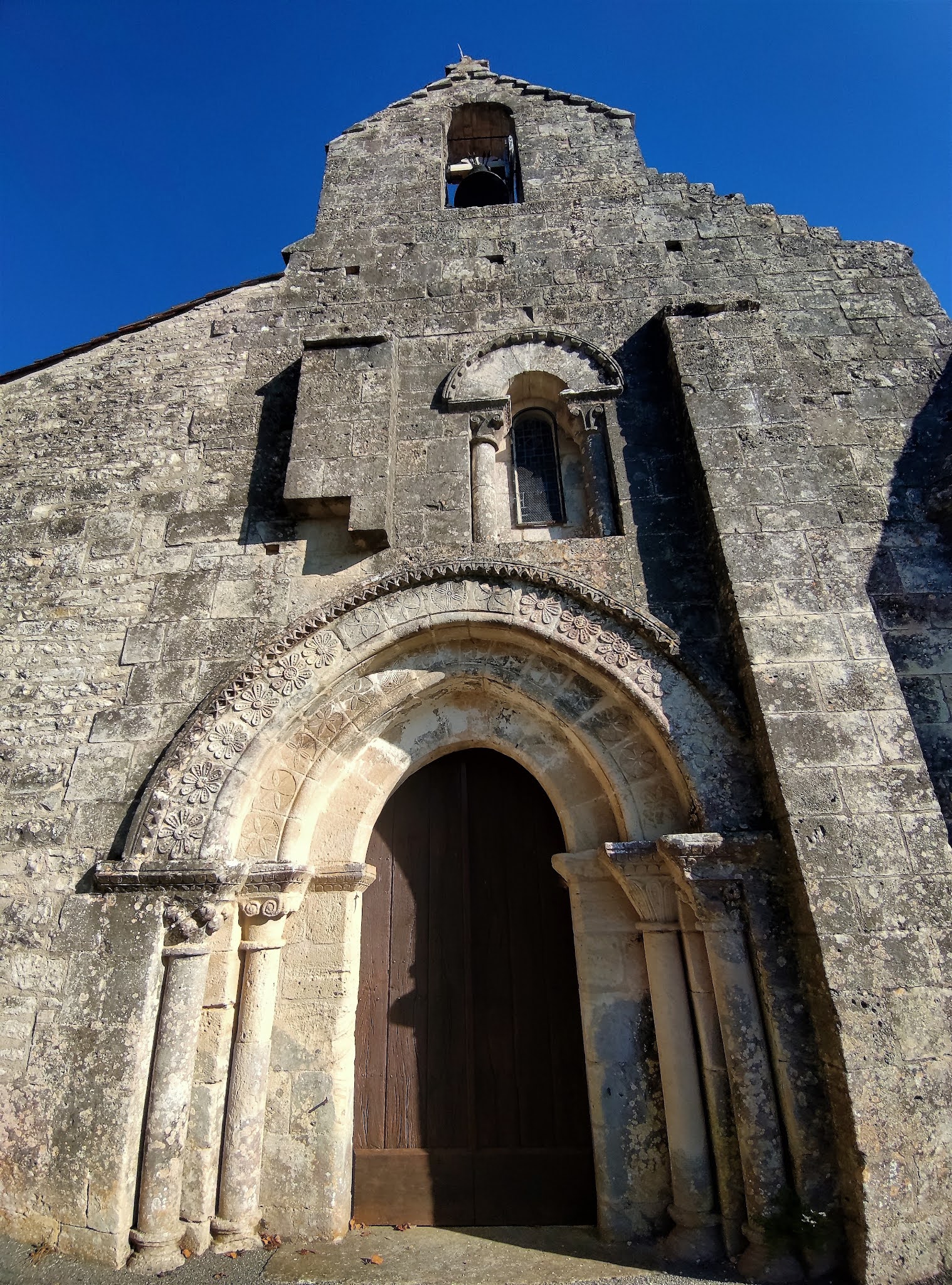 L'humilité de cette église m'a charmé, son authenticité témoigne de mille ans d'histoire. Inscrite depuis 1969 par les Monuments Historiques, cette modeste église millénaire est d'une authenticité toute particulière. Découvrir cette façade, ce portail du 11ème siècle et ses décors raffinés m'a ému et comblé. Son histoire de 10 siècles s'écrit dans son architecture avec beaucoup d'évidence. L'asymétrie de la façade évoque l'agrandissement du 15ème siècle au Nord et la construction des deux nefs voûtées d'ogives. Le pignon sert de clocher mur pour la cloche unique. Un simple trou dans la voûte permettait le passage de la corde de la cloche, aujourd'hui électrifiée. Les voûtes sont basses et reposent sur d'énormes piliers sans décors. Les deux vaisseaux se terminent à l'Est par des chevets plats, occupés par deux autels. Le mur du chevet Nord est décoré de peintures. Une table sert d'autel pour les célébrations, elle est placée dans l'angle Sud-Est, les sièges rayonnent autour de cette table dans les 2 nefs. L'humilité de l'édifice m'a charmé. La beauté, expression de la Foi, n'est pas absente, les vitraux de Paul Bony (1911-1982) et de son épouse, Adeline Hébert-Stevens (1917-1998) maîtres verriers ont une présence colorée et réjouissante.