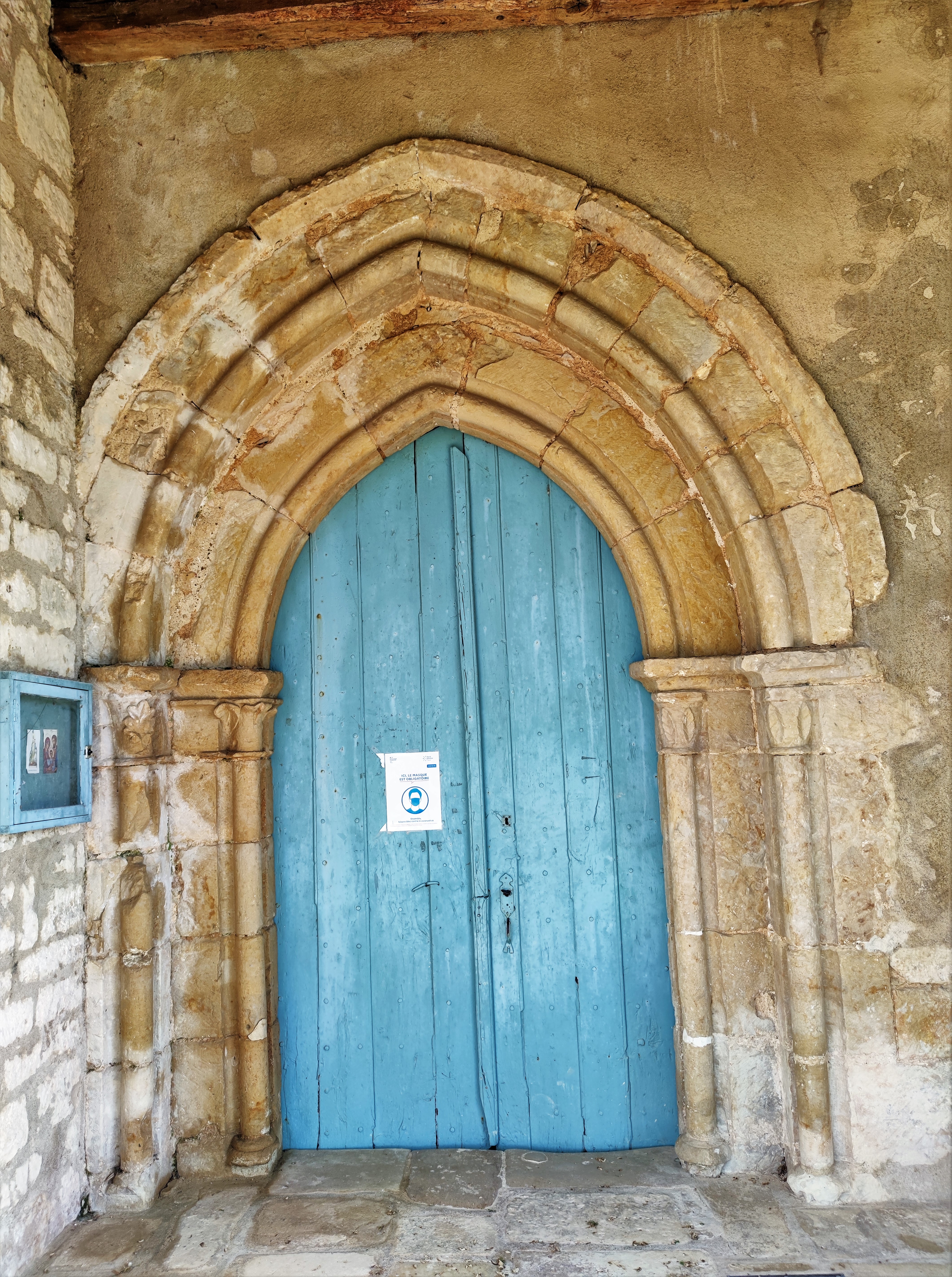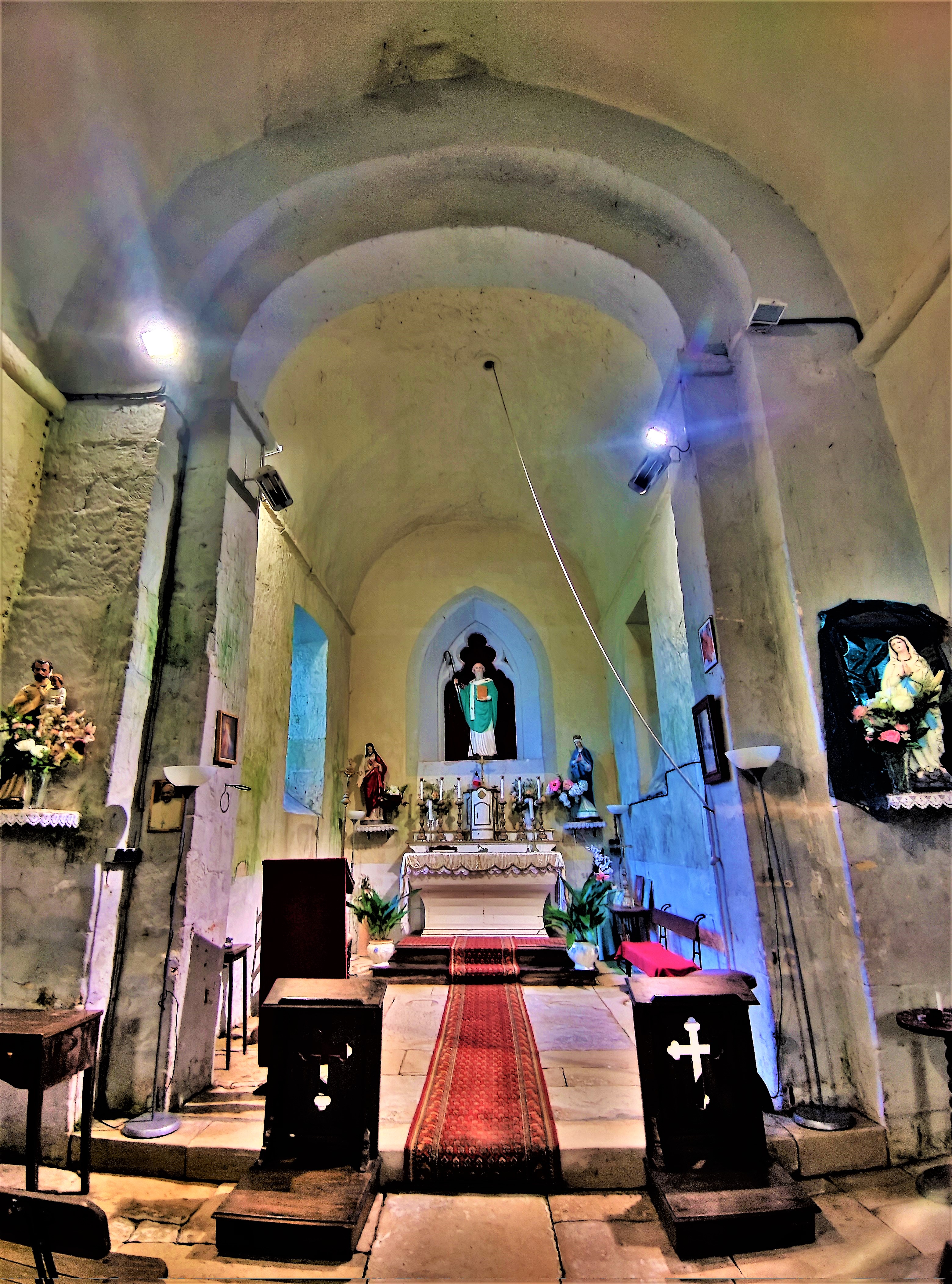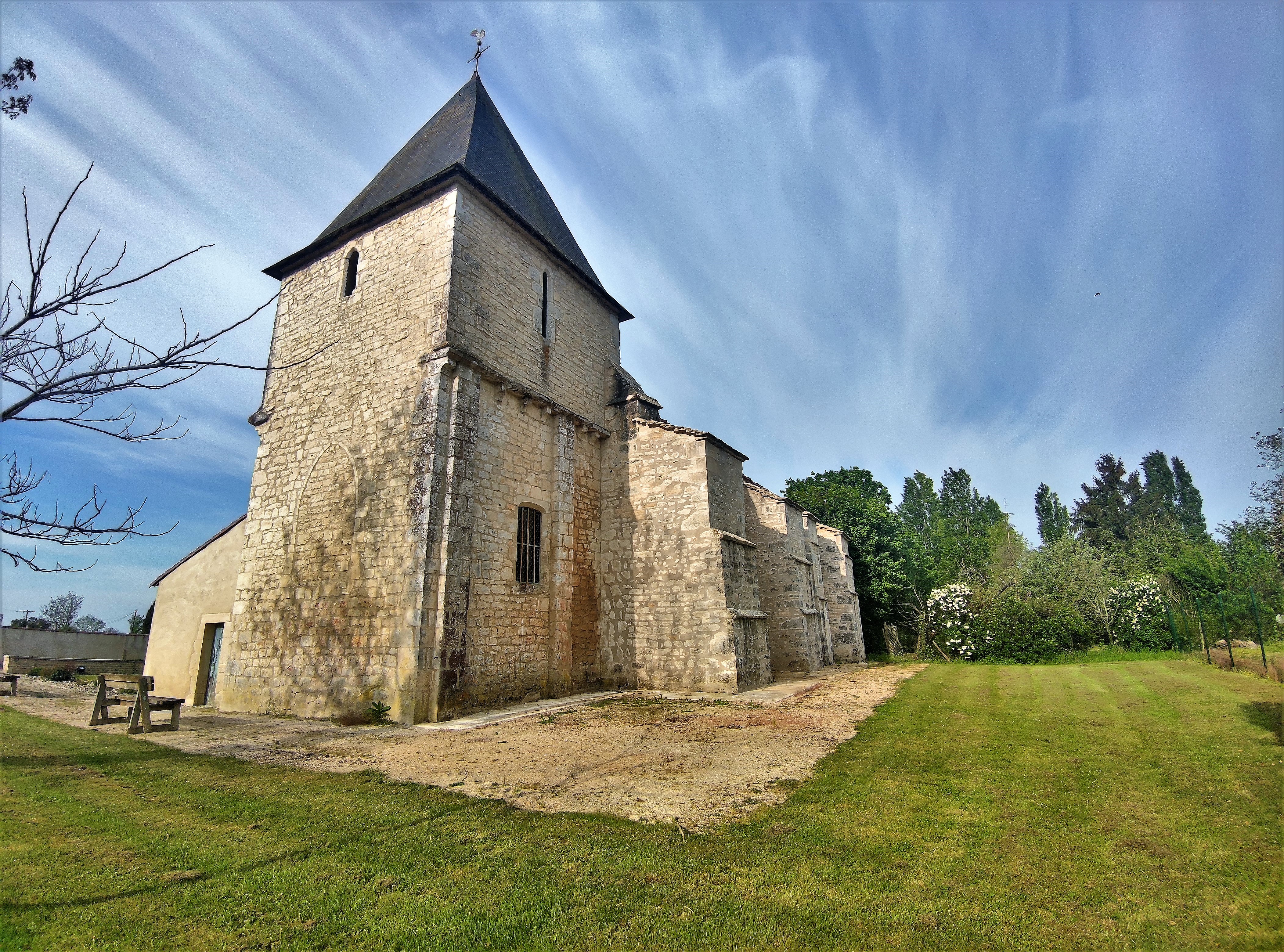 Une église du 13ème siècle, on pourrait la croire plus ancienne tant son allure est romane. Les énormes contreforts lui ont permis de traverser les 8 siècles de son existence. Incendiée pendant les guerres de religions, elle bénéficia de diverses campagnes de restaurations aux 17ème, 18ème, 19ème, et 20ème siècles. Les ouvertures Est (baie gothique au chevet) et Ouest (portail) ainsi que les petites ouvertures du mur Sud ont été maçonnées. L'église s'en retrouve assombrie. À l'intérieur, la voûte en berceau, les arcs doubleaux, les arcatures aveugles des murs de la nef, présentent des courbures à peine brisées, on est dans l'esprit roman. Les extérieurs ont été organisés par la commune en 2015 pour une mise en valeur de cette église parfaitement charmante. Il faut prendre les clés à la mairie située à côté. On m'y a conseillé la visite de la minuscule chapelle Saint-Pierre, en mauvais état mais qui témoigne de temps beaucoup plus catholiques.