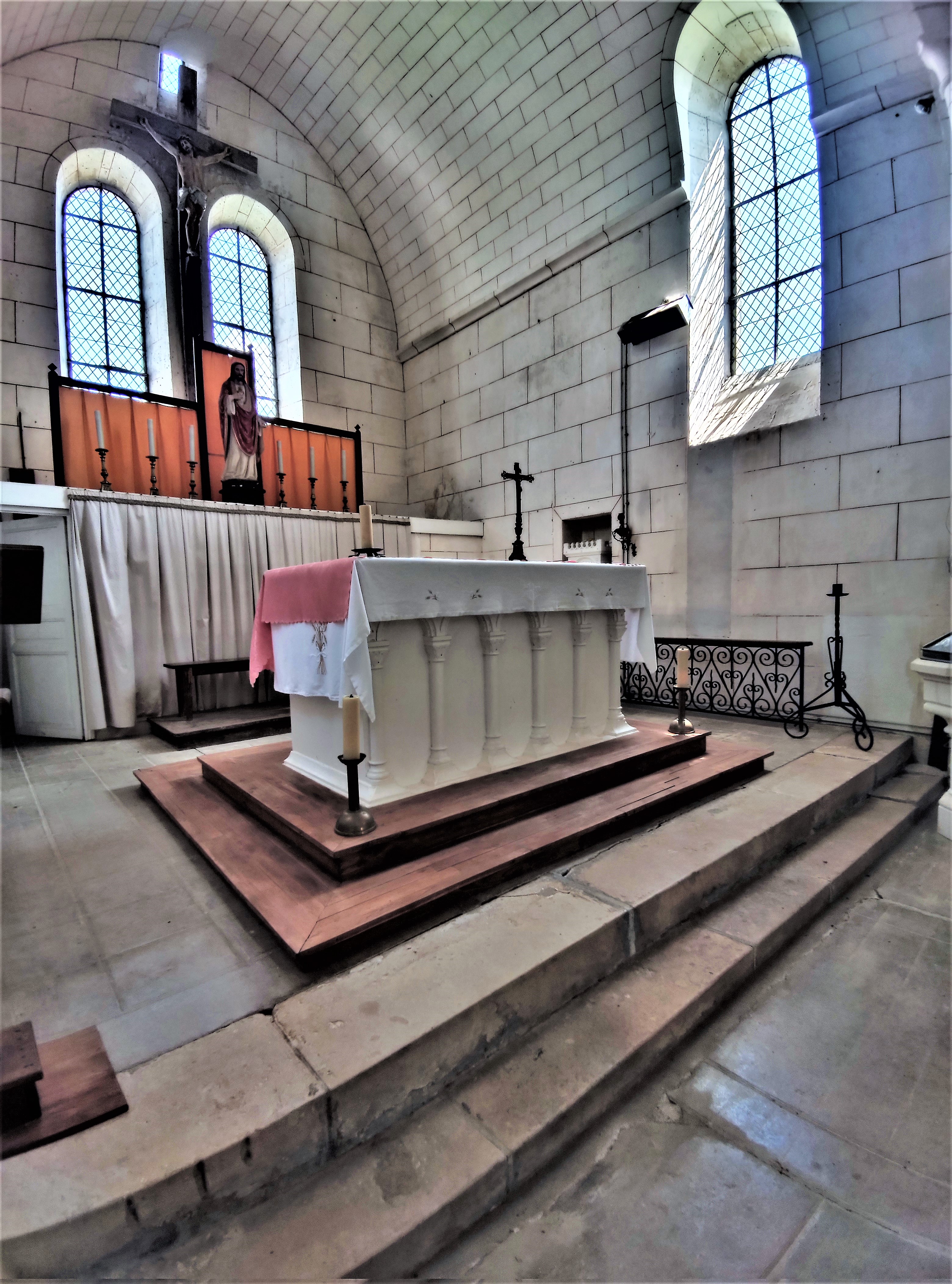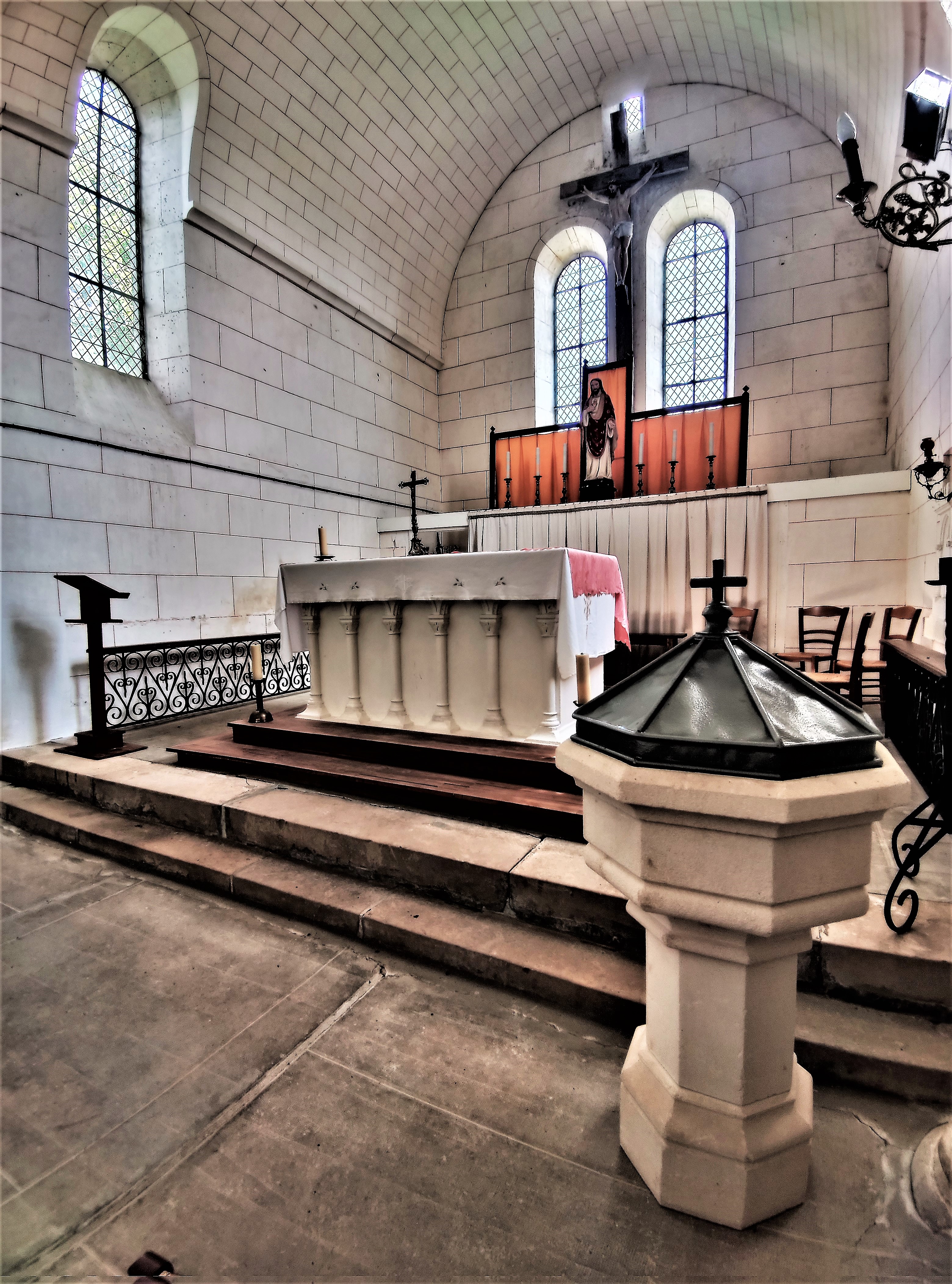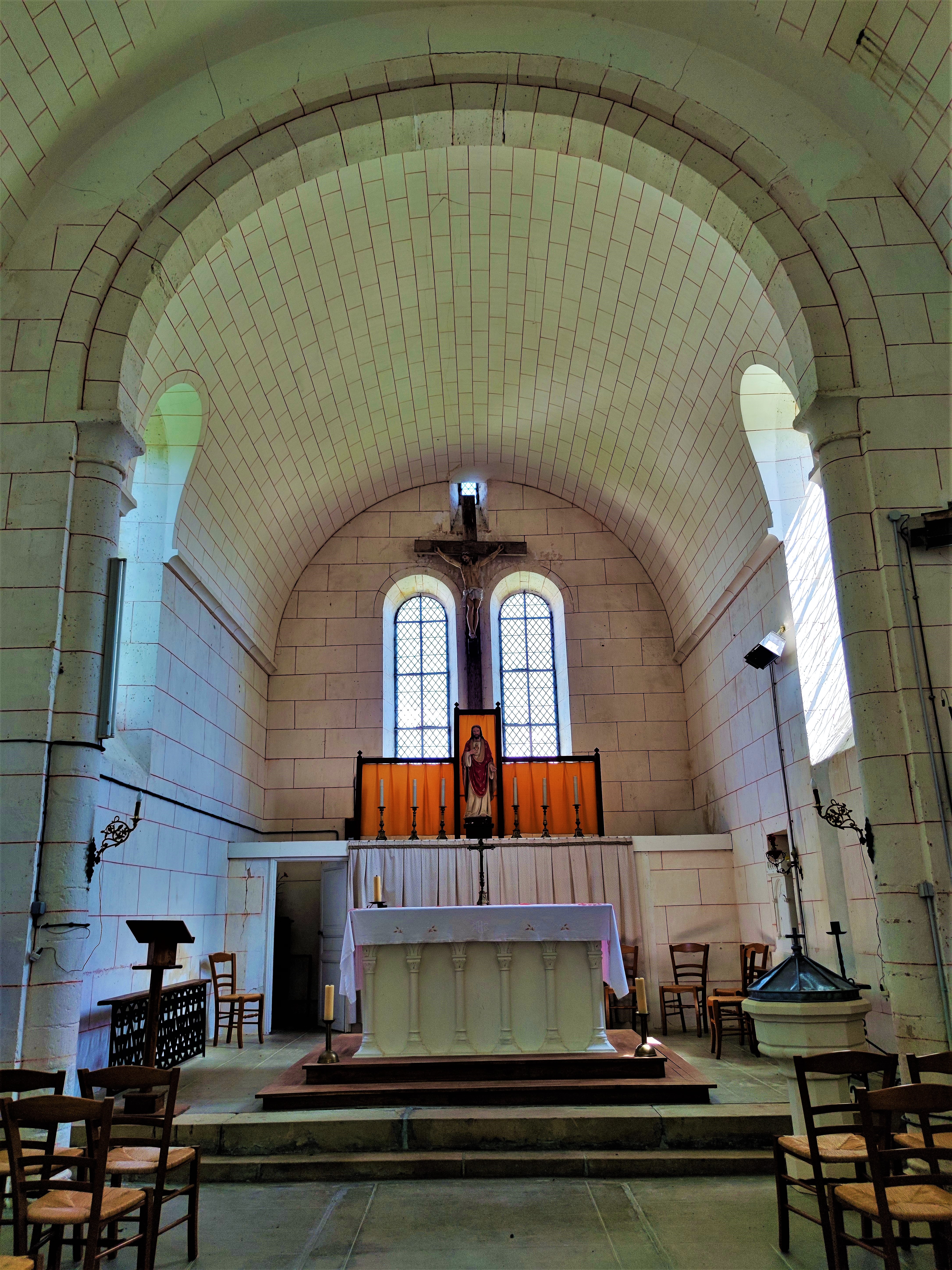 Lieu de culte chrétien avéré depuis le 8ème siècle, c'est pour moi une raison de visiter cette église Saint-Hilaire. Il existait une église à cet endroit du temps de Charlemagne, ce dernier en ordonna le don avec le domaine de Suirim ou Suirin à l'abbaye de Charroux. Au même endroit, on reconstruisit une seconde église romane au 12ème siècle, qui, mal entretenue, devint une ruine inutilisable pour le culte au 19ème siècle. Il fallut alors reconstruire. Sur les mêmes fondations, en ayant réemployé les matériaux exploitables, on édifia une nouvelle église, des décors sculptés et des colonnes romanes sont ainsi visibles dans l'église actuelle. Vitraux transparents et voûtes blanches en berceau de lattis plâtrés font de cette église un édifice particulièrement lumineux. Église accueillante, j'ai trouvé qu'elle n'invitait pas à l'intériorité. Construite sur une élévation, elle domine la cité ; pour la visiter, il faut s'adresser à la mairie qui contacte une paroissienne. A cette occasion, je remercie la dame qui est venue m'ouvrir ce 2 mai 2022.