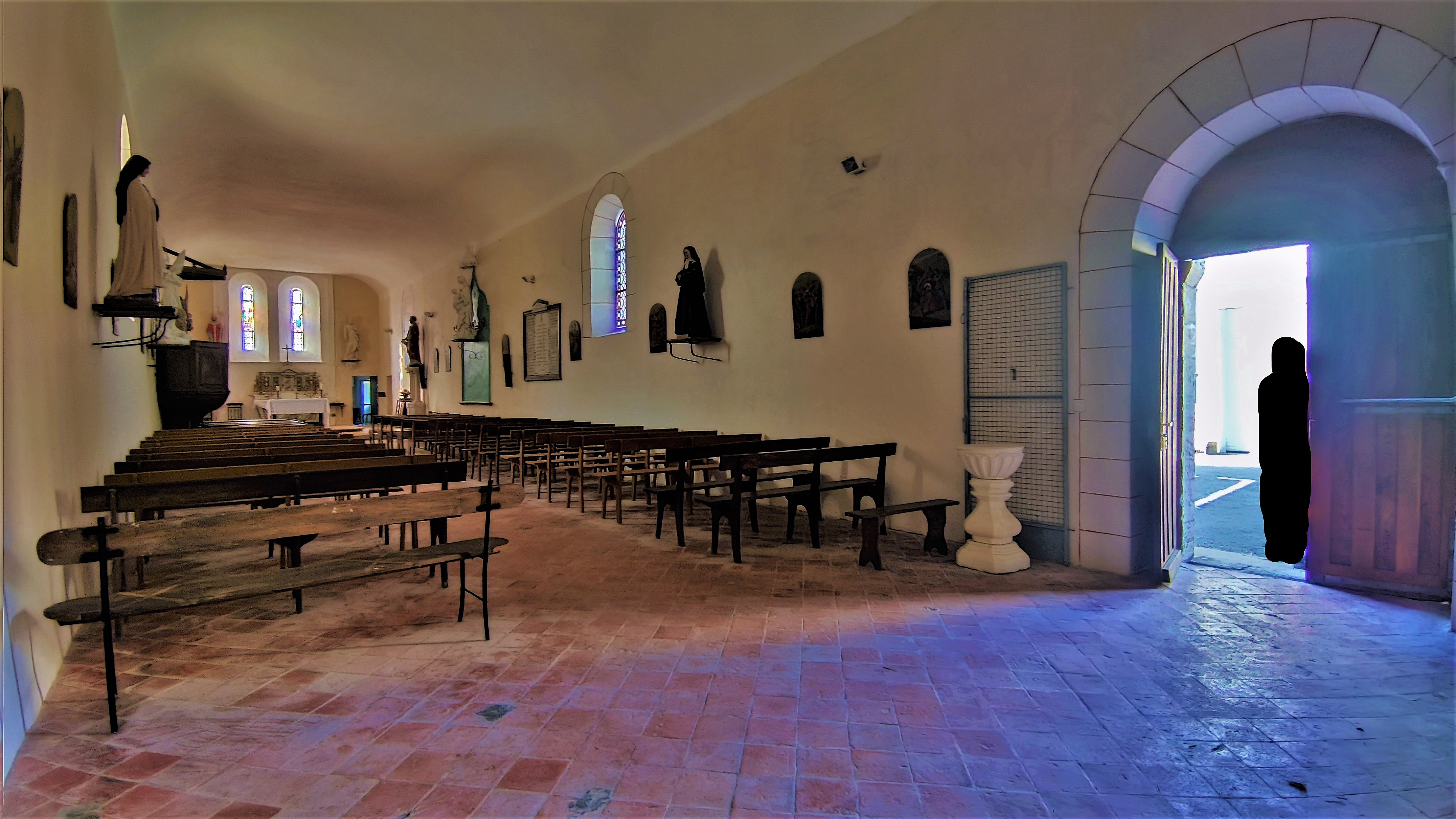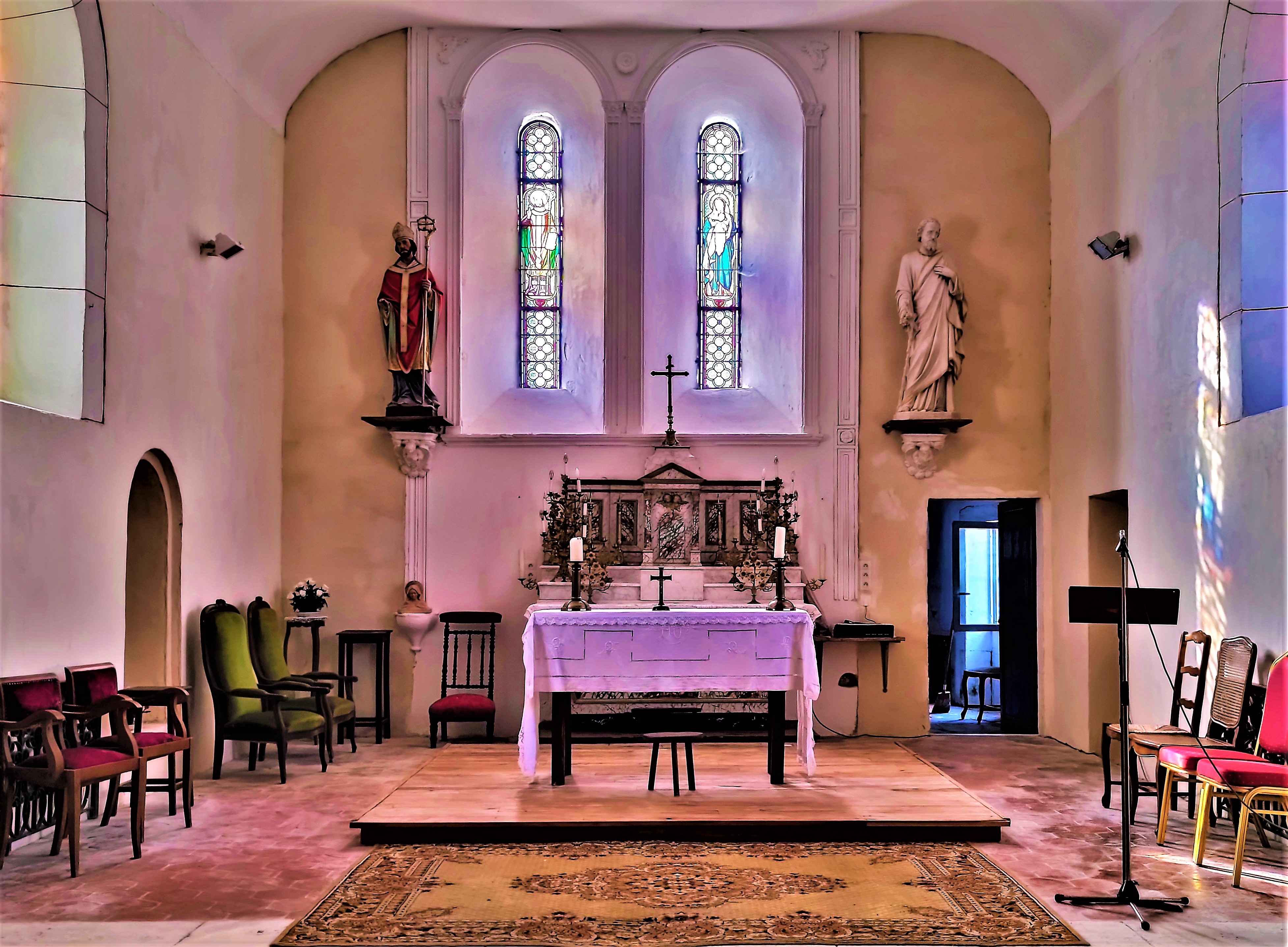 Pour y entrer, il faut s'adresser à la mairie ou l'accueil fut pour moi courtois et efficient. Aujourd'hui église paroissiale, cet édifice aux origines sans doute médiévales (≈ 12ème siècle), serait l'ancienne chapelle castrale. Souvent modifiée, cette église est mal mise en valeur, entourée de maisons très proches. Bien entretenue et bien tenue, c'est une église accueillante dans sa grande simplicité. Ses dimensions modestes créent une intimité qui rassemble. Pour y entrer, il faut s'adresser à la mairie ou l'accueil fut pour moi courtois et efficient. Je conseille la visite, sur la même commune, de la chapelle de la mascarine, située au fond des bois mais accessible en voiture. En prolongeant le circuit vers la Dordogne toute proche, de nombreuses églises médiévales sont à découvrir.