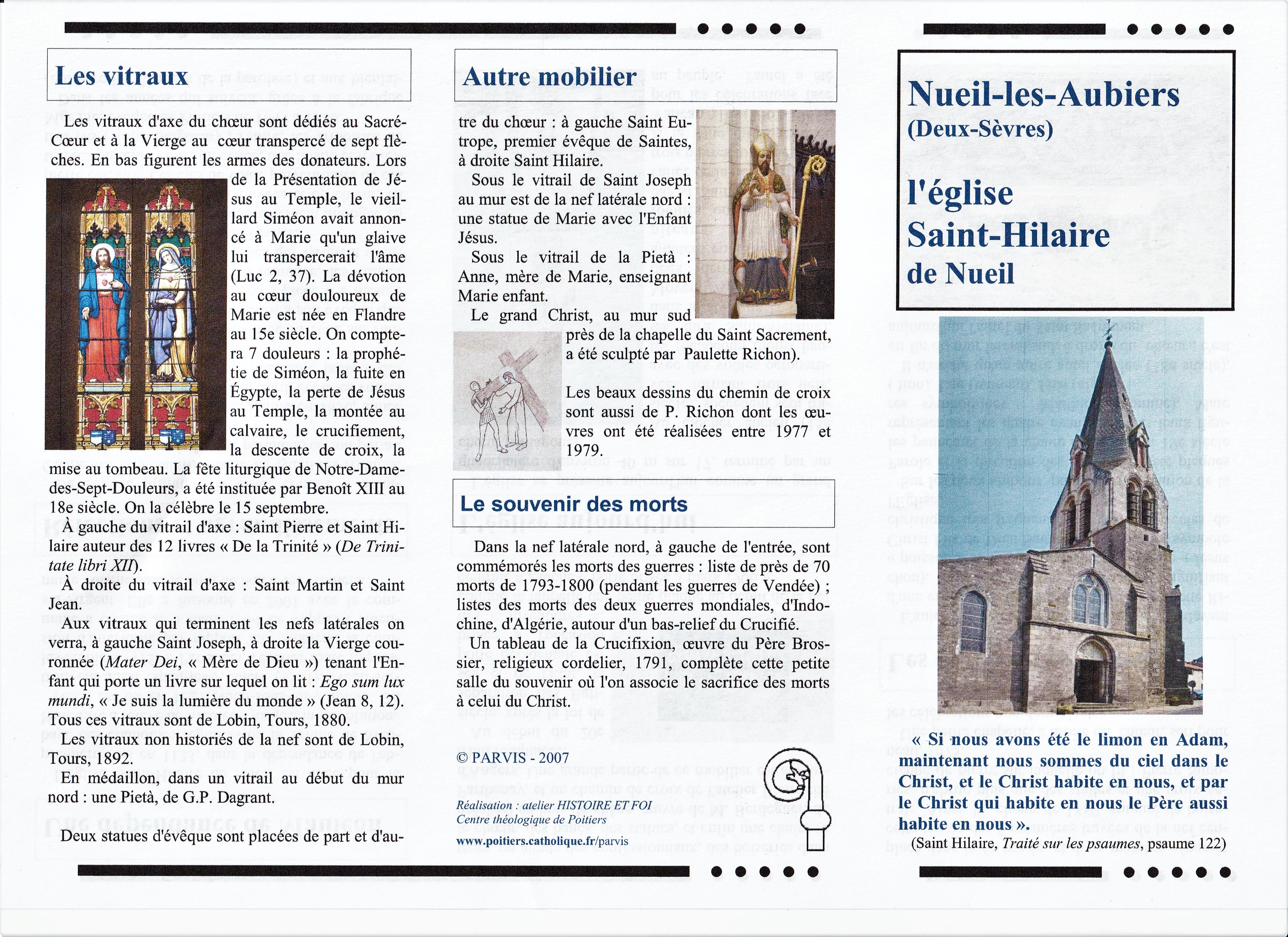 Une très belle église, des origines du 12è, une reconstruction au 15è et un agrandissement au 19è. Superbe église gothique et néo-gothique éclairée par des vitraux de l'atelier Lobin de Tours. Même les ajouts architecturaux du 19è ont bénéficié de décors sculptés, siècle où l'on construisit les voûtes en pierres, chose peu courante à cette époque, familière des voûtes en briques. Dans ce département des Deux-Sèvres, Vendée historique, les pratiques religieuses sont encore très vivantes ; catholiques au Nord, protestants au Sud, il existe de nombreuses associations religieuses de toute obédience, même la Petite Église des Deux-Sèvres, Église anticoncordataire. Le patrimoine religieux bâti est très riche, de toutes époques, préservé avec une grande volonté de la part des citoyens, des paroissiens et des collectivités. Le découvrir permet d'aborder mille ans d'histoire ou plus, éclairage du passé qui permet de mieux appréhender le présent.