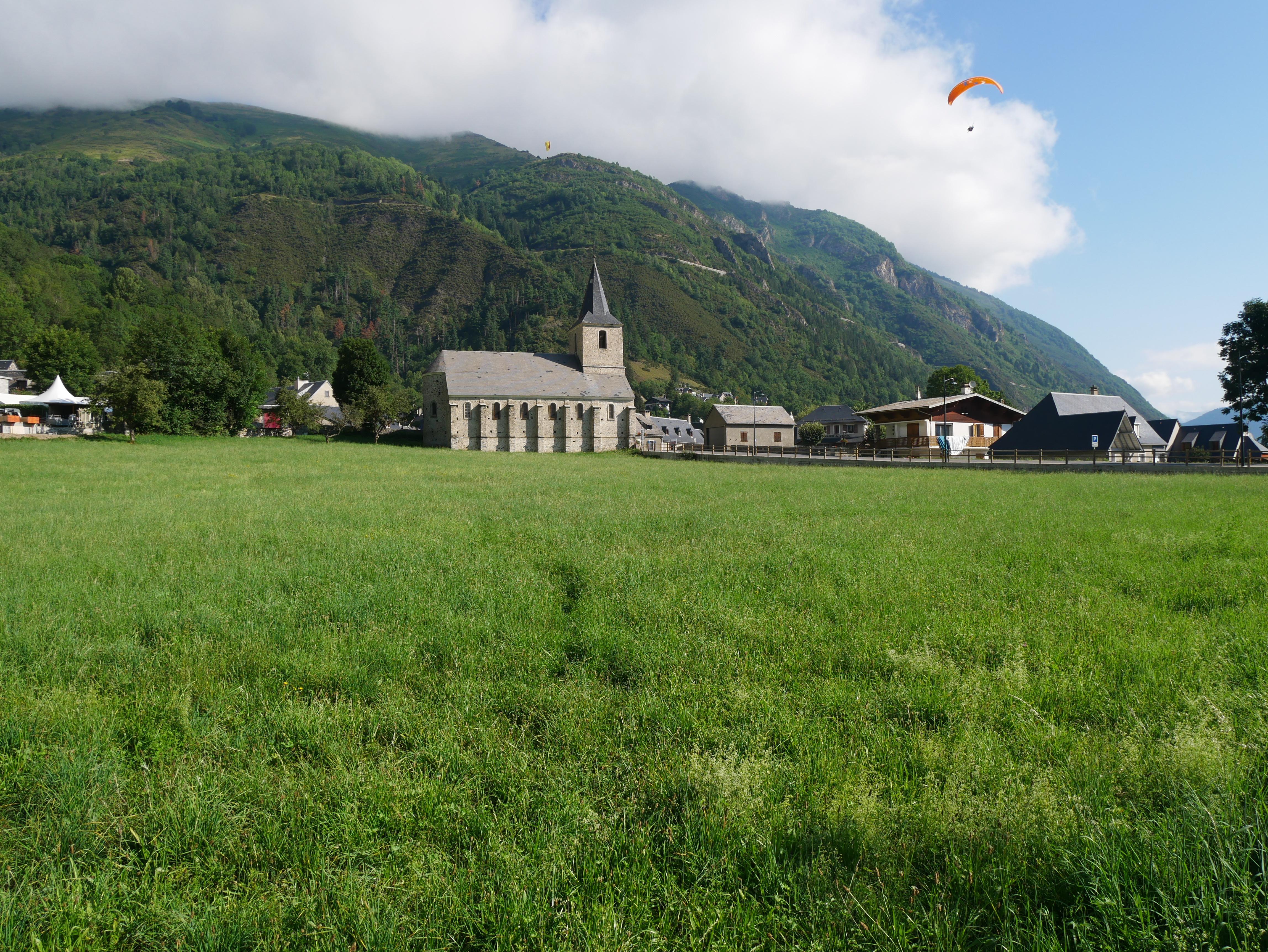 magnifique église d'architecture pyrénéenne, la prairie derrière est superbe aussi