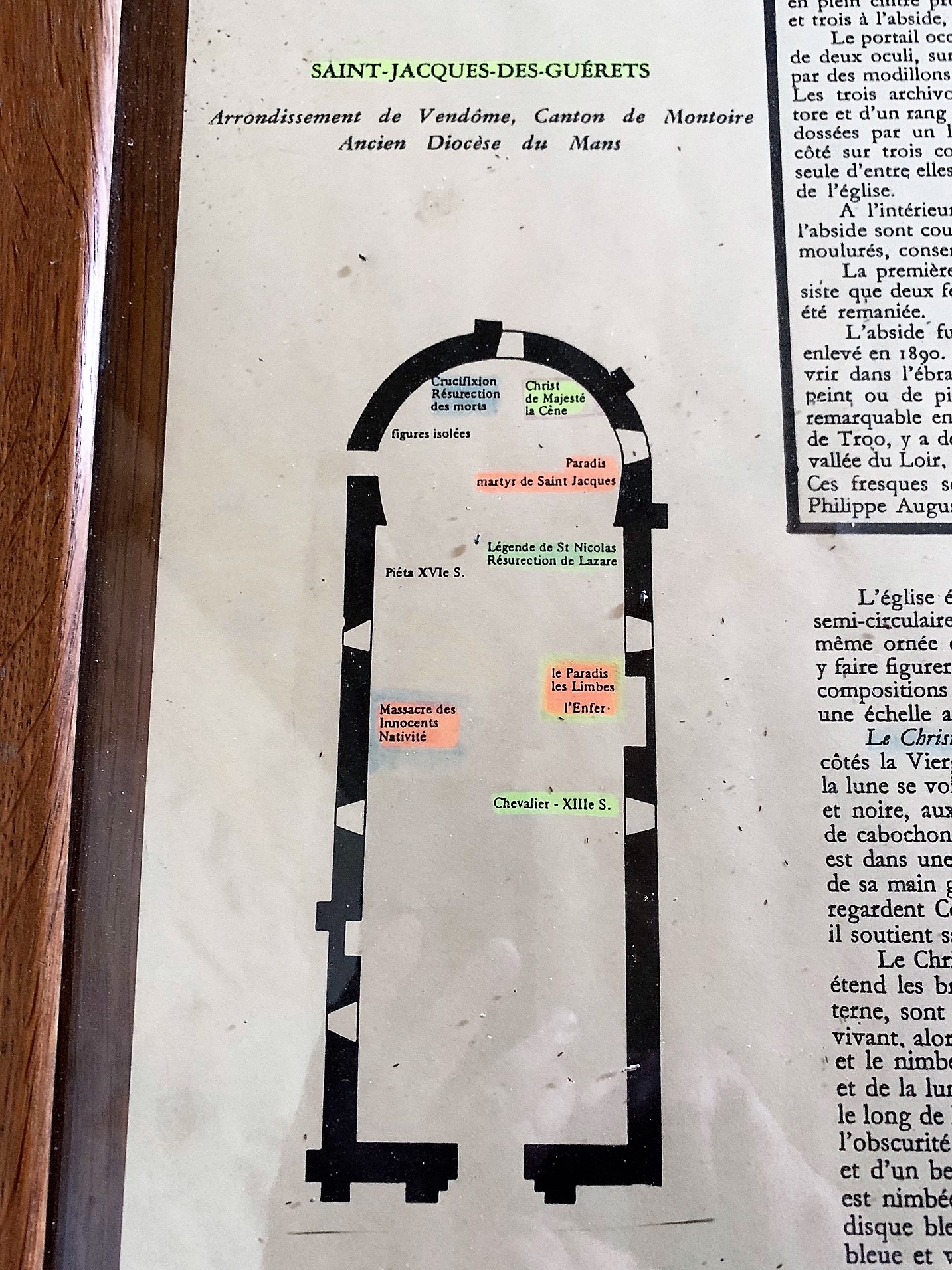 Une église du 12ème siècle, dont les murs intérieurs sont presque entièrement recouvert de fresques du 13ème et 15ème siècles. Placée au milieu du cimetière, classée en 1955, elle est indiscutablement authentique. Un plaisir pour les curieux ou les passionnés, les peintures sont en bon état, elles étaient recouvertes et donc protégées par un badigeon, il y a encore peu de temps. La région est magnifique, je l'avais découvert cet hiver, pluies torrentielles et inondations lui donnaient quelques aspects inquiétants, je l'ai retrouvé paisible et ensoleillée en ce mois de juin 2020. Remarque : Troo et sa collégiale sont à proximité, c'est une autre merveille architecturale à découvrir.