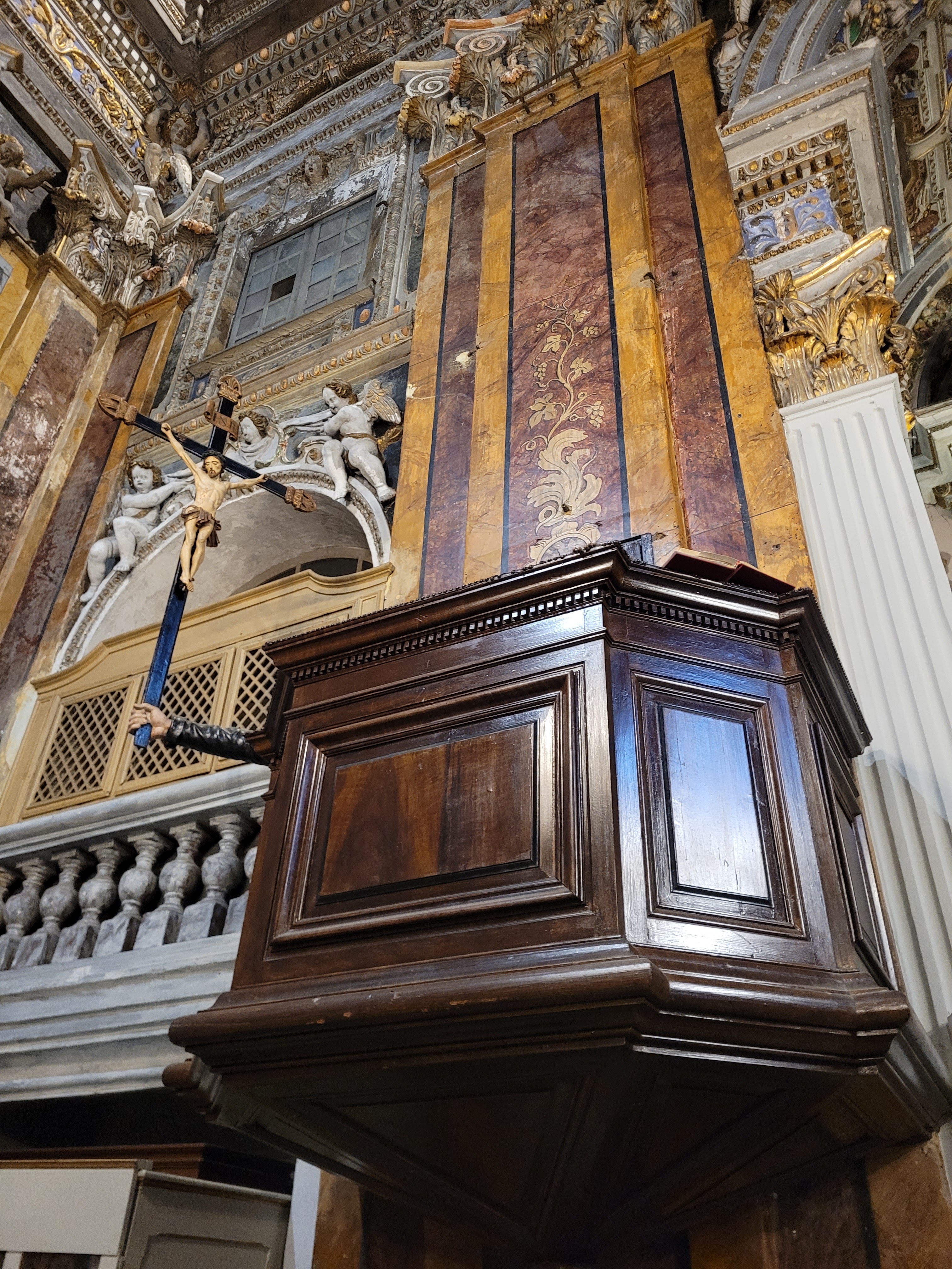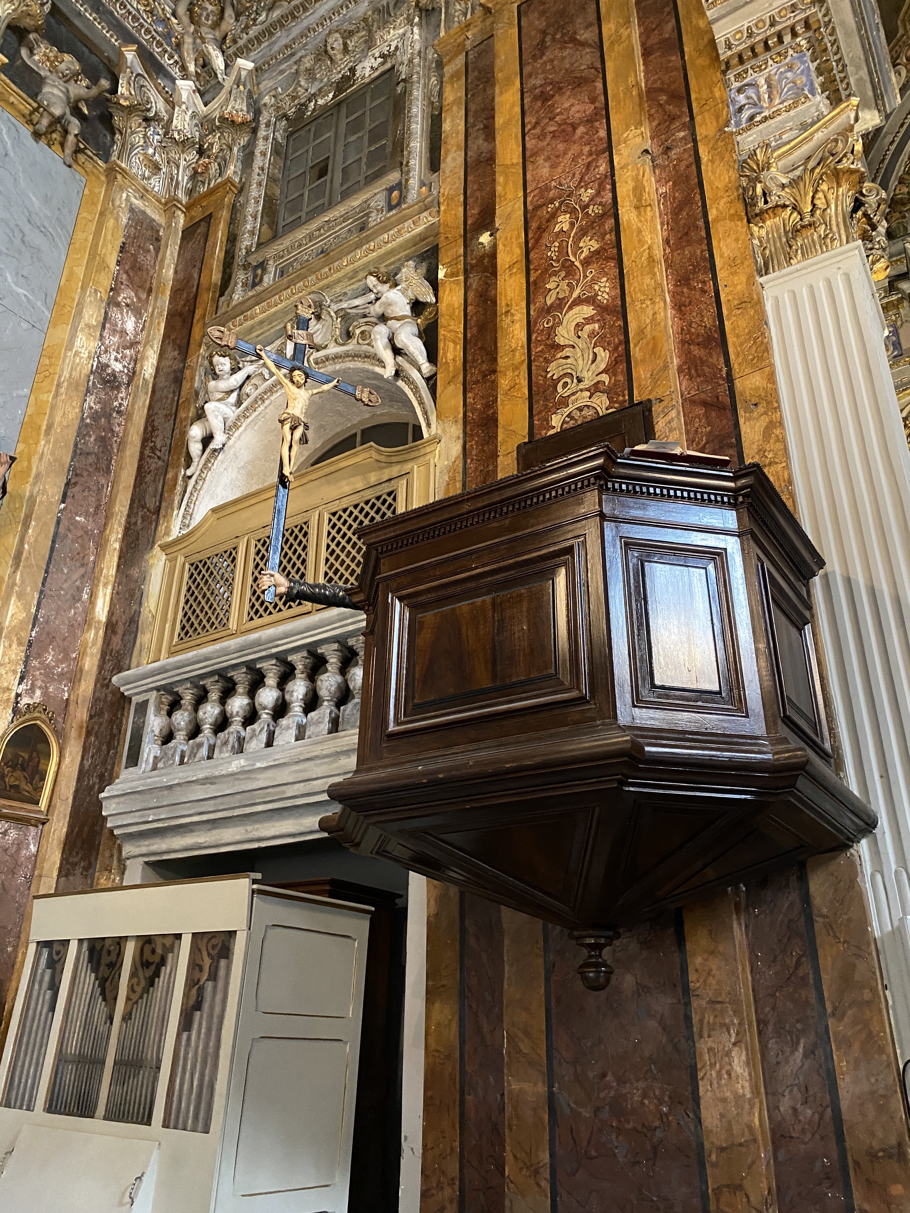 Une église avec un intérieur incroyablement beau et décoré. J'ai été très impressionné par la chaire avec une main tenant une croix.