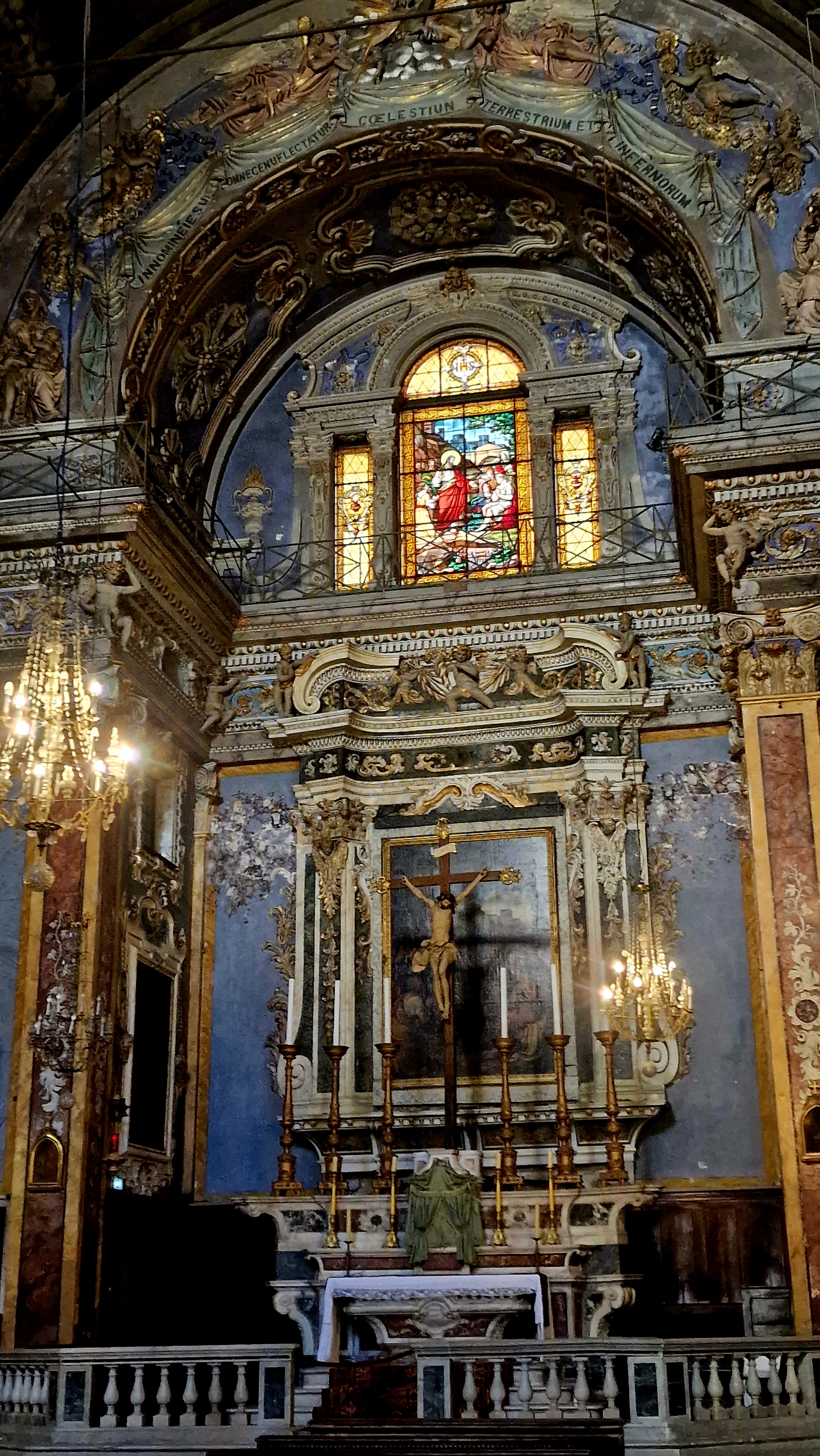 La couleur bleue des murs et les magnifiques fresques et reliefs sculptés du style baroque donnent au lieu une aura mystérieuse.