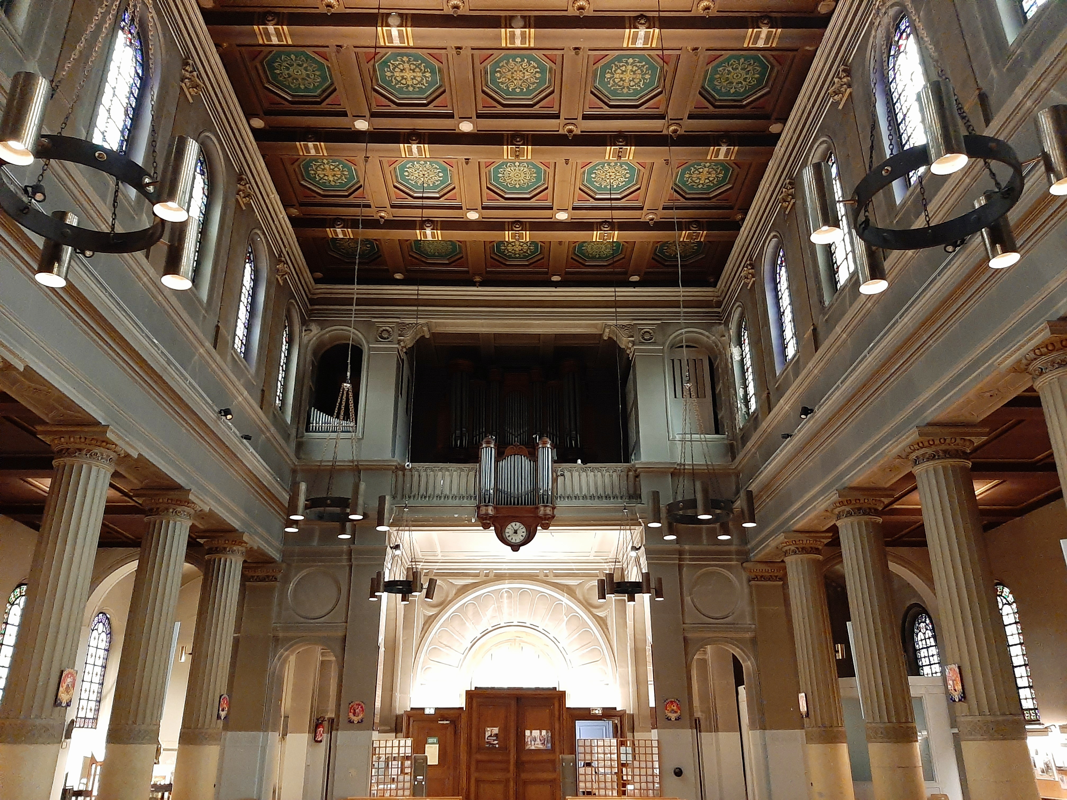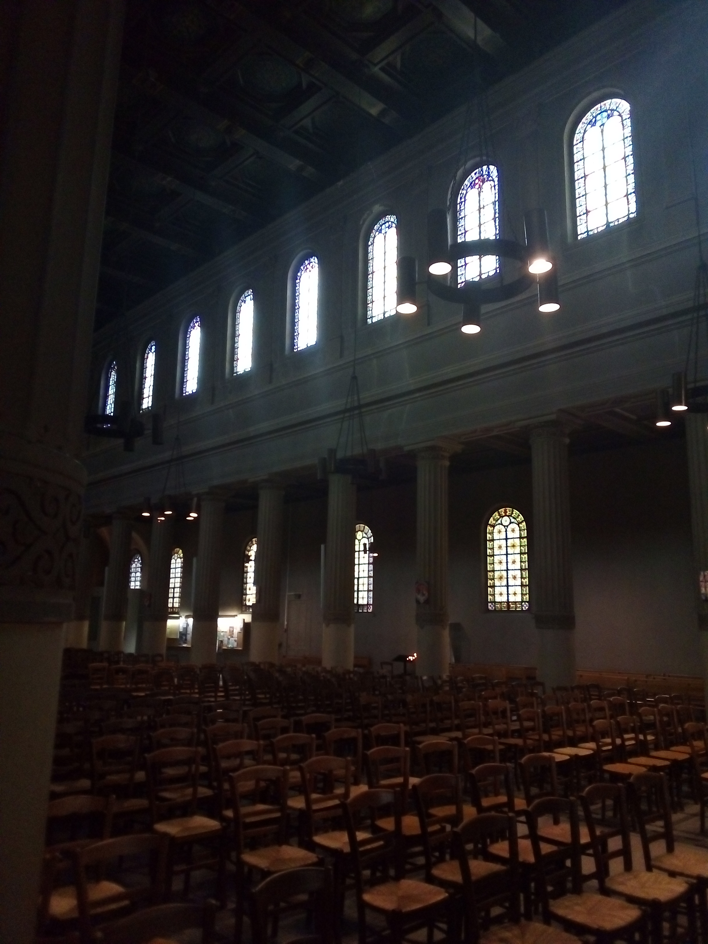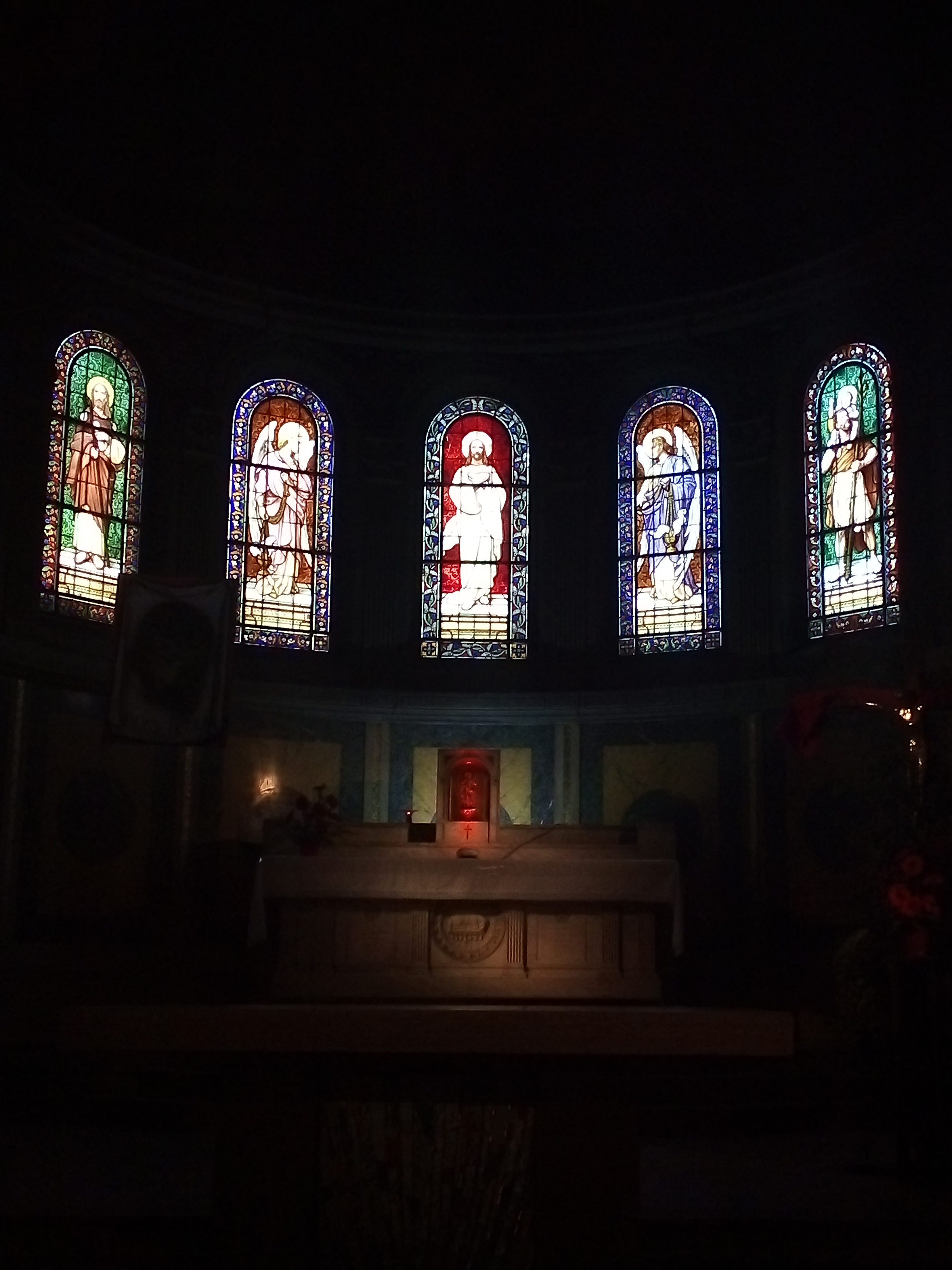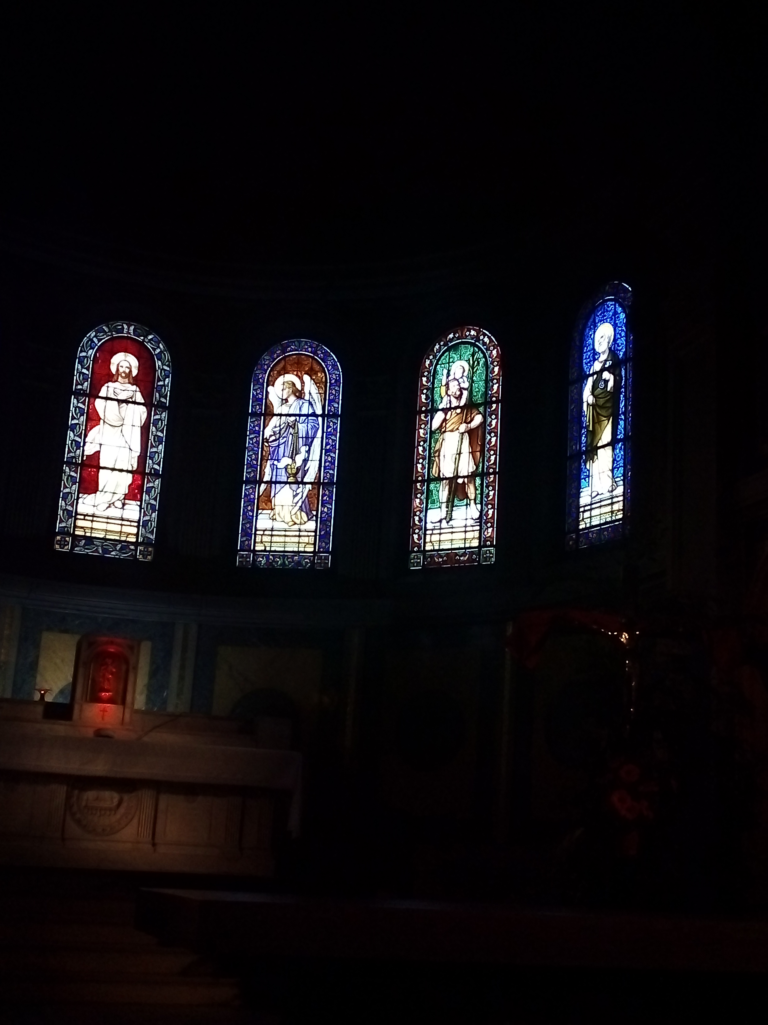 De superbes vitraux illuminent cette belle église au plafond peint. Sobriété du mobilier, recueillement possible. Horaires des messes affichés.