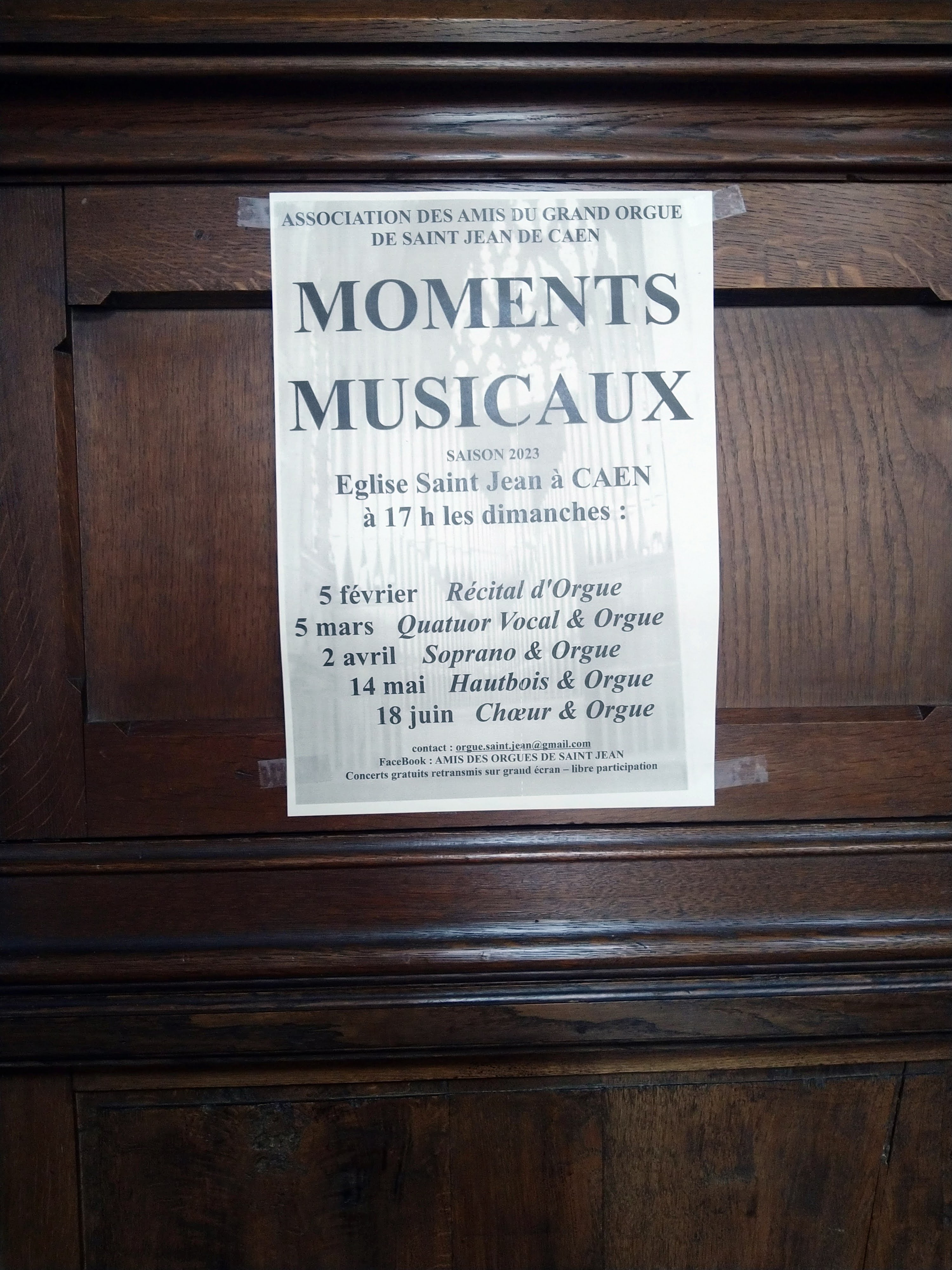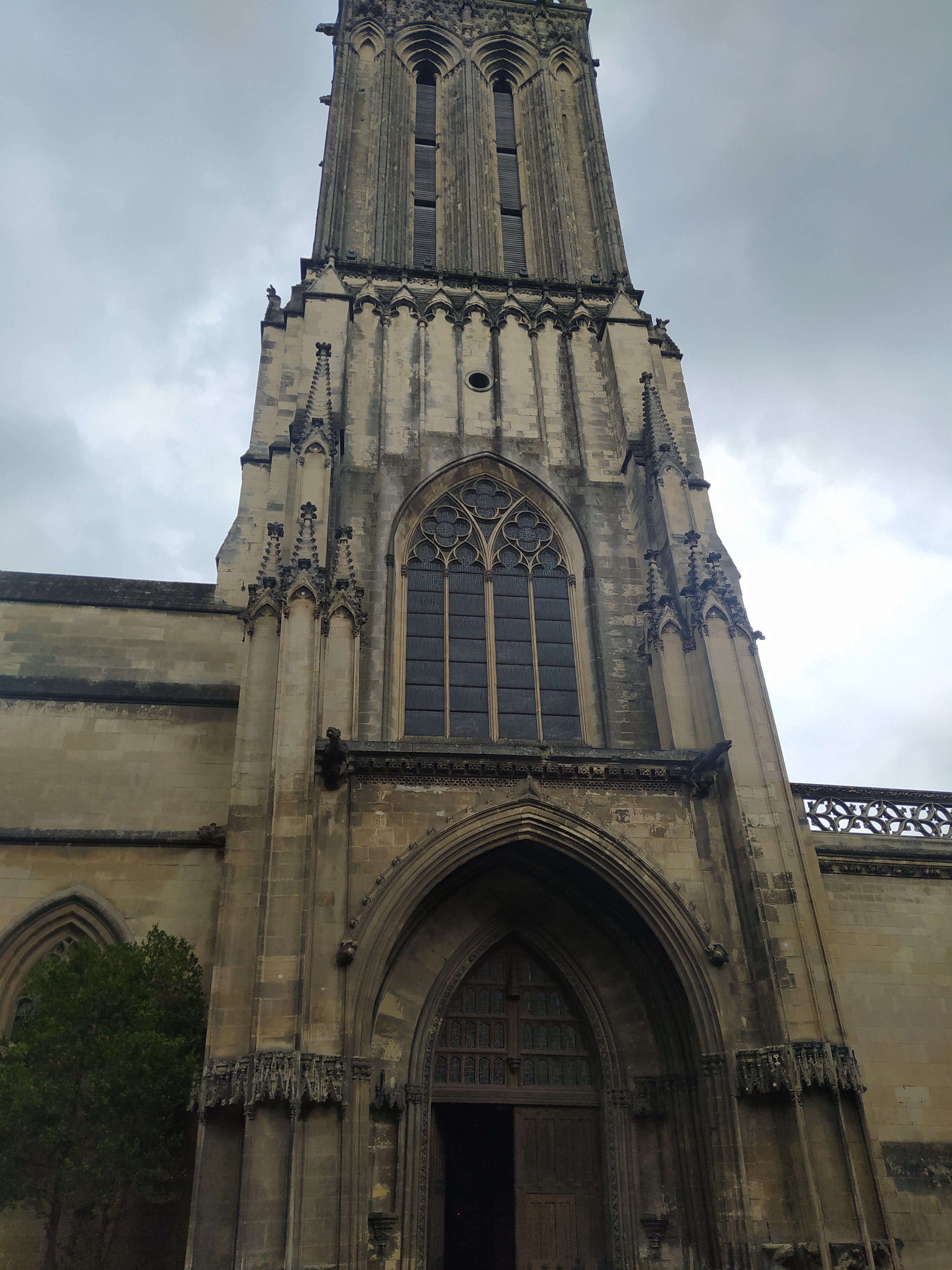 Église de Caen, surnommée l'église penchée en raison du mouvement des contours du porche et des murs latéraux très visible, construite en Pierre locale ( celle la même de westmister!) Un organiste u joue régulièrement. Bel édifice.