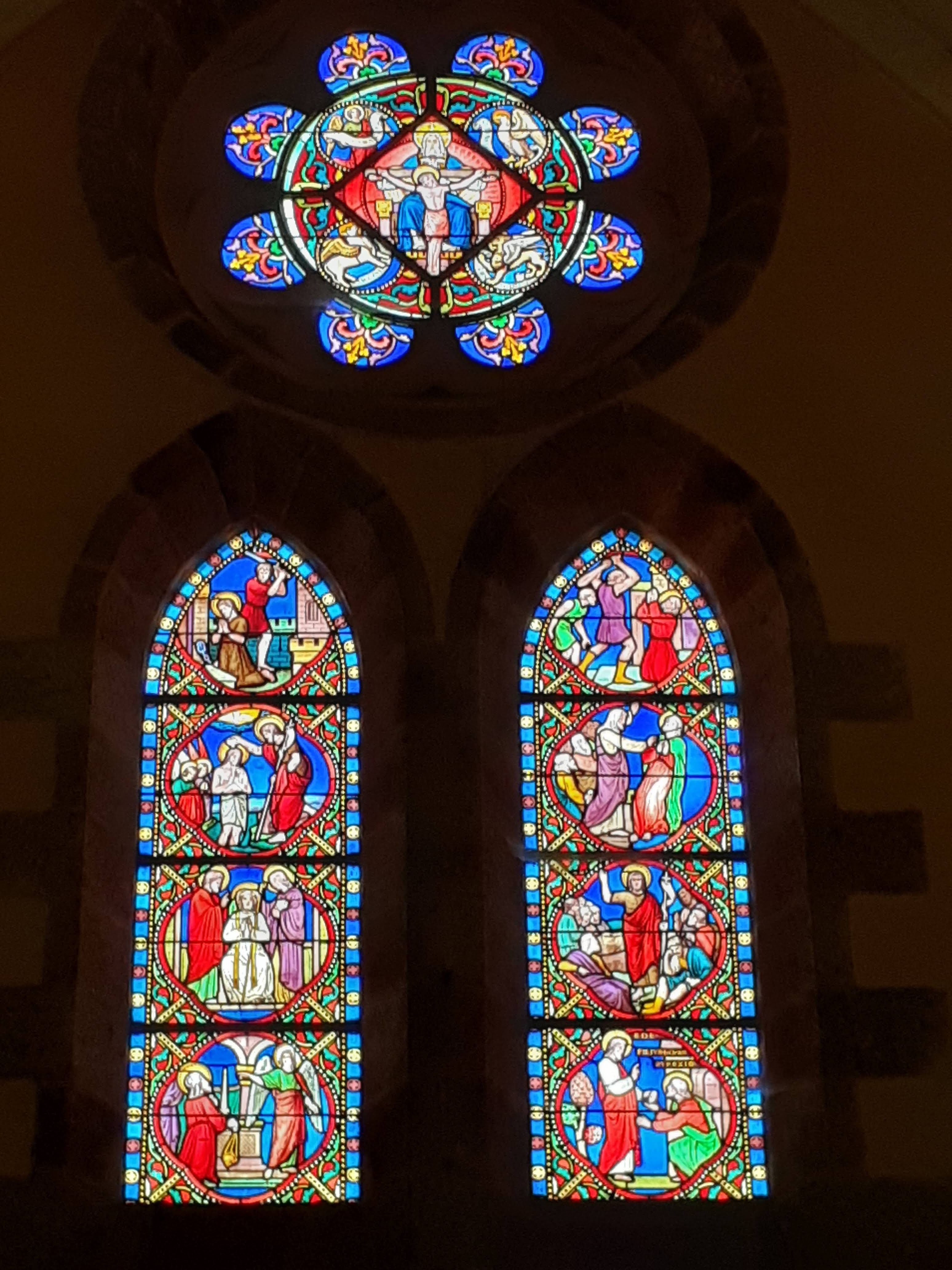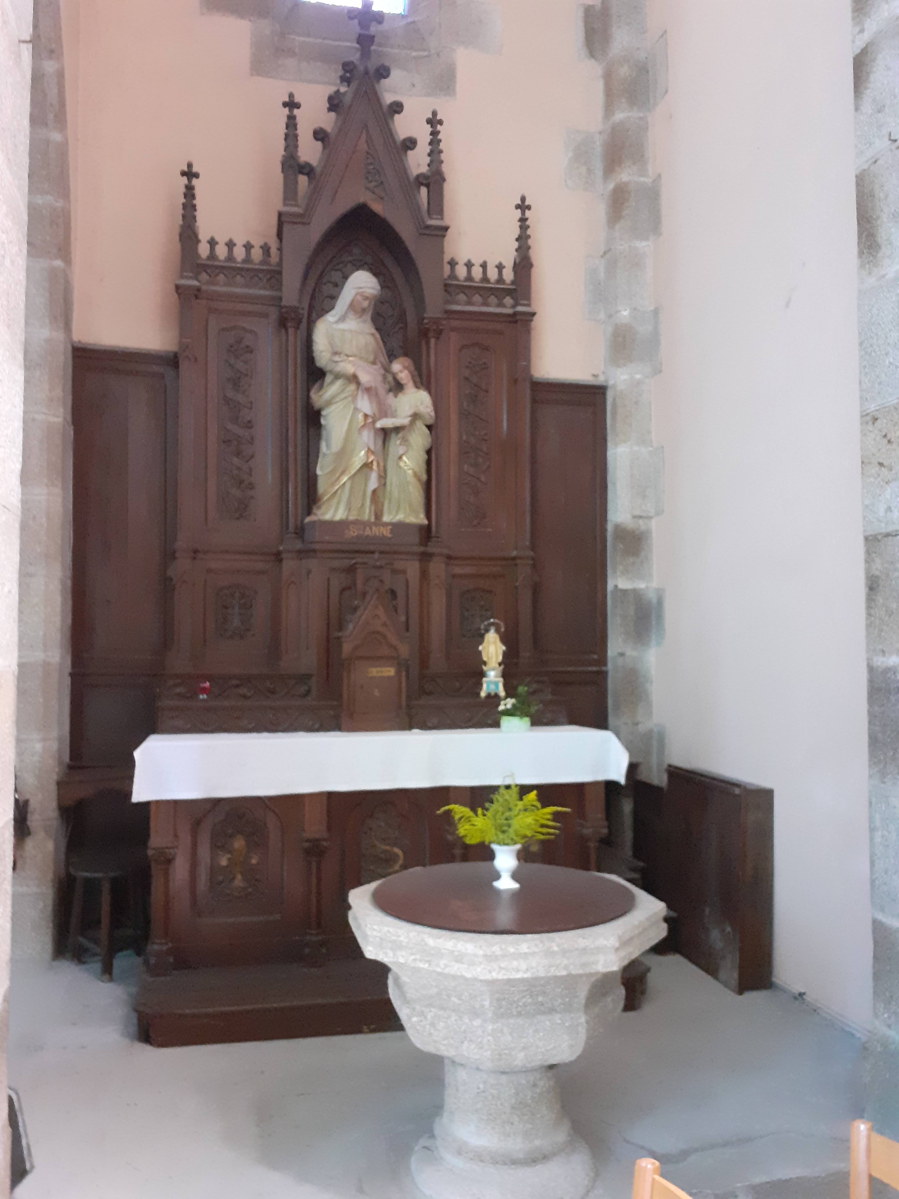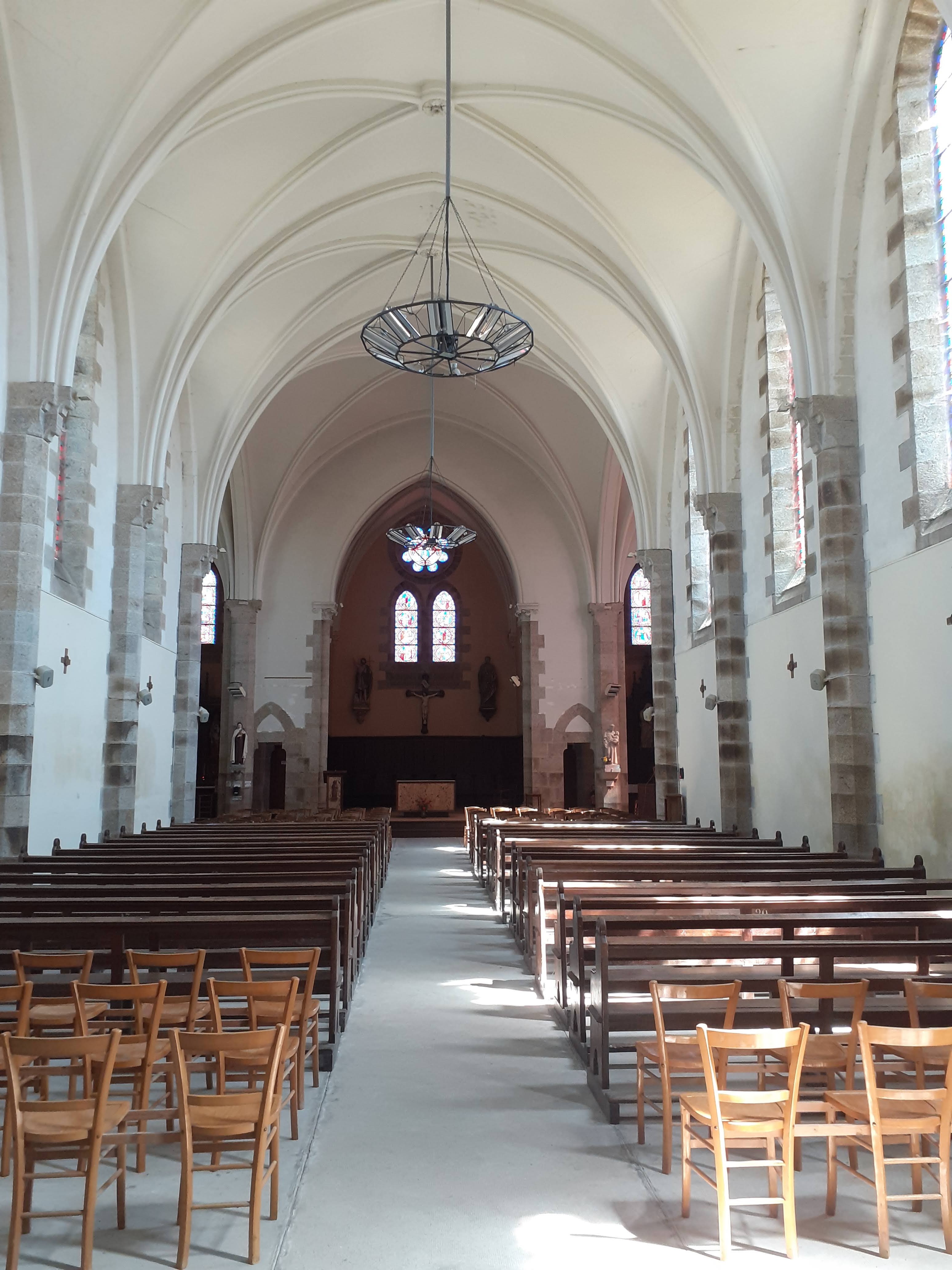 Banale, sans doute, comme la plupart de nos églises construites au XIX/XX ème siècle. Flèche, forme croix latine, grande nef et voilà. Elles n'ont pas en effet le charme de nos ptes églises typiques de Bretagne, mais bon, elles sont là.... Bon et bien, pas grand chose de trouvé sur cette église, elle pourrait avoir été construite dans les années 1850. Un intérieur clair, simple, 1 ou 2 jolis vitraux.