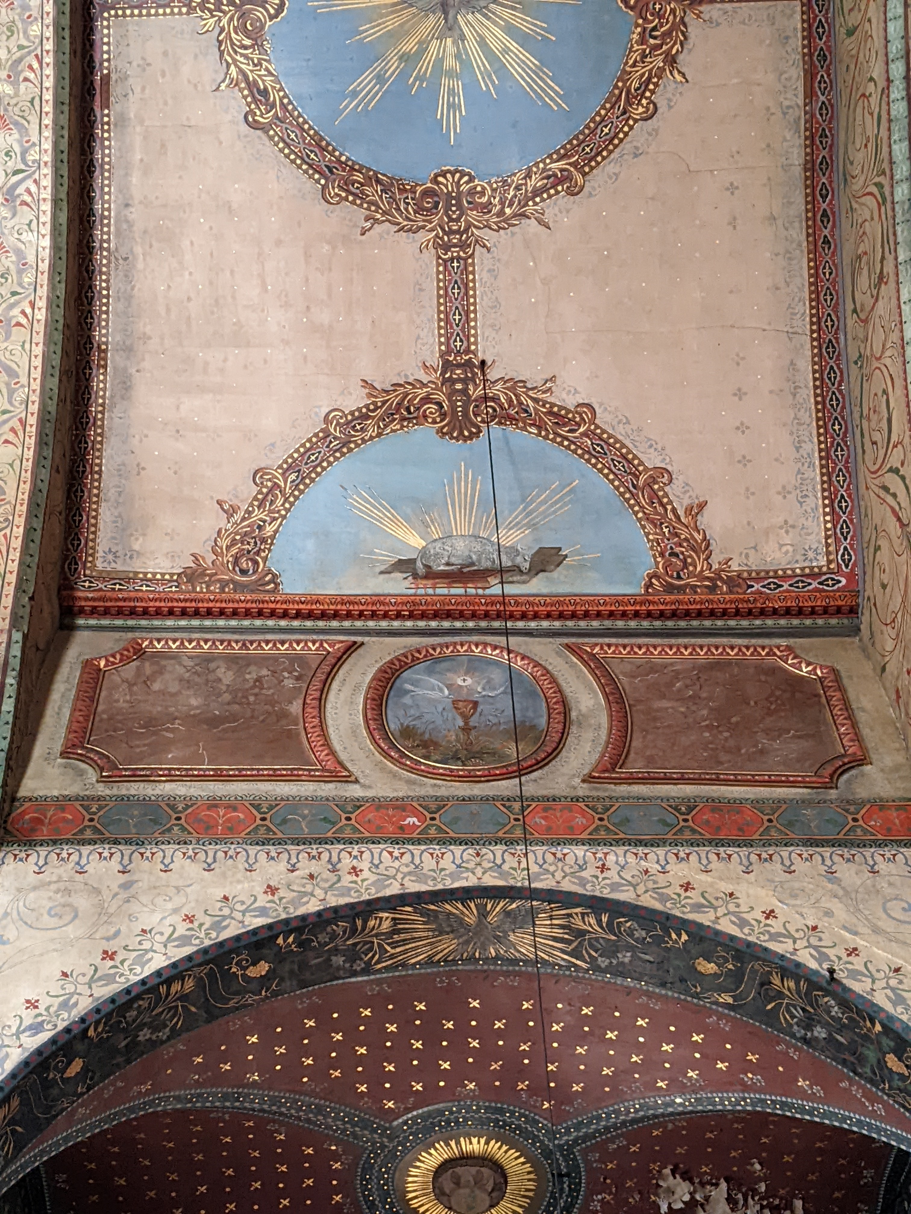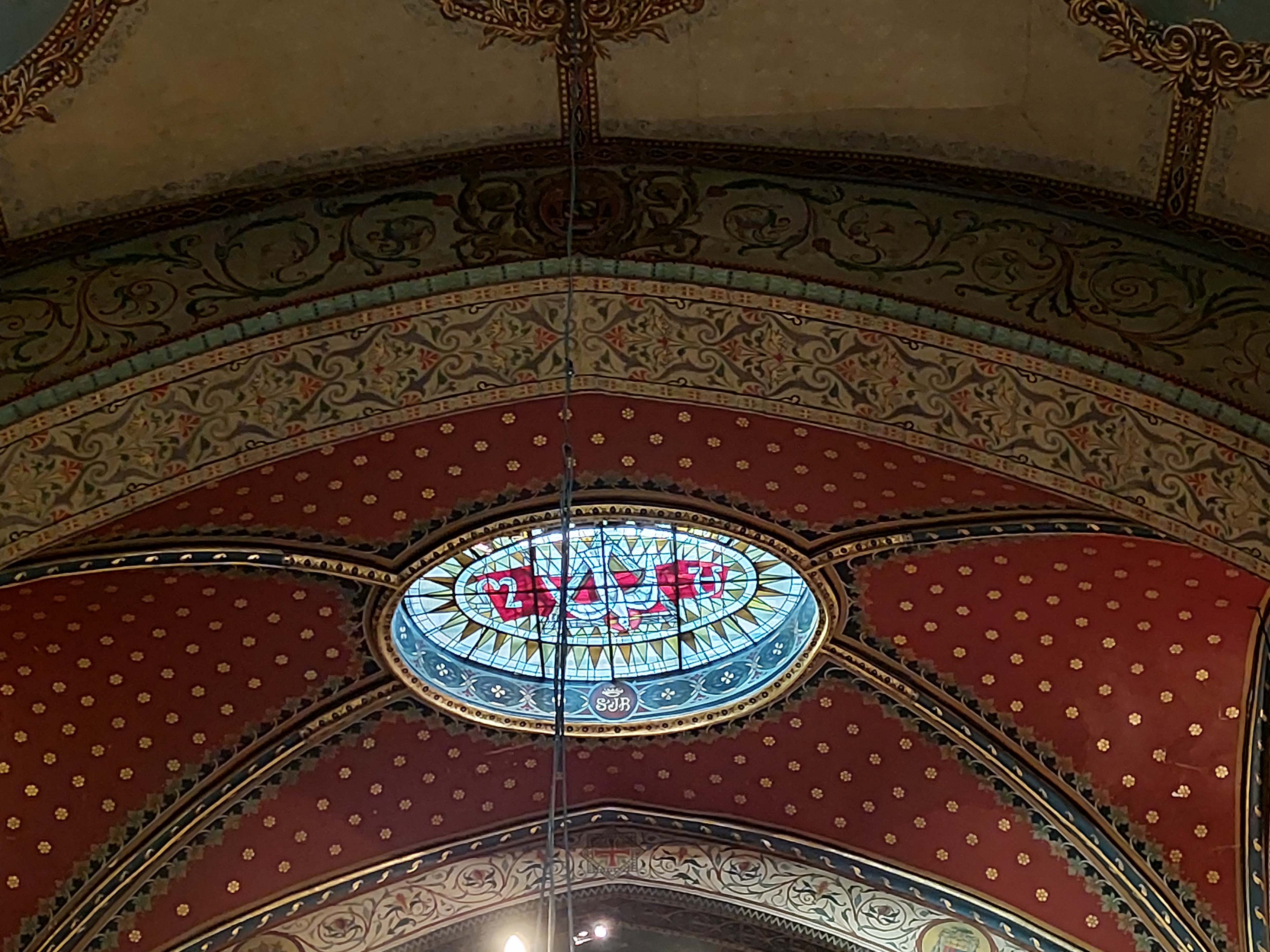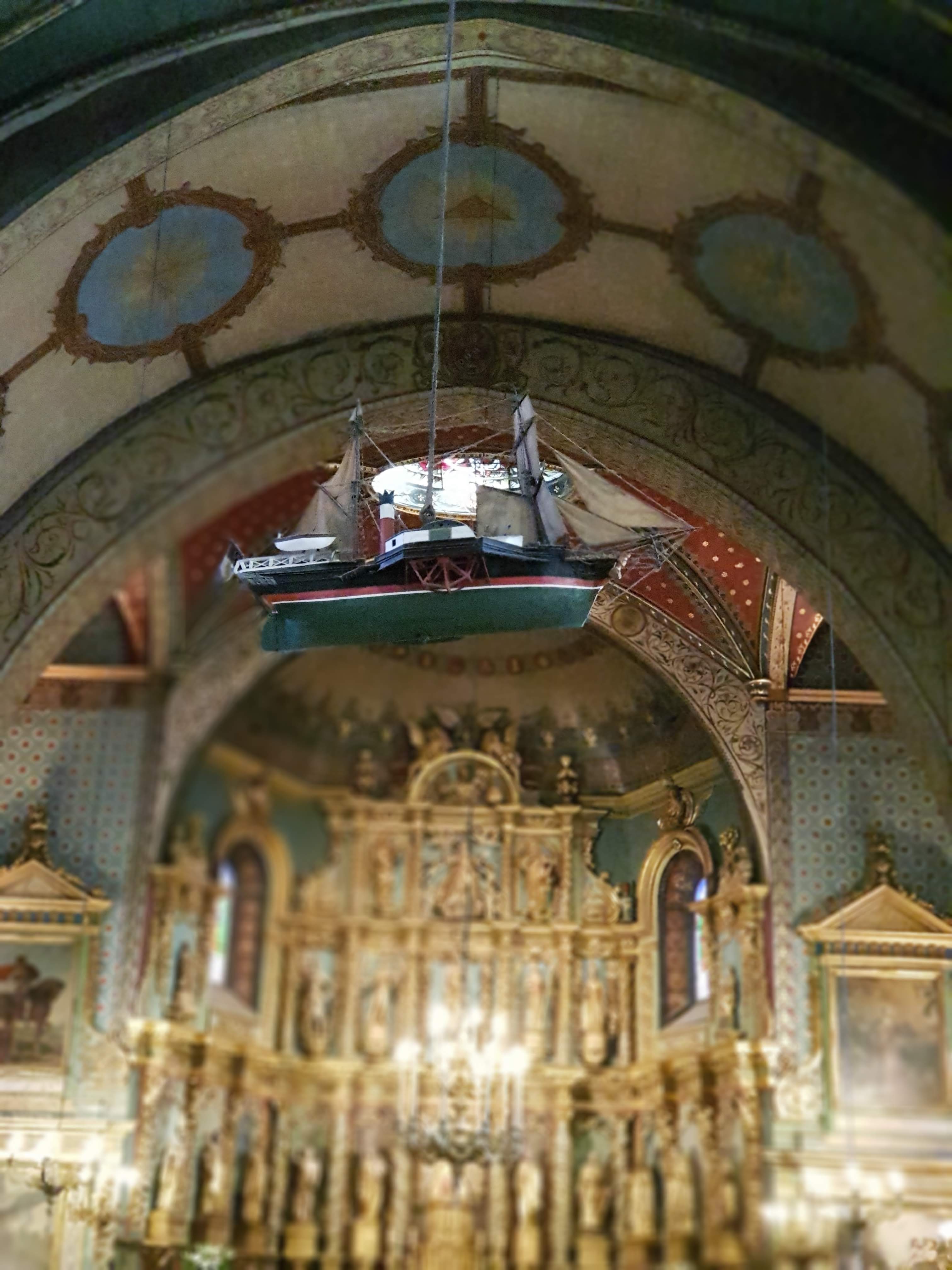 Très belle église avec les traditionnels gradins sur les côtés pour les hommes. Beau plafond avec un bateau suspendu.