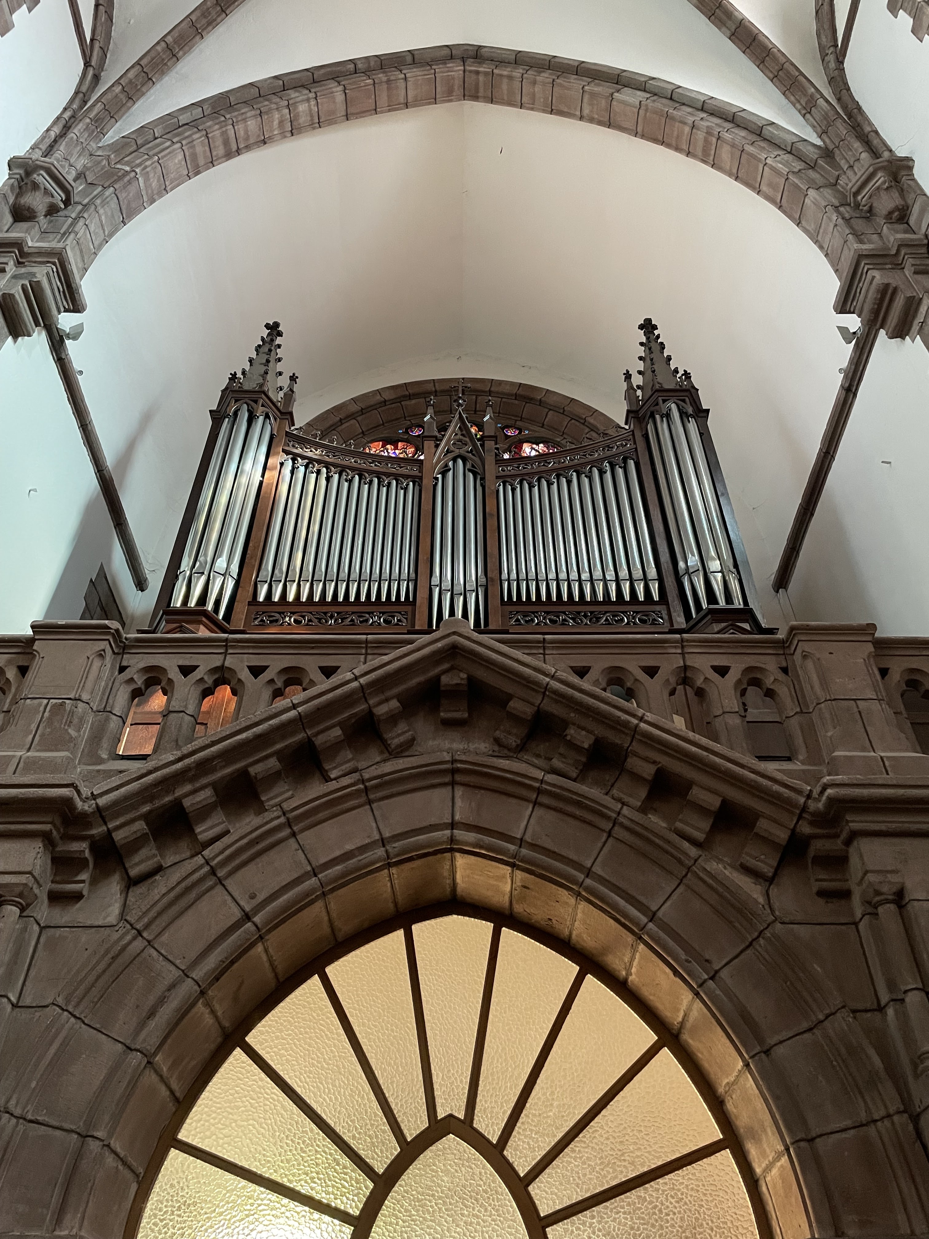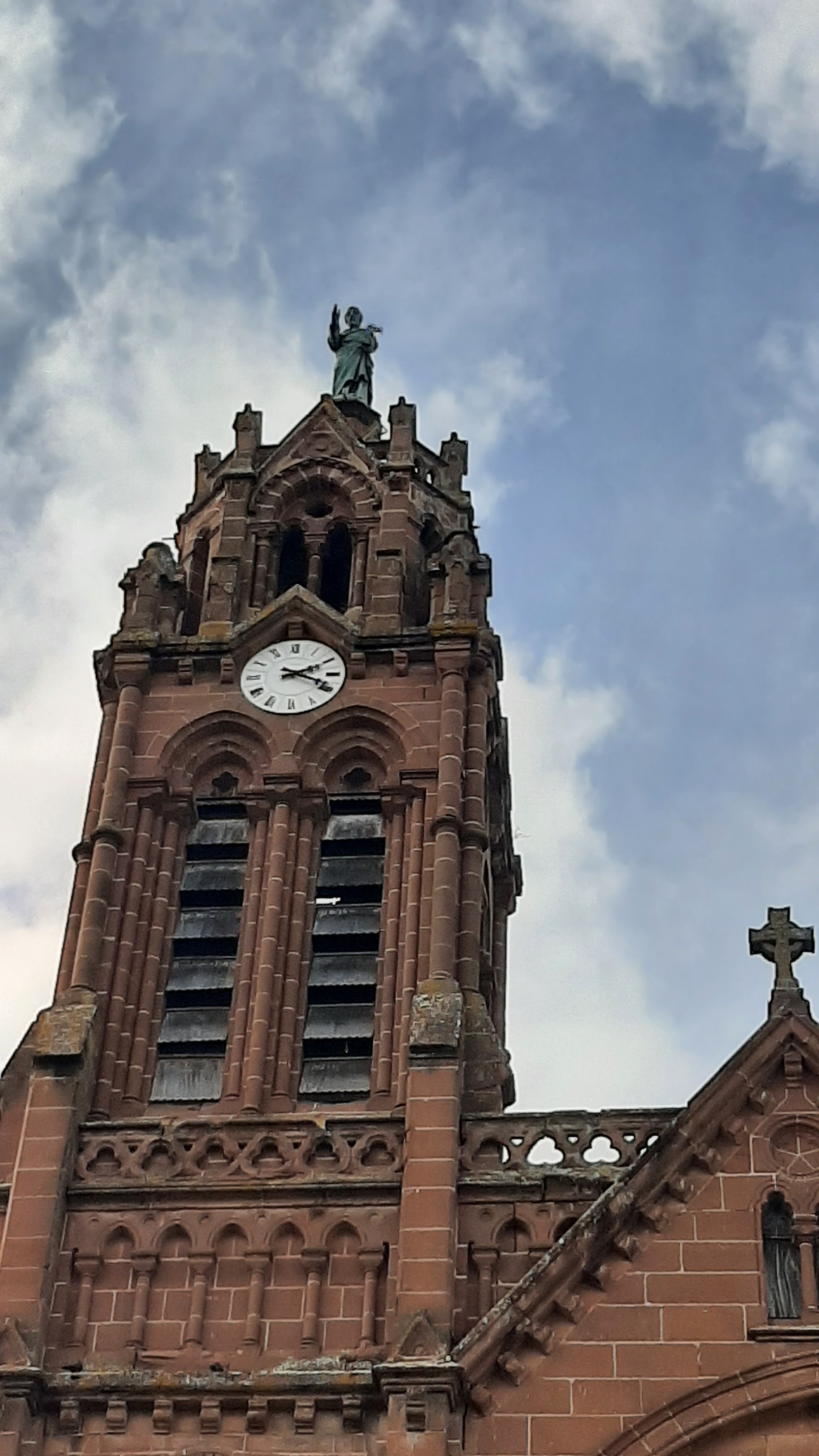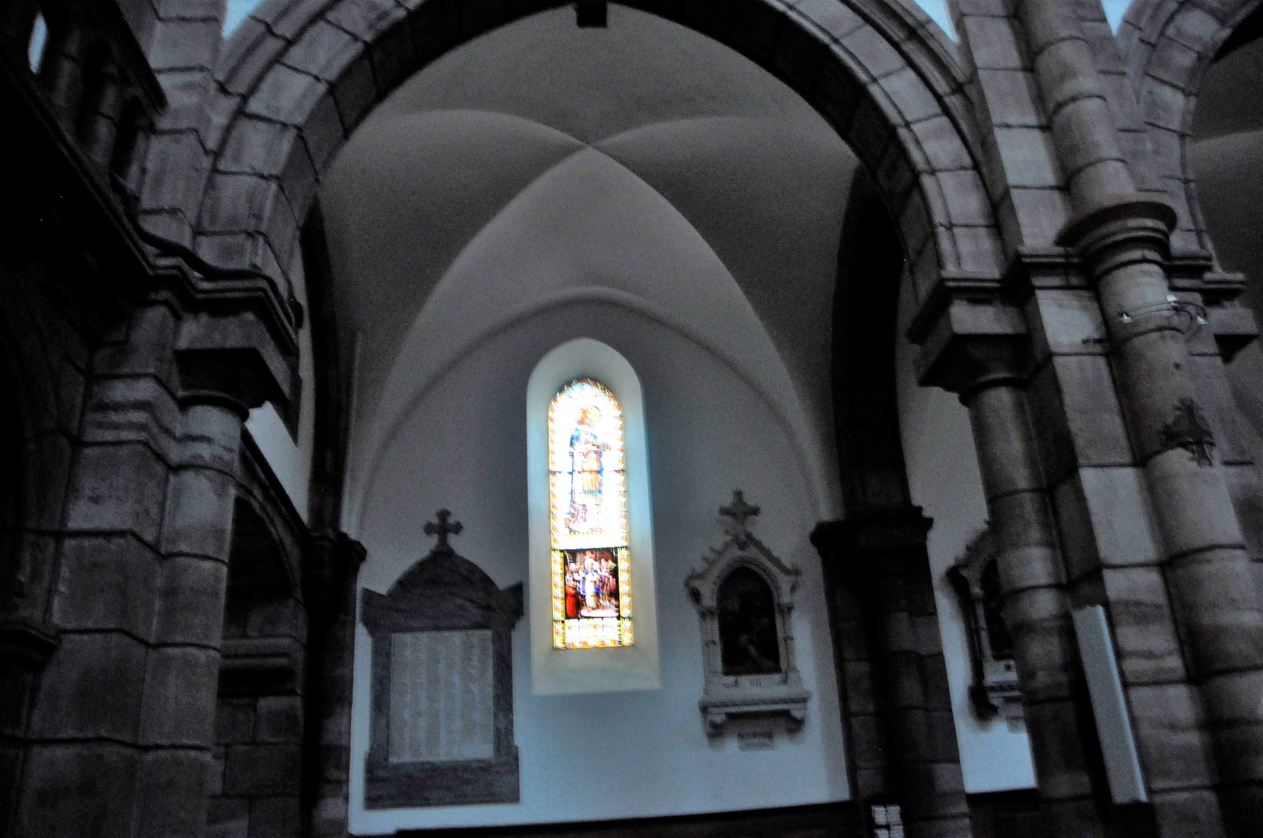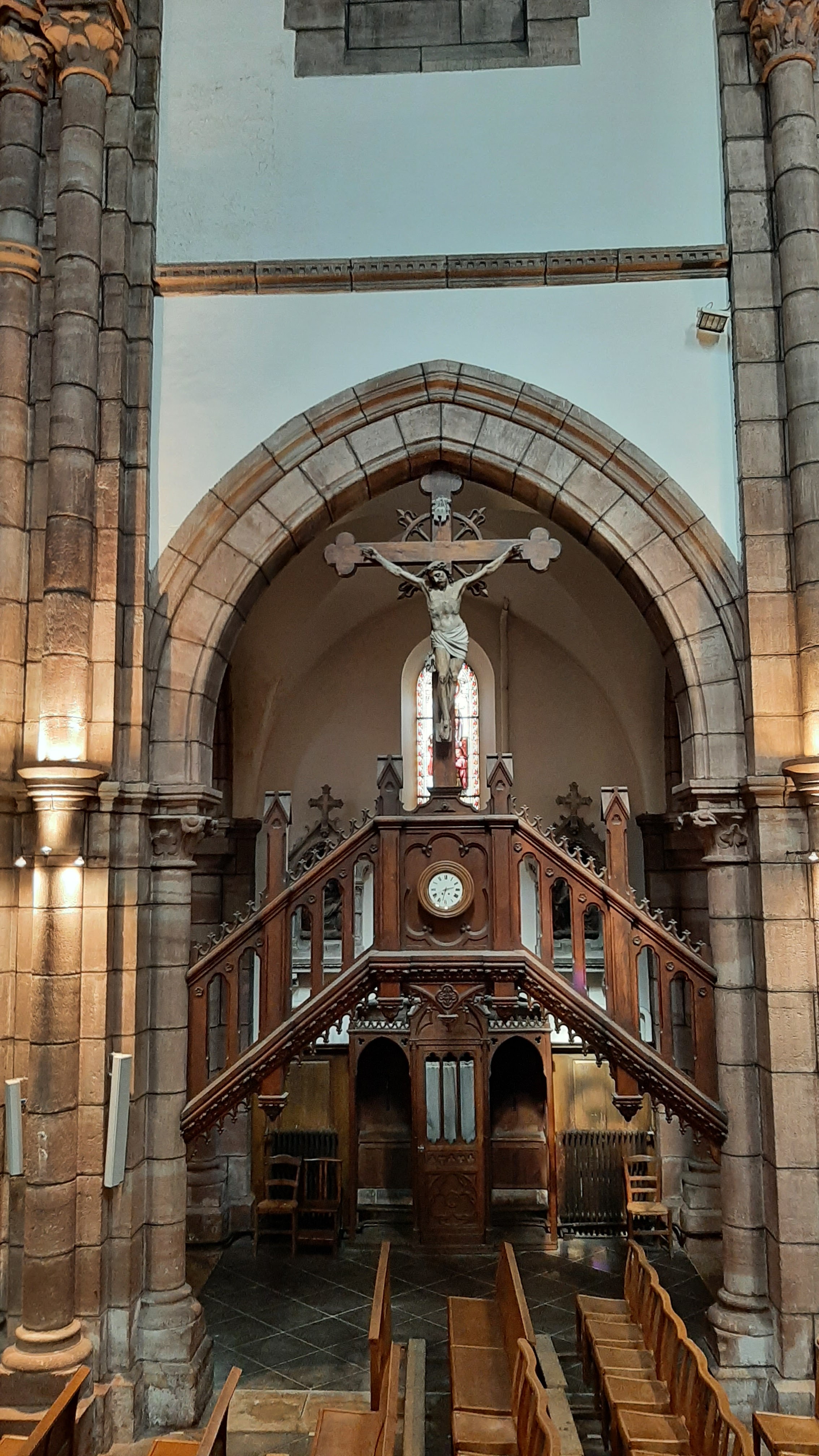 Belle église avec une imposante façade en flan entouré de deux imposants clochers rivière avec une grande horloge chacune d'entre elles. très beau avec une profusion de pierres apparentes parfaitement conservé et propre.Profitez grande luminosité de par sa profusion de fenêtres Avec de beaux vitraux, de hauts plafonds. peint en blanc avec de grandes arches de re force peinte en couleur sombre qui ressort formant des arches voyantes ou imposantes. portique de tubes d'air situé en partie haute.