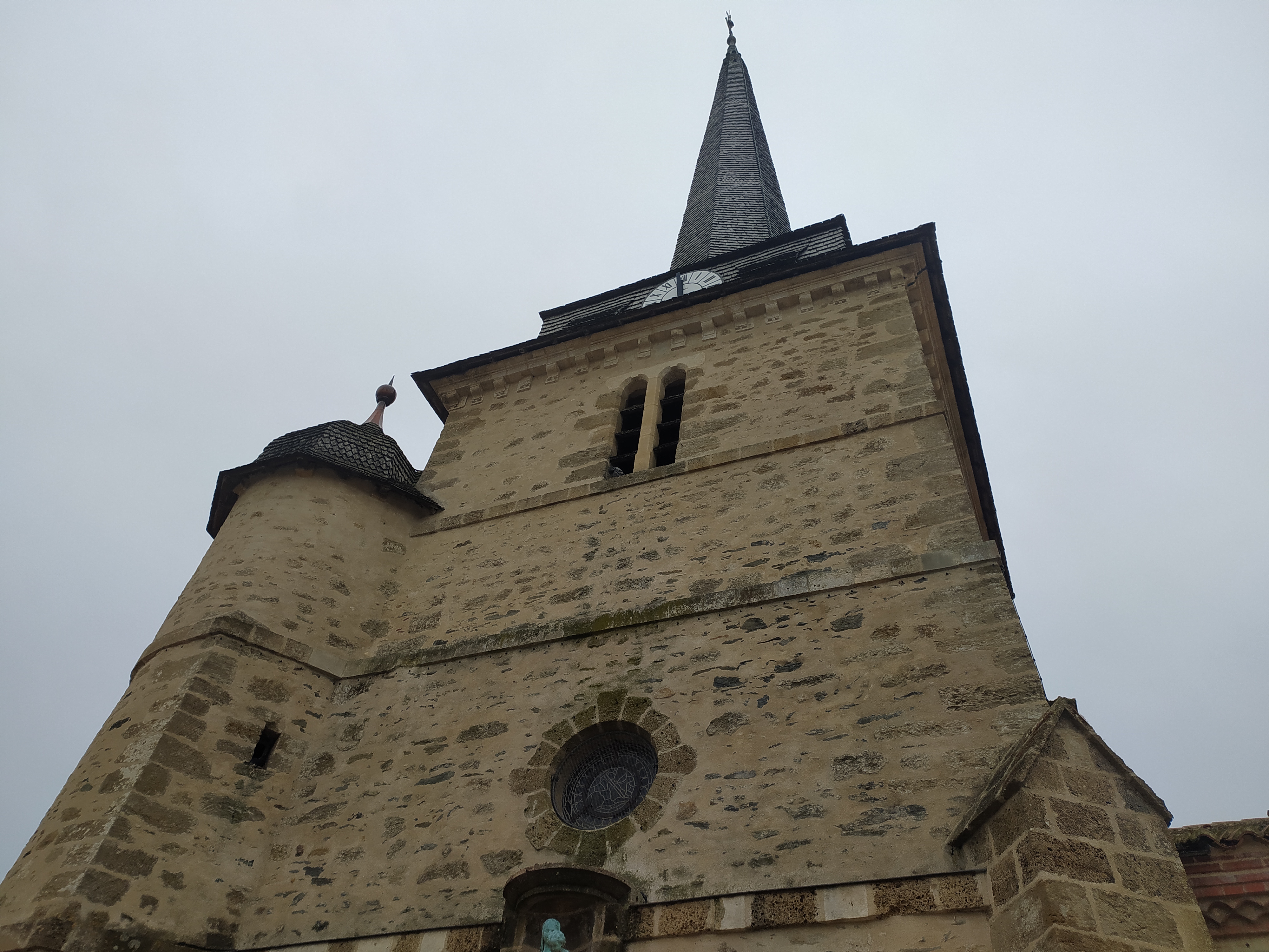 Belle église. Les tuiles du clocher sont en bois