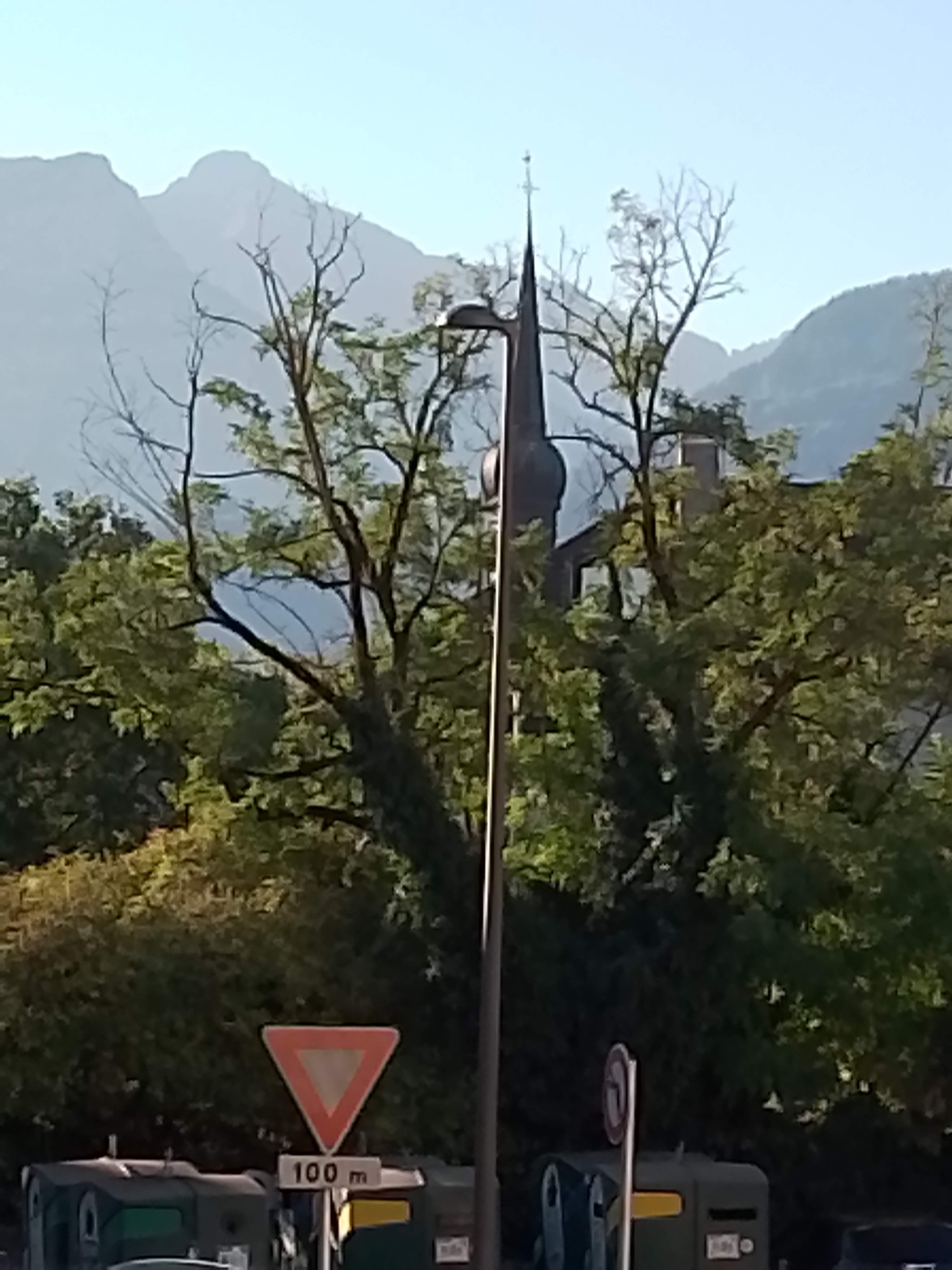 Grande Eglise en pierres grises. Magnifique luminaire central. Statues en bois. Vitraux abstraits. Peu de lumiere