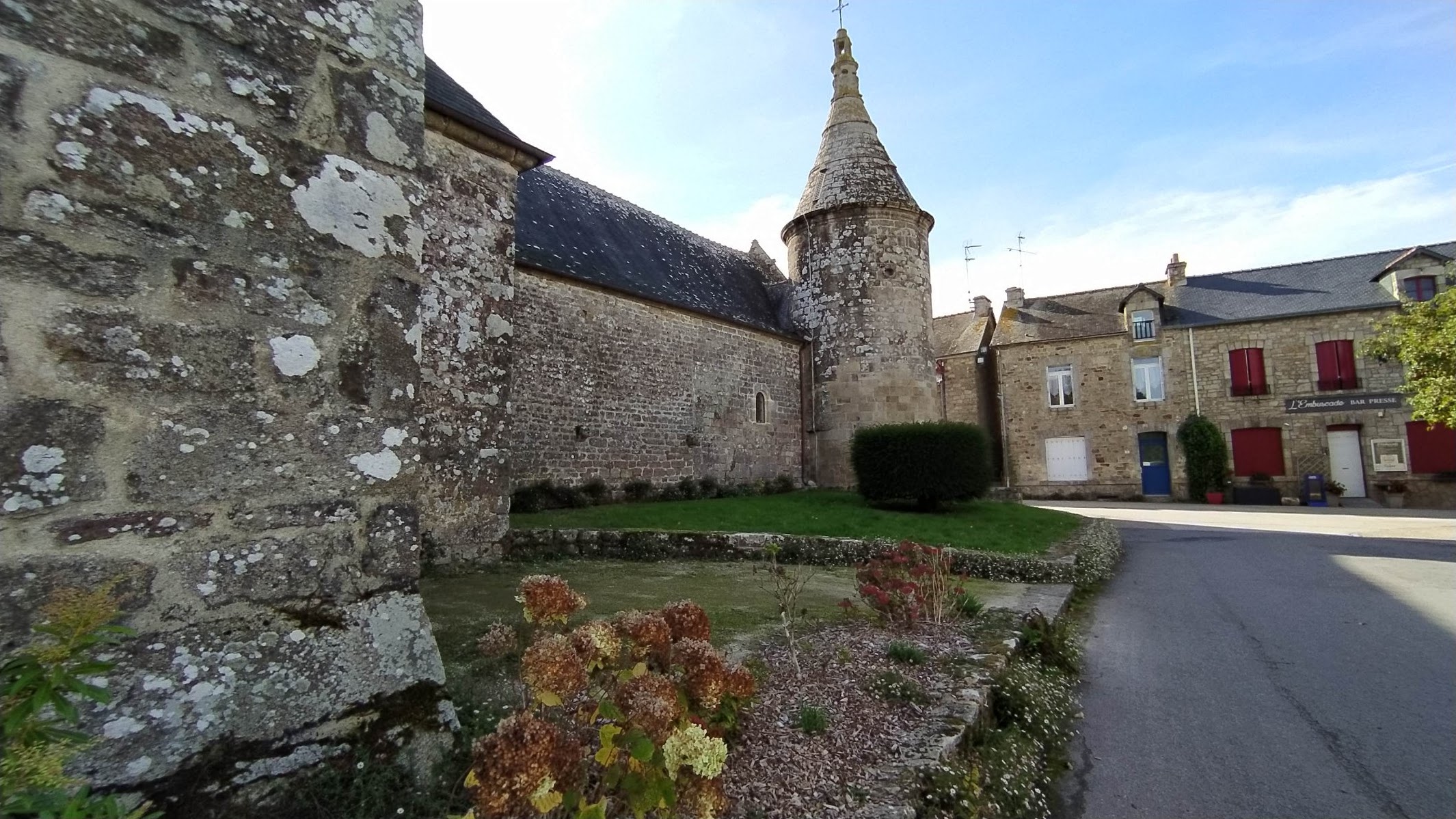 Super petit village église gotico, romane et en plus hier c était un vide grenier sympatic,il y a un resto pizza et un bistro breton bien typic